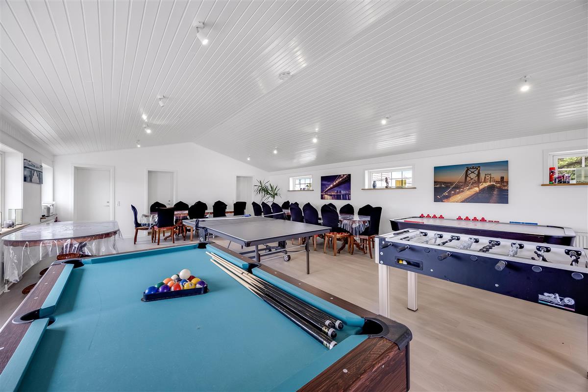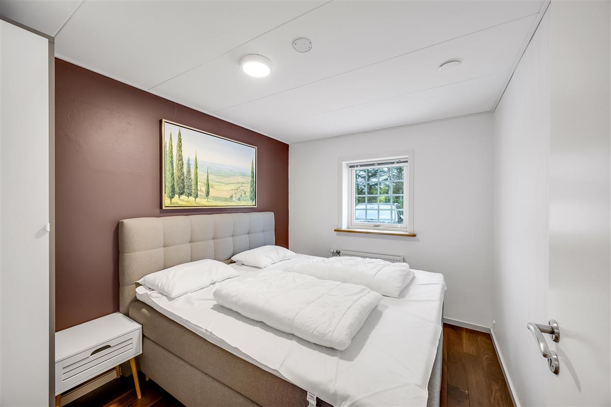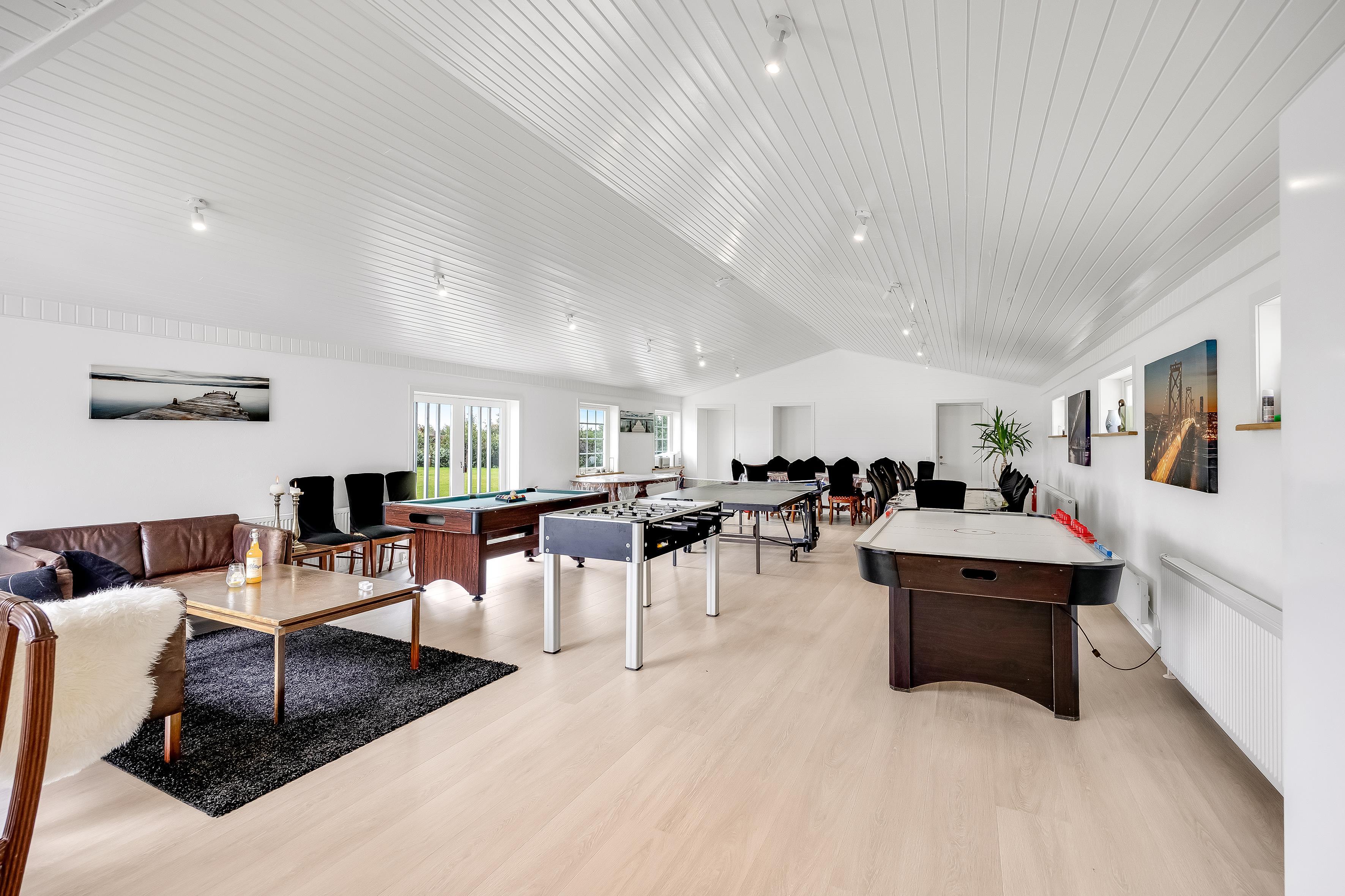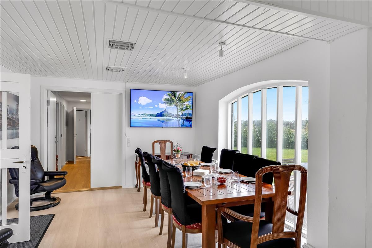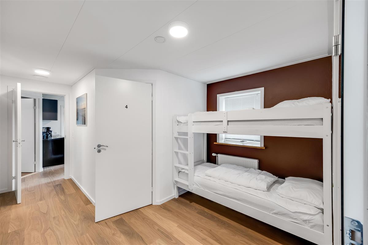 The entire property consists of the wing connected to the main house, with its own entrance and patio door. The four rooms are furnished with lovely, new double beds from Høie; three of the bedrooms feature wall-mounted TVs, and one has a patio door leading out to the courtyard. All rooms have windows overlooking the beautiful outdoor area. Bed sizes are: 2×180 cm, 150 cm, and 120 cm, plus a bunk bed. The rooms are all of a good, functional size, and the shared facilities cover a full 120 m². Altogether, the wing measures around 160 m².