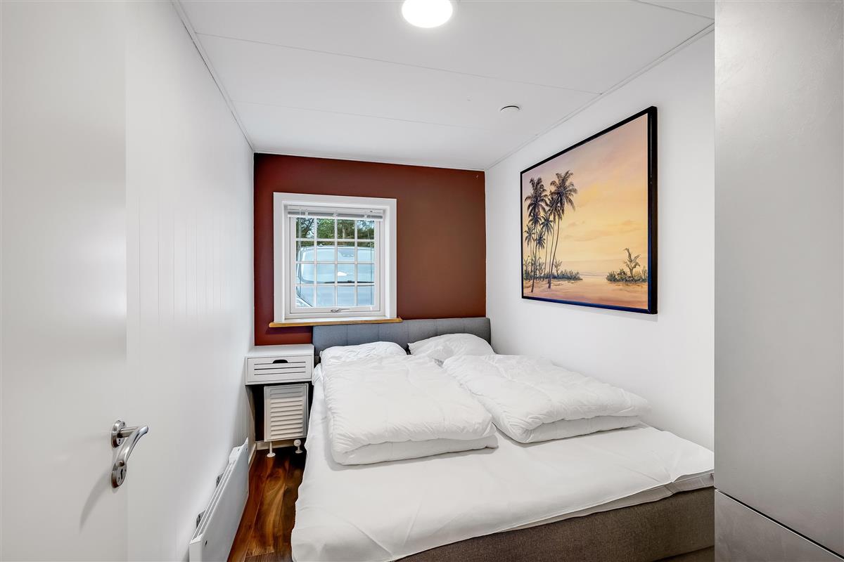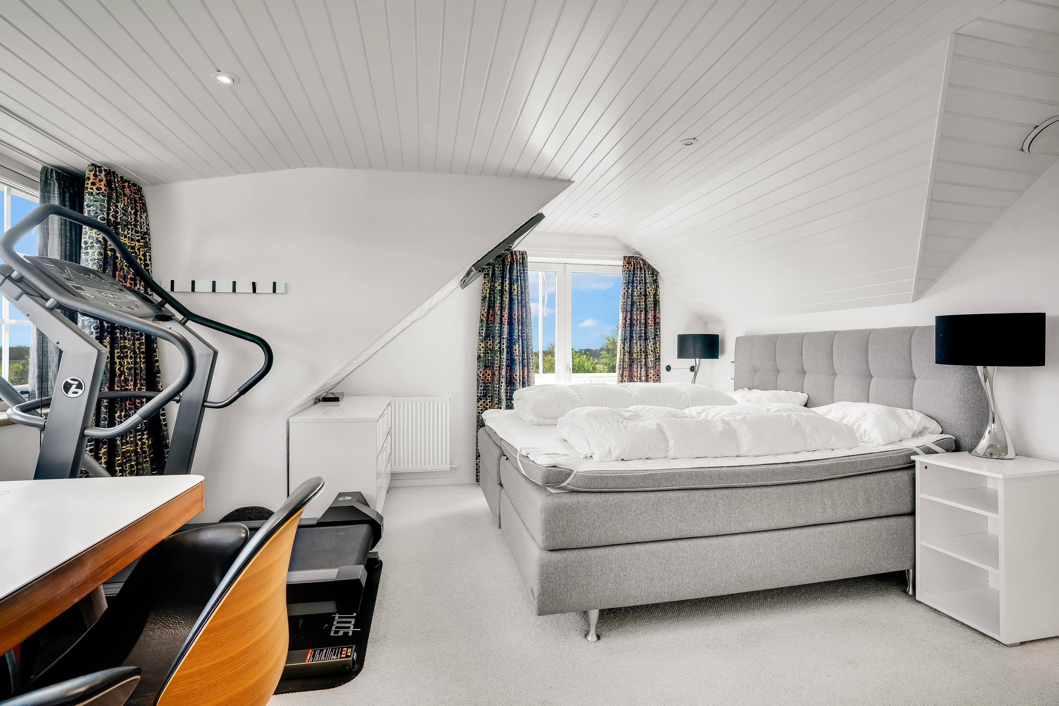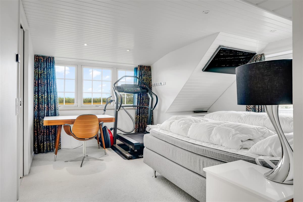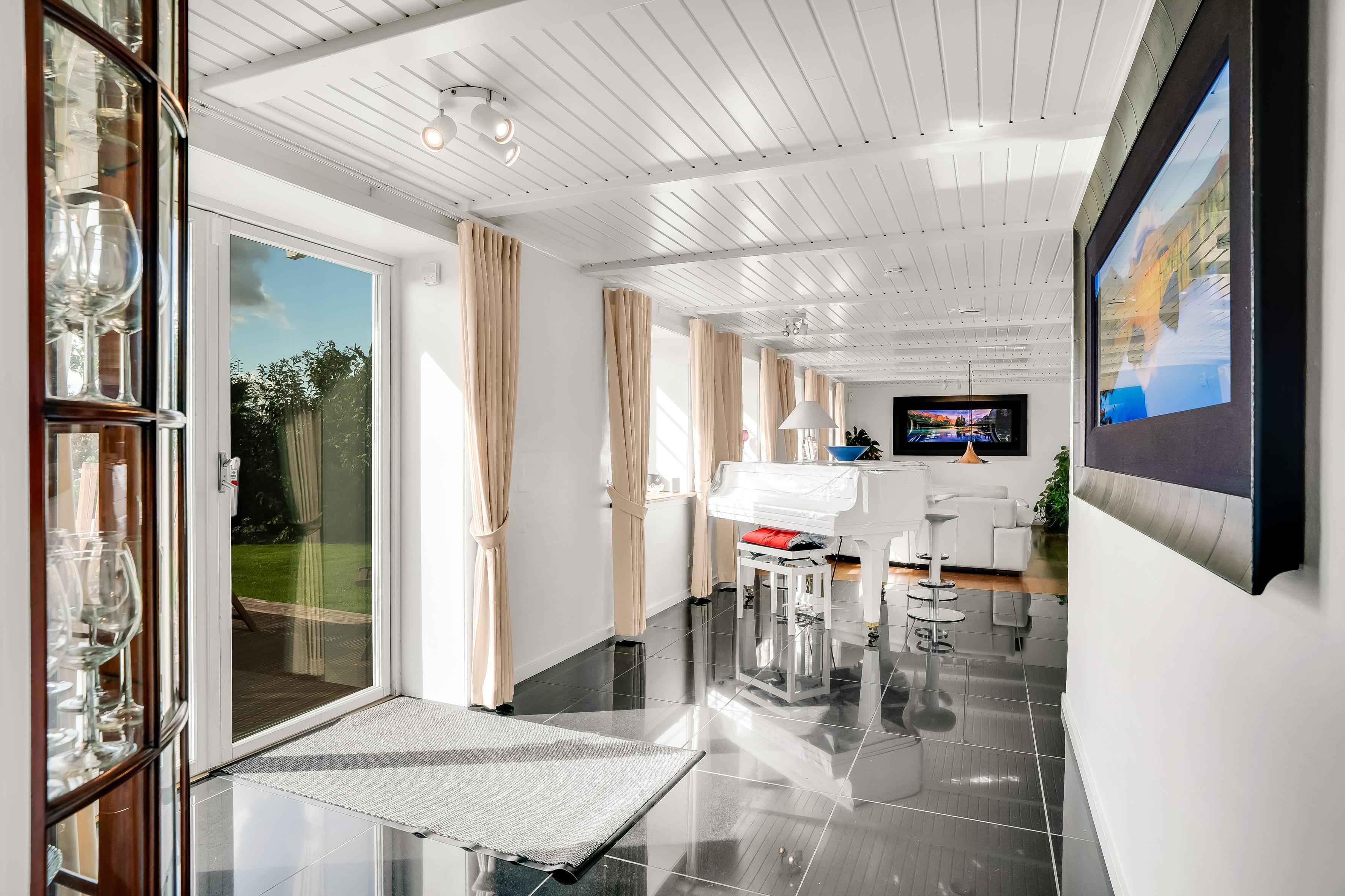 The entire property consists of the wing connected to the main house, with its own entrance and patio door. The four rooms are furnished with lovely, new double beds from Høie; three of the bedrooms feature wall-mounted TVs, and one has a patio door leading out to the courtyard. All rooms have windows overlooking the beautiful outdoor area. Bed sizes are: 2×180 cm, 150 cm, and 120 cm, plus a bunk bed. The rooms are all of a good, functional size, and the shared facilities cover a full 120 m². Altogether, the wing measures around 160 m².
