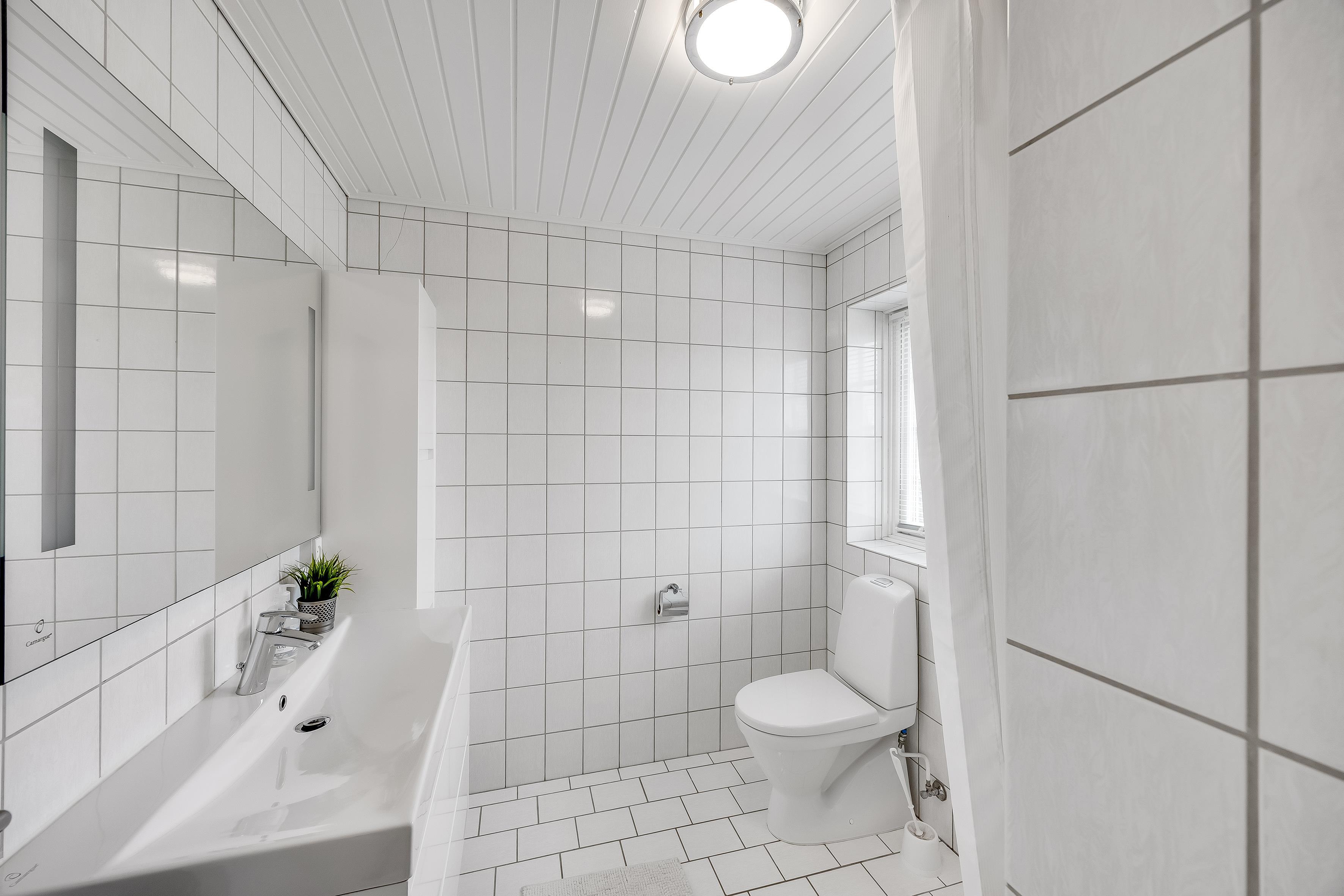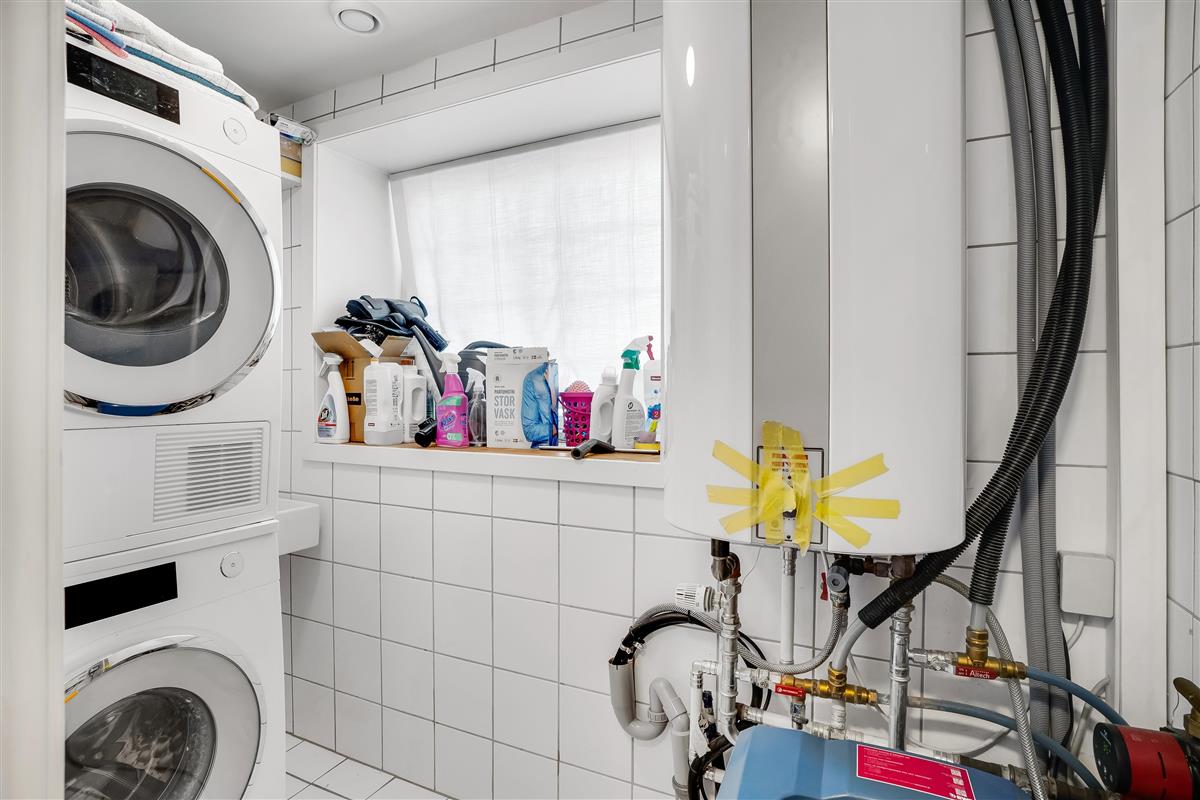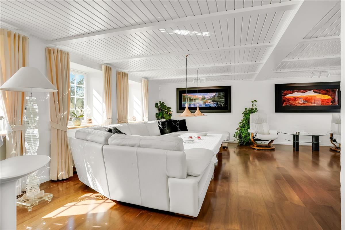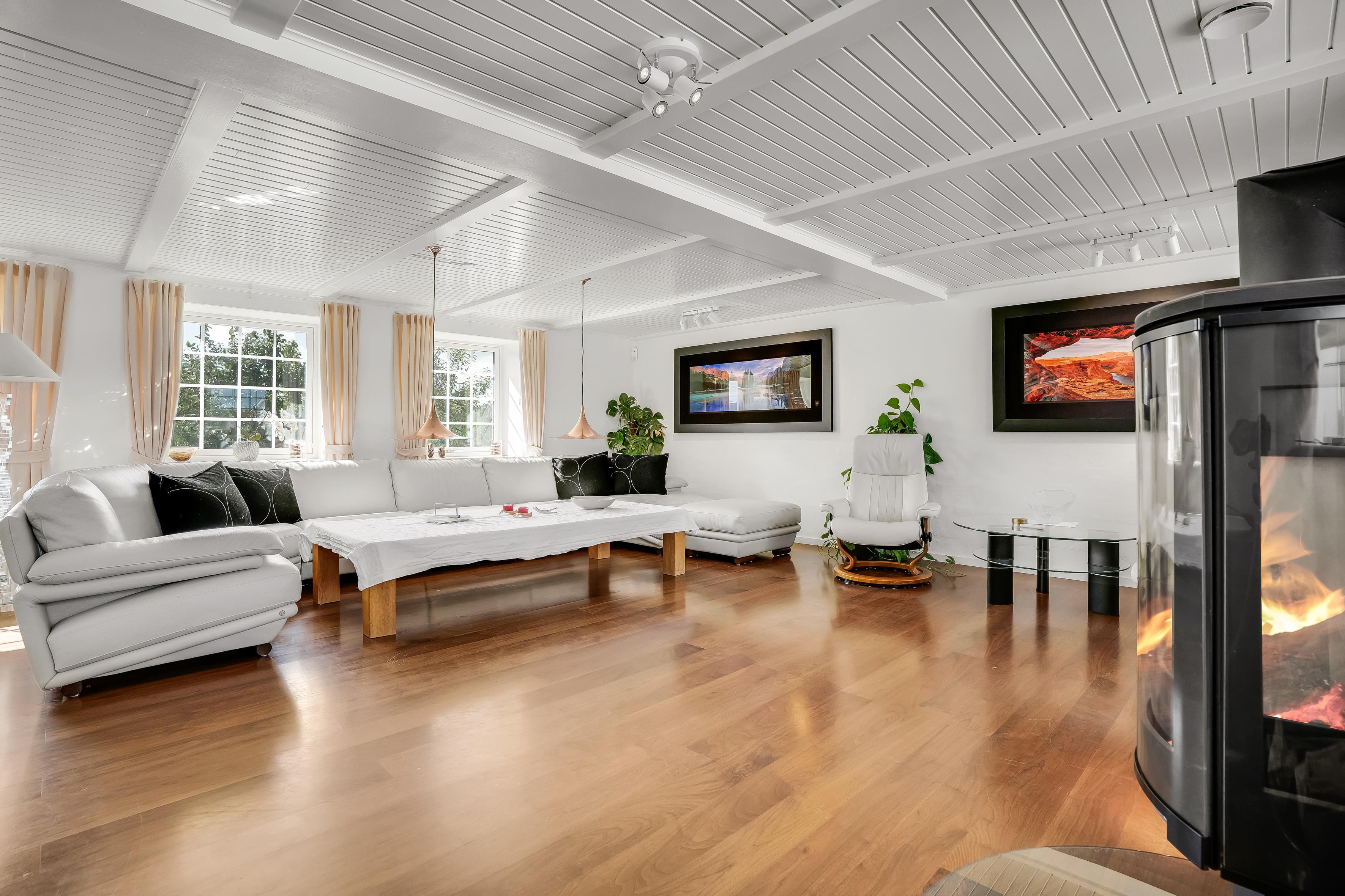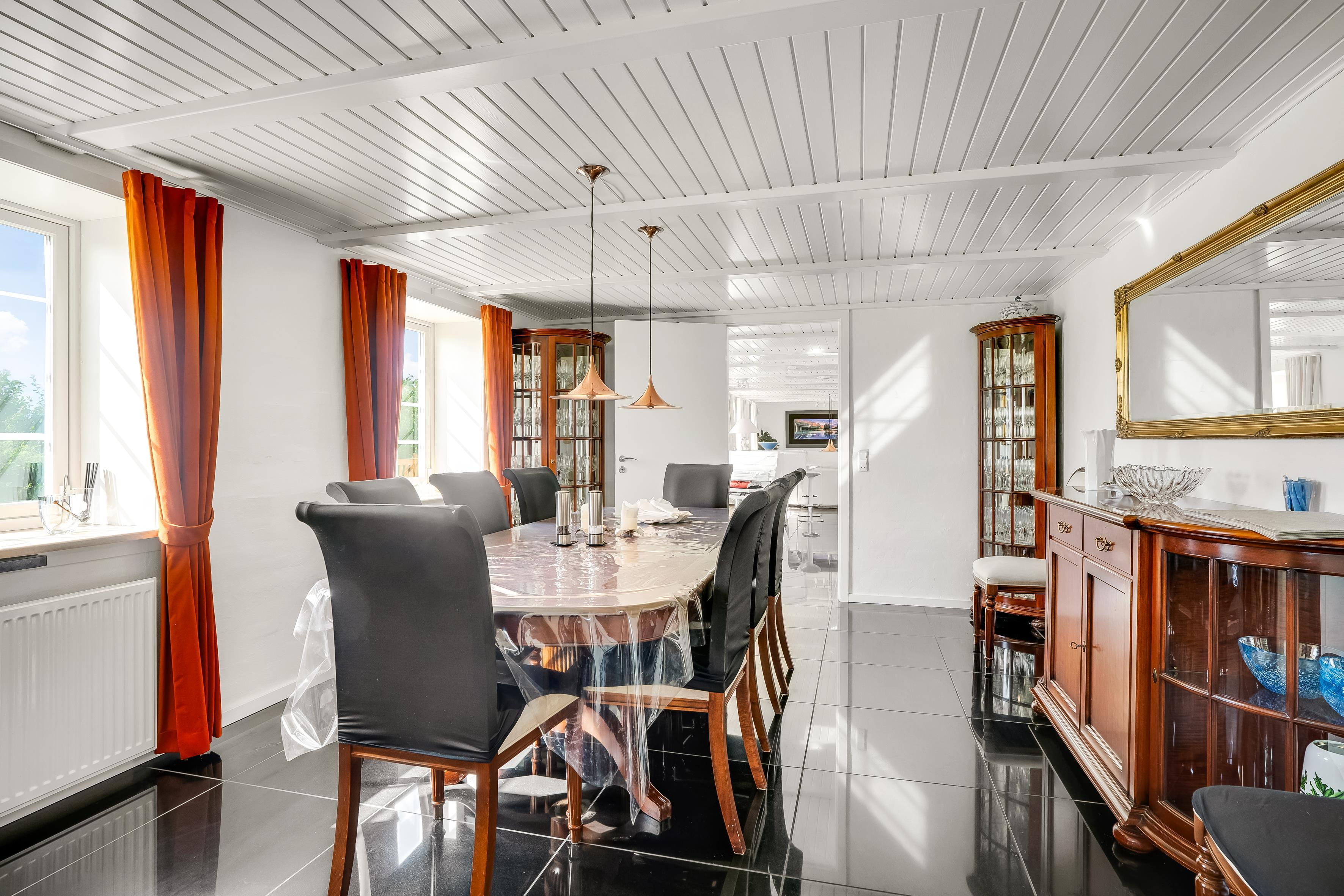 The entire property consists of the wing connected to the main house, with its own entrance and patio door. The four rooms are furnished with lovely, new double beds from Høie; three of the bedrooms feature wall-mounted TVs, and one has a patio door leading out to the courtyard. All rooms have windows overlooking the beautiful outdoor area. Bed sizes are: 2×180 cm, 150 cm, and 120 cm, plus a bunk bed. The rooms are all of a good, functional size, and the shared facilities cover a full 120 m². Altogether, the wing measures around 160 m².