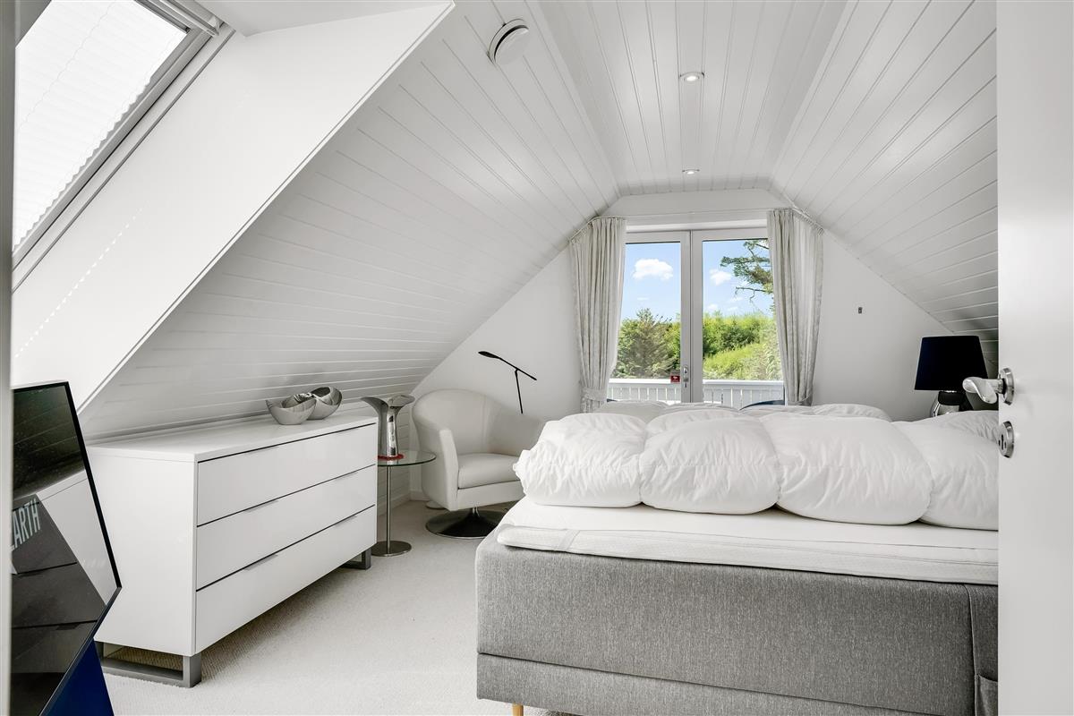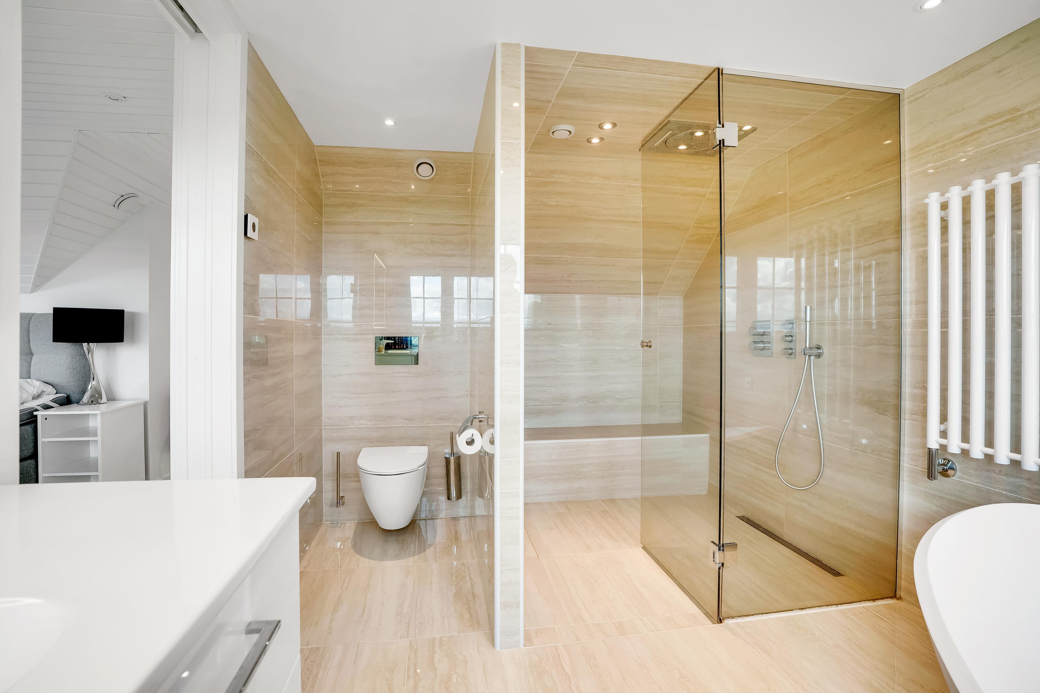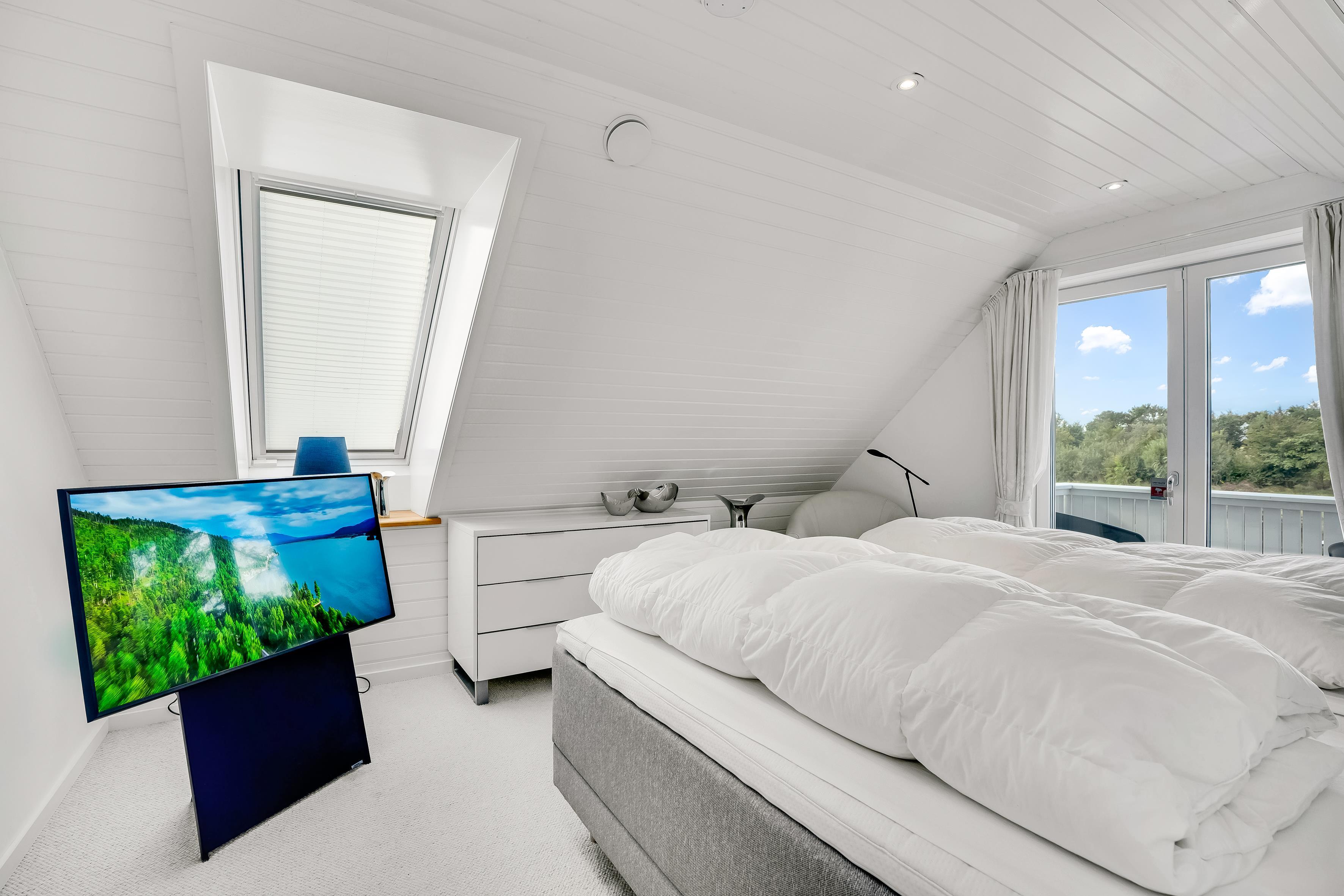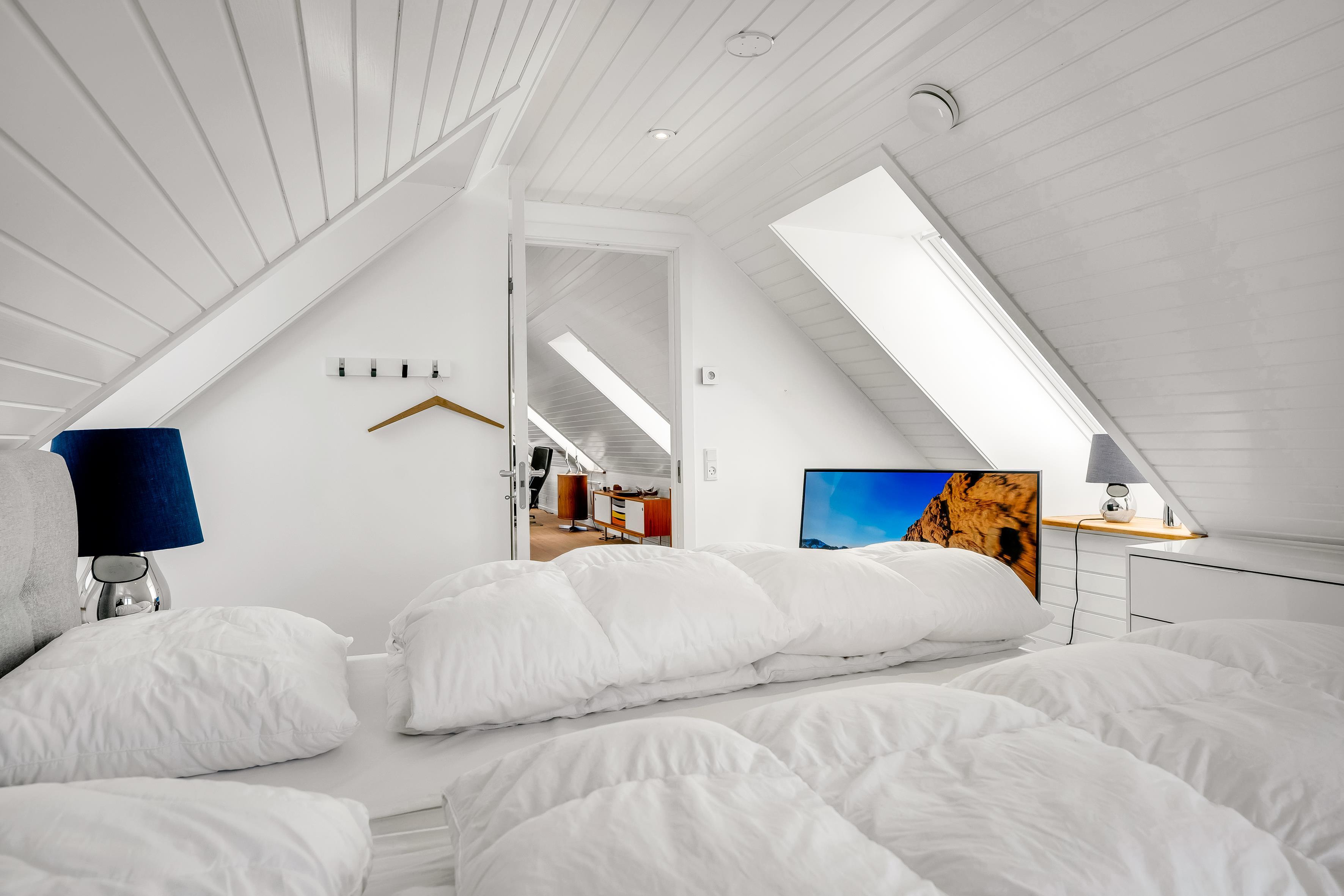 Part of the sleeping area is located on the first floor. Here you will find two spacious bedrooms, both with balconies and quality double beds from Høie. One bedroom has a wall-mounted TV and an en-suite bathroom with a large shower niche with bench, linear drain, and a luxurious rain shower with waterfall function.