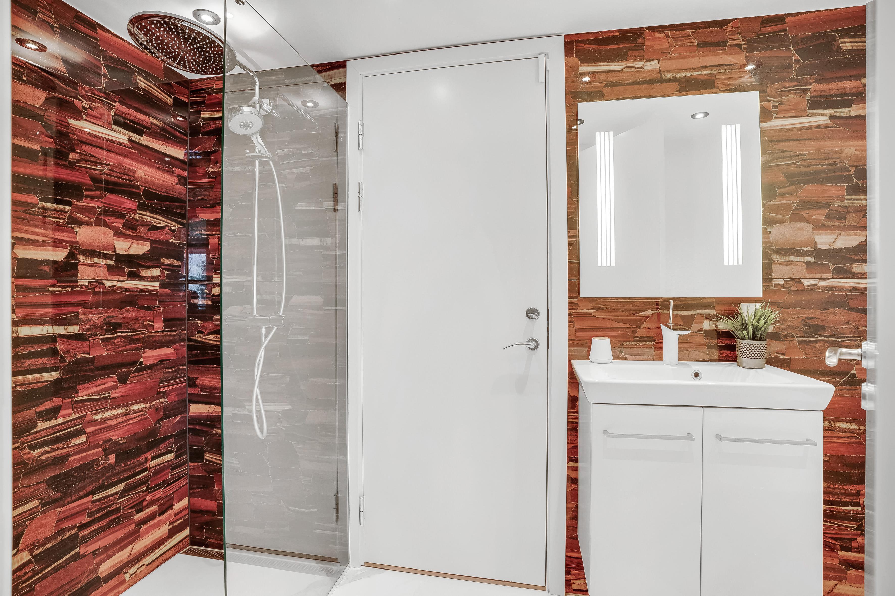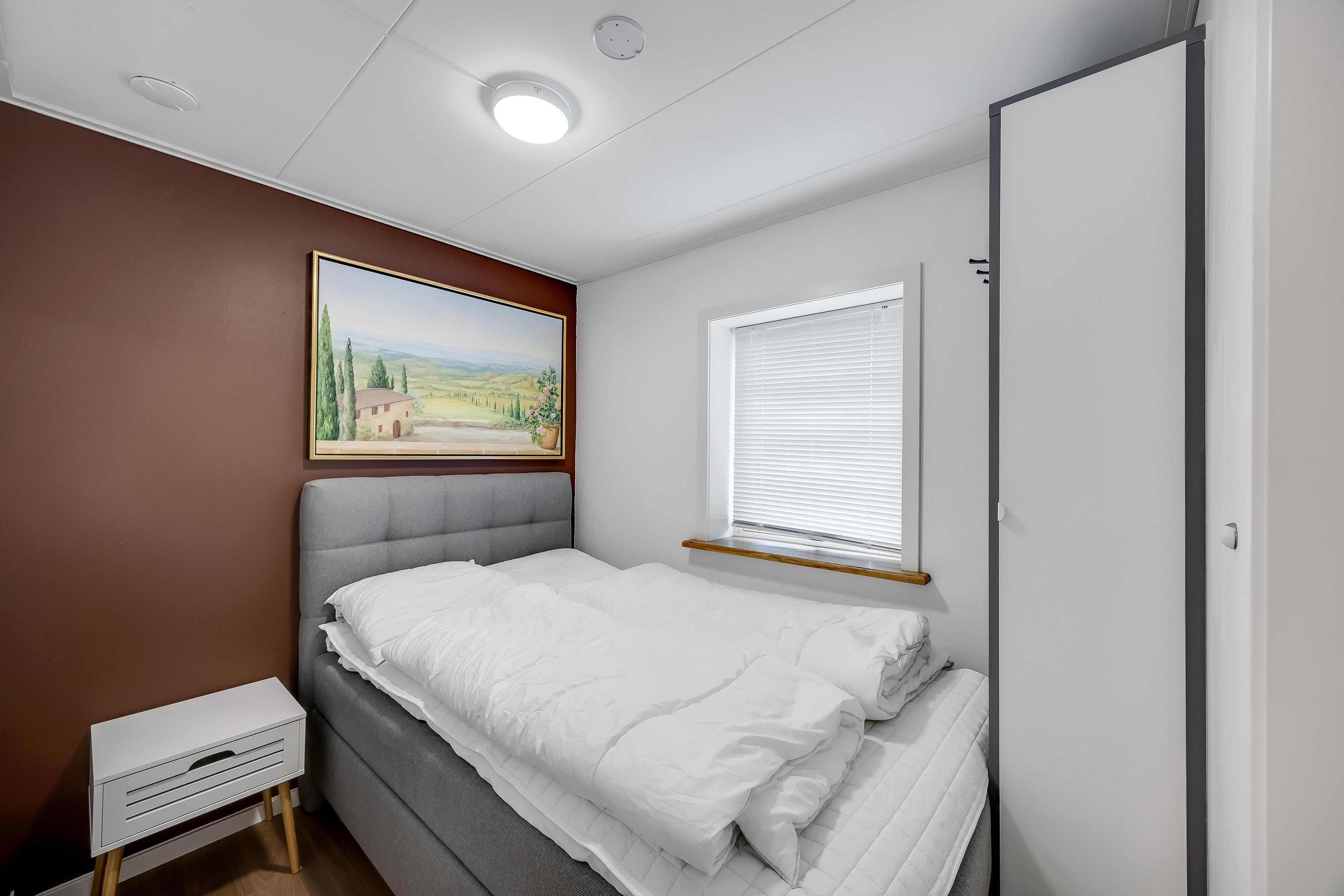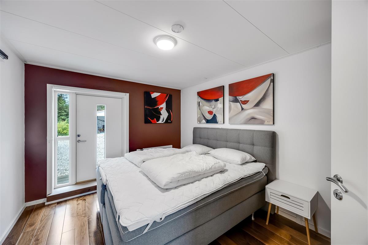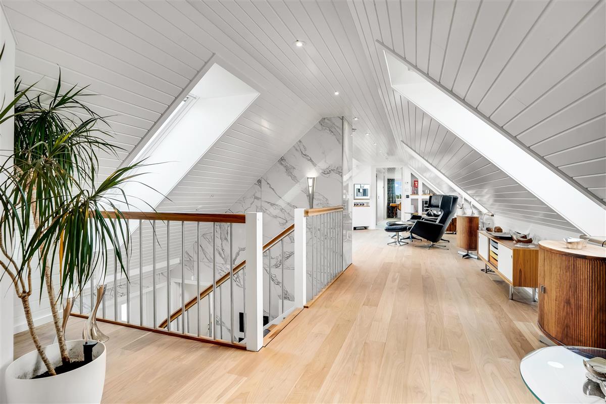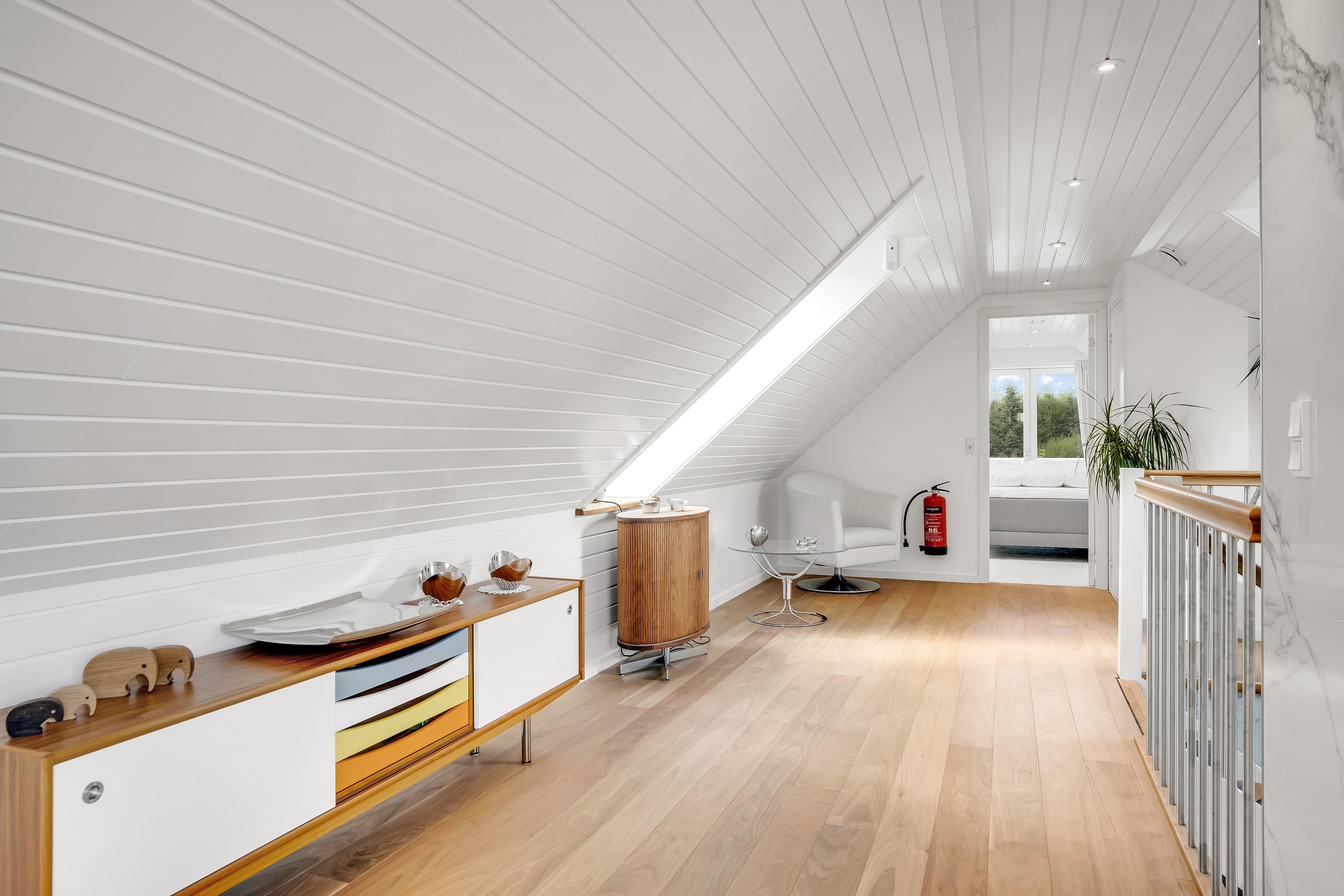 Part of the sleeping area is located on the first floor. Here you will find two spacious bedrooms, both with balconies and quality double beds from Høie. One bedroom has a wall-mounted TV and an en-suite bathroom with a large shower niche with bench, linear drain, and a luxurious rain shower with waterfall function.