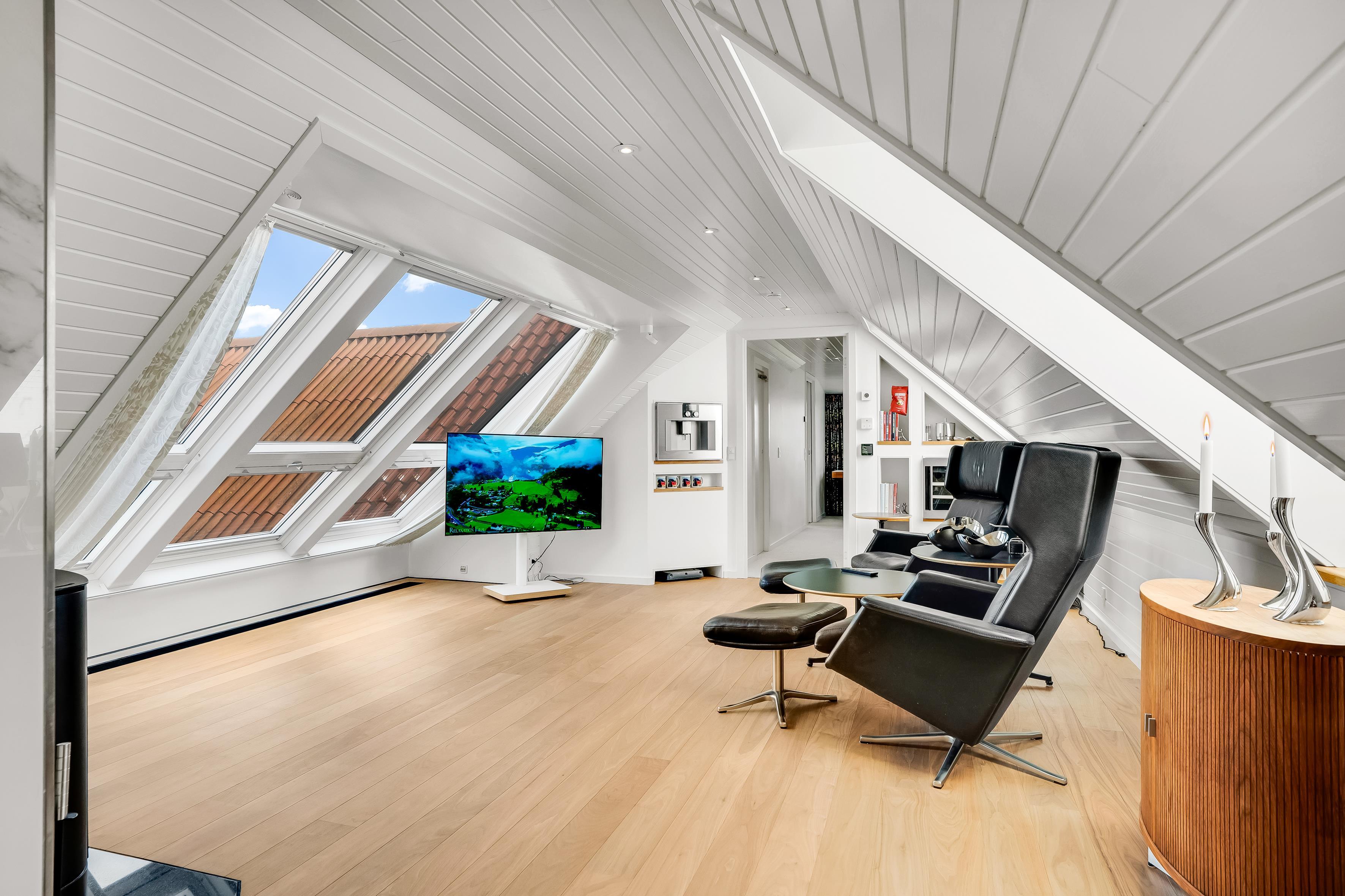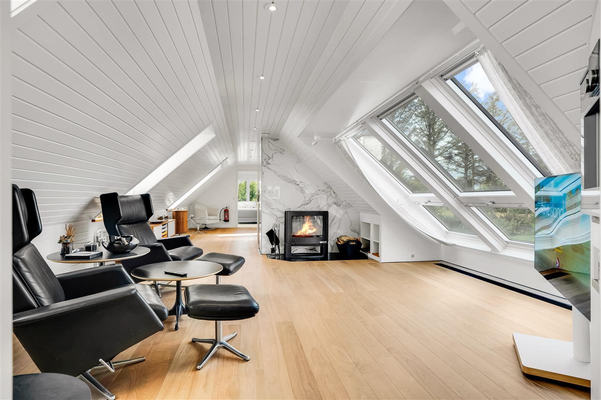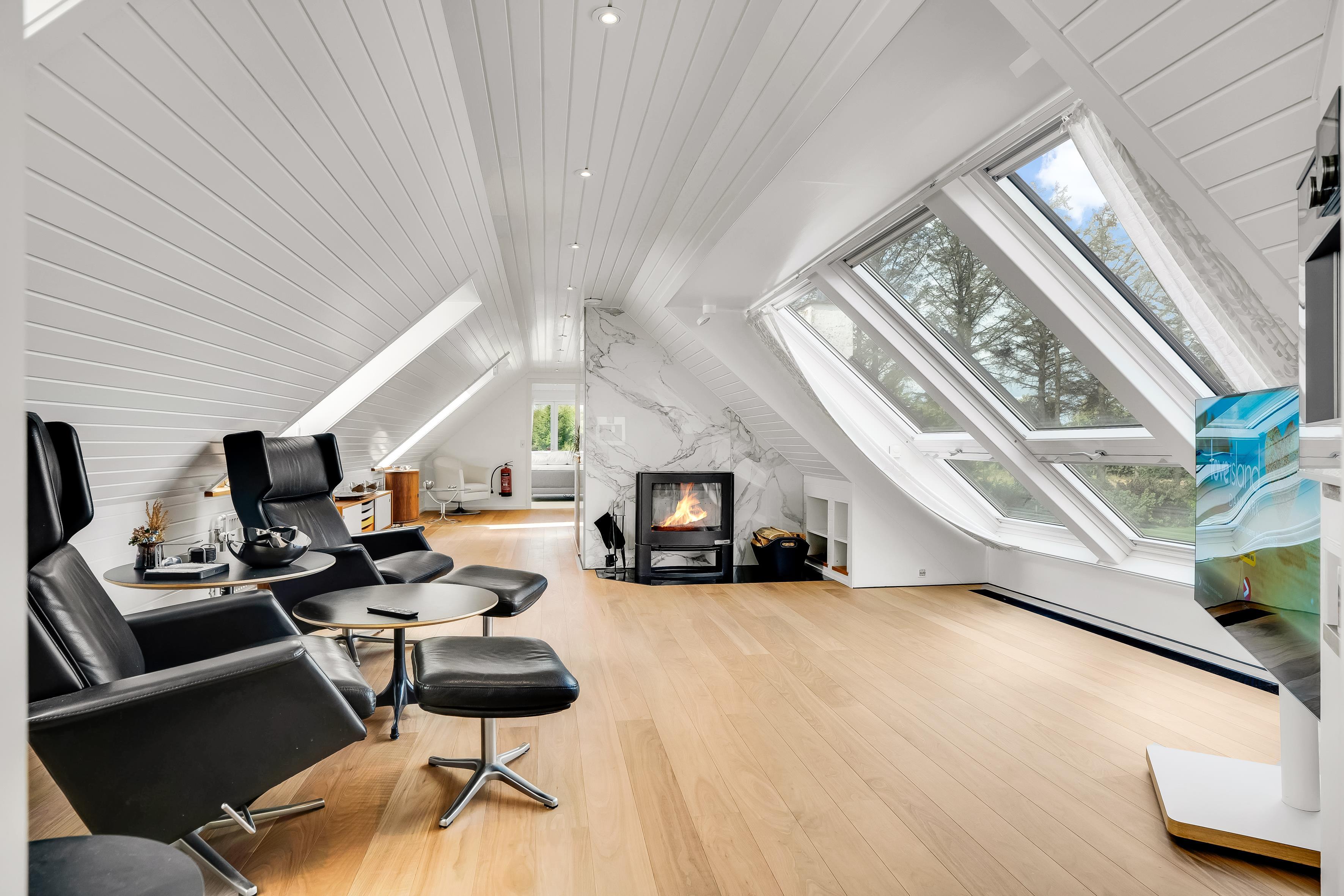 There is also an additional bathroom on the first floor and a separate lounge, where walnut flooring, wood stove, and large windows create a warm and exclusive atmosphere with views over the landscape. Finally, there is a small cozy TV room with coffee machine and its own toilet.