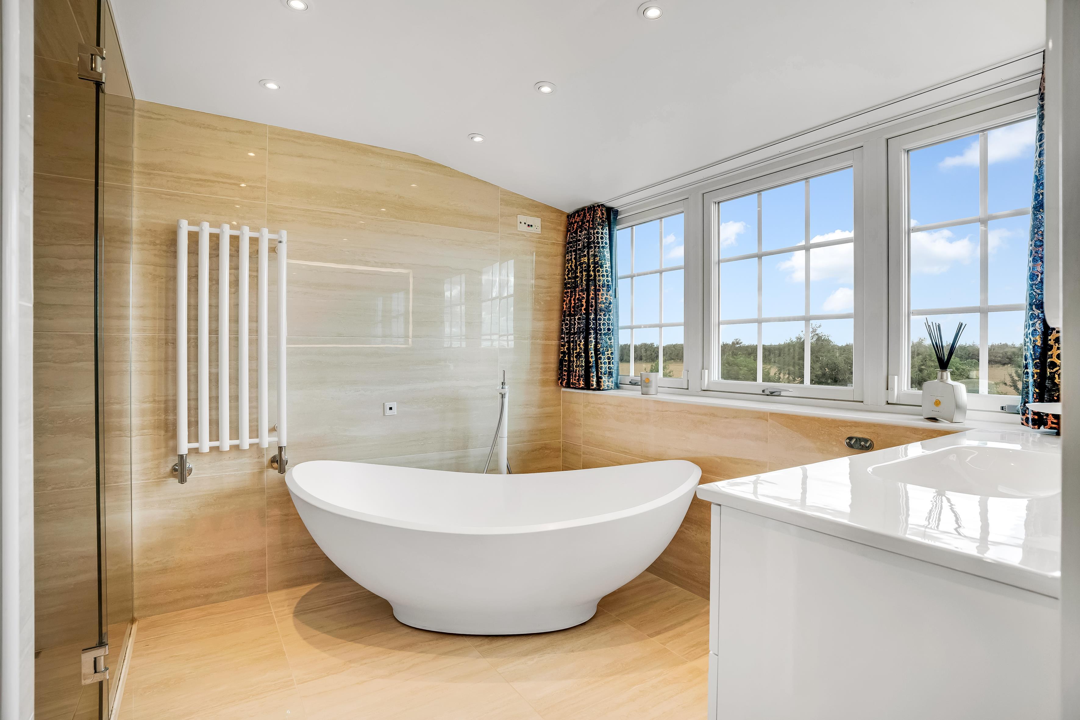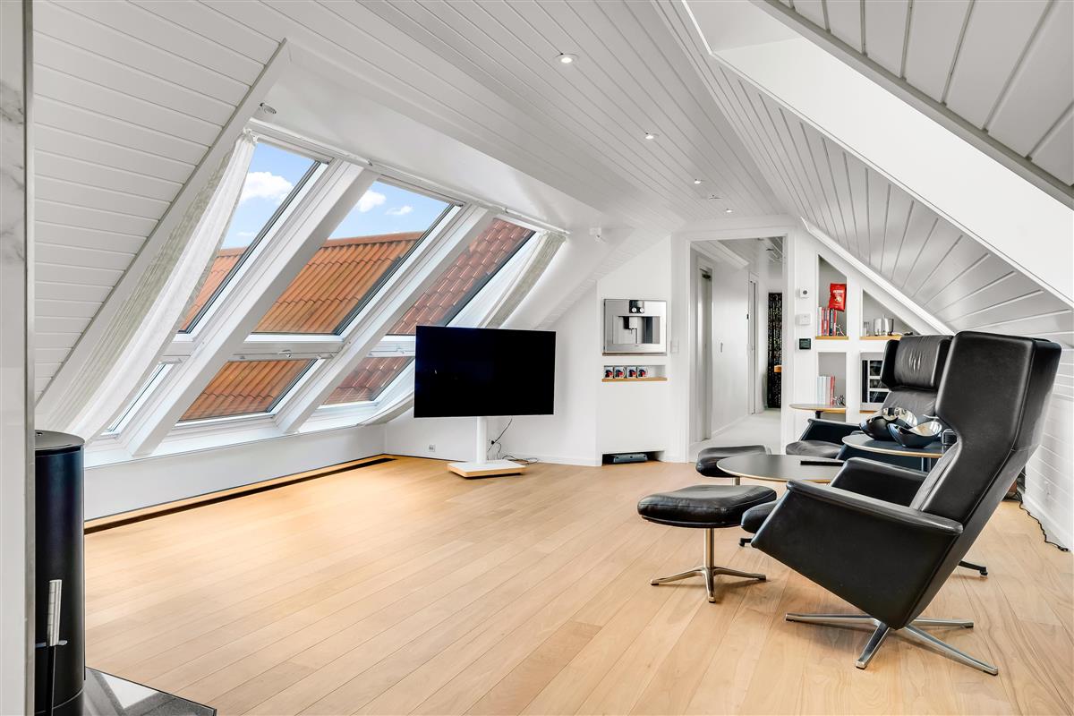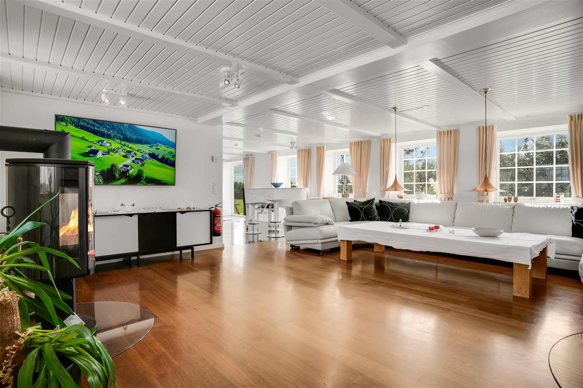 There is also an additional bathroom on the first floor and a separate lounge, where walnut flooring, wood stove, and large windows create a warm and exclusive atmosphere with views over the landscape. Finally, there is a small cozy TV room with coffee machine and its own toilet.