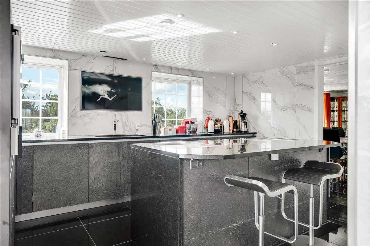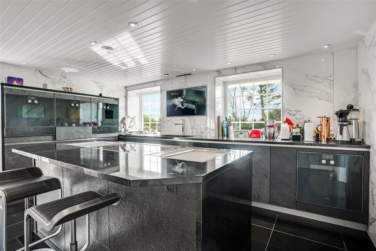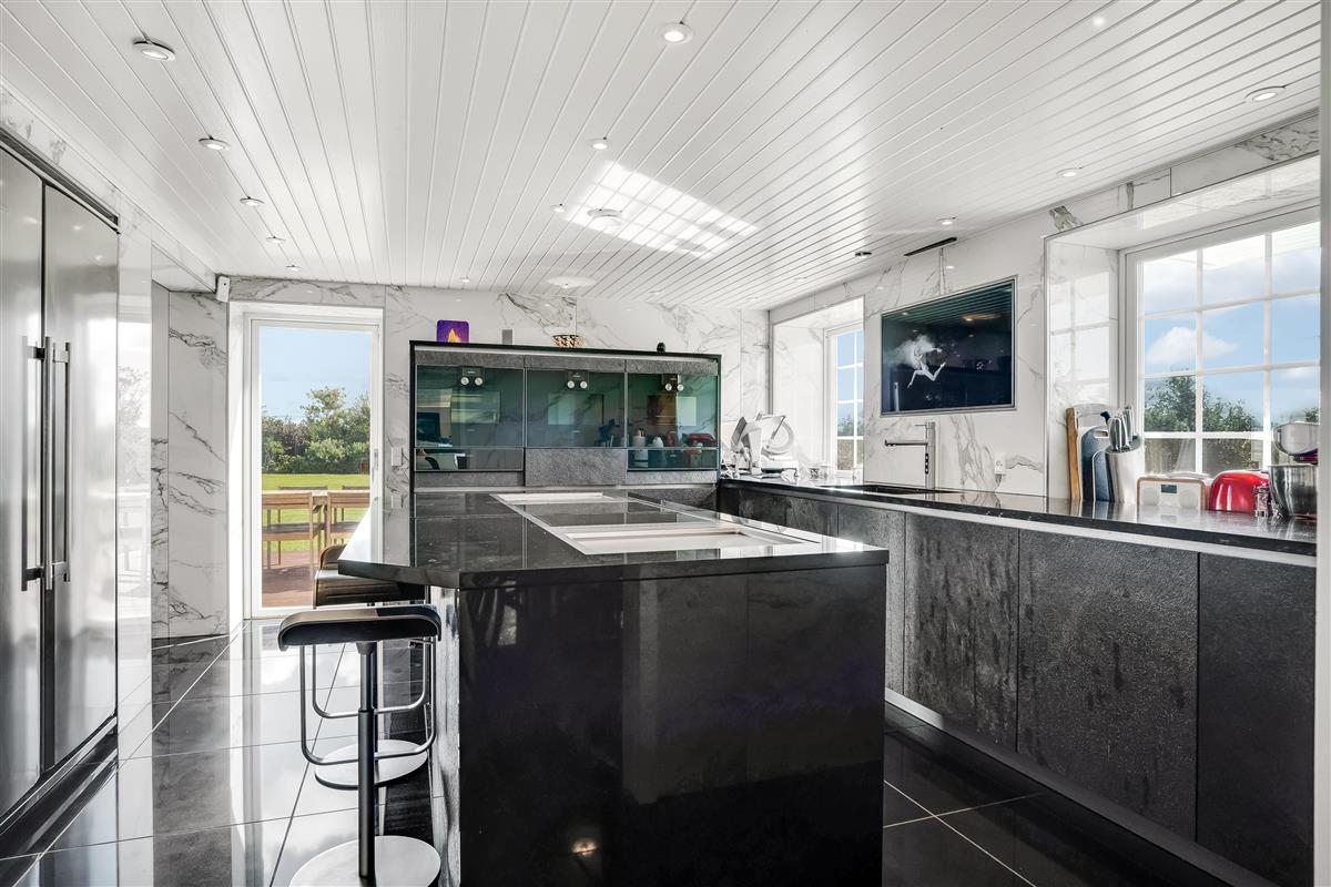 The kitchen also includes a coffee machine, two warming drawers, a refrigerator, two freezers of approx. 300 liters each, a high-quality wine cabinet, and a combined fridge/freezer from Liebherr. The kitchen island is designed for bar stools around it – ideal for social cooking and togetherness.