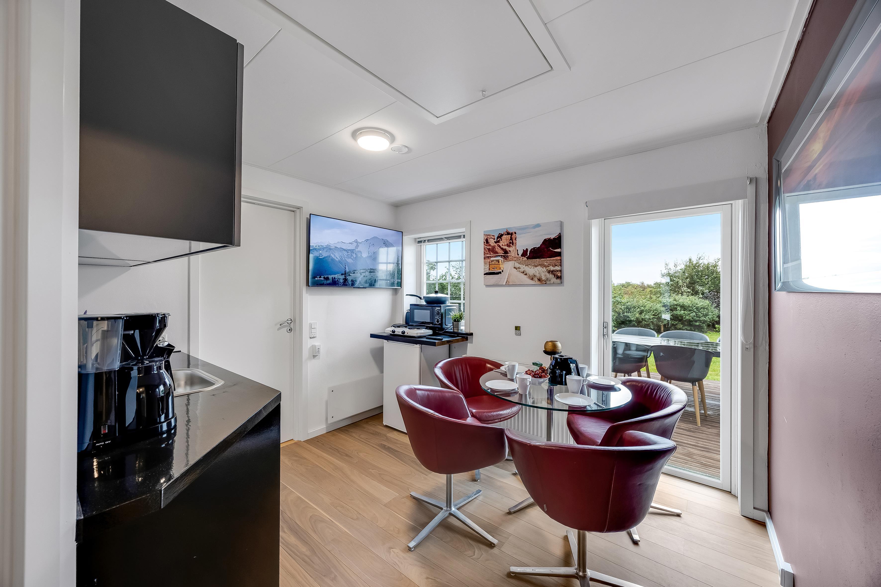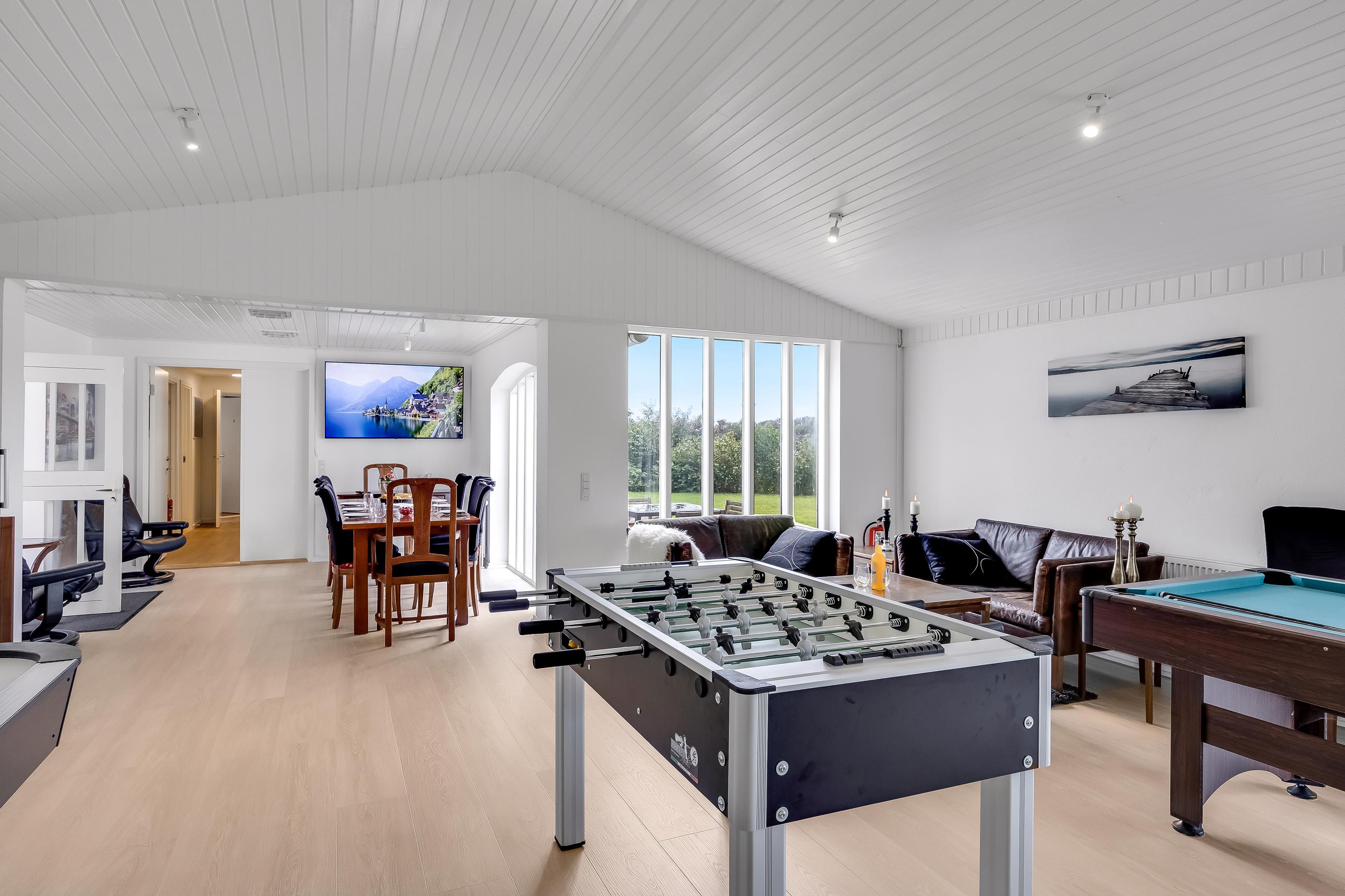 The whole house has underfloor heating, and the indoor climate is kept pleasant with a modern ventilation system that ensures warmth without draught. The living and dining rooms include a dining area, chairs, and built-in TV. The lounge has large glass panels, which provide beautiful natural light and direct access to the terrace. In addition, there are three wood-burning stoves, six TVs, and a hall with dining space for up to 40 people – ideal for larger gatherings.