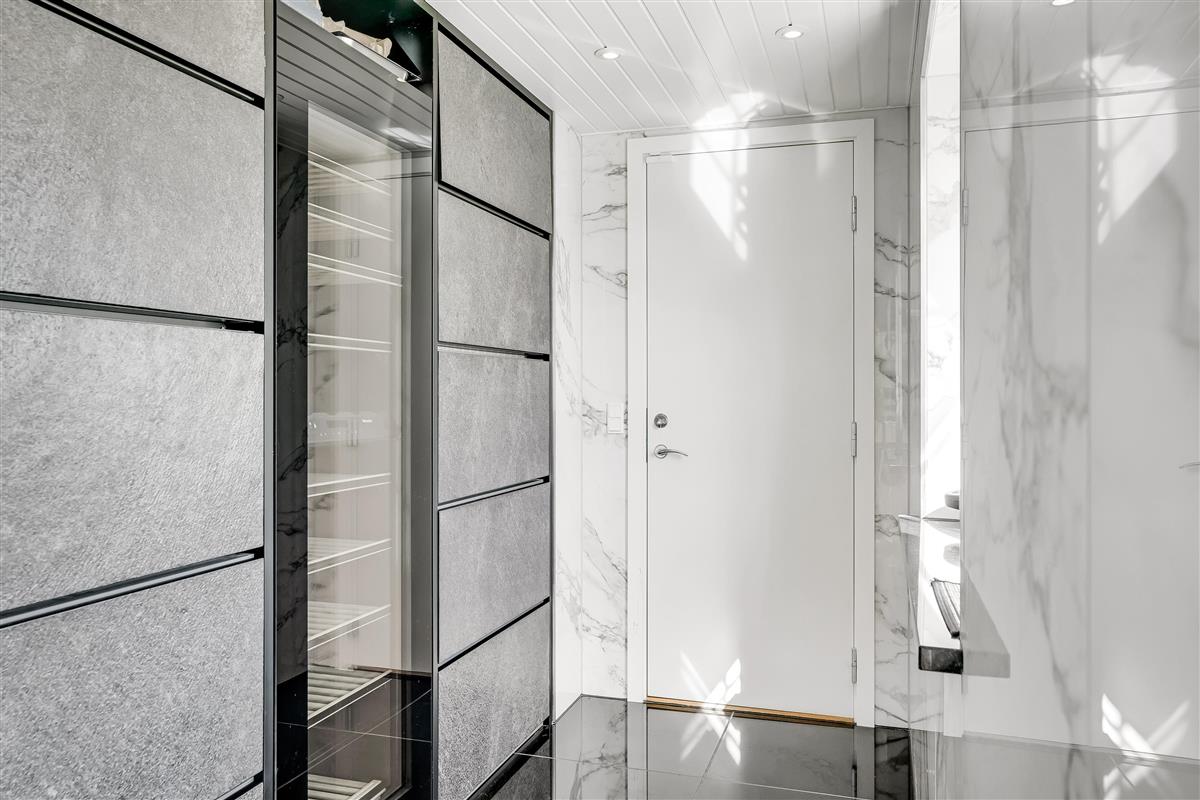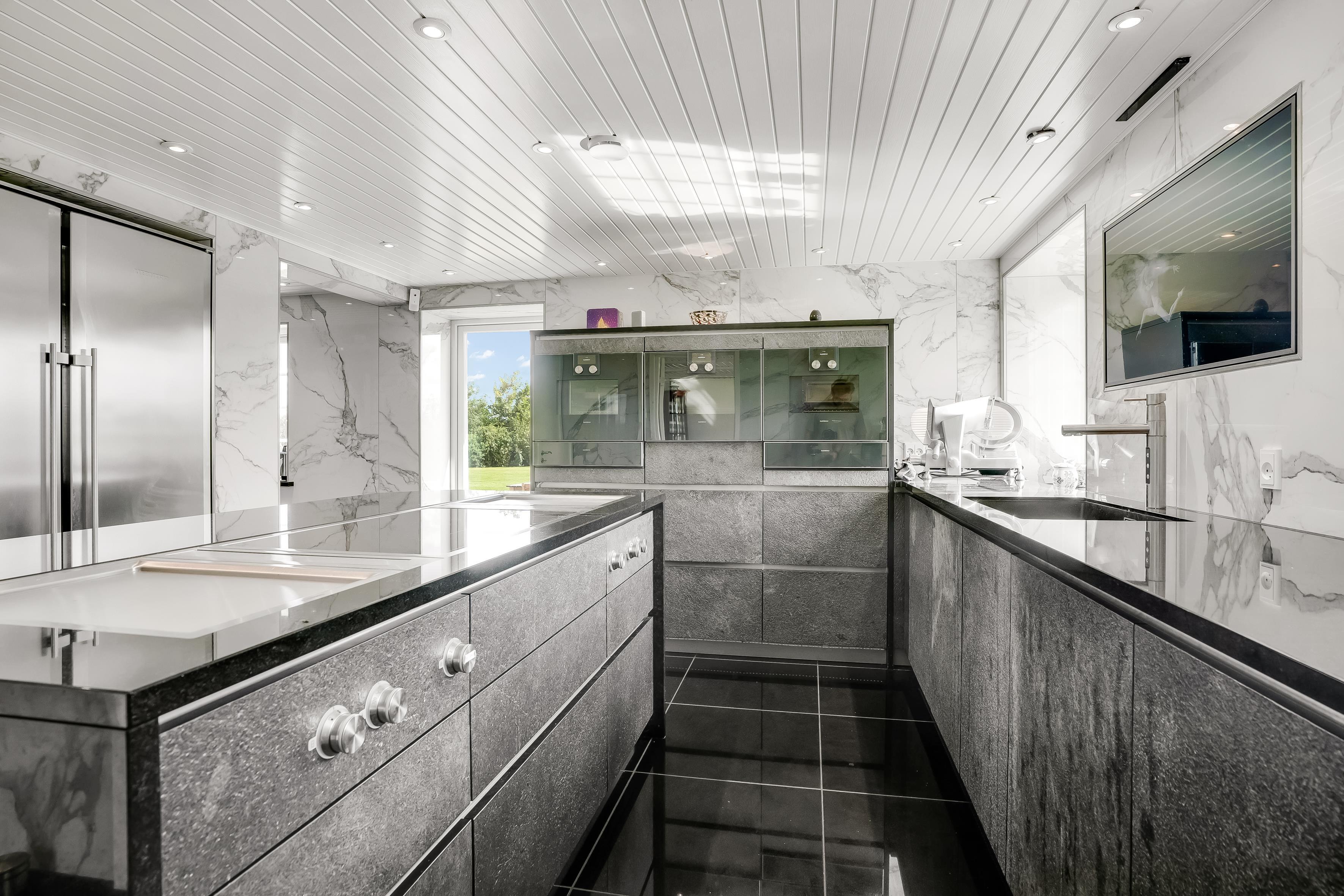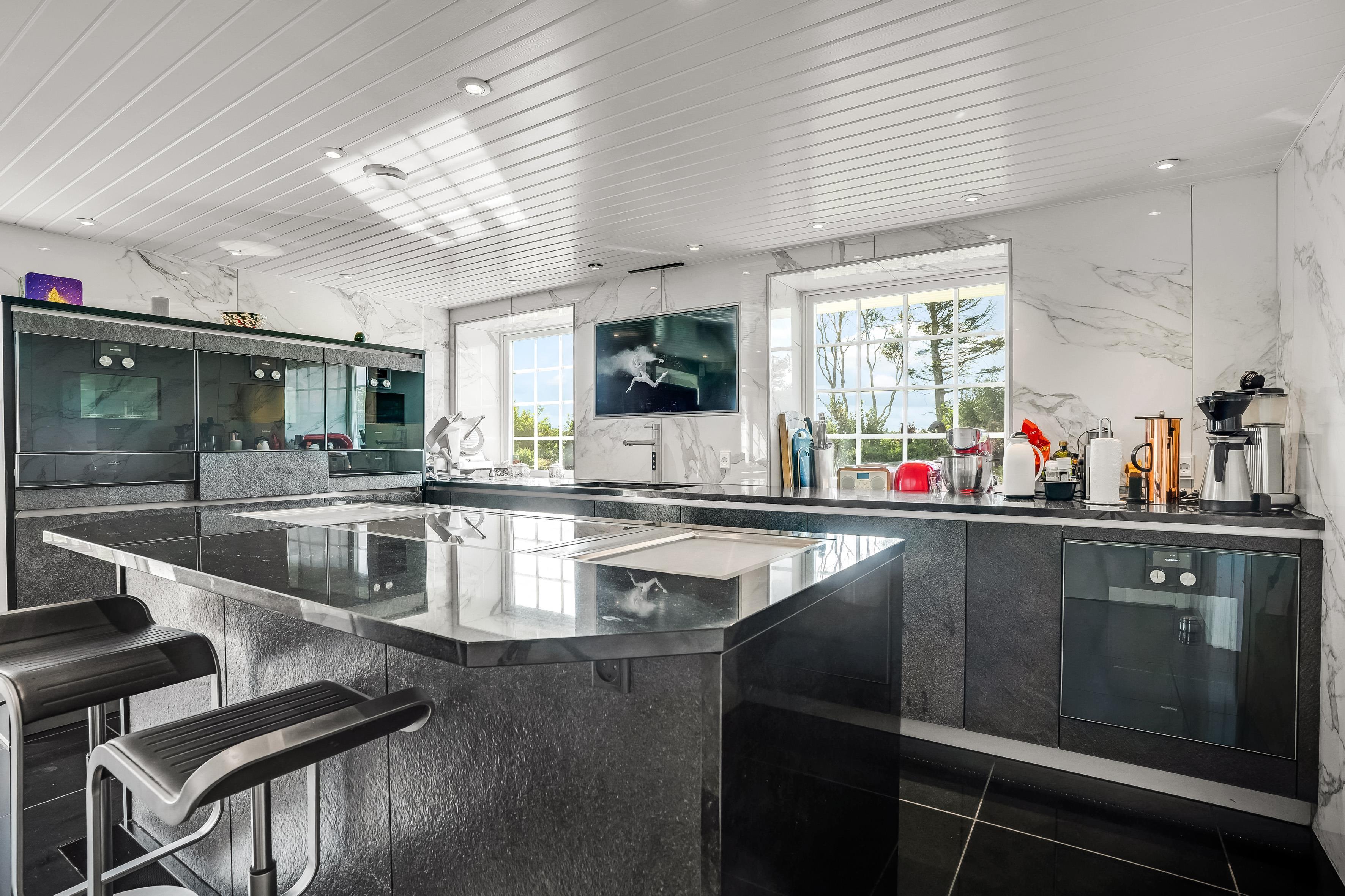 The kitchen is exceptional and stands out clearly from what you normally see. With granite fronts and worktop, two built-in steam ovens, a traditional oven from Gaggenau, matching microwave, wide induction hob, and integrated extractor in the countertop – everything has been thought of. In addition, two teppanyaki plates for Japanese cooking, which are also perfect for warm dishes.