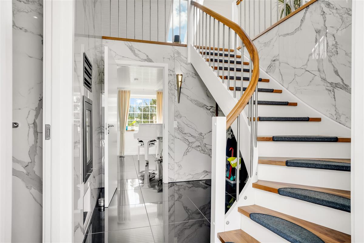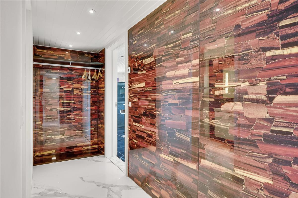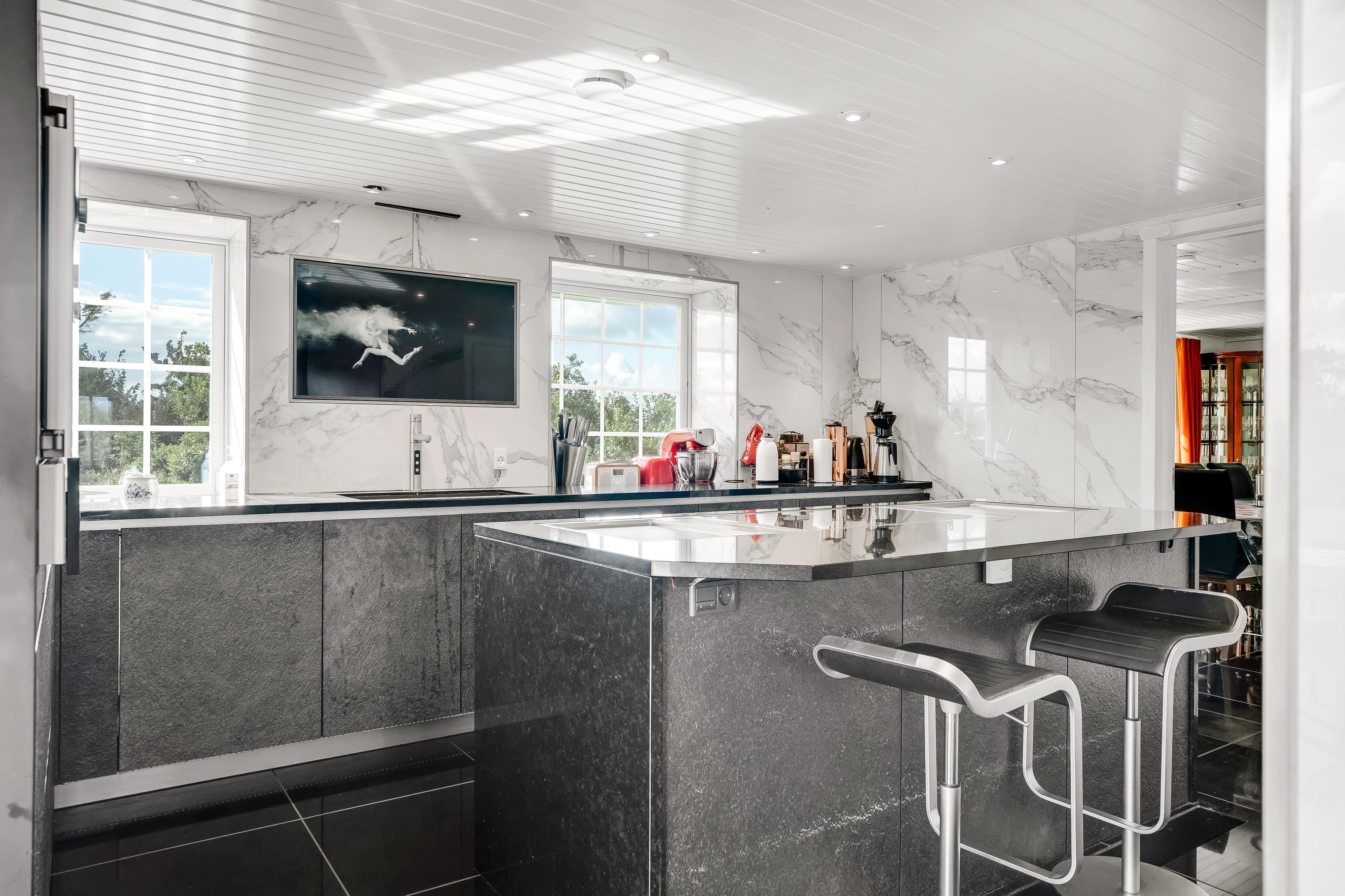 The kitchen is exceptional and stands out clearly from what you normally see. With granite fronts and worktop, two built-in steam ovens, a traditional oven from Gaggenau, matching microwave, wide induction hob, and integrated extractor in the countertop – everything has been thought of. In addition, two teppanyaki plates for Japanese cooking, which are also perfect for warm dishes.