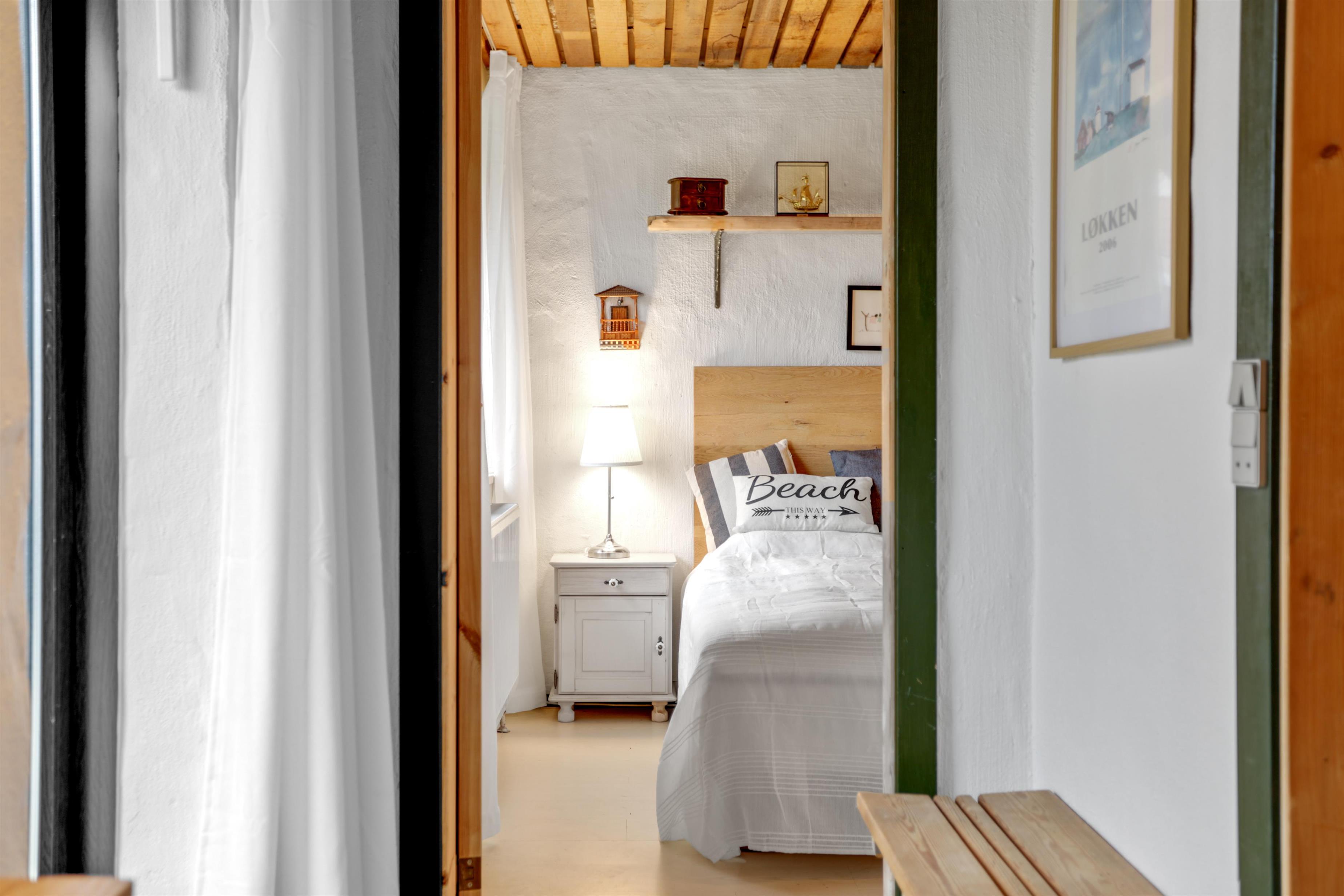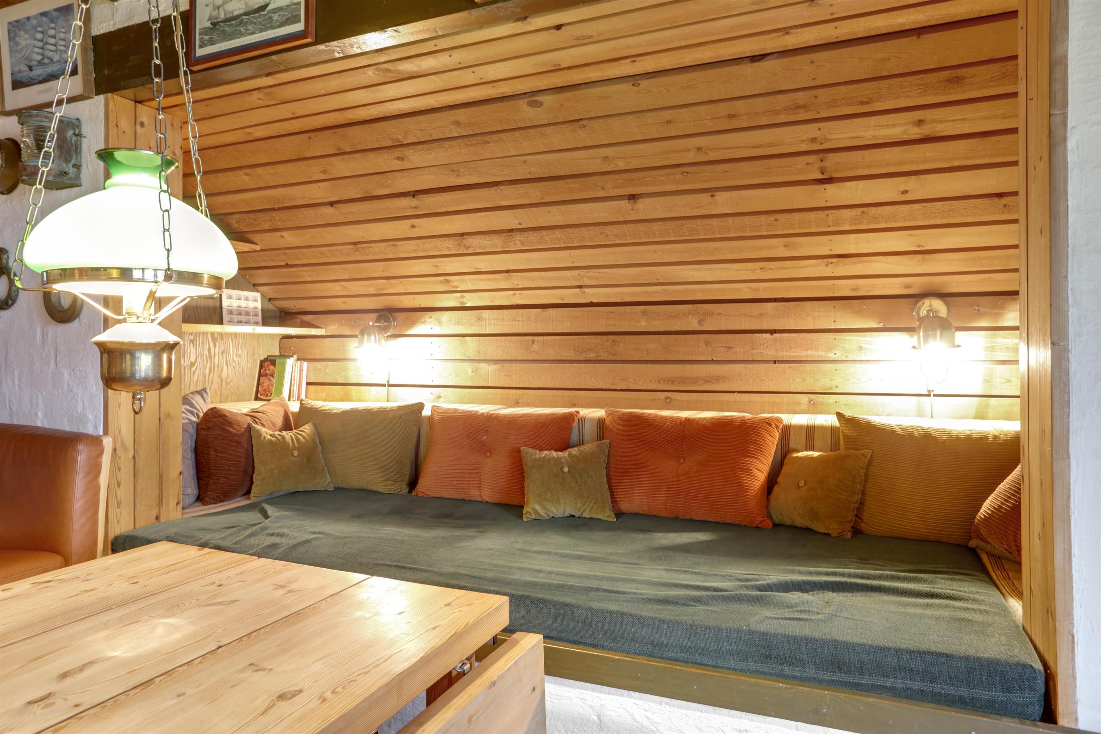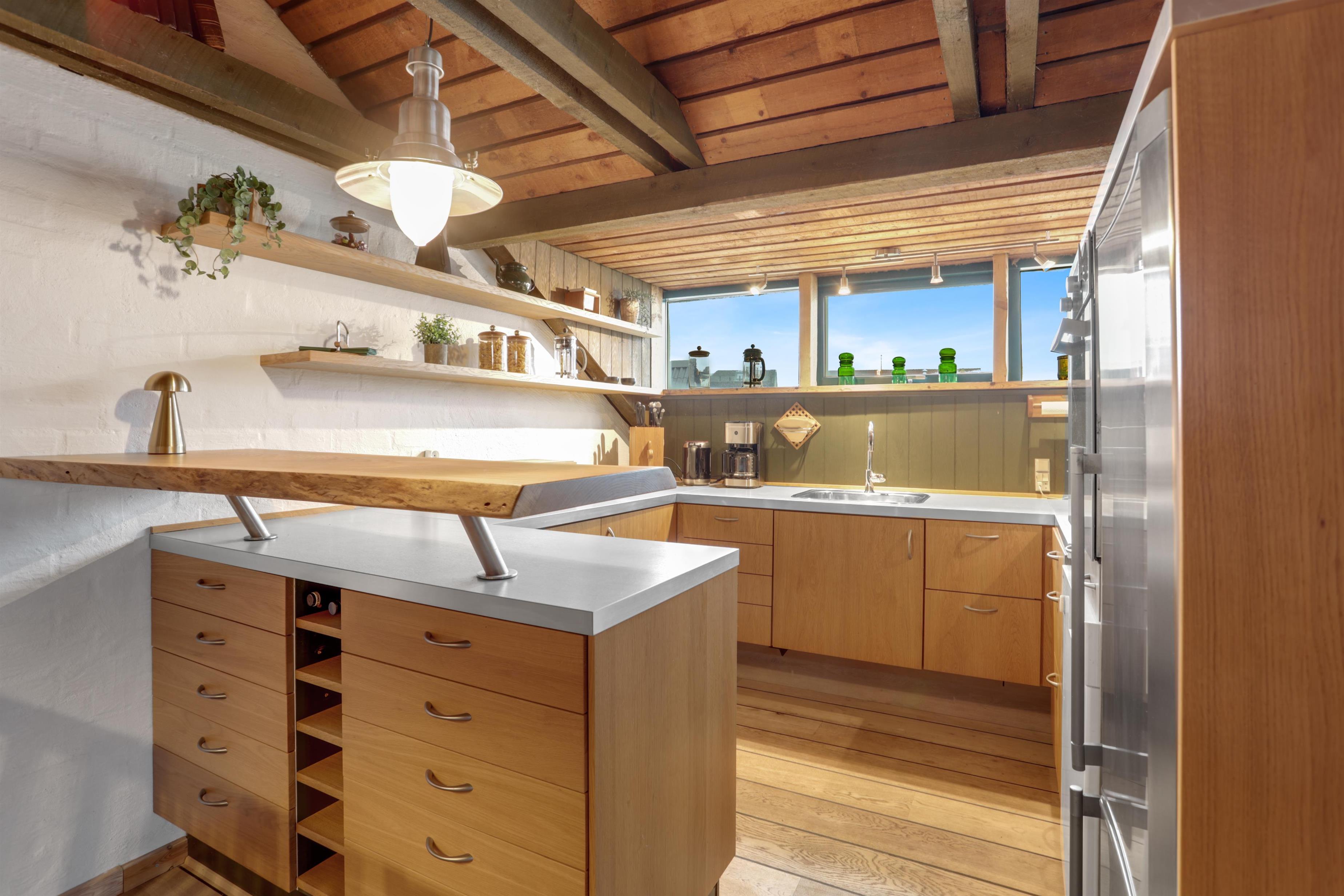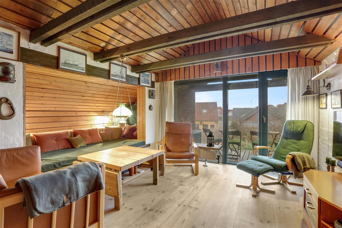 Upstairs, the kitchen/dining area connects seamlessly to the living room, which opens onto a terrace that brings nature right into the space. From here, you can overlook the center of Løkken while hearing the waves crash in the background. This floor is equally cozy, featuring a spacious alcove that doubles as a lounge sofa or two extra sleeping spaces. From both the kitchen and living room, you can enjoy the centrally placed wood-burning stove.