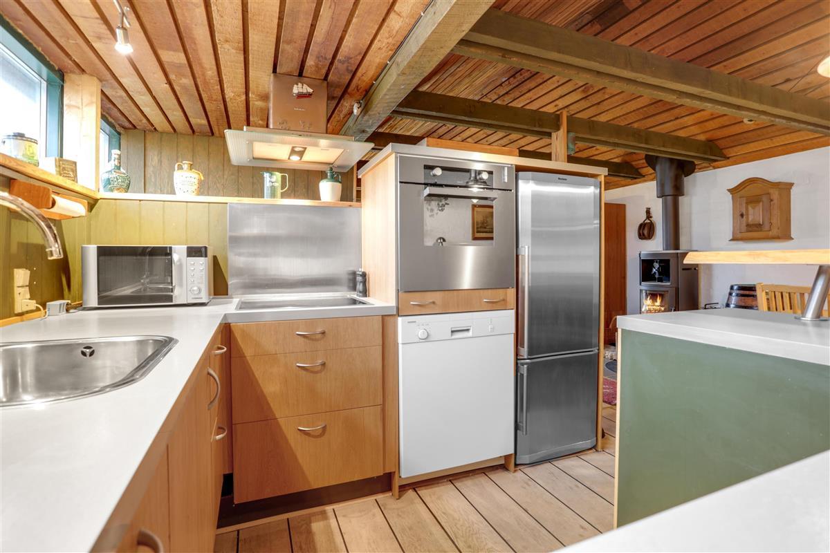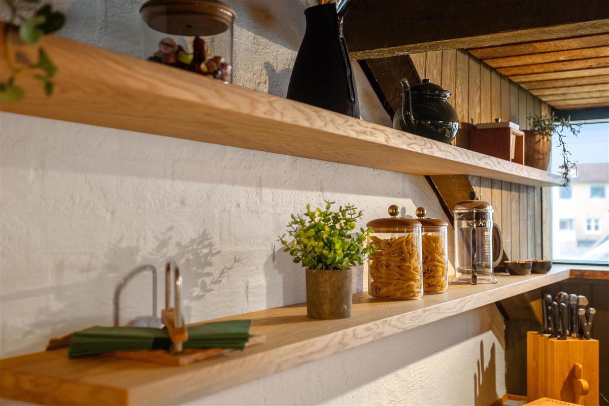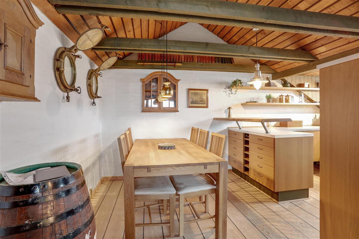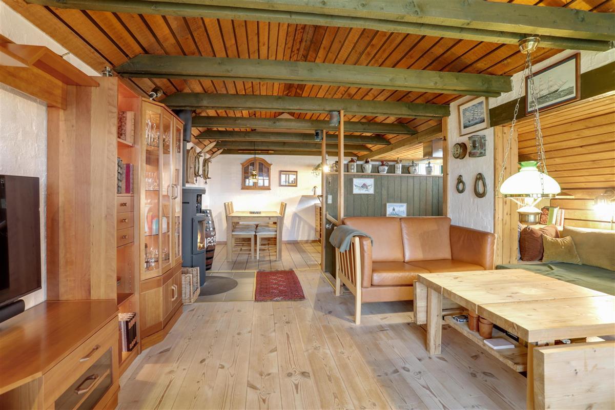 Upstairs, the kitchen/dining area connects seamlessly to the living room, which opens onto a terrace that brings nature right into the space. From here, you can overlook the center of Løkken while hearing the waves crash in the background. This floor is equally cozy, featuring a spacious alcove that doubles as a lounge sofa or two extra sleeping spaces. From both the kitchen and living room, you can enjoy the centrally placed wood-burning stove.