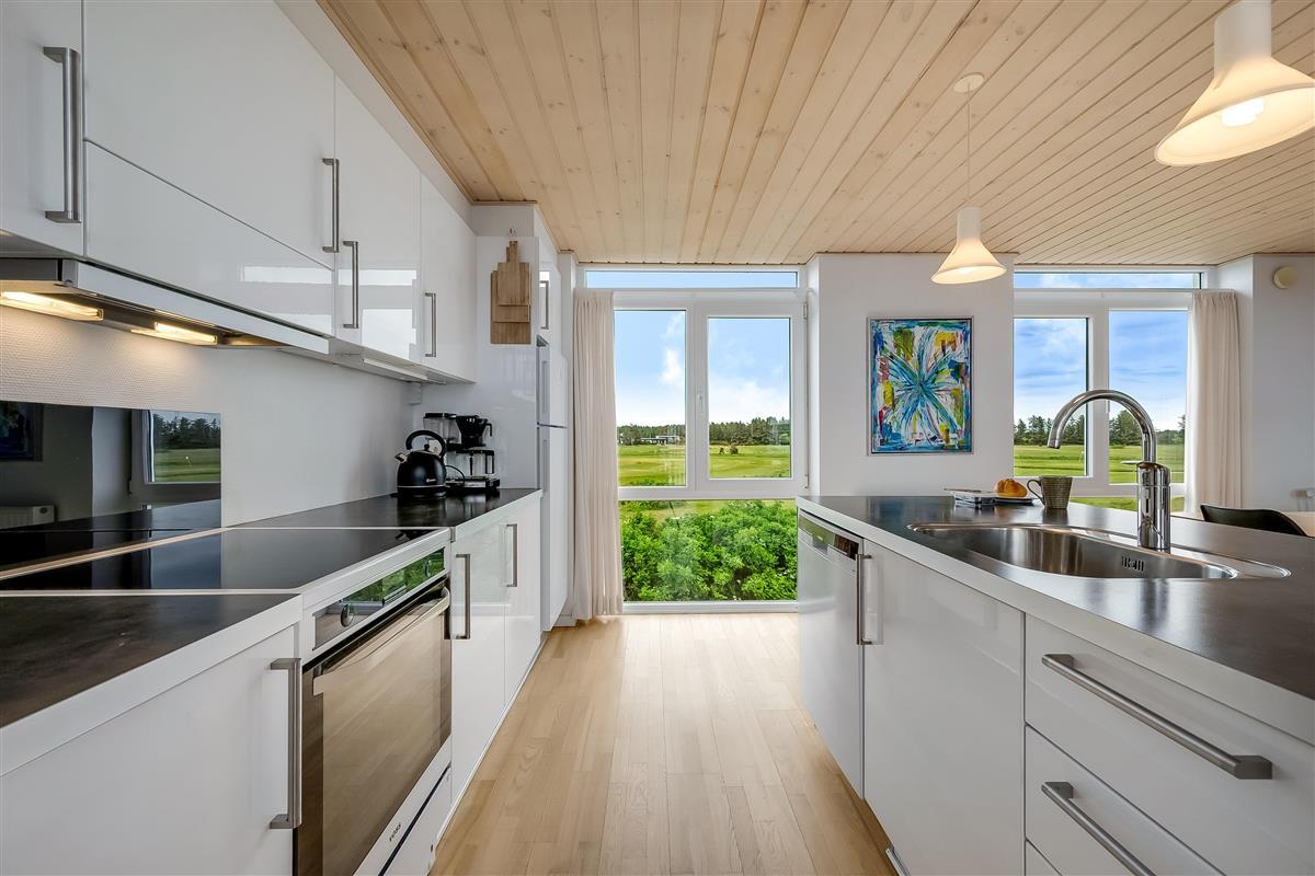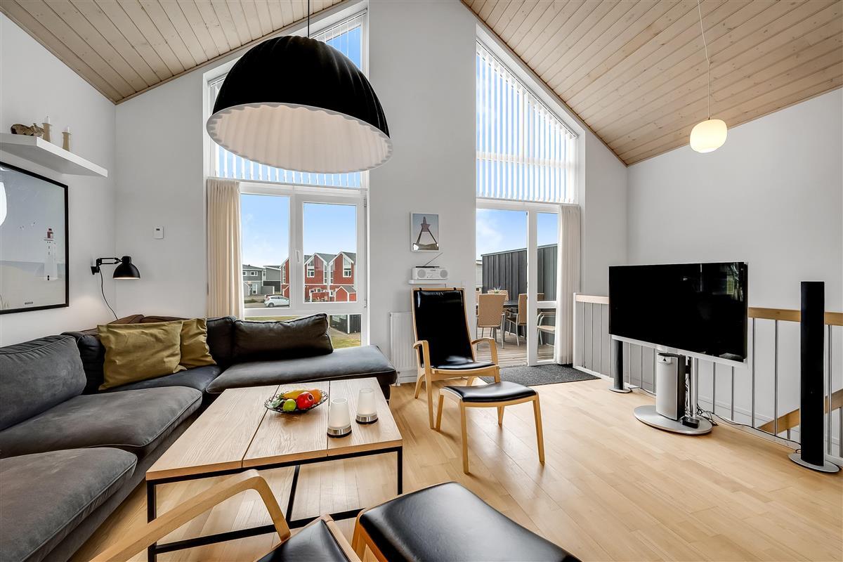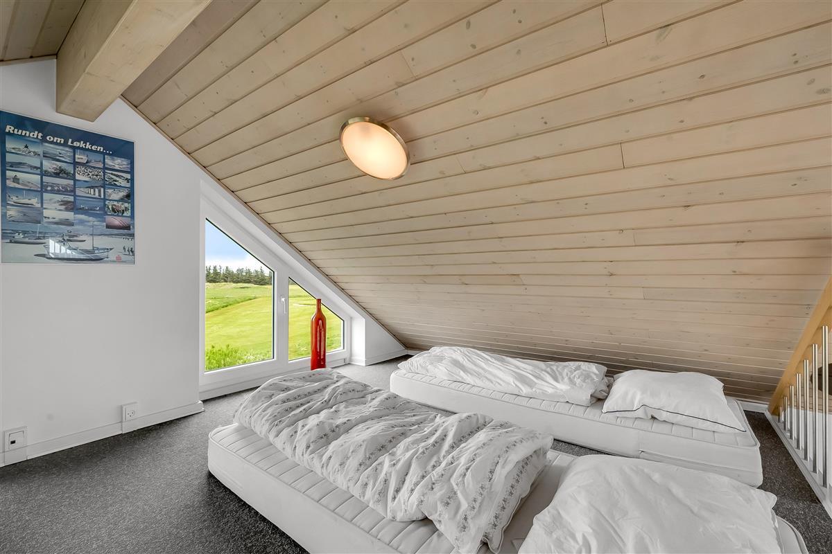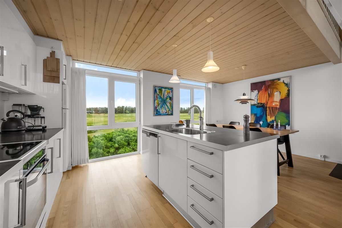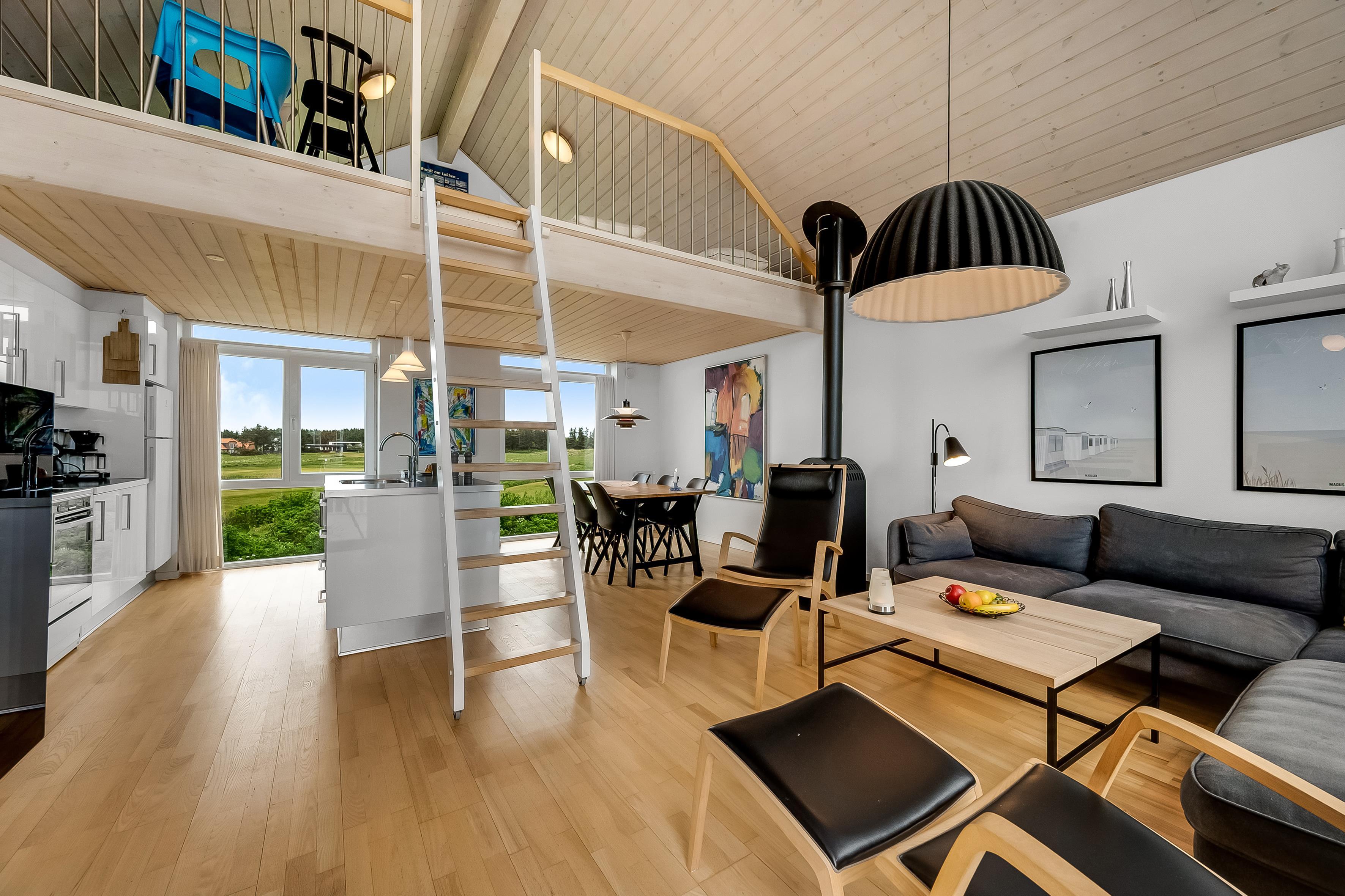 On the ground floor, the holiday home welcomes you with an inviting entrance and stairs leading to the first floor. Here, you'll find three bedrooms and a bathroom. The first floor features a bright and spacious open-plan kitchen and a cozy living room with access to a lovely terrace on one side and views over the golf course and Åsendrup Banesti on the other. From the kitchen, there's access to a large and cozy loft with the possibility of two additional sleeping spaces. The first floor impresses with its high ceilings and fantastic views.?