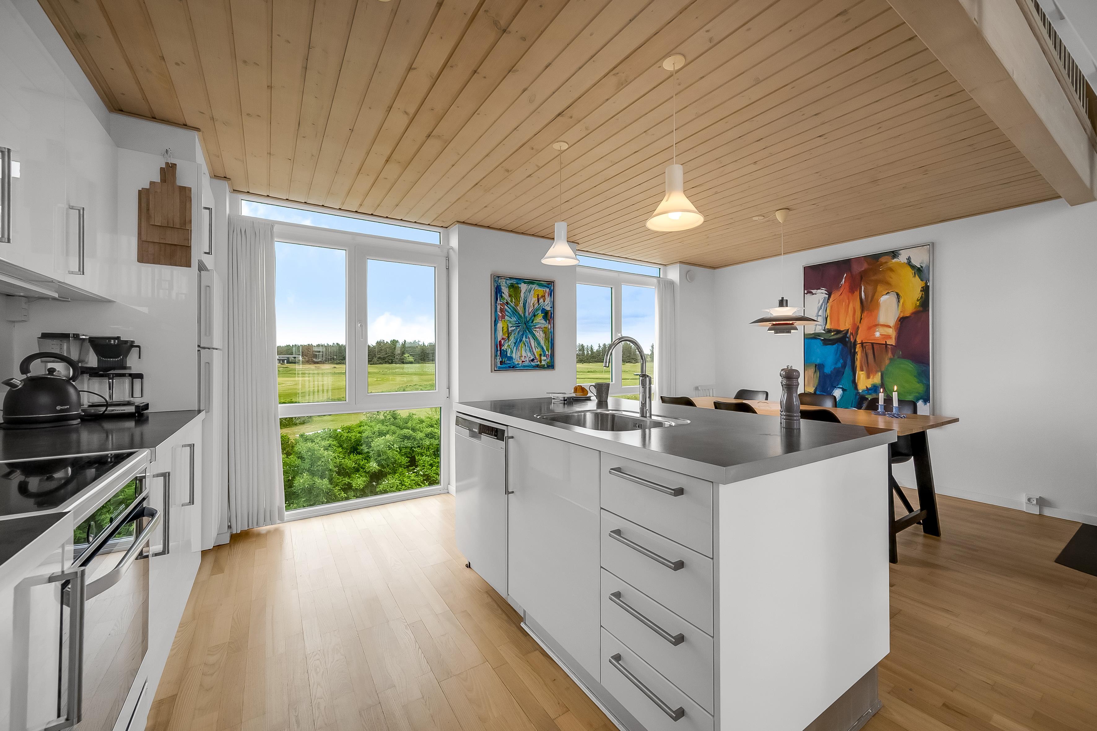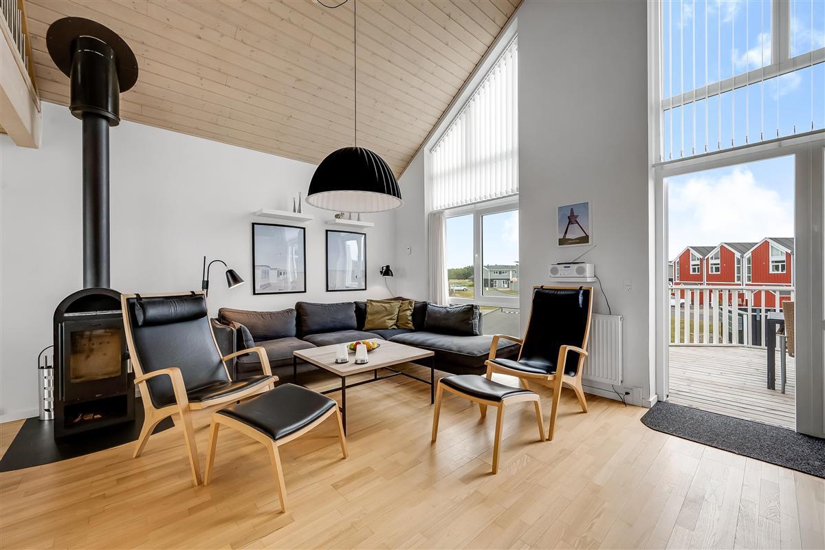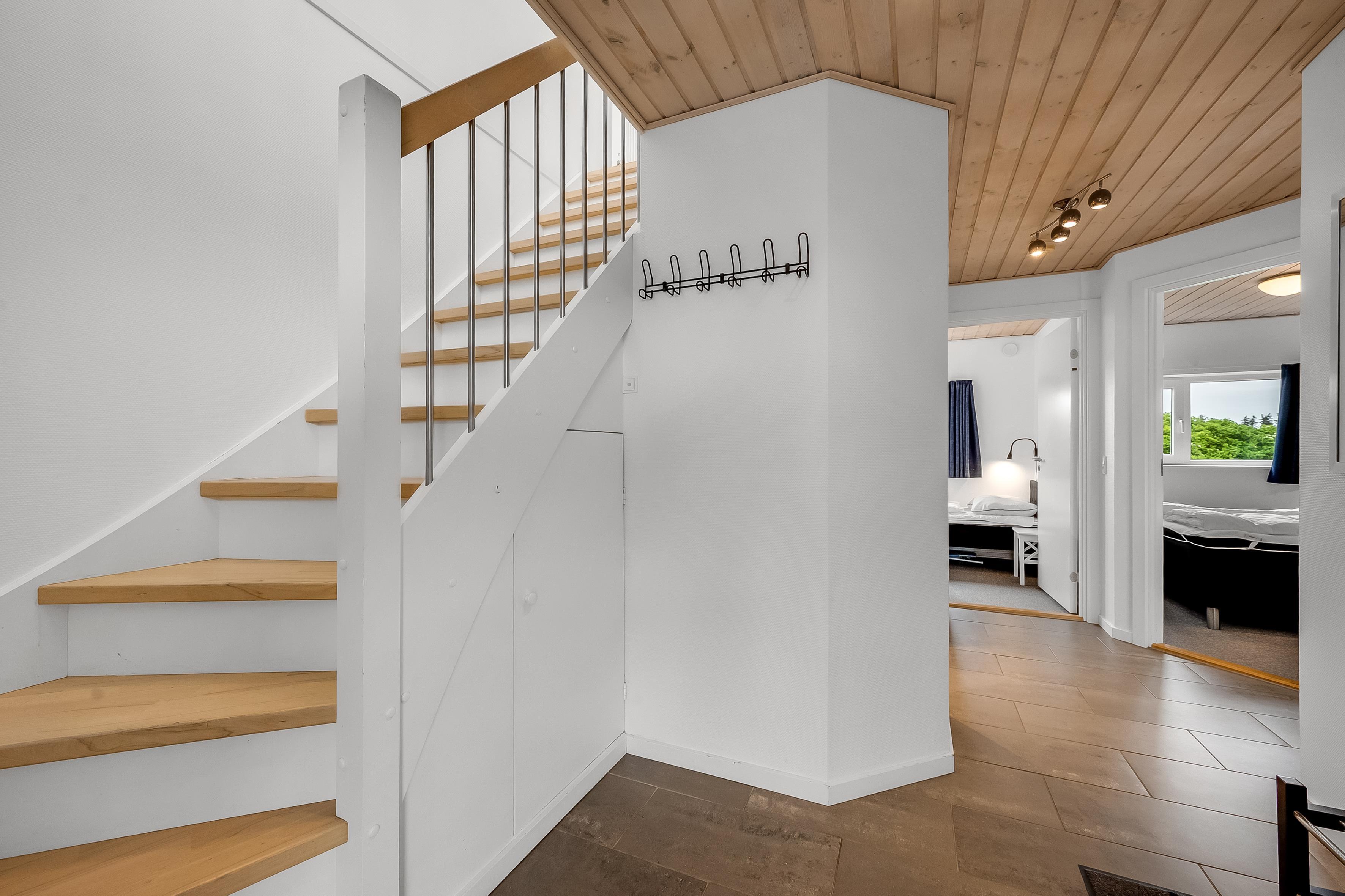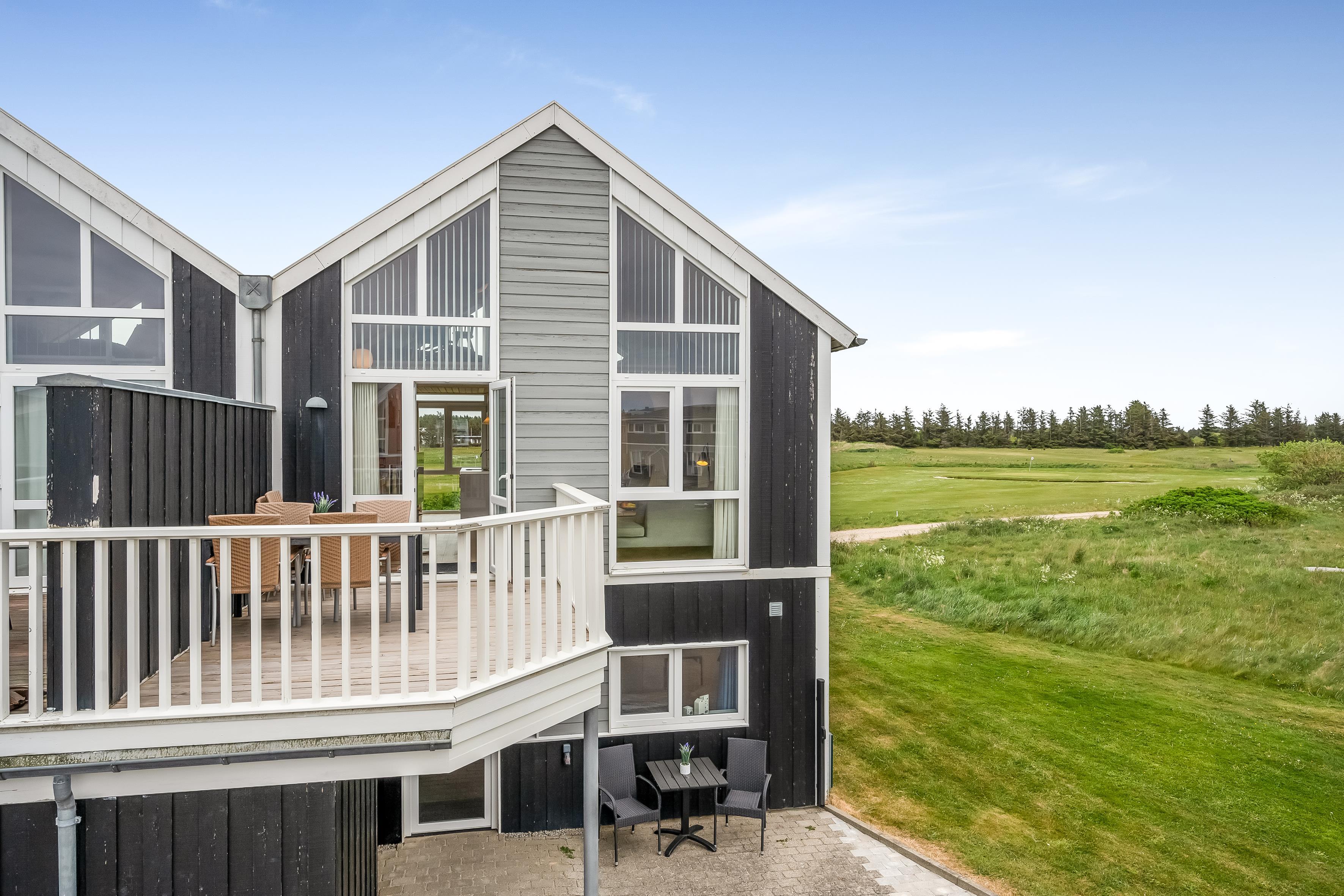 On the ground floor, the holiday home welcomes you with an inviting entrance and stairs leading to the first floor. Here, you'll find three bedrooms and a bathroom. The first floor features a bright and spacious open-plan kitchen and a cozy living room with access to a lovely terrace on one side and views over the golf course and Åsendrup Banesti on the other. From the kitchen, there's access to a large and cozy loft with the possibility of two additional sleeping spaces. The first floor impresses with its high ceilings and fantastic views.?