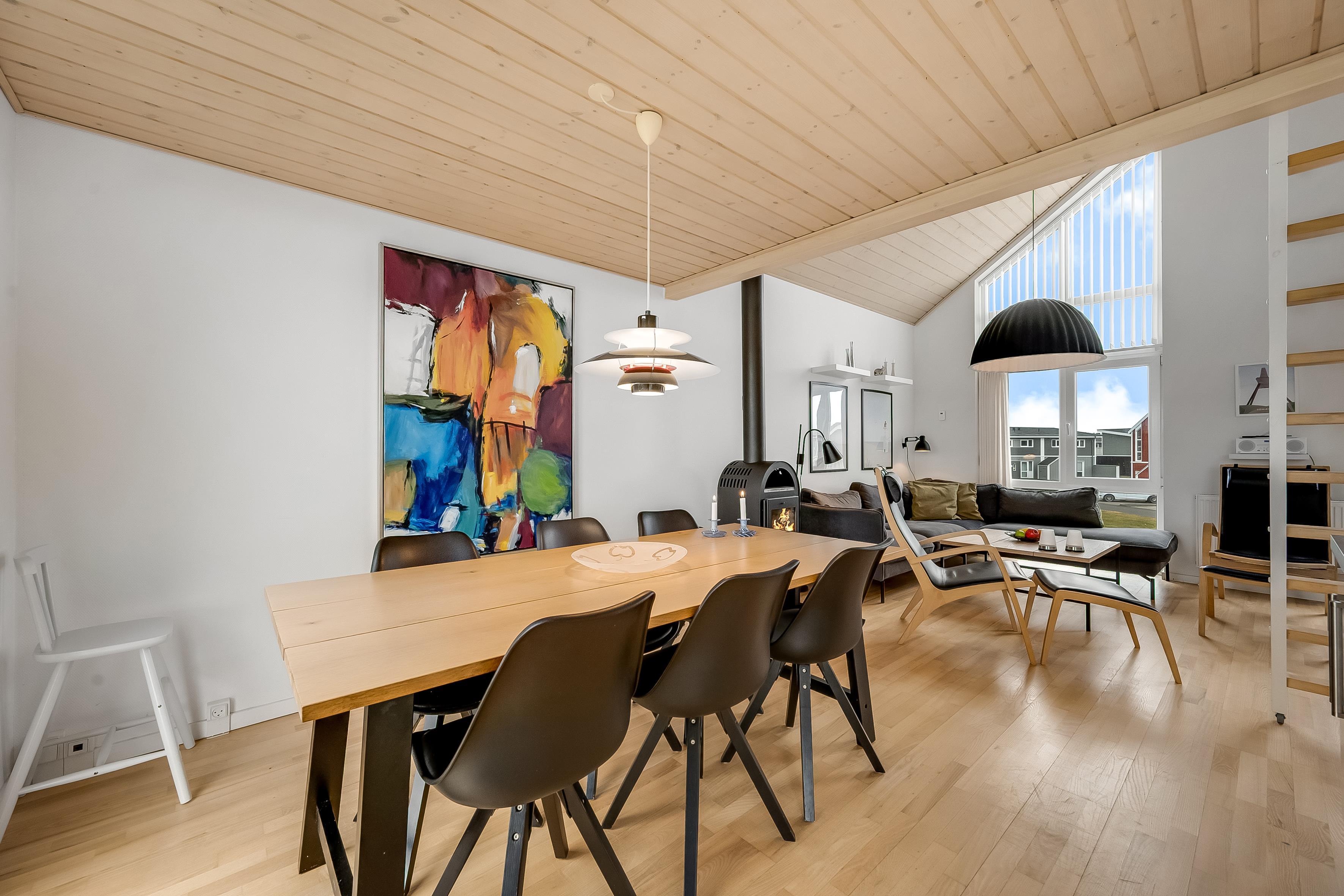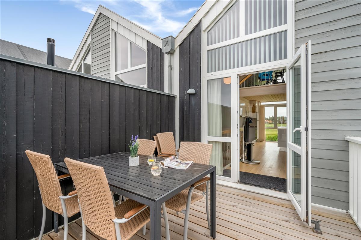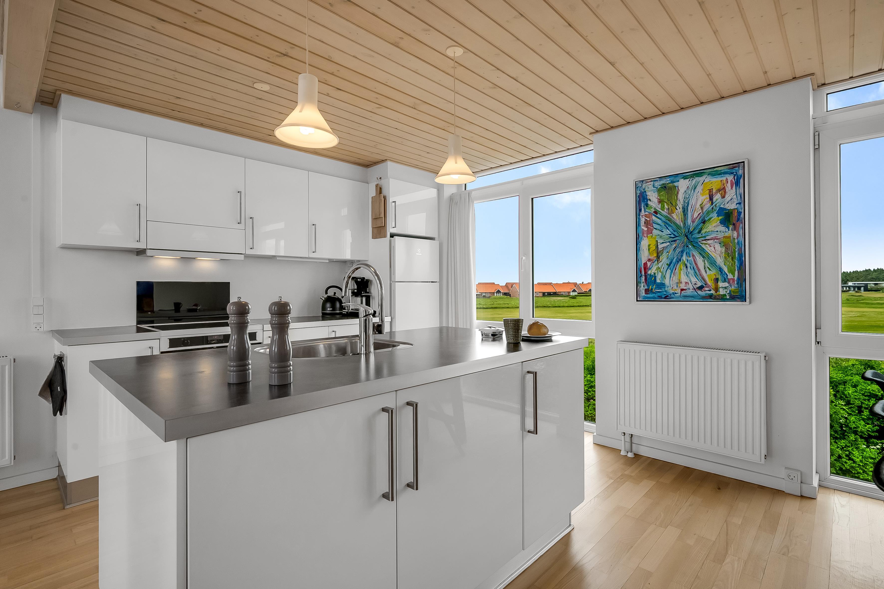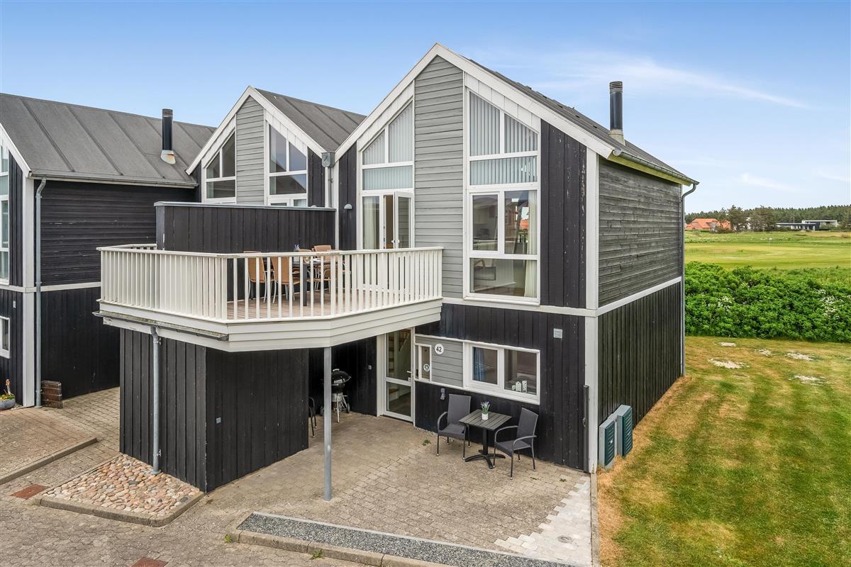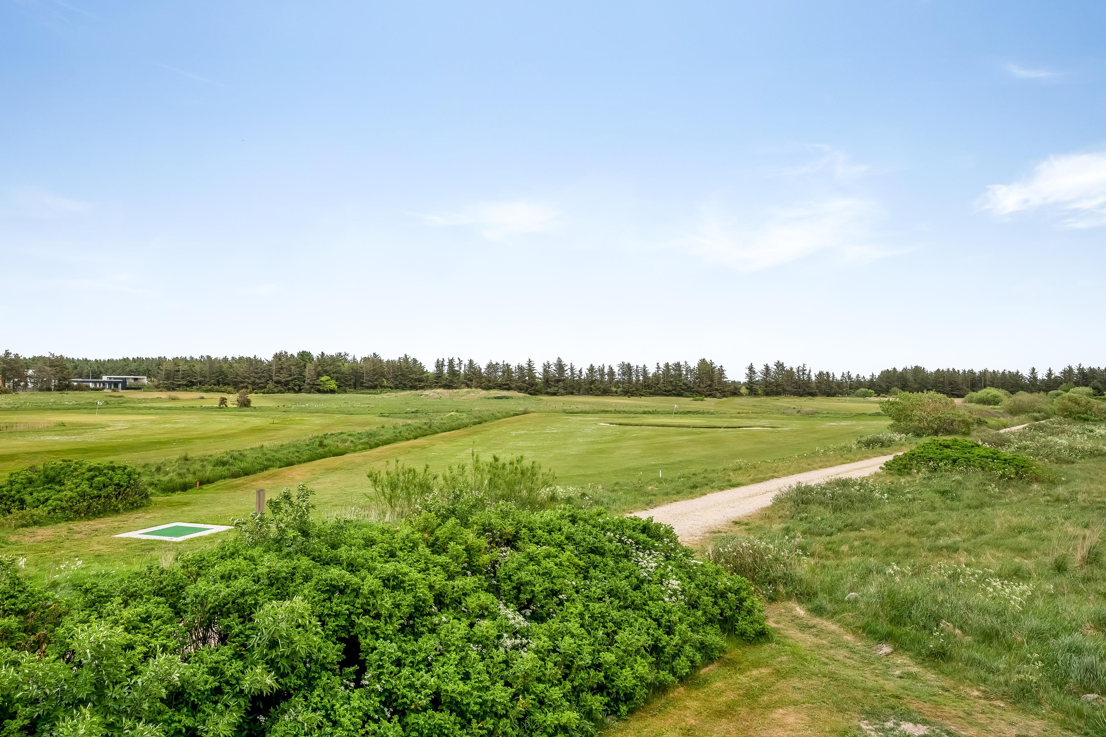 On the ground floor, the holiday home welcomes you with an inviting entrance and stairs leading to the first floor. Here, you'll find three bedrooms and a bathroom. The first floor features a bright and spacious open-plan kitchen and a cozy living room with access to a lovely terrace on one side and views over the golf course and Åsendrup Banesti on the other. From the kitchen, there's access to a large and cozy loft with the possibility of two additional sleeping spaces. The first floor impresses with its high ceilings and fantastic views.?