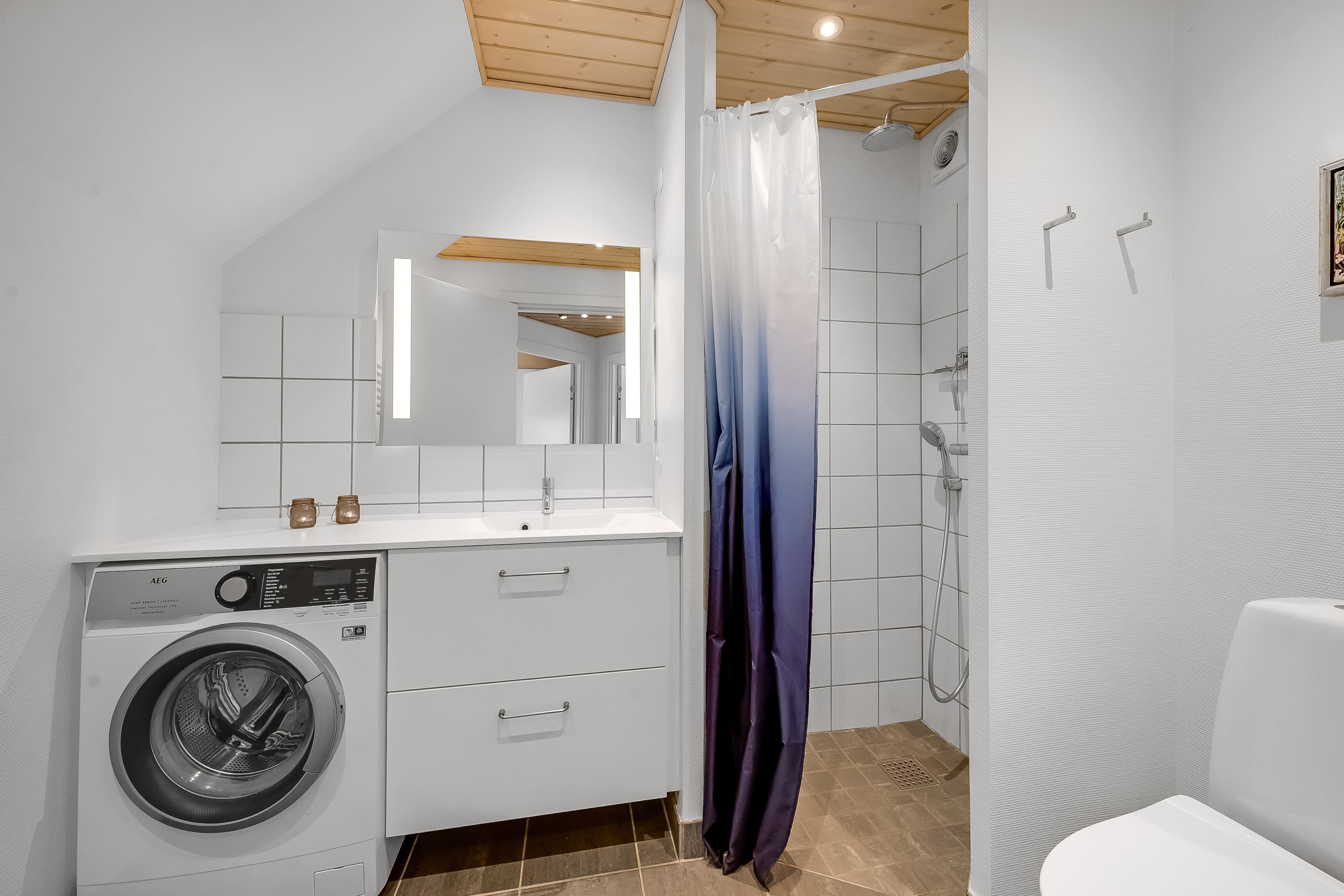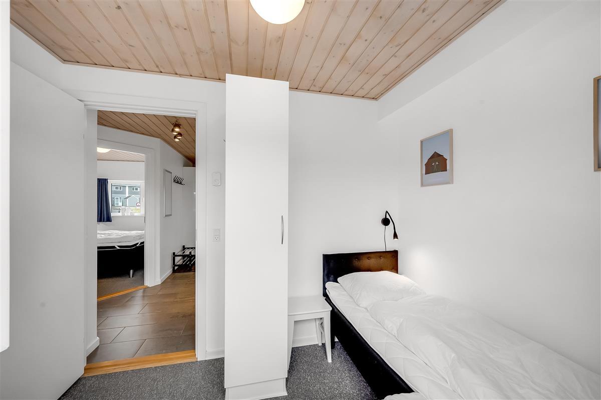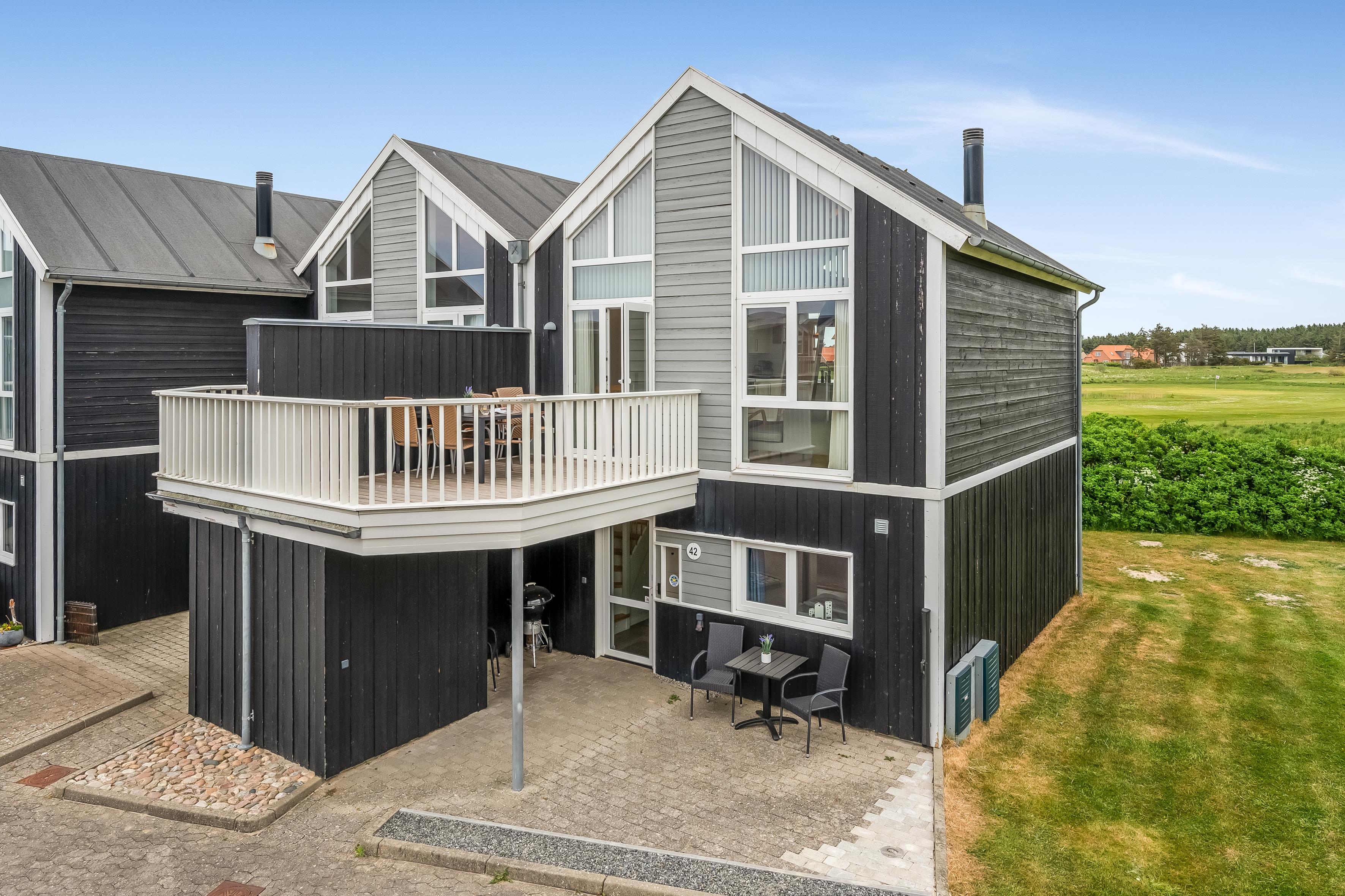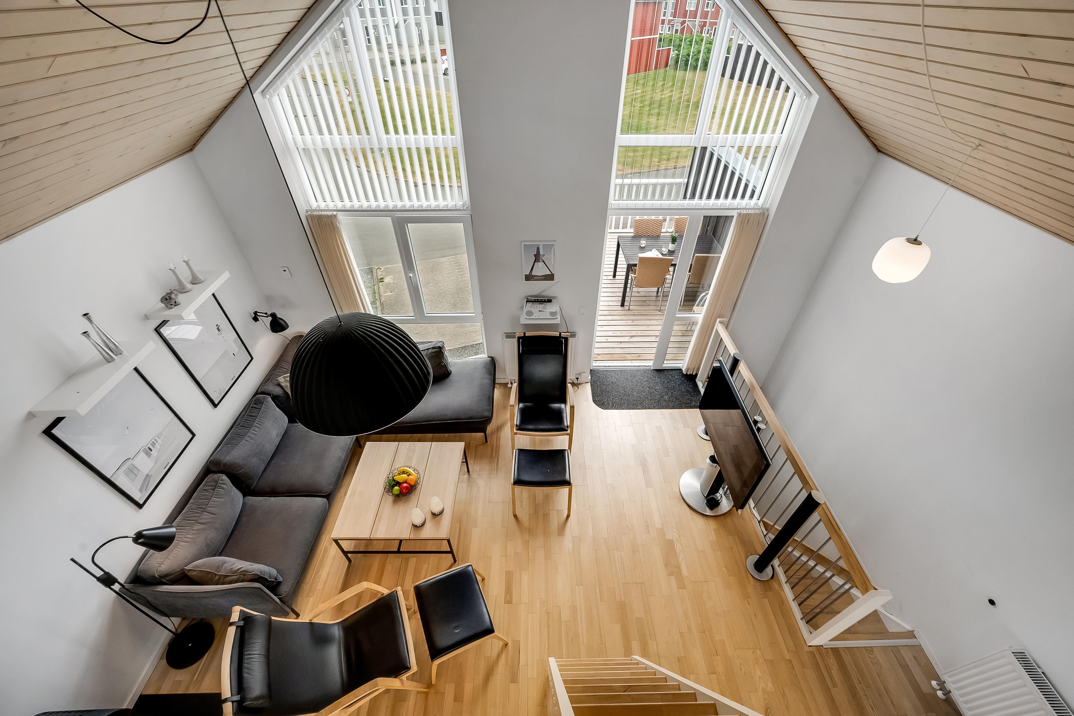 On the ground floor, the holiday home welcomes you with an inviting entrance and stairs leading to the first floor. Here, you'll find three bedrooms and a bathroom. The first floor features a bright and spacious open-plan kitchen and a cozy living room with access to a lovely terrace on one side and views over the golf course and Åsendrup Banesti on the other. From the kitchen, there's access to a large and cozy loft with the possibility of two additional sleeping spaces. The first floor impresses with its high ceilings and fantastic views.?
