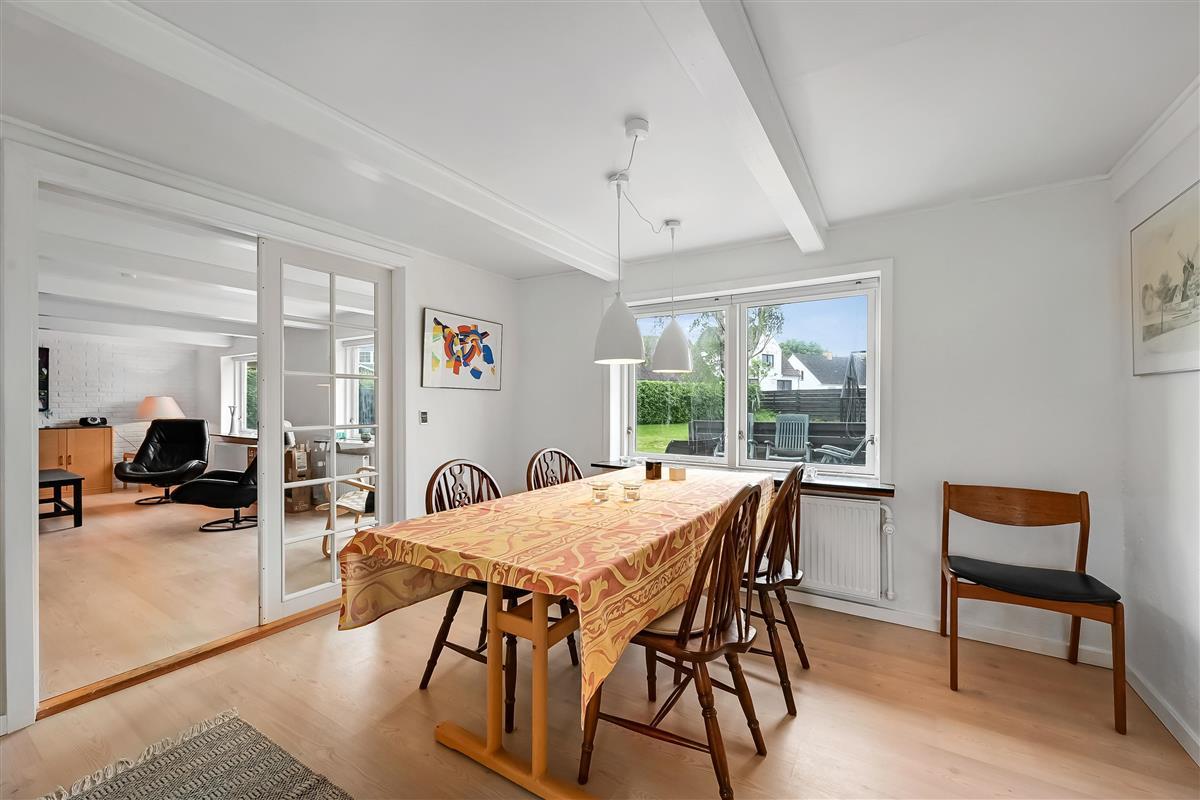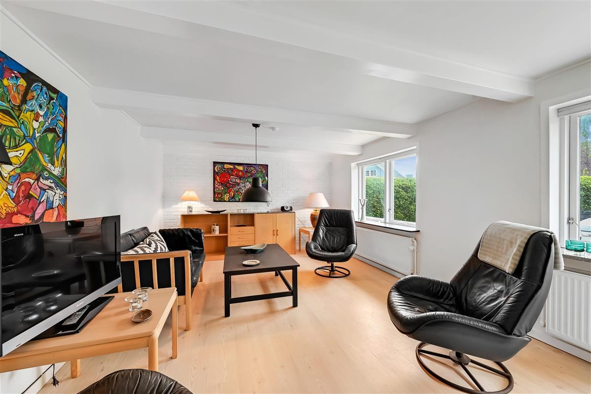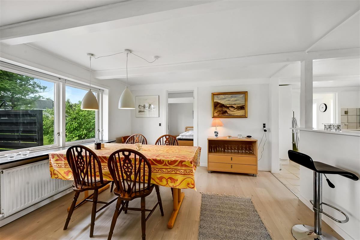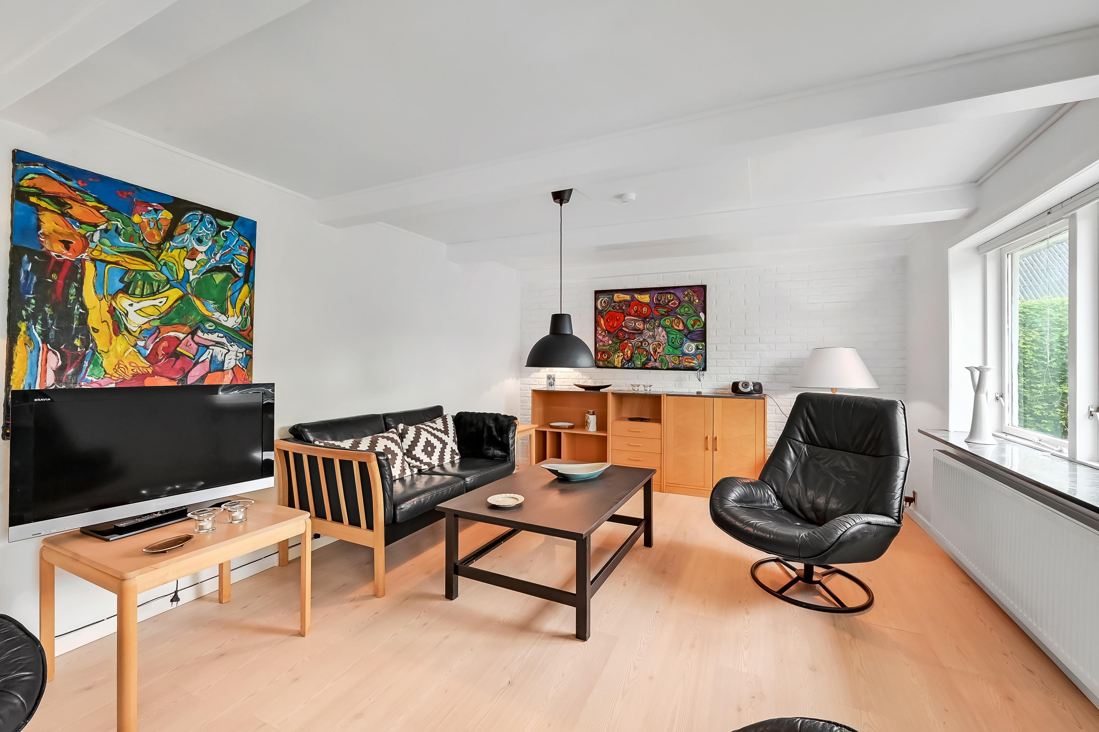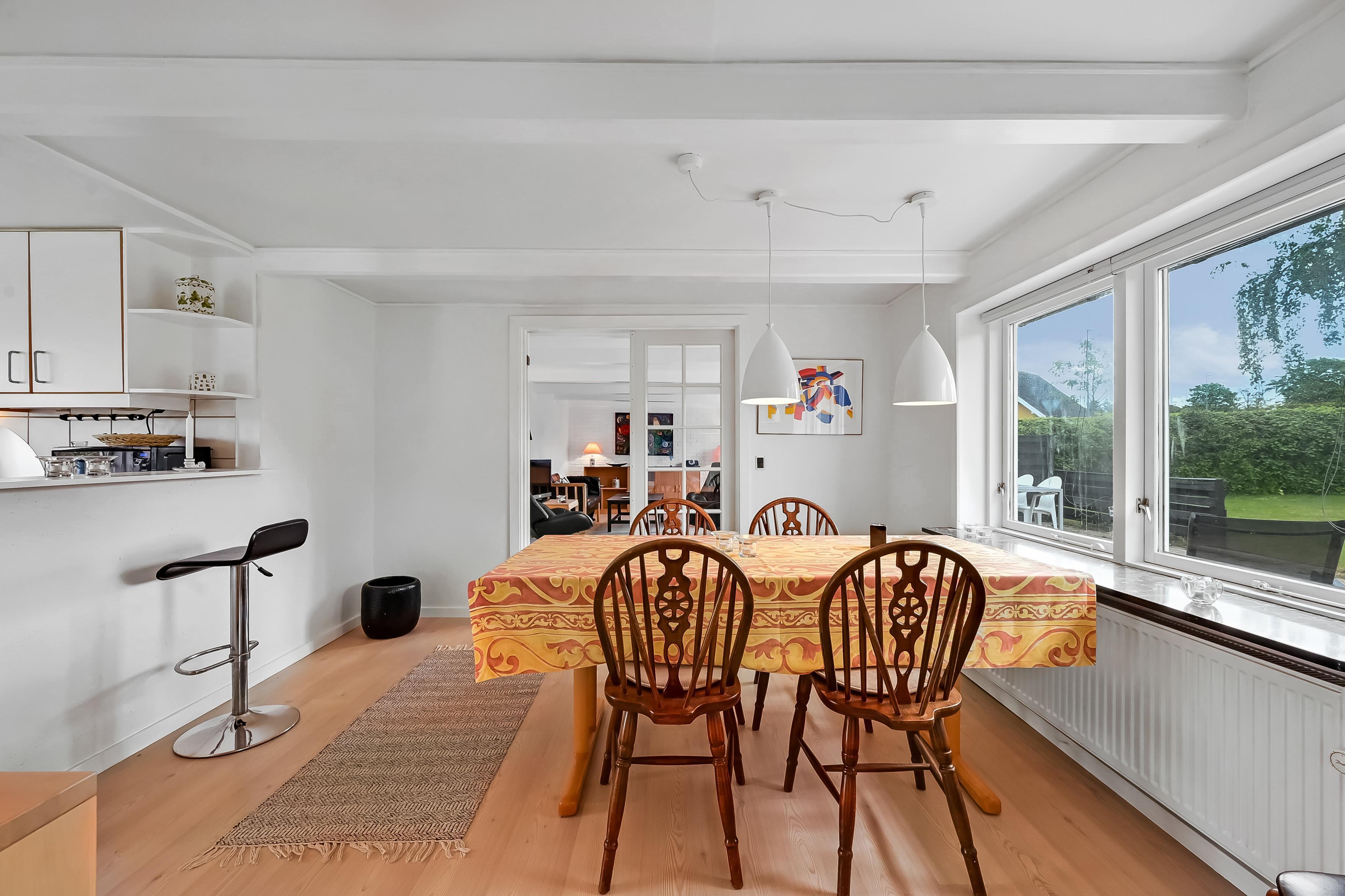 The house is 120 m² and spread over two floors. On the ground floor, you'll find a bright and open living space with a living room and dining kitchen in one. The kitchen is connected to the dining area and is cosy and well-lit – a great space for cooking, relaxing, or playing games.