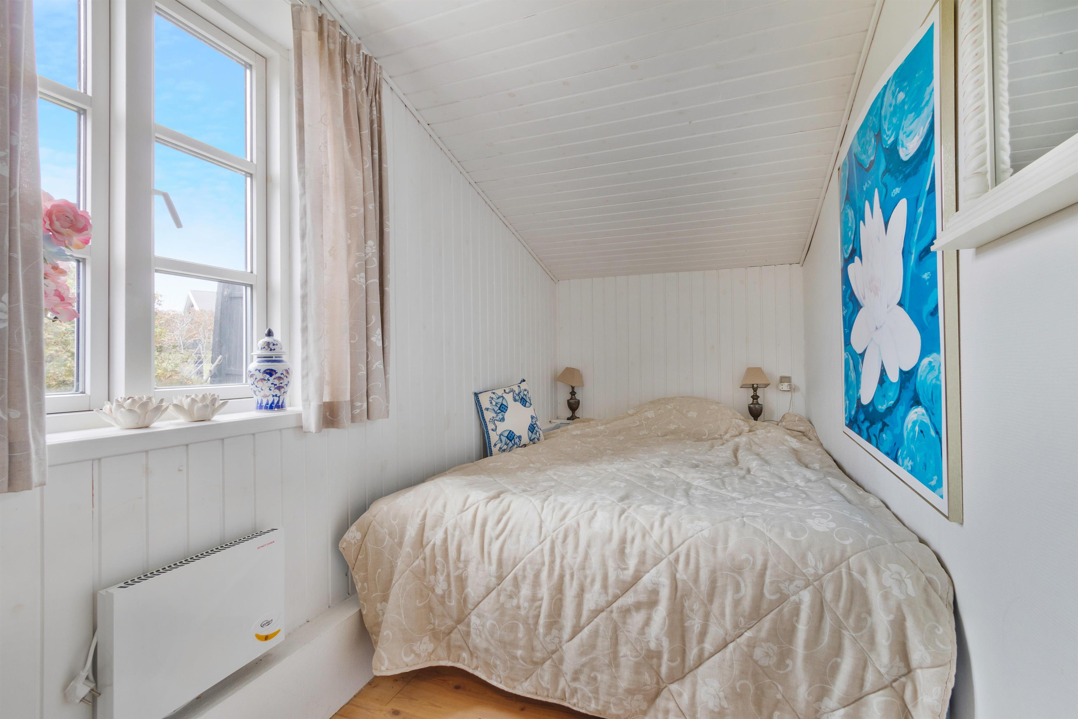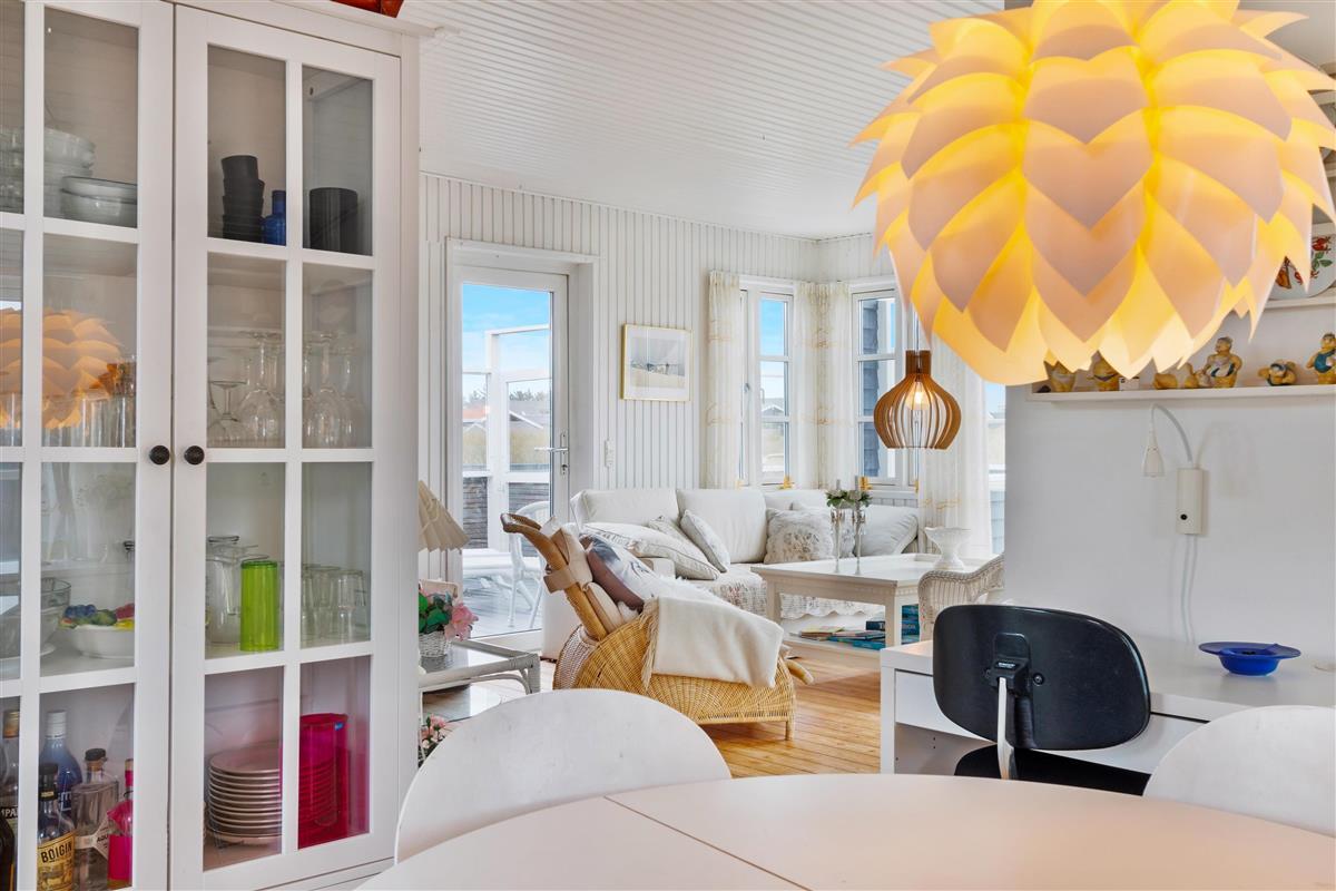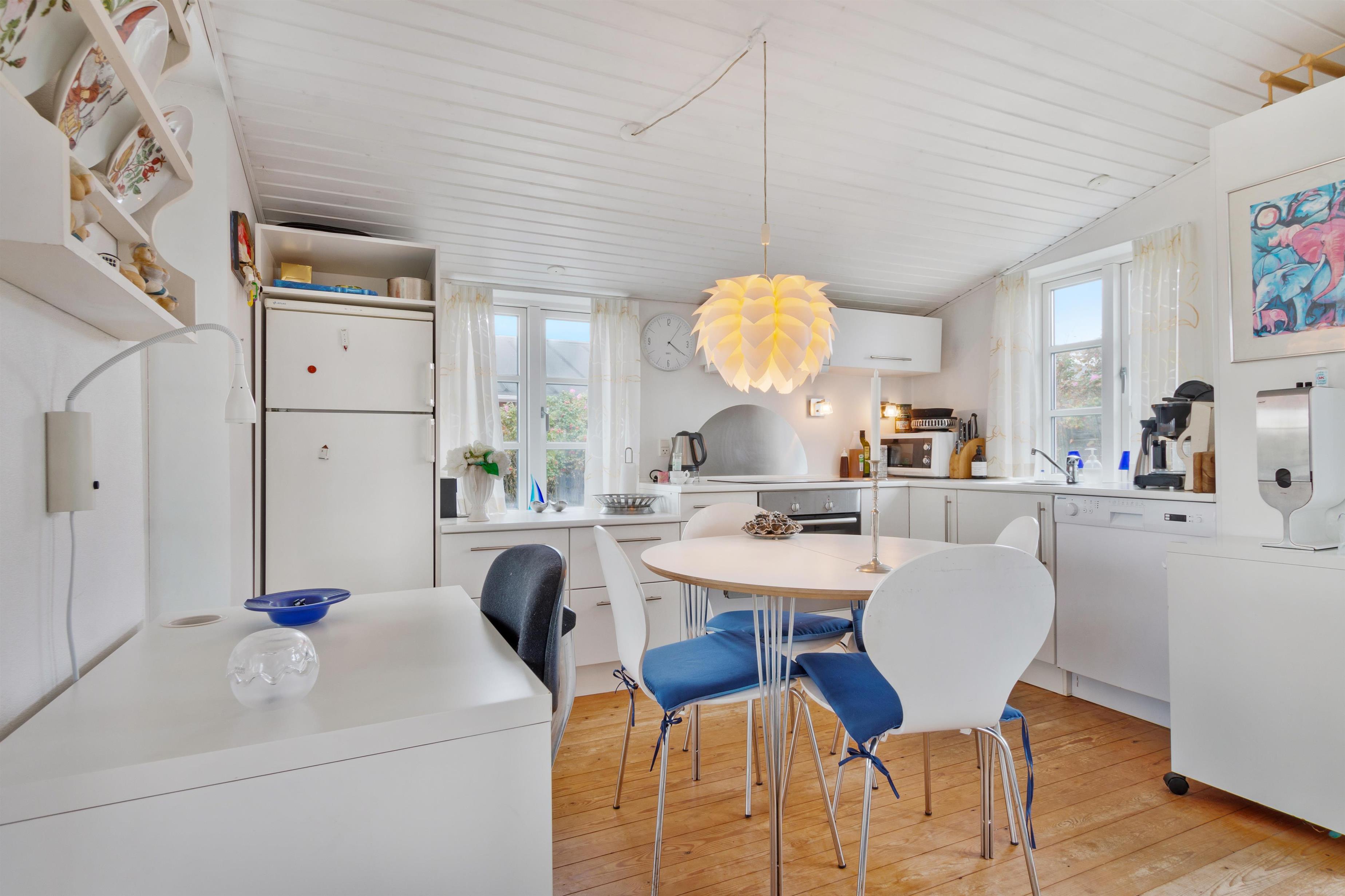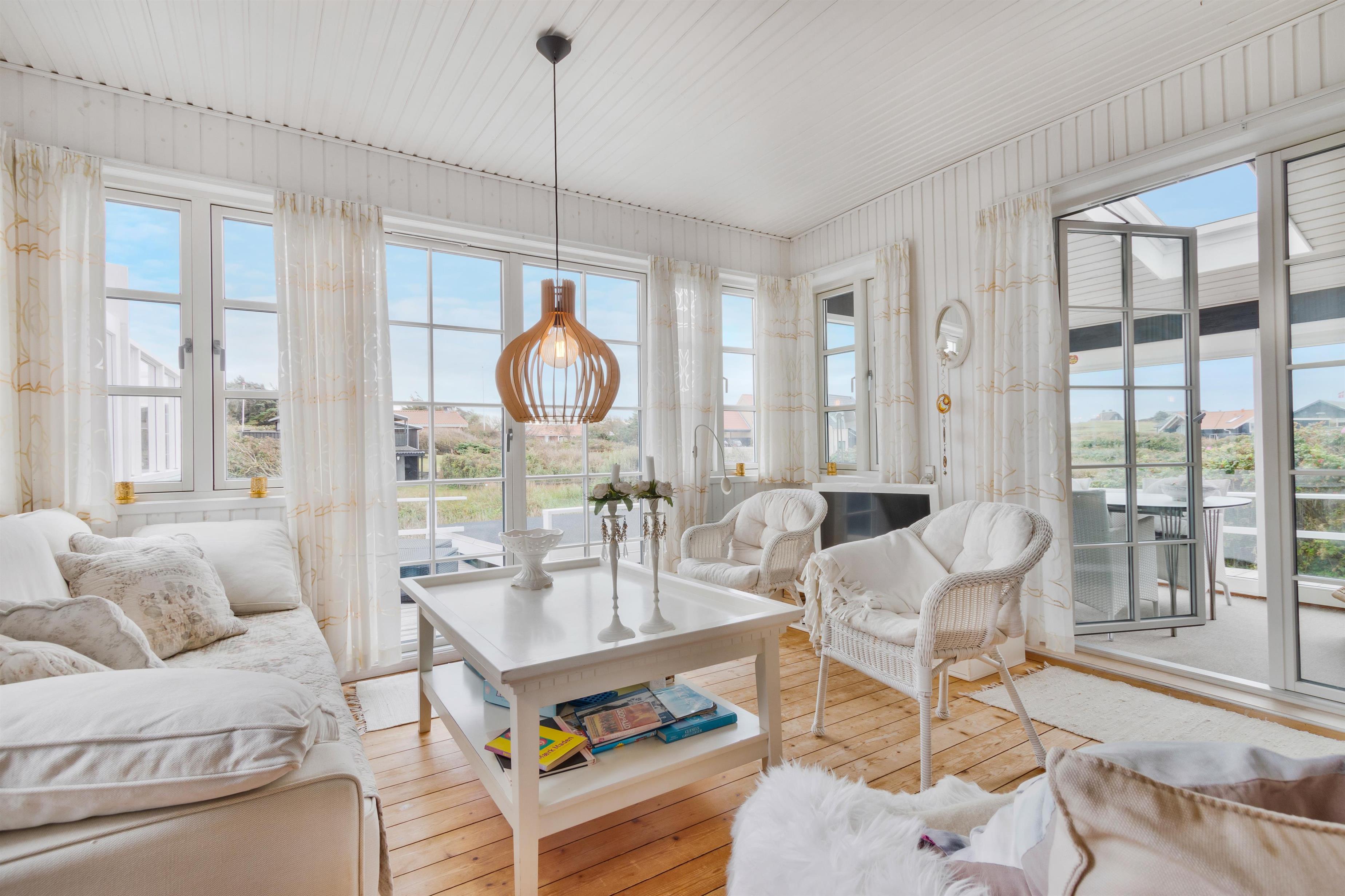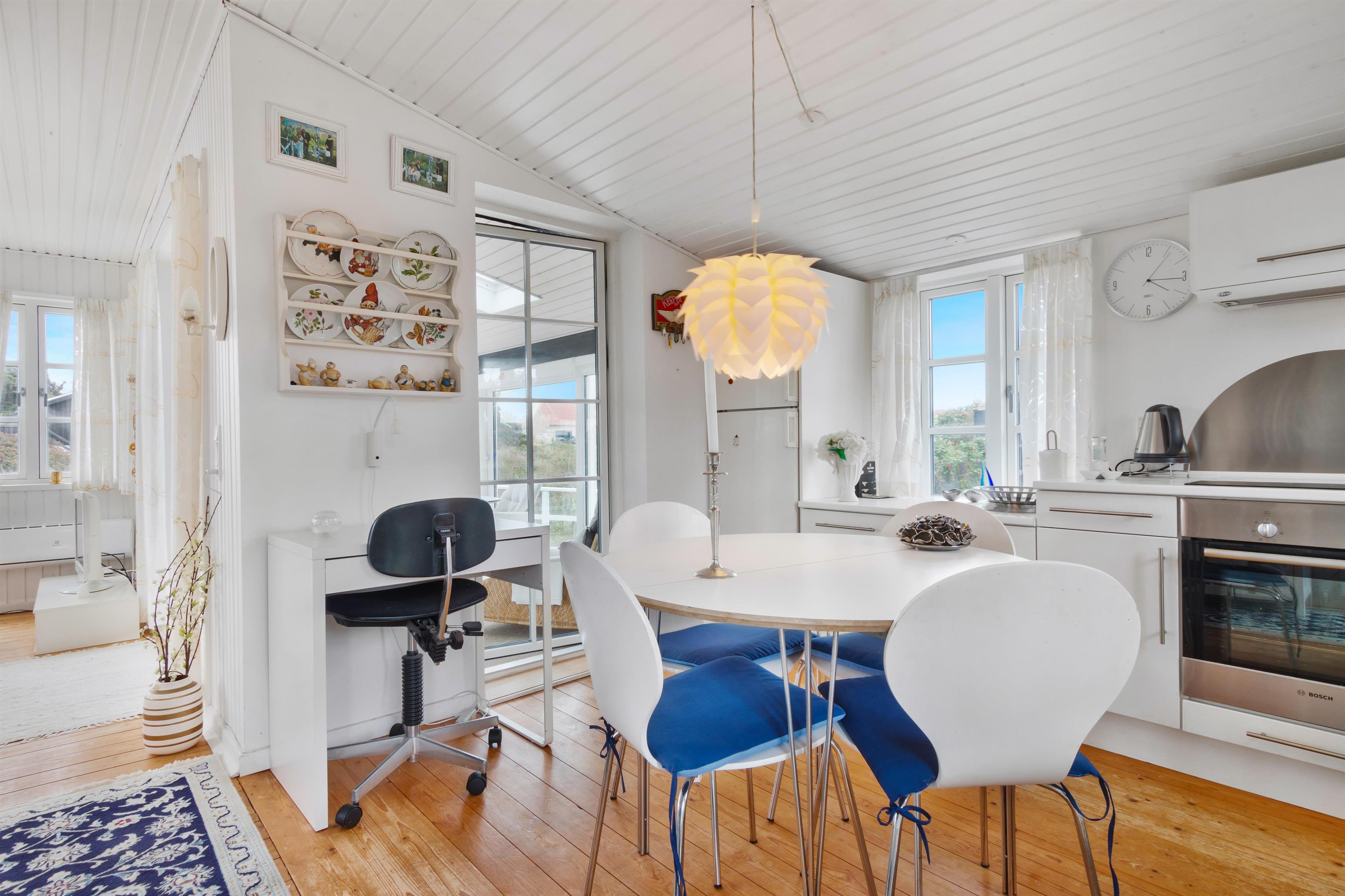 The holiday home is extremely charming and must be experienced. It's located at the end of Drosselvej, overlooking Furreby Creek and into Løkken, as well as over some of the lovely vacation homes in Furreby. There's a terrace around half of the summer house, providing plenty of opportunities for sunbathing and relaxation. Inside the house, there's a delightful distribution of space with an open kitchen/living room/dining area and a lovely conservatory where you can sit in shelter and enjoy the view. There are 2 bedrooms and space for 4 people. The house is decorated in a delightful, light summer house style, and in our view, it offers everything a classic summer vacation requires and more. There's parking space for two cars next to the house.