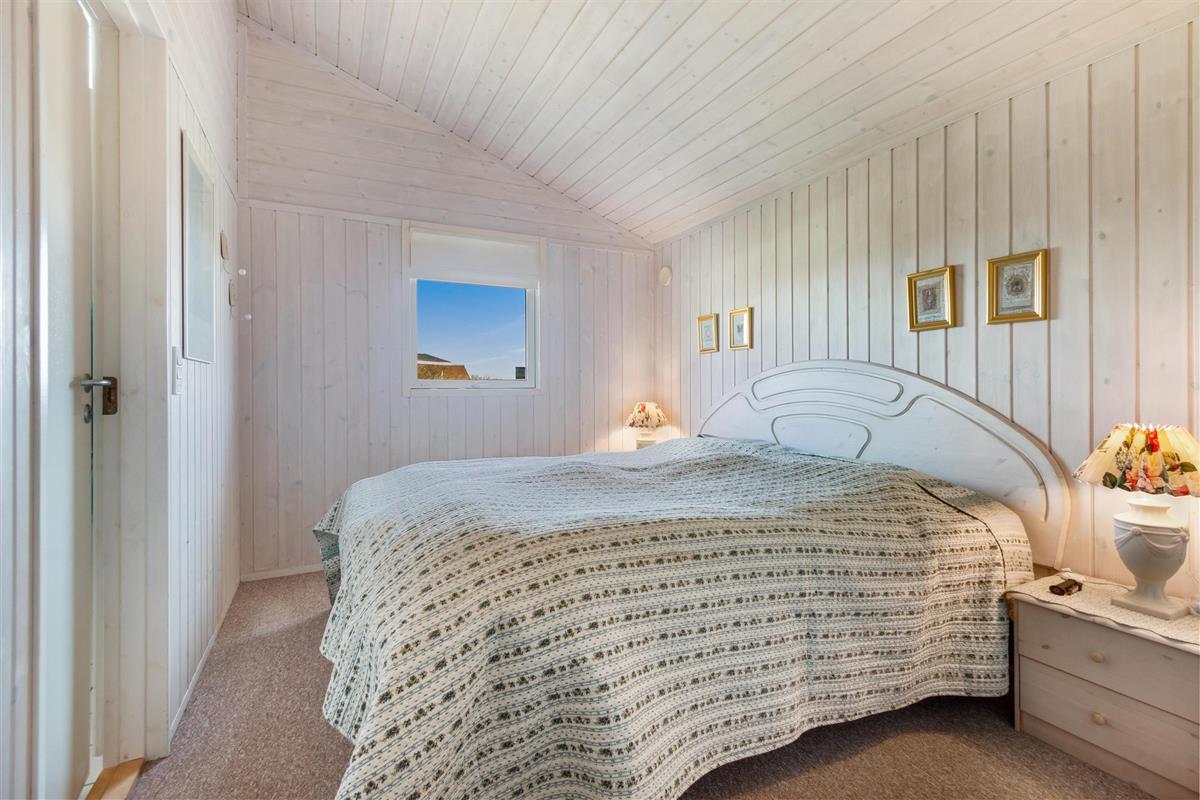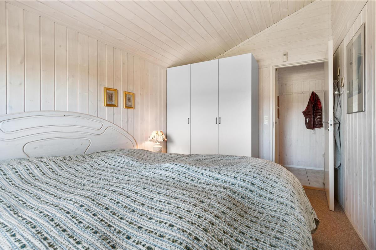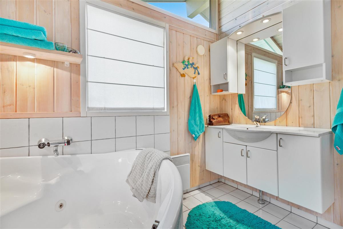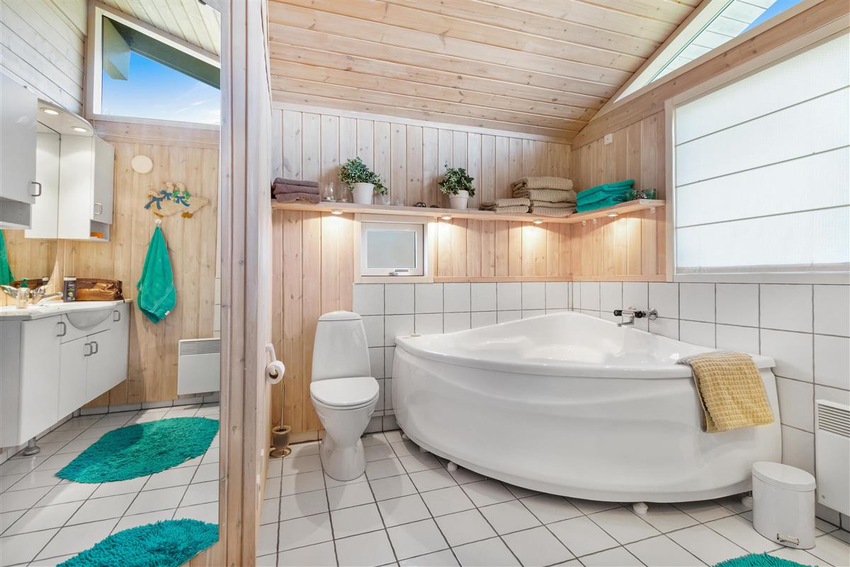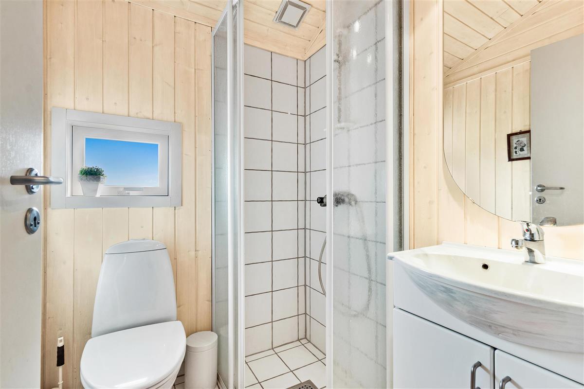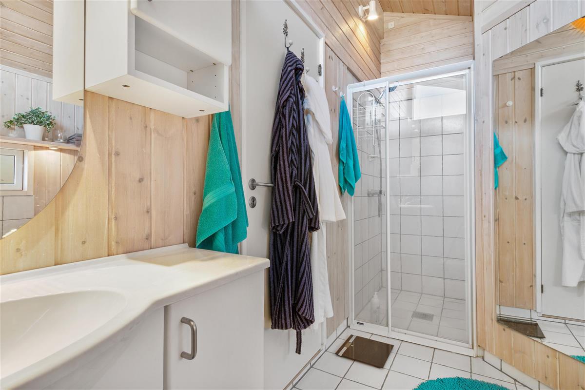 As mentioned, the summer house is 91 square meters and in really nice condition. It exudes a genuine holiday atmosphere like a traditional holiday home. It is practically furnished with a utility room and 5 sleeping places. Just as you enter the house, there is access to a lovely bathroom on the left, which includes a separate shower and a spa. Continuing straight ahead, you will enter the second bathroom. There are three bedrooms and two bathrooms - practically furnished with plenty of space for 7 people. Lovely open kitchen/dining/living room with wood-burning stove and a utility room with washing machine and dryer. Please note: The terrace has been opened since the photos were taken.