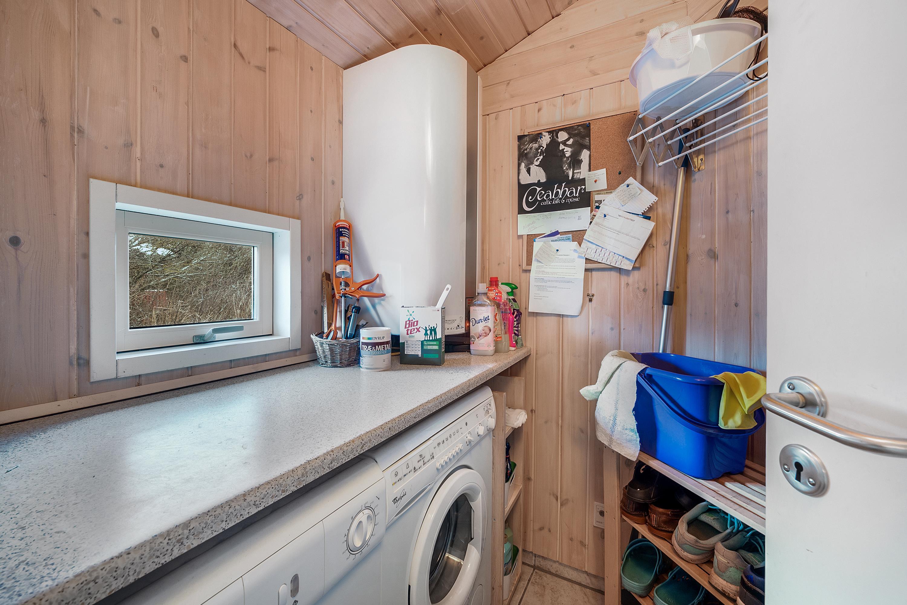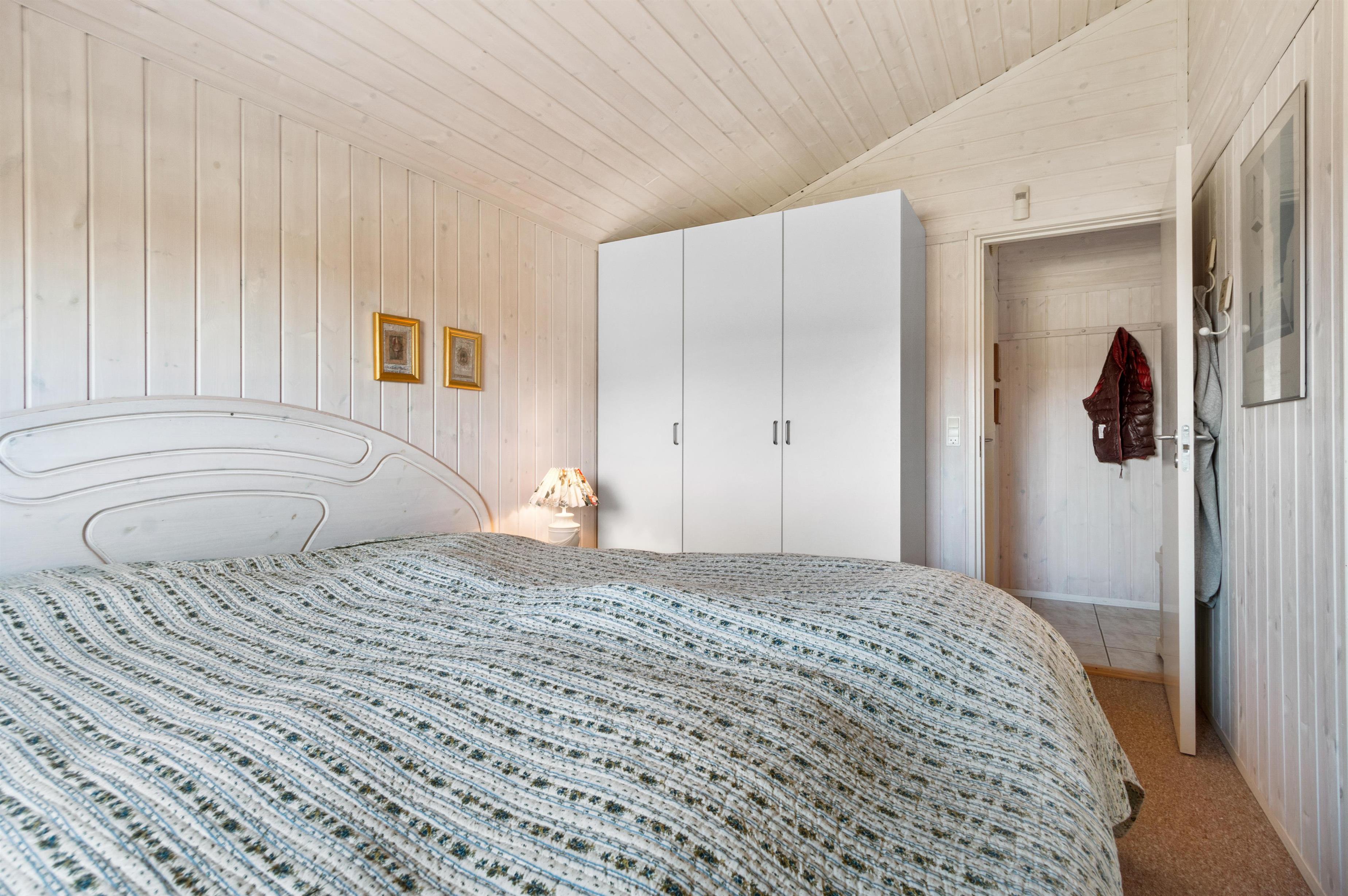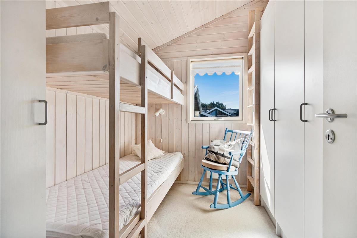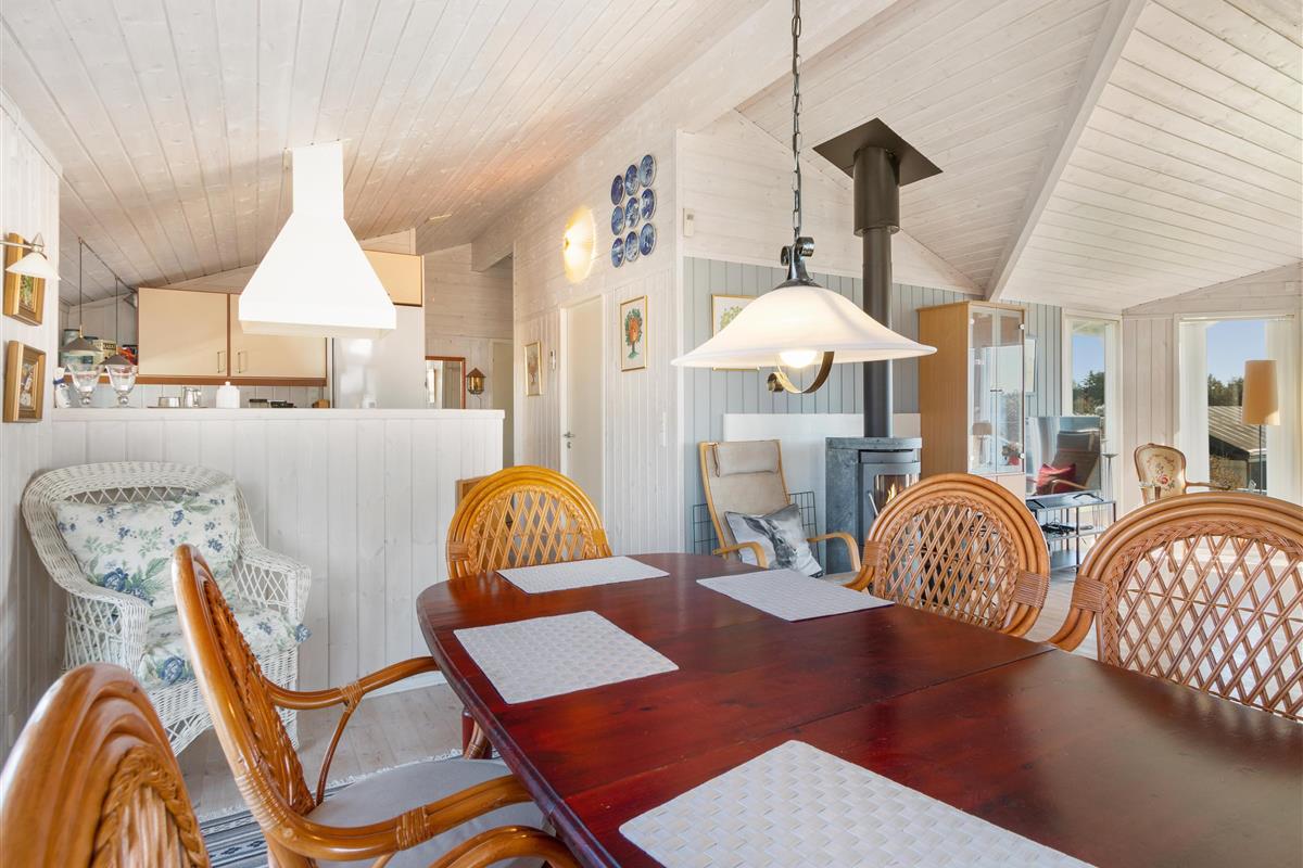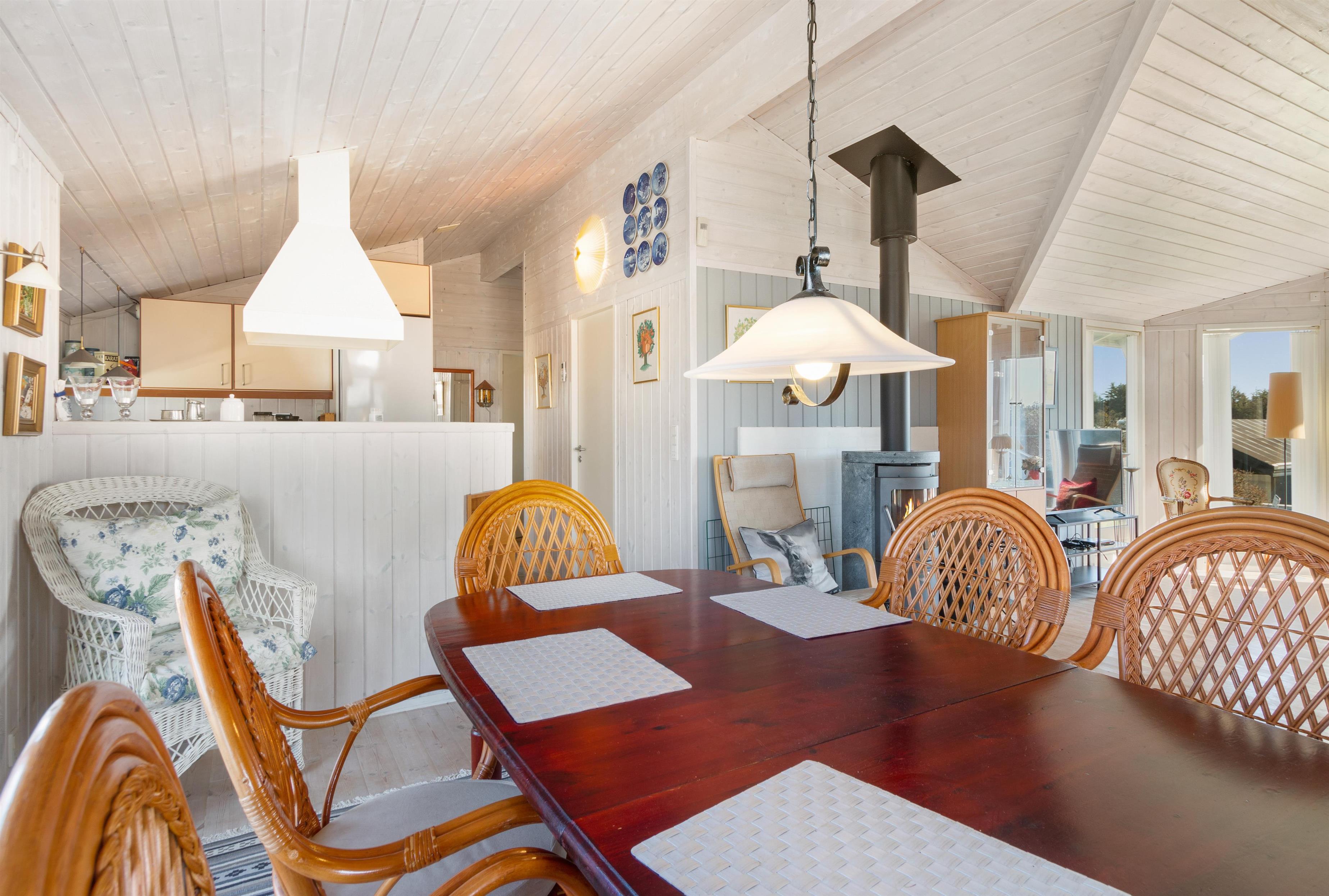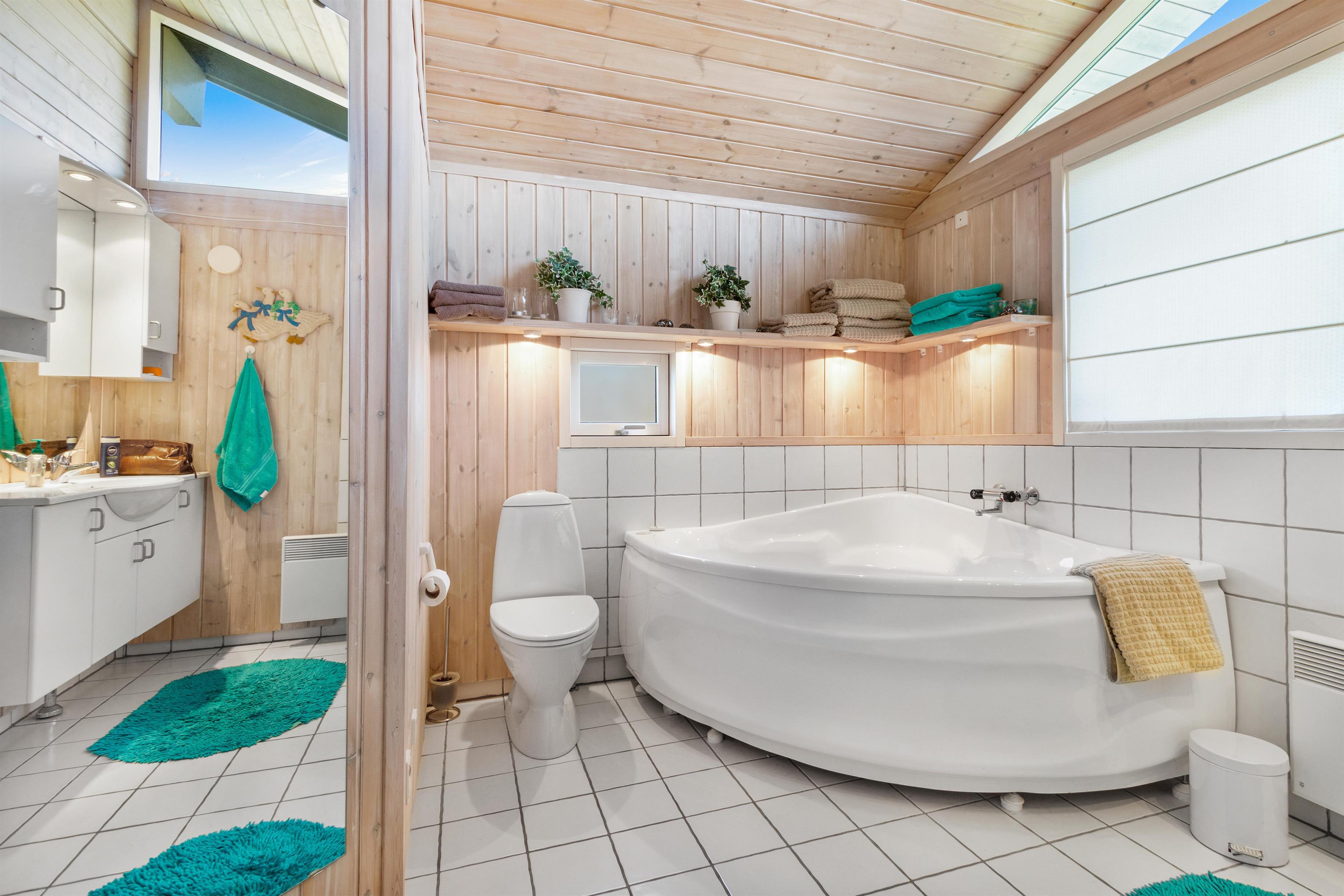 As mentioned, the summer house is 91 square meters and in really nice condition. It exudes a genuine holiday atmosphere like a traditional holiday home. It is practically furnished with a utility room and 5 sleeping places. Just as you enter the house, there is access to a lovely bathroom on the left, which includes a separate shower and a spa. Continuing straight ahead, you will enter the second bathroom. There are three bedrooms and two bathrooms - practically furnished with plenty of space for 7 people. Lovely open kitchen/dining/living room with wood-burning stove and a utility room with washing machine and dryer. Please note: The terrace has been opened since the photos were taken.