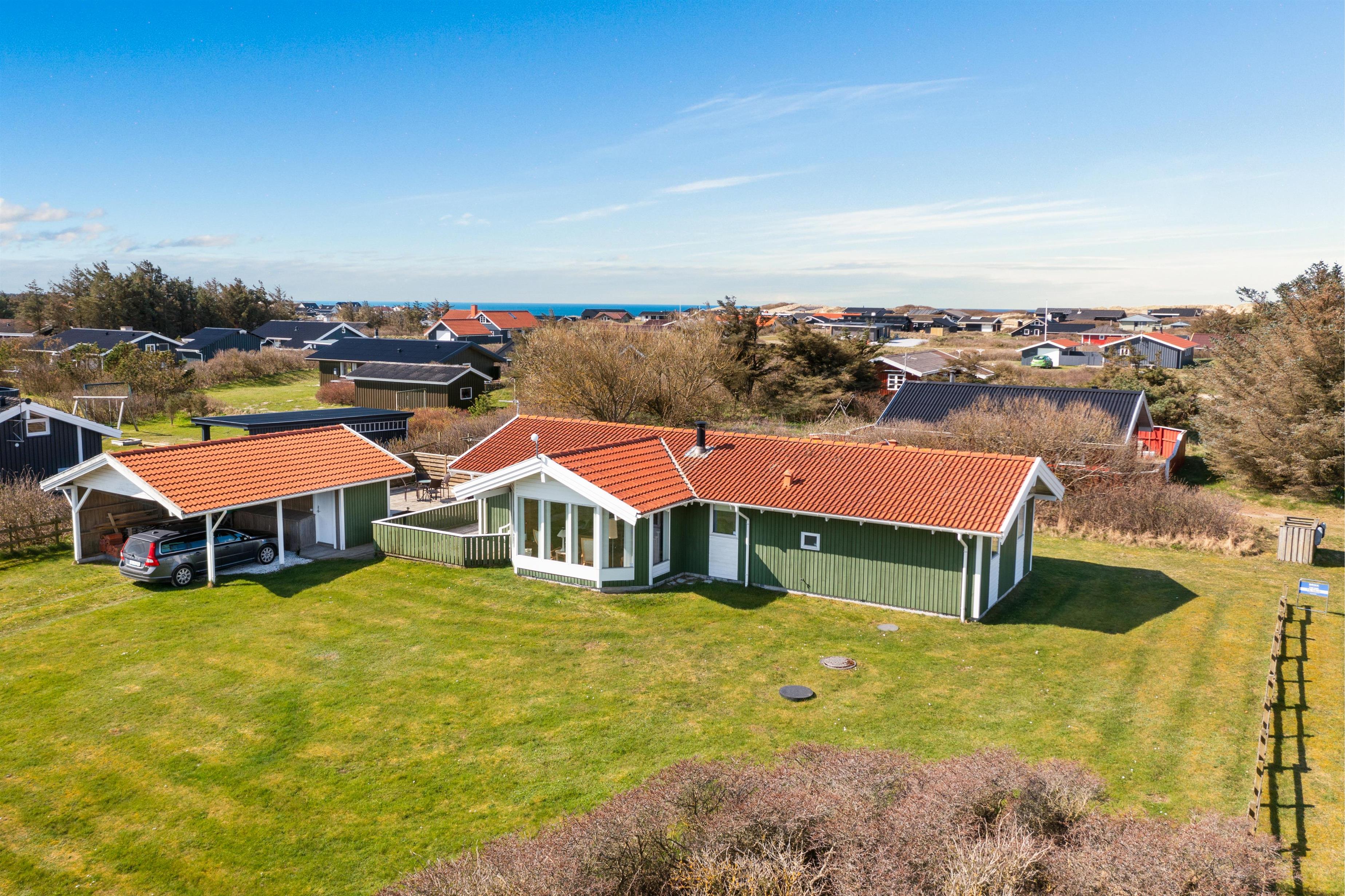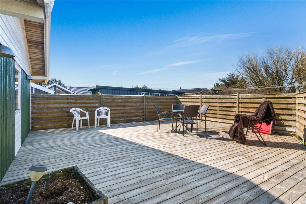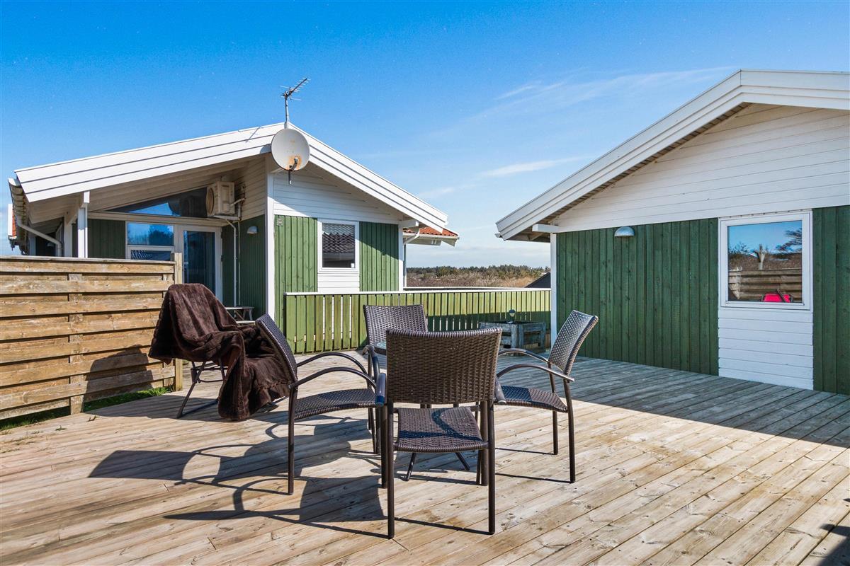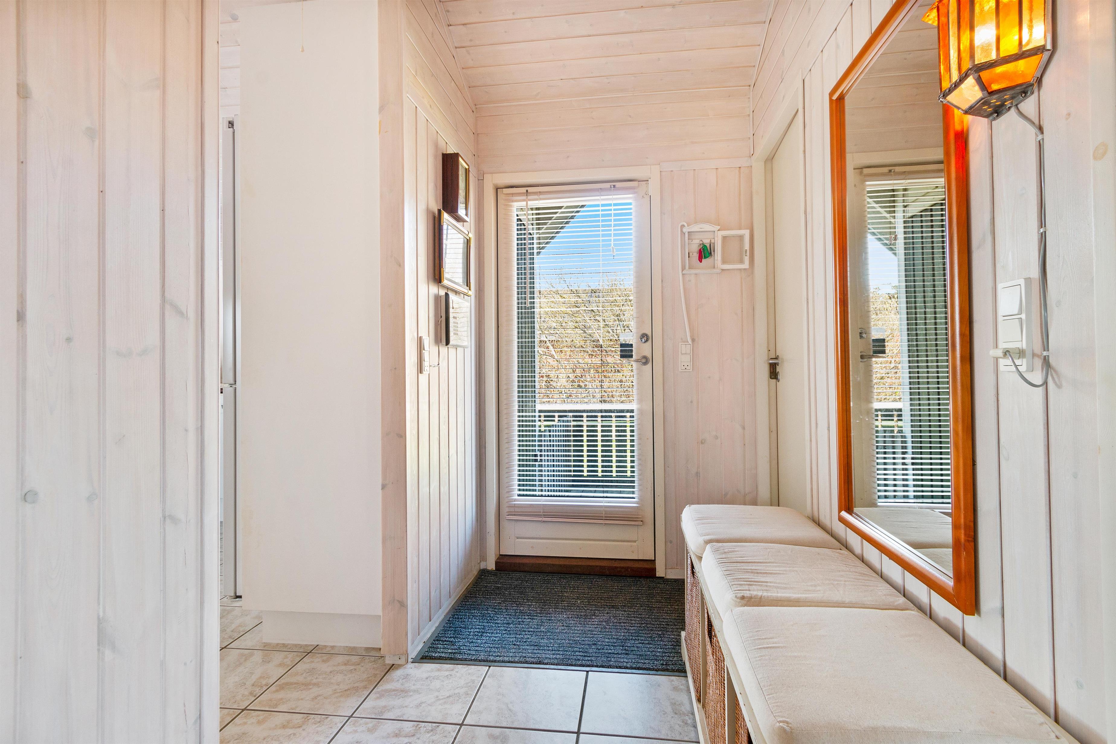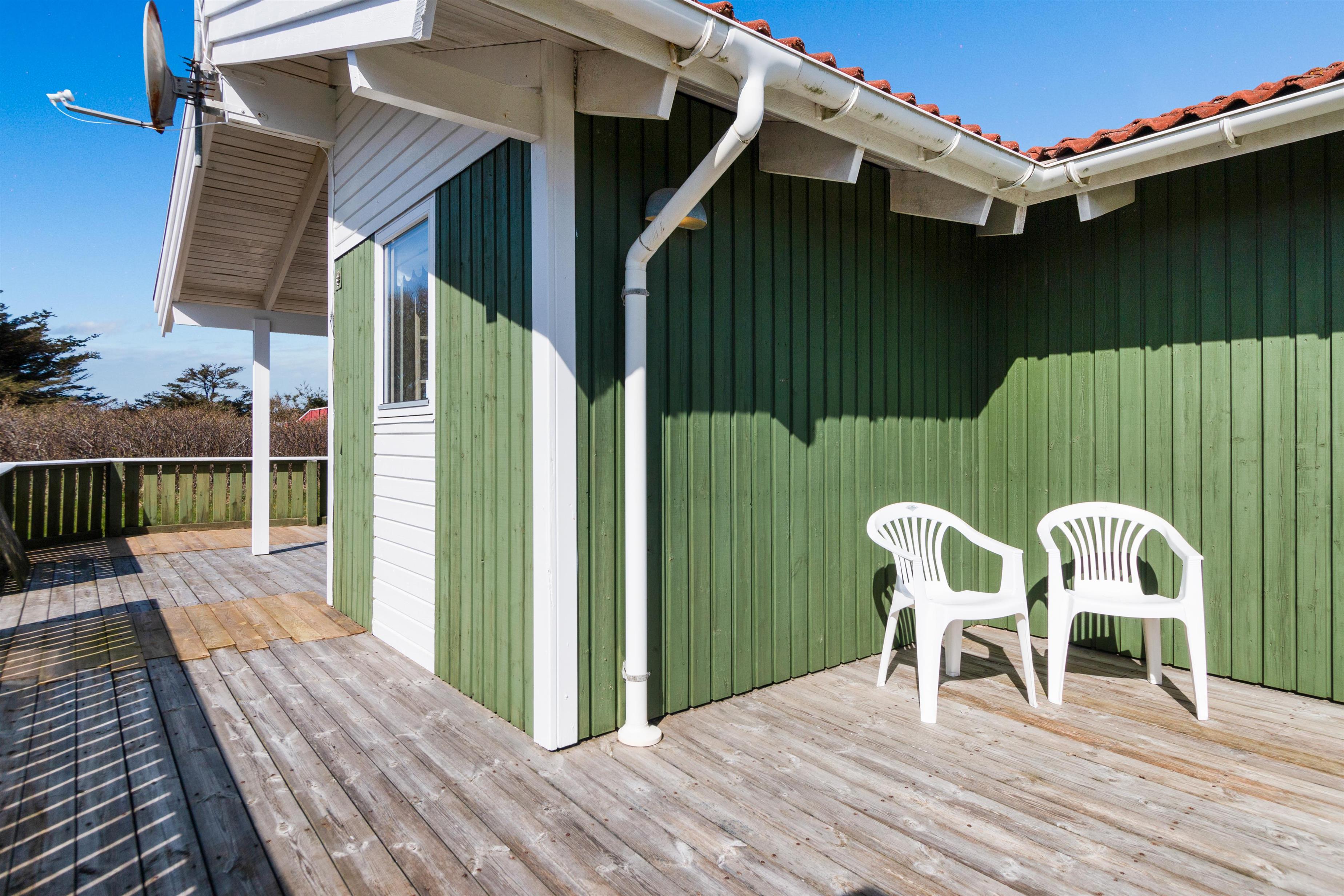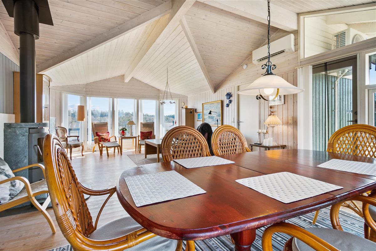 As mentioned, the summer house is 91 square meters and in really nice condition. It exudes a genuine holiday atmosphere like a traditional holiday home. It is practically furnished with a utility room and 5 sleeping places. Just as you enter the house, there is access to a lovely bathroom on the left, which includes a separate shower and a spa. Continuing straight ahead, you will enter the second bathroom. There are three bedrooms and two bathrooms - practically furnished with plenty of space for 7 people. Lovely open kitchen/dining/living room with wood-burning stove and a utility room with washing machine and dryer. Please note: The terrace has been opened since the photos were taken.