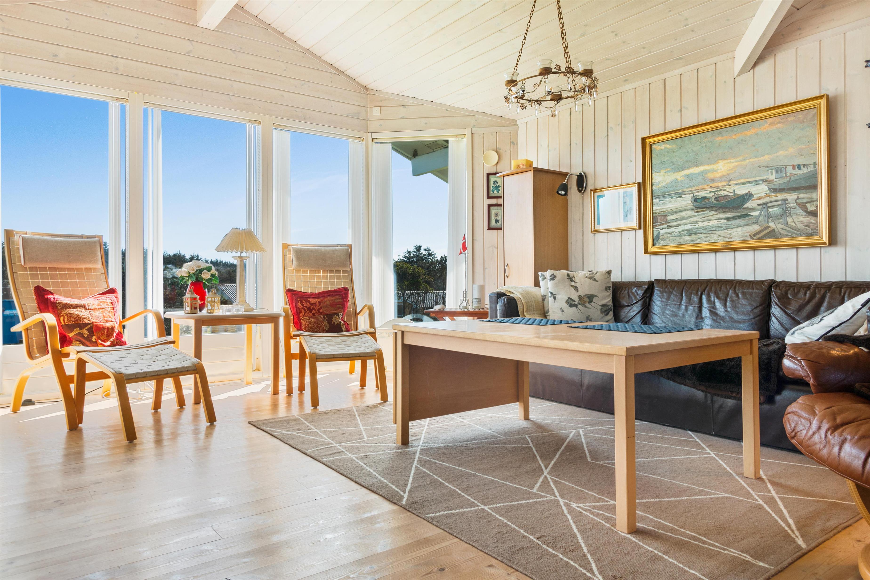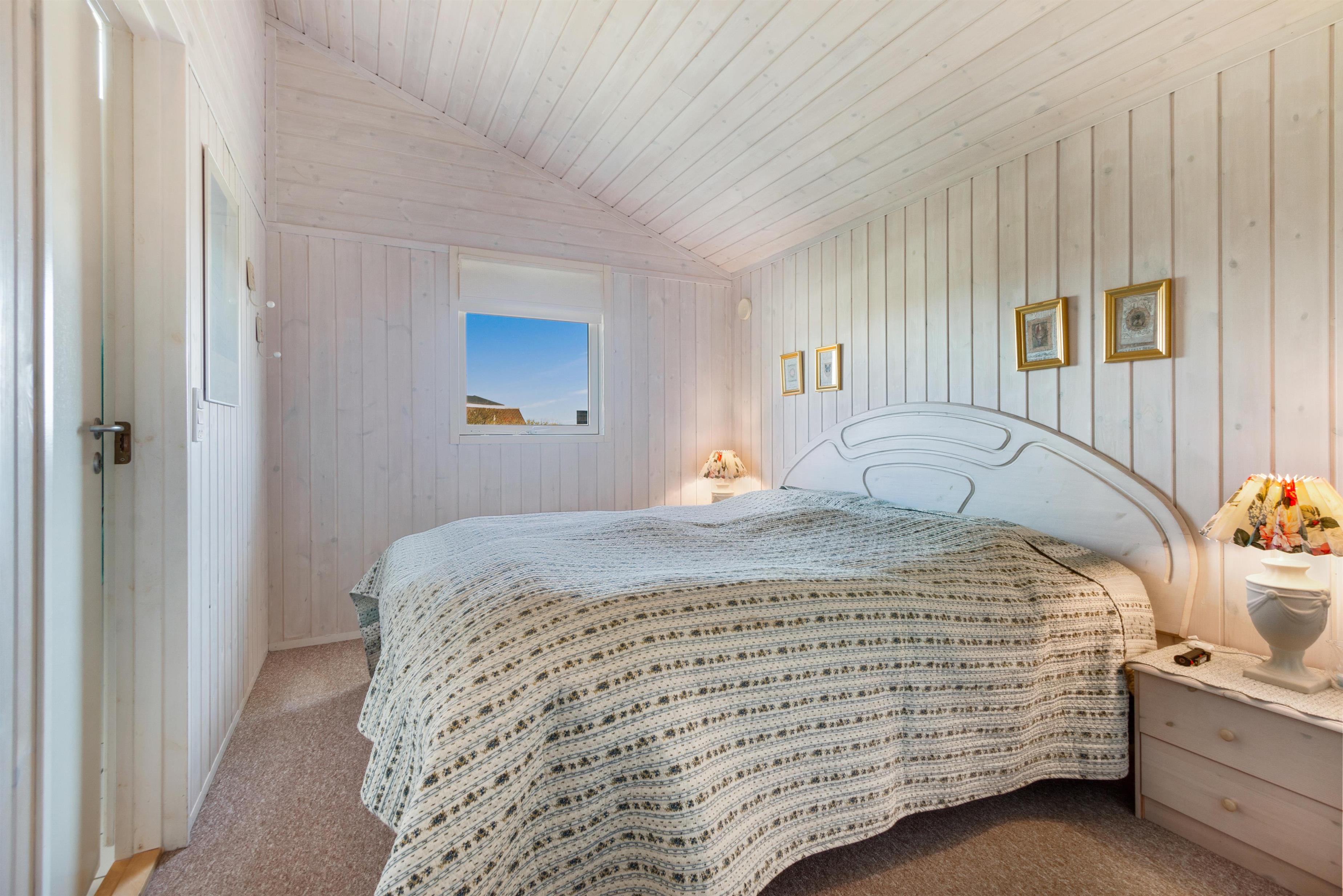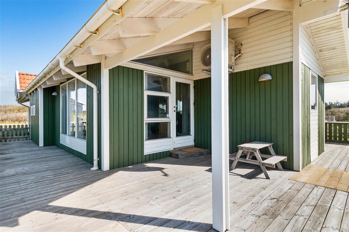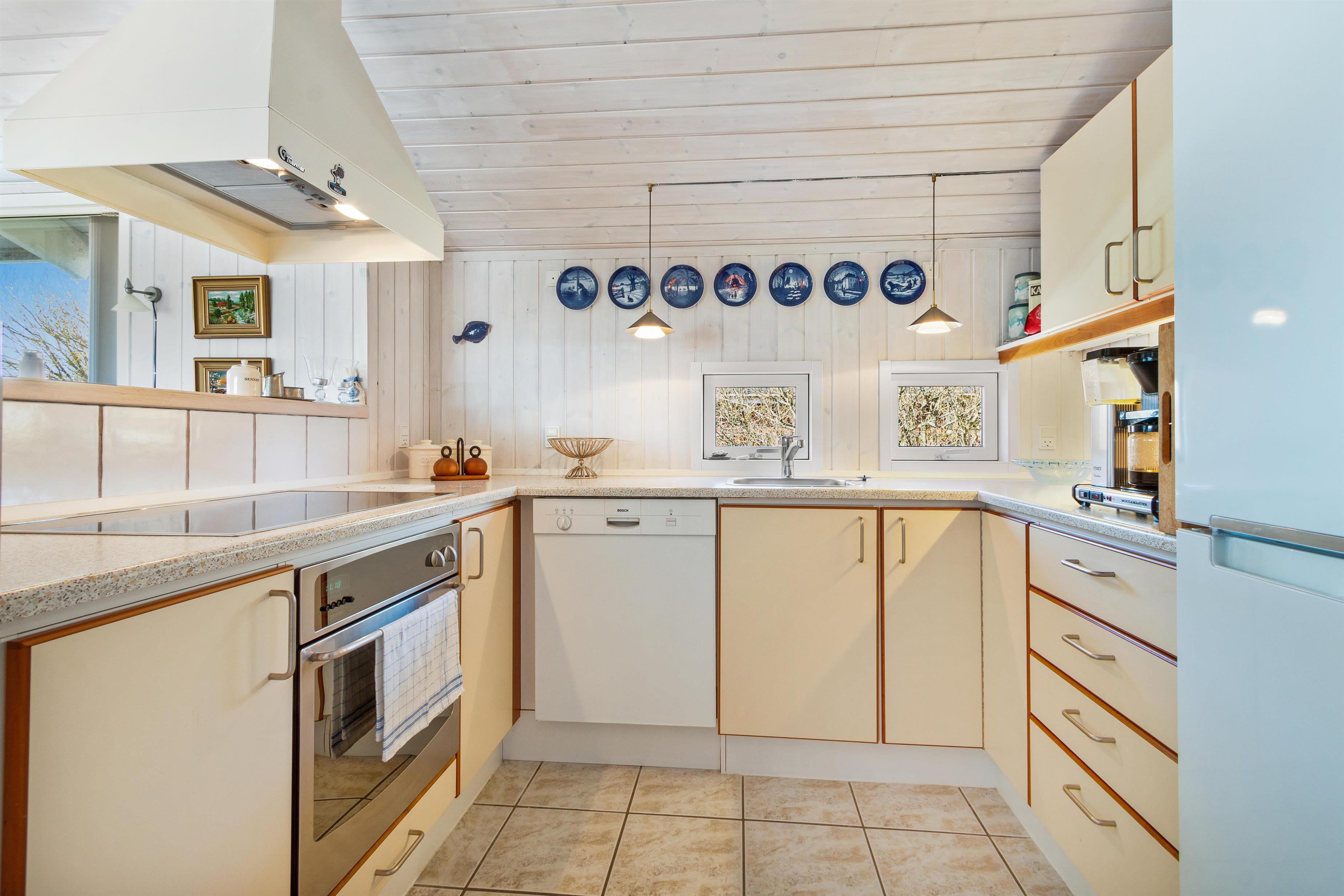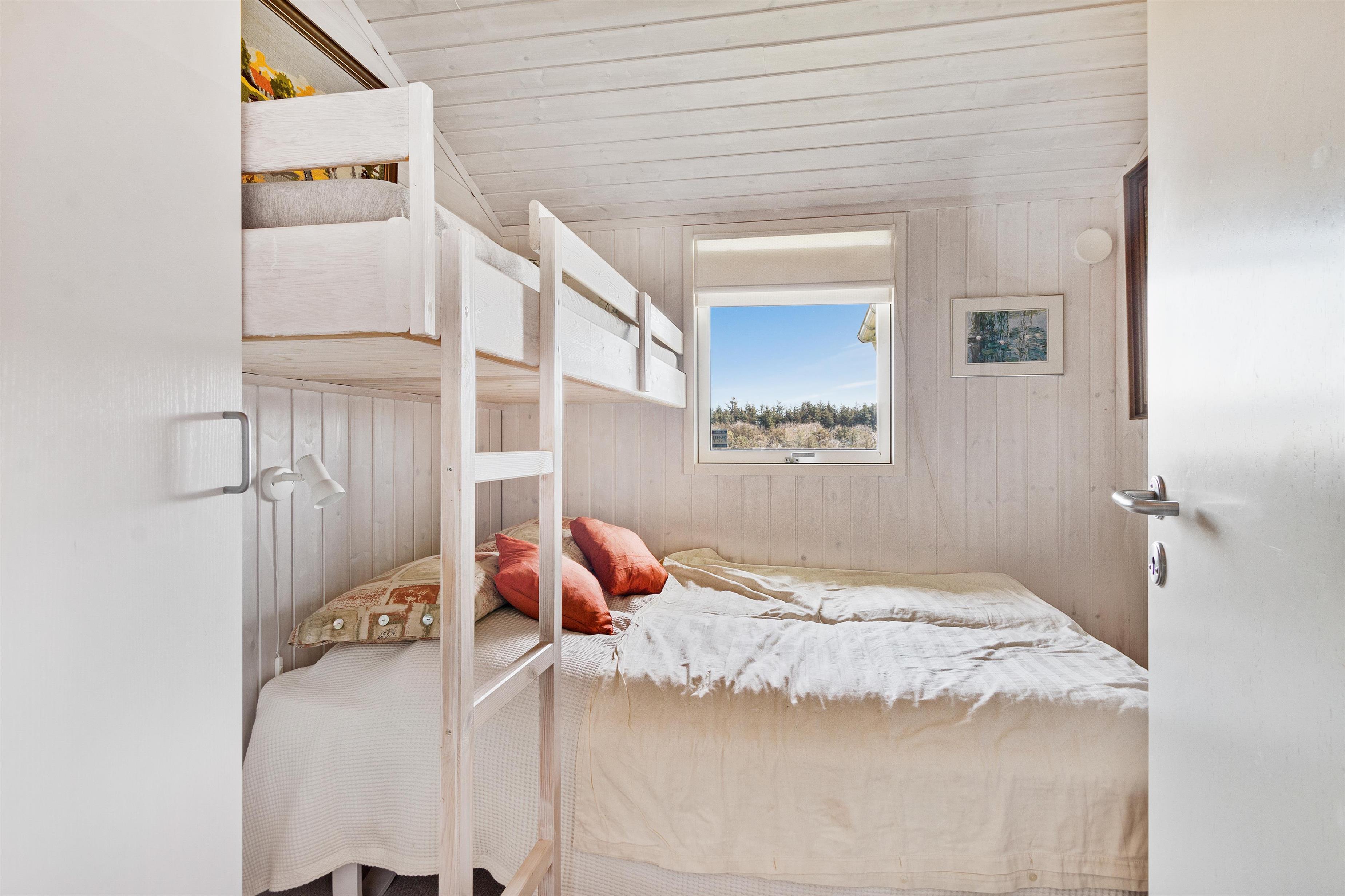 As mentioned, the summer house is 91 square meters and in really nice condition. It exudes a genuine holiday atmosphere like a traditional holiday home. It is practically furnished with a utility room and 5 sleeping places. Just as you enter the house, there is access to a lovely bathroom on the left, which includes a separate shower and a spa. Continuing straight ahead, you will enter the second bathroom. There are three bedrooms and two bathrooms - practically furnished with plenty of space for 7 people. Lovely open kitchen/dining/living room with wood-burning stove and a utility room with washing machine and dryer. Please note: The terrace has been opened since the photos were taken.