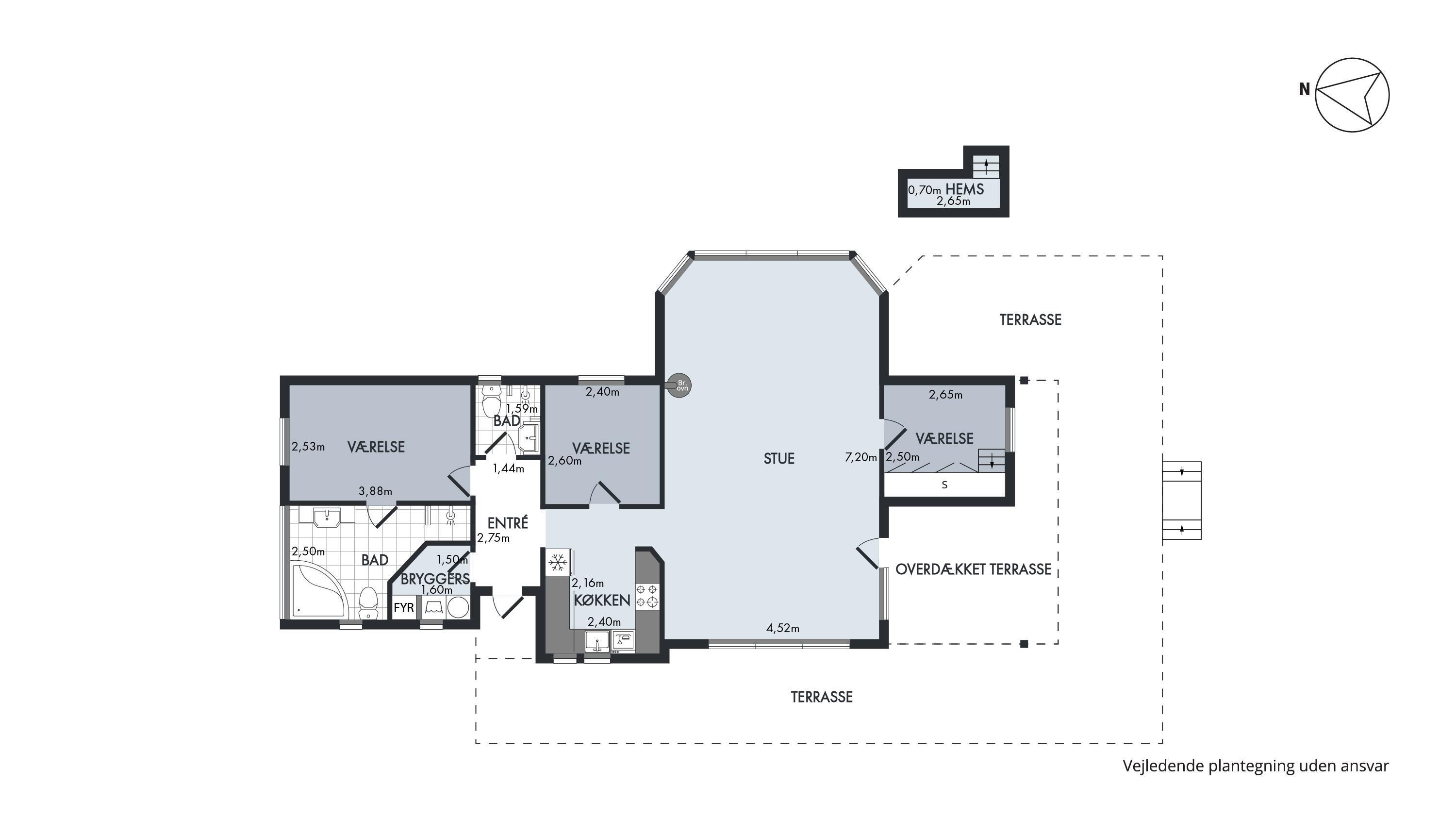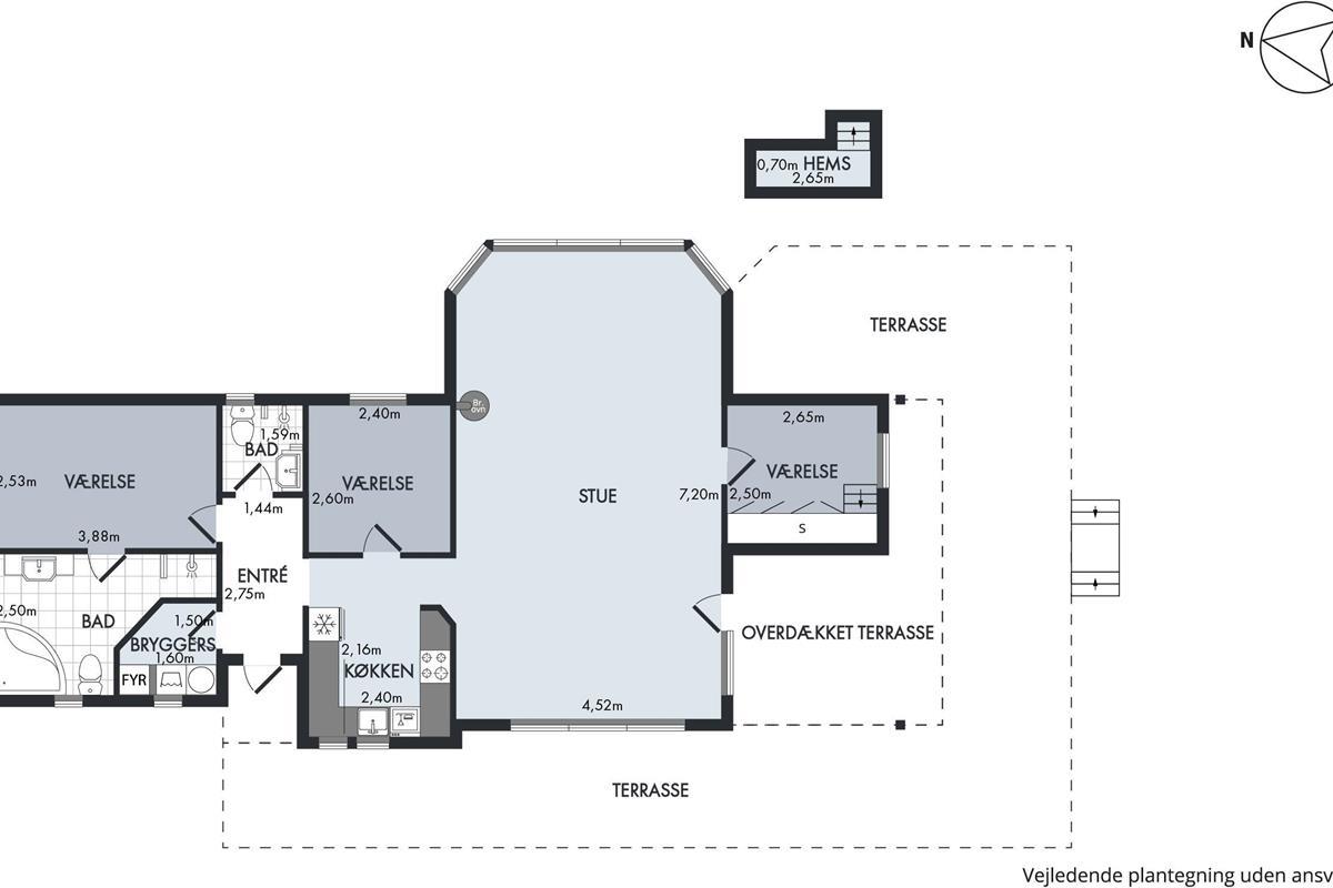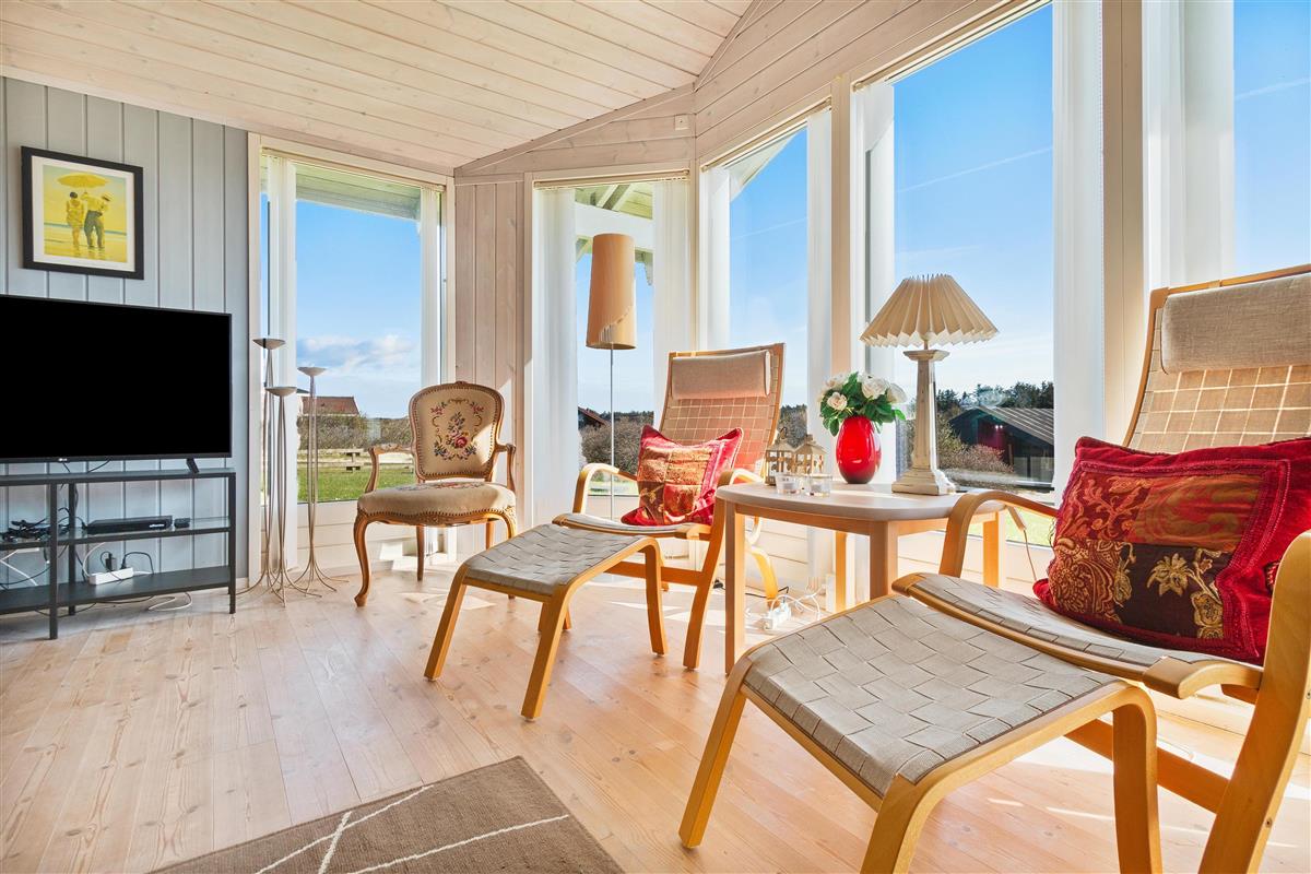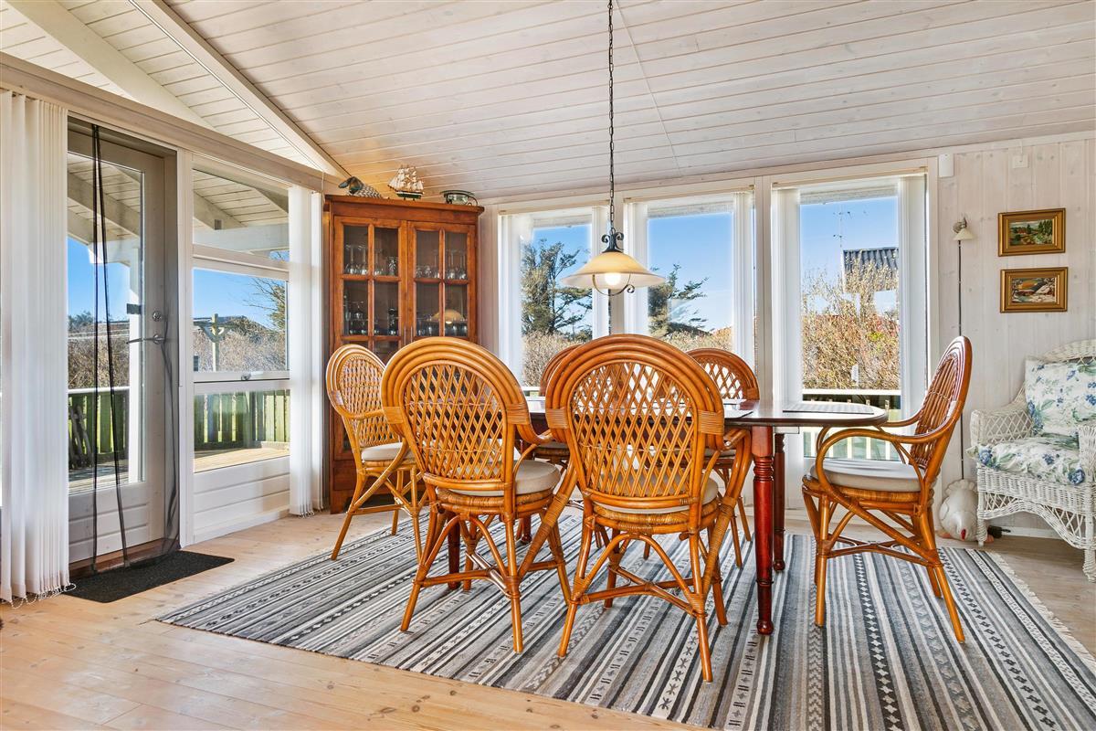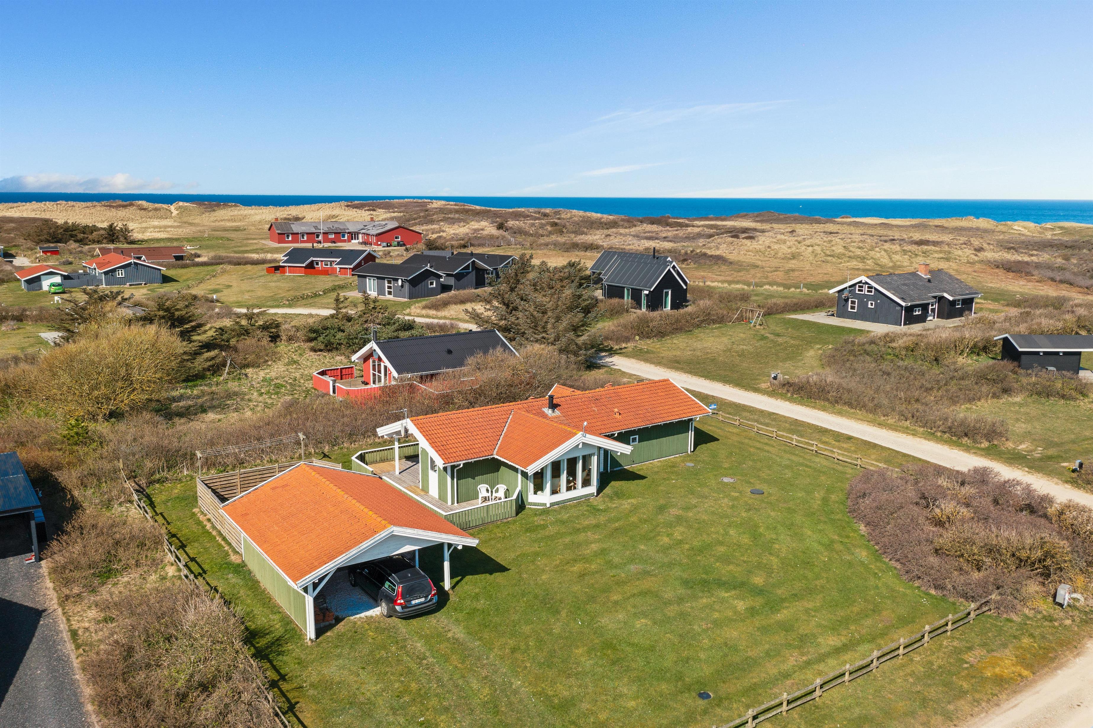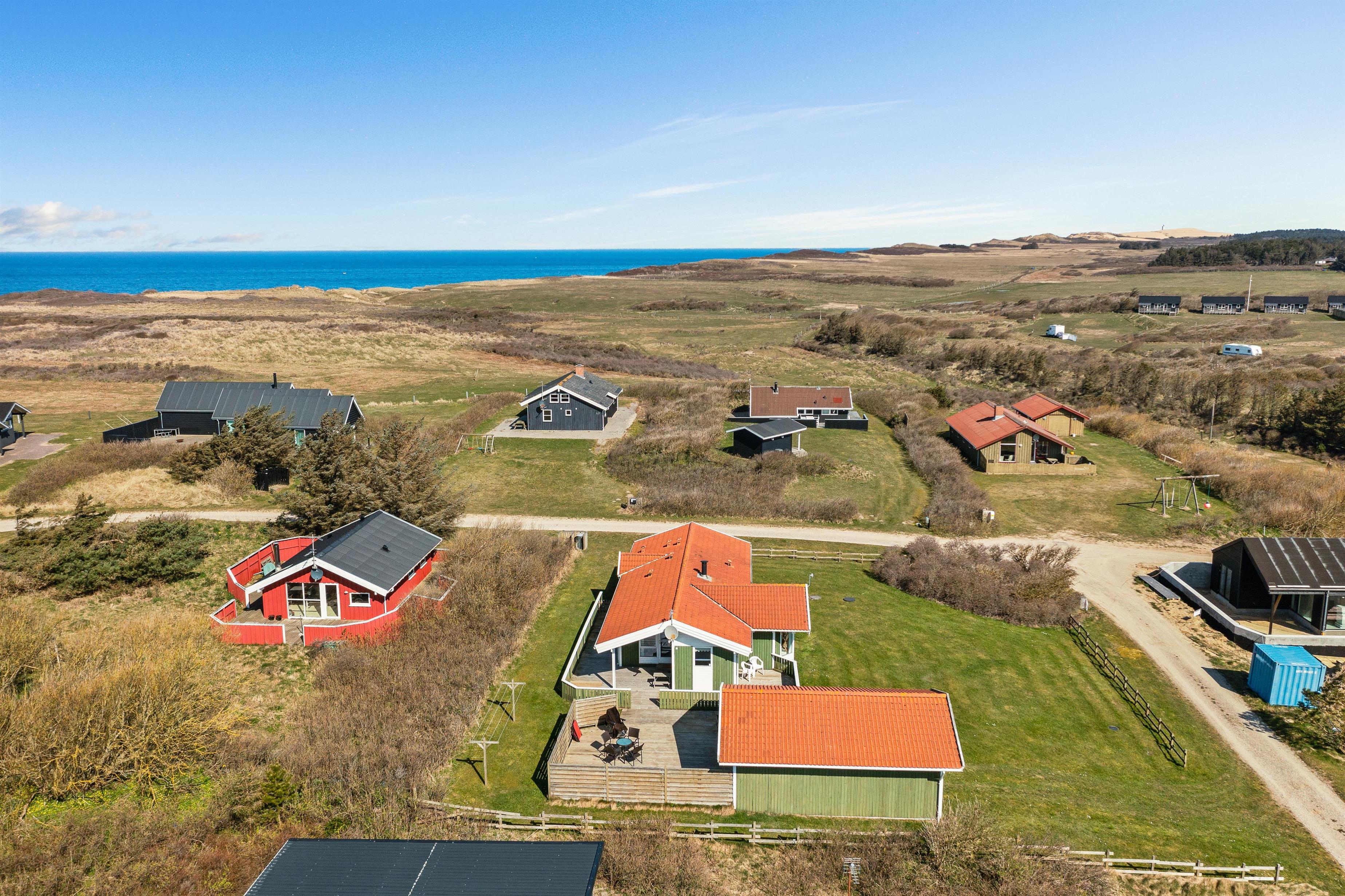 As mentioned, the summer house is 91 square meters and in really nice condition. It exudes a genuine holiday atmosphere like a traditional holiday home. It is practically furnished with a utility room and 5 sleeping places. Just as you enter the house, there is access to a lovely bathroom on the left, which includes a separate shower and a spa. Continuing straight ahead, you will enter the second bathroom. There are three bedrooms and two bathrooms - practically furnished with plenty of space for 7 people. Lovely open kitchen/dining/living room with wood-burning stove and a utility room with washing machine and dryer. Please note: The terrace has been opened since the photos were taken.