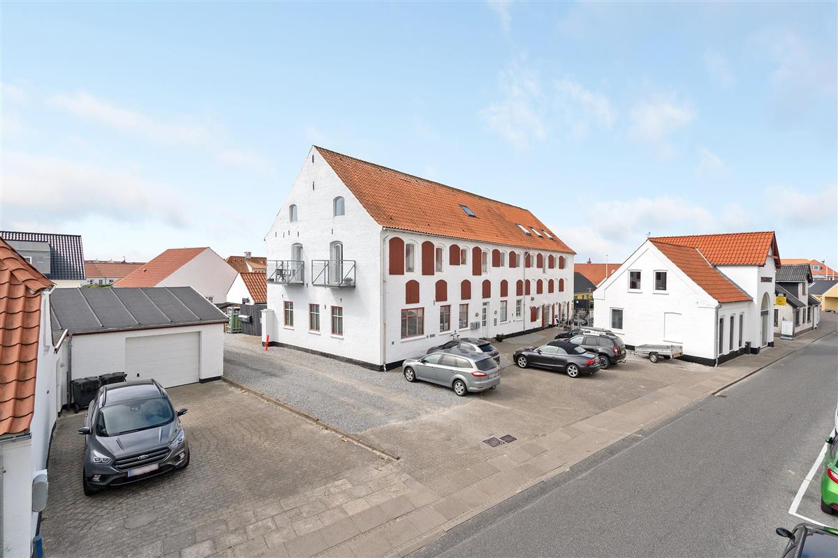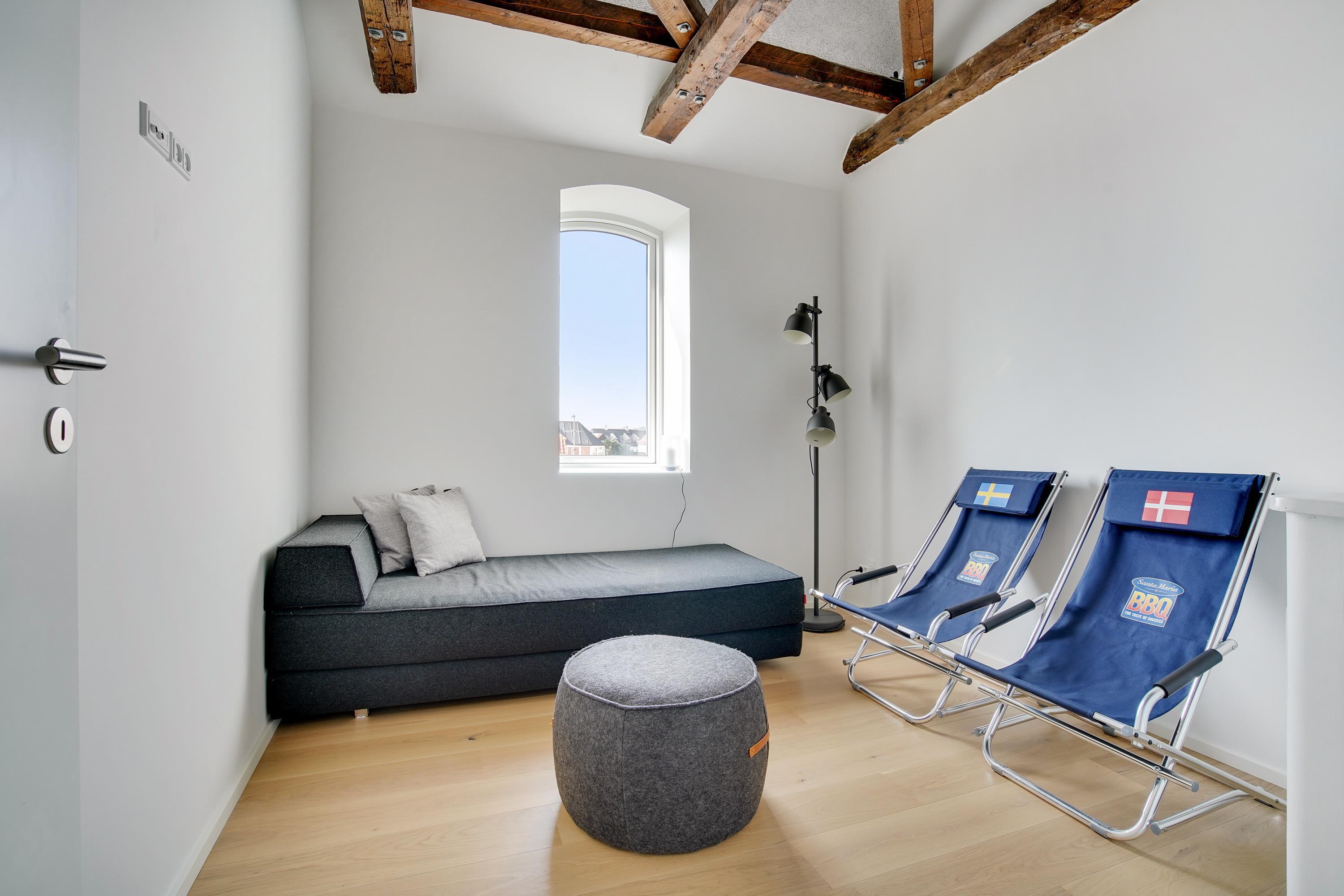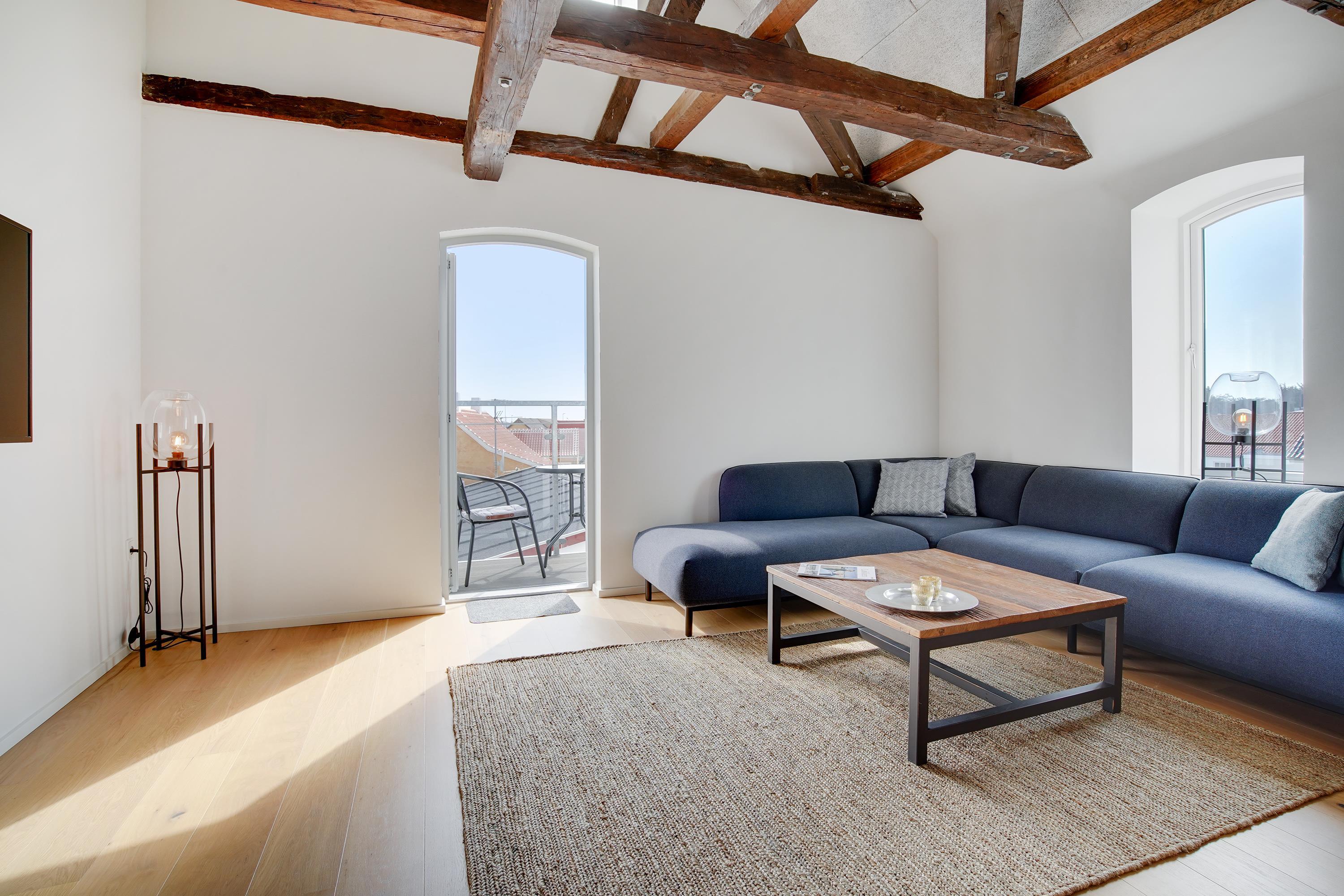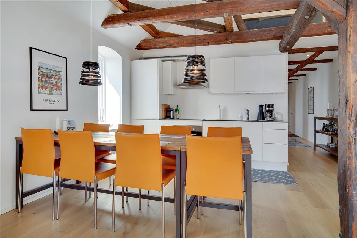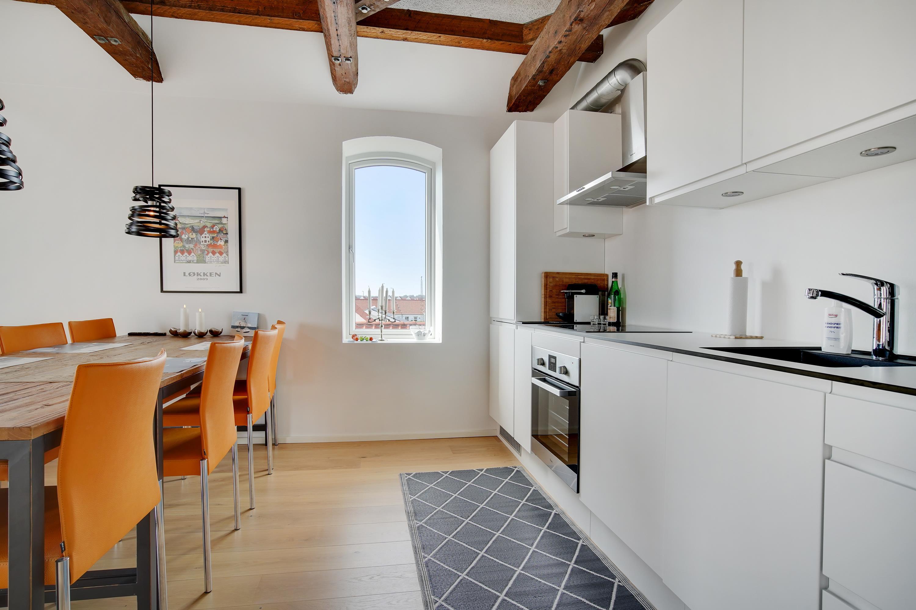 The holiday apartment is located in the middle of Løkken center, but it is nice and quiet! The noise level in the apartment does not reveal that the vibrant city life is right outside the front door. Imagine that this once was a discotec - with parties, noise and trouble as well as dim lighting. Now the building houses bright and airy holiday apartments, where you do not sense the neighbor on the other side of the wall. The light shines from the curved windows, where you can sense the old warehouse.