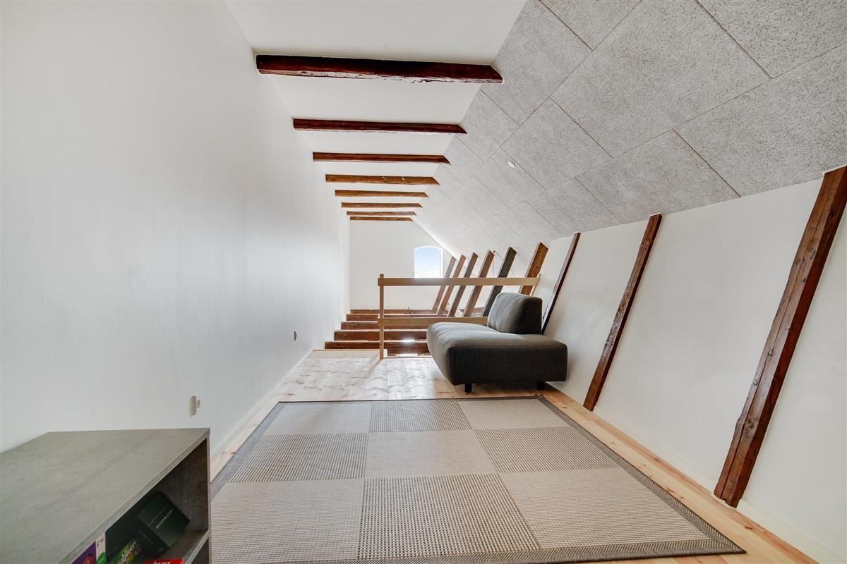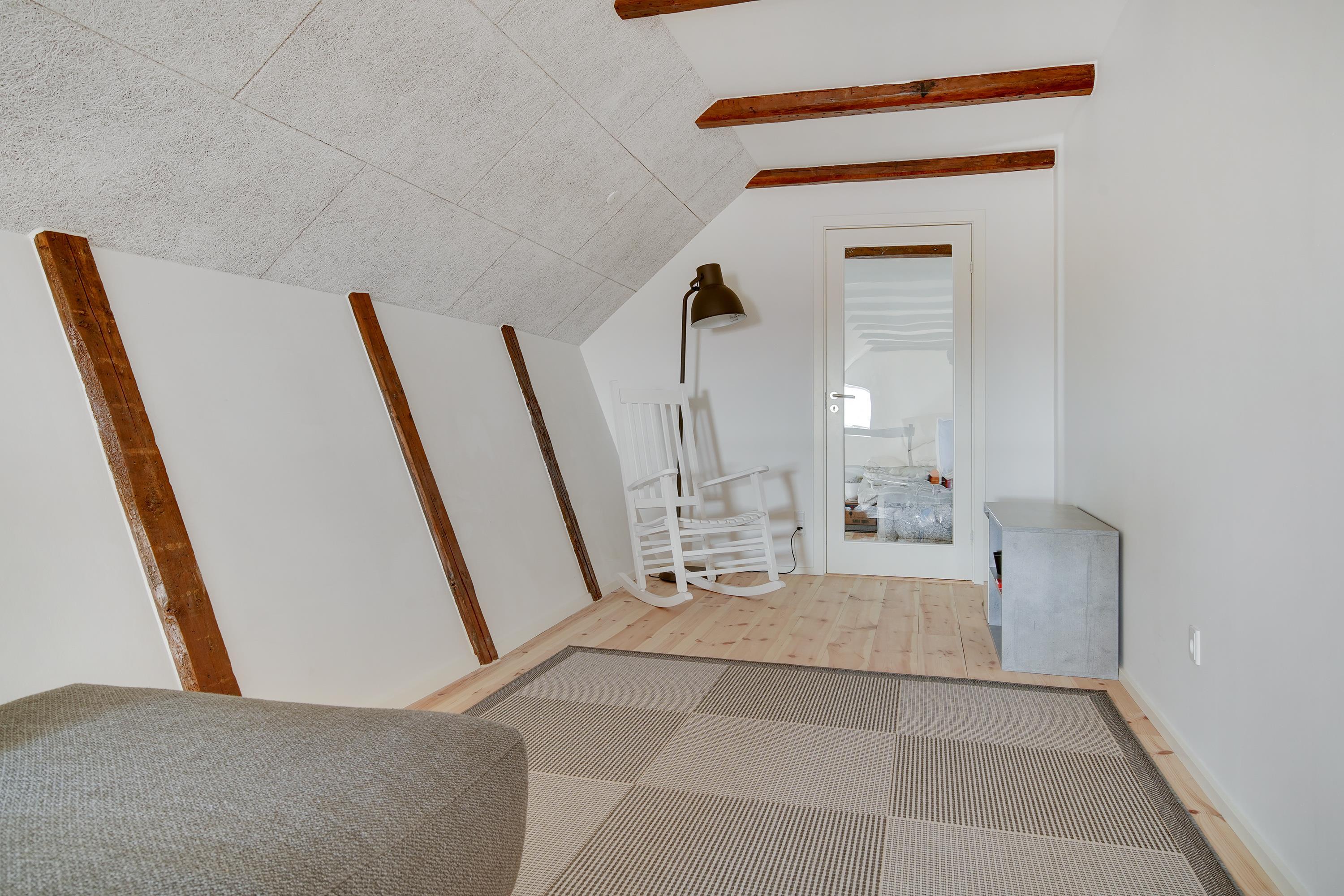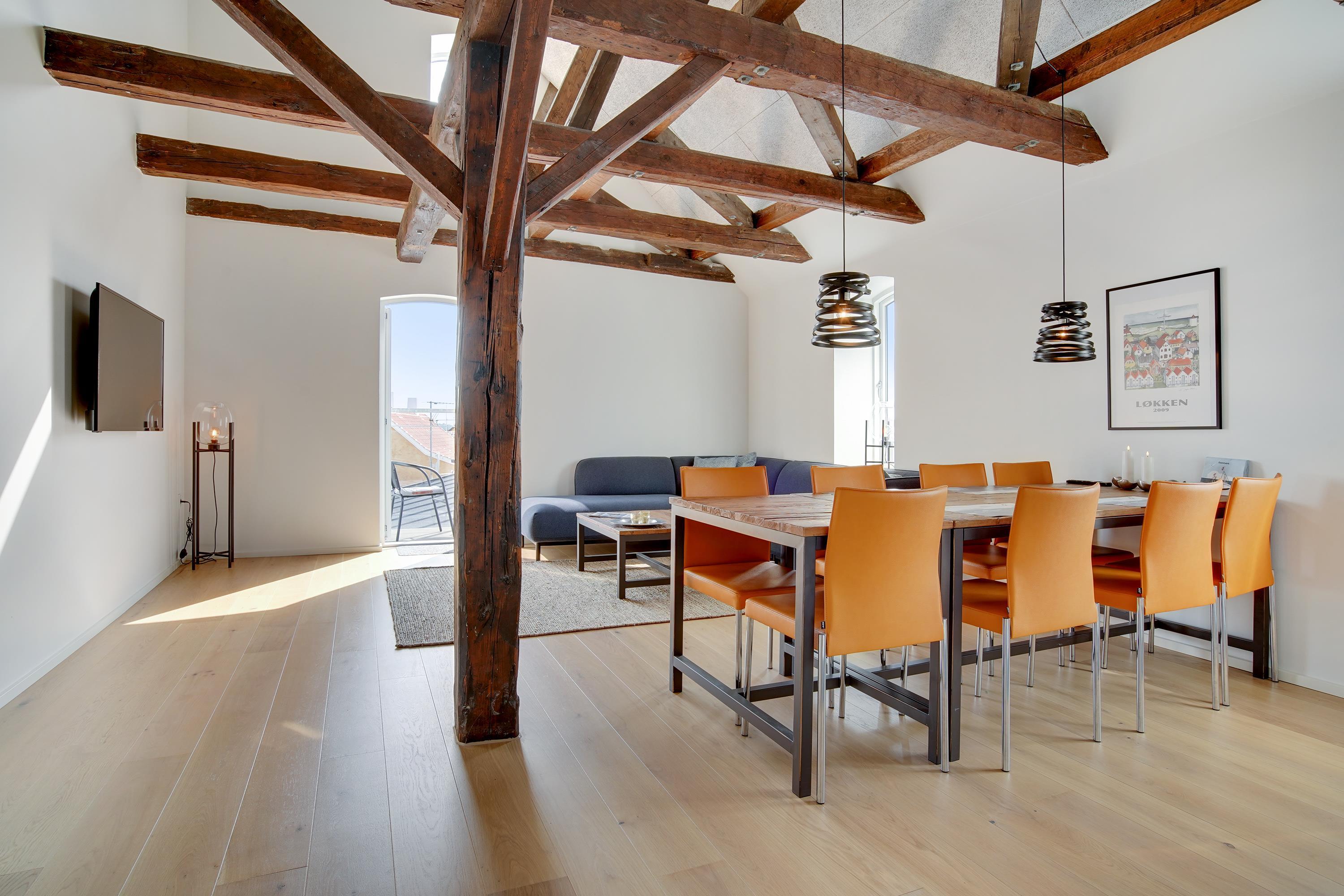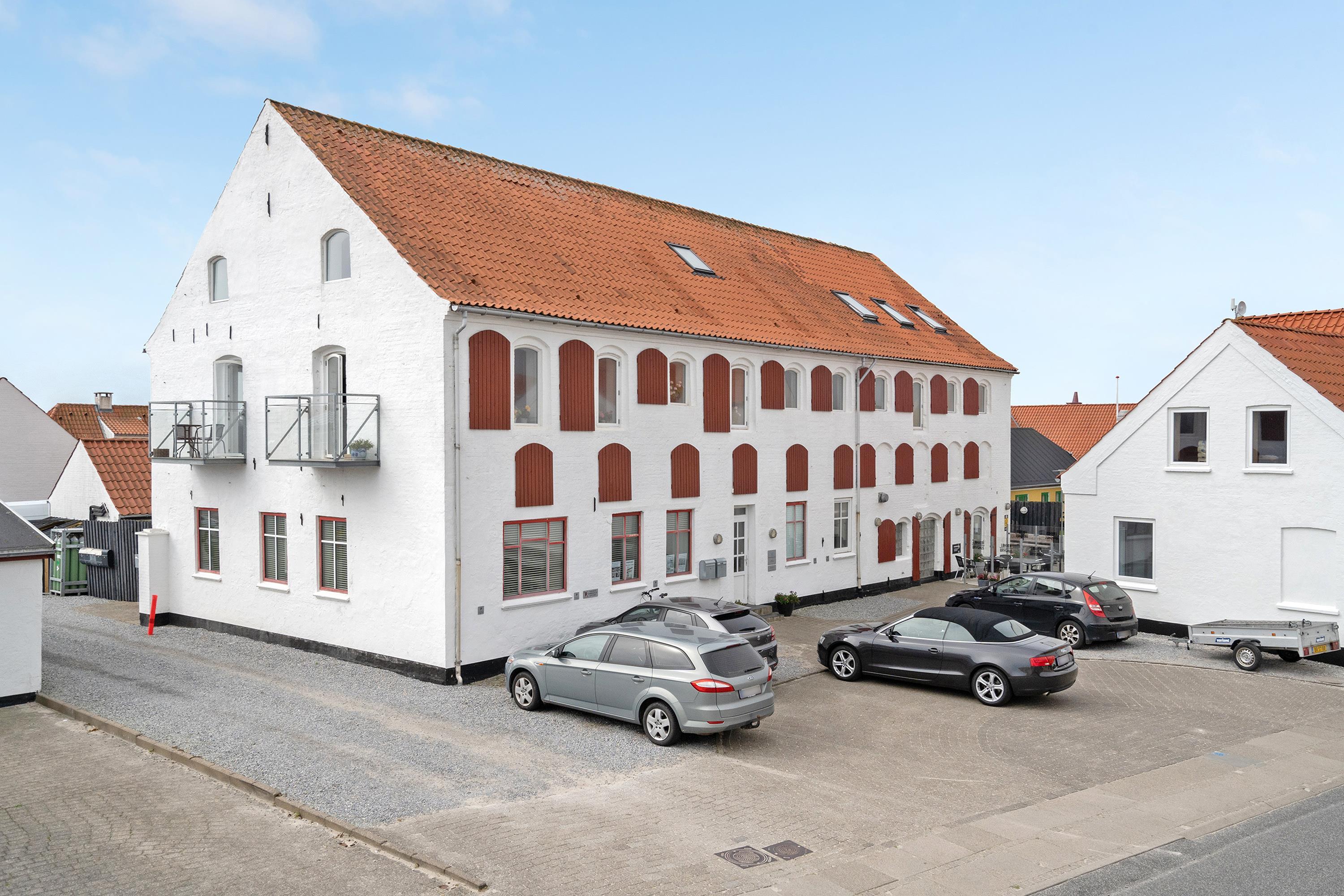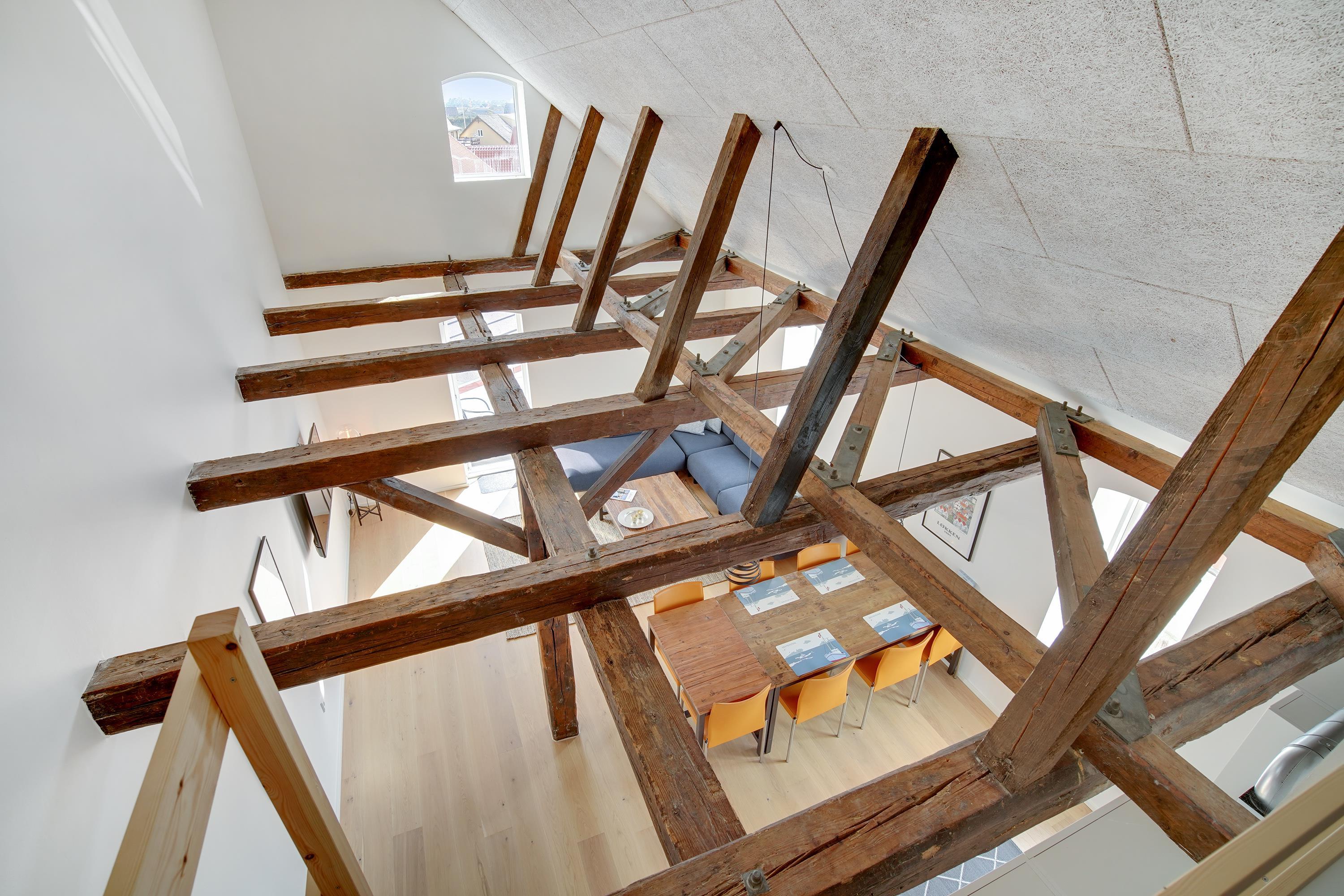 The holiday apartment is located in the middle of Løkken center, but it is nice and quiet! The noise level in the apartment does not reveal that the vibrant city life is right outside the front door. Imagine that this once was a discotec - with parties, noise and trouble as well as dim lighting. Now the building houses bright and airy holiday apartments, where you do not sense the neighbor on the other side of the wall. The light shines from the curved windows, where you can sense the old warehouse.