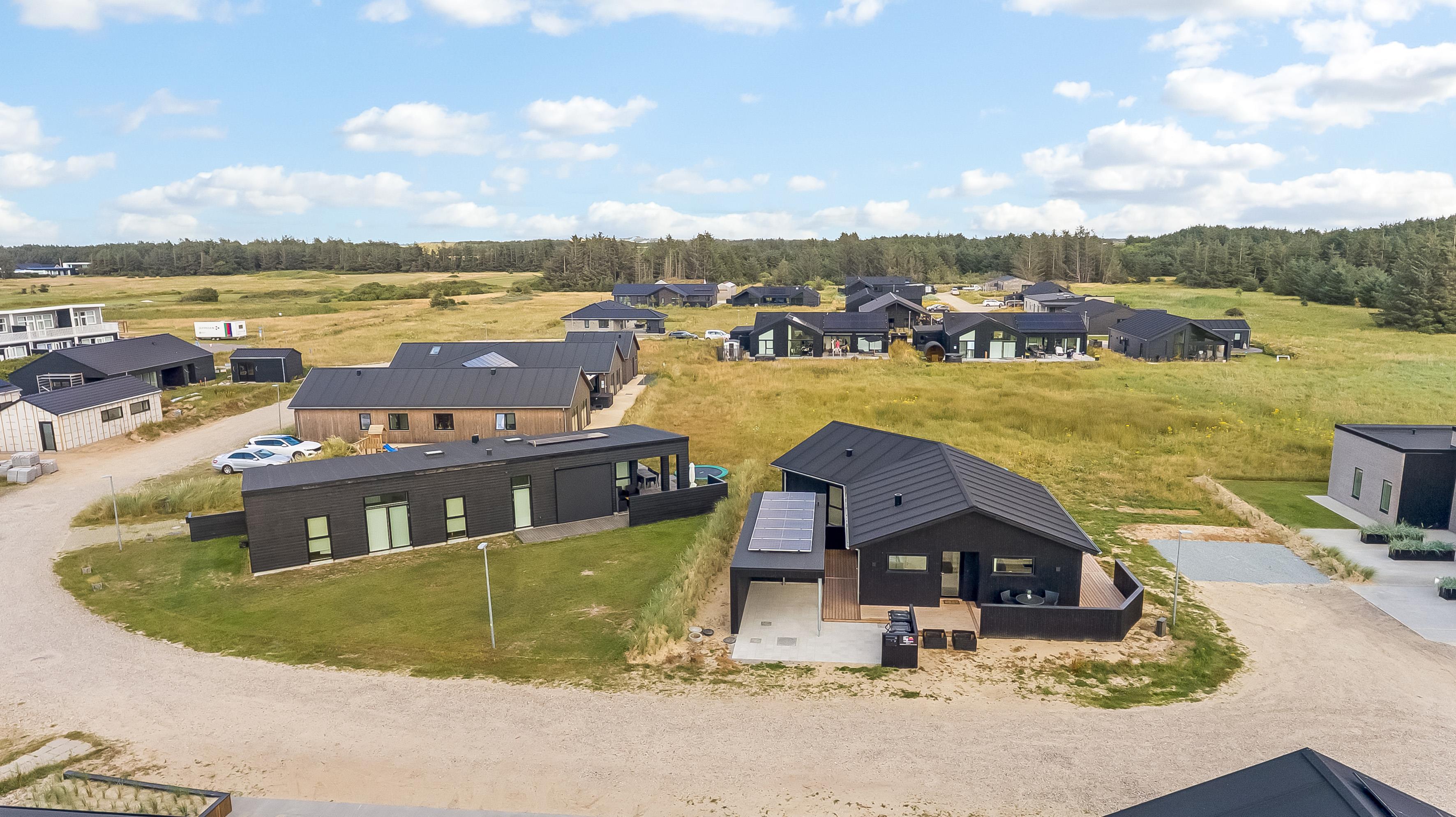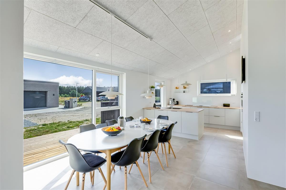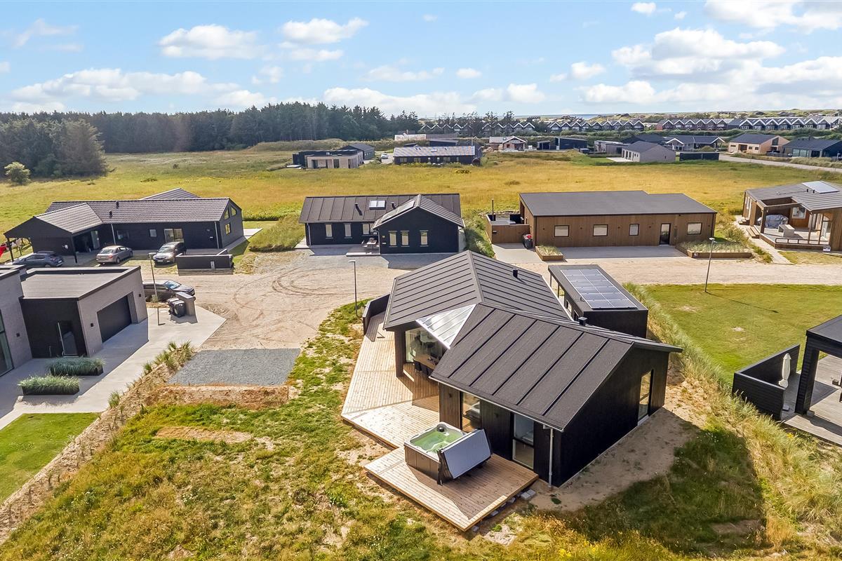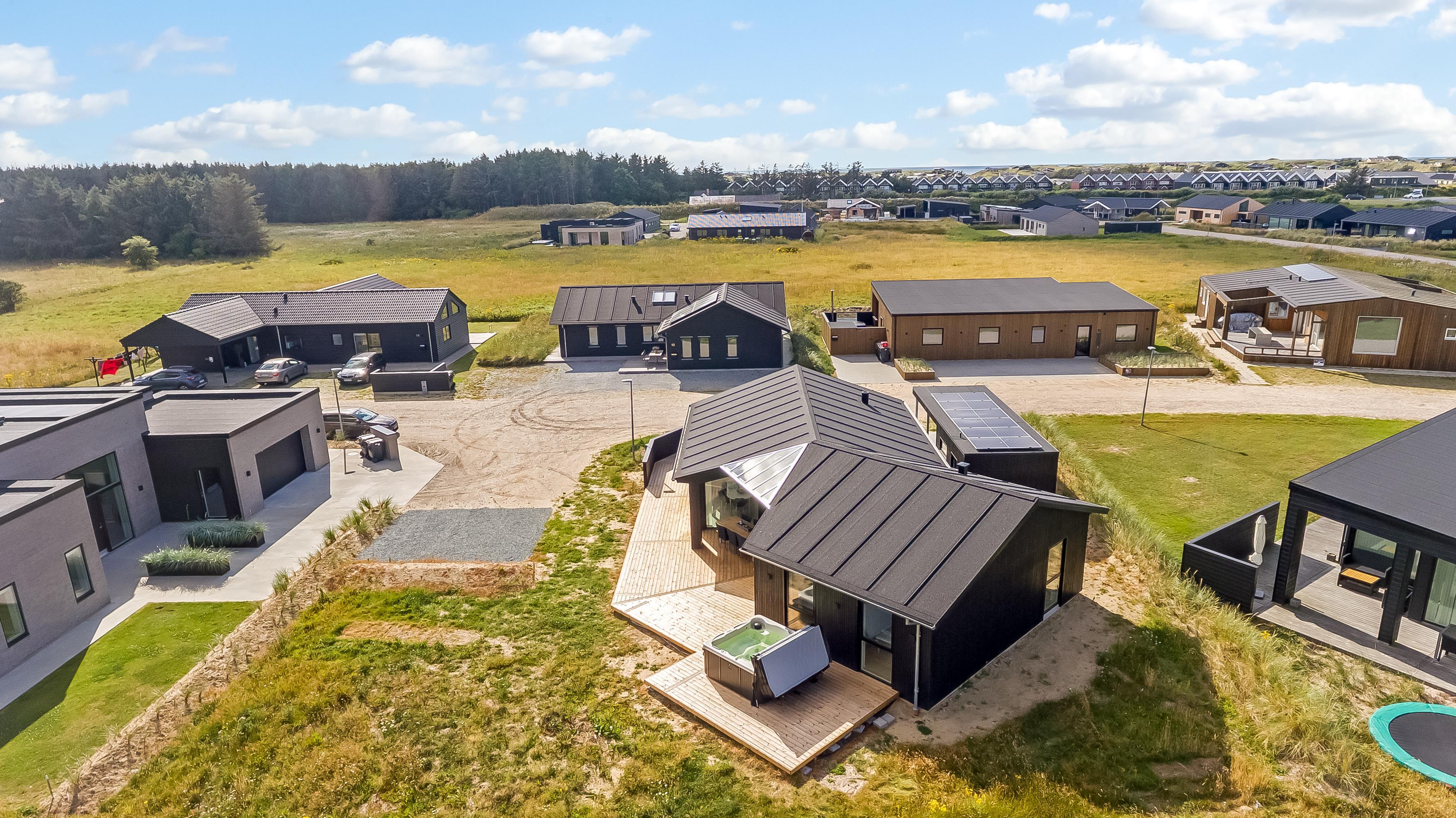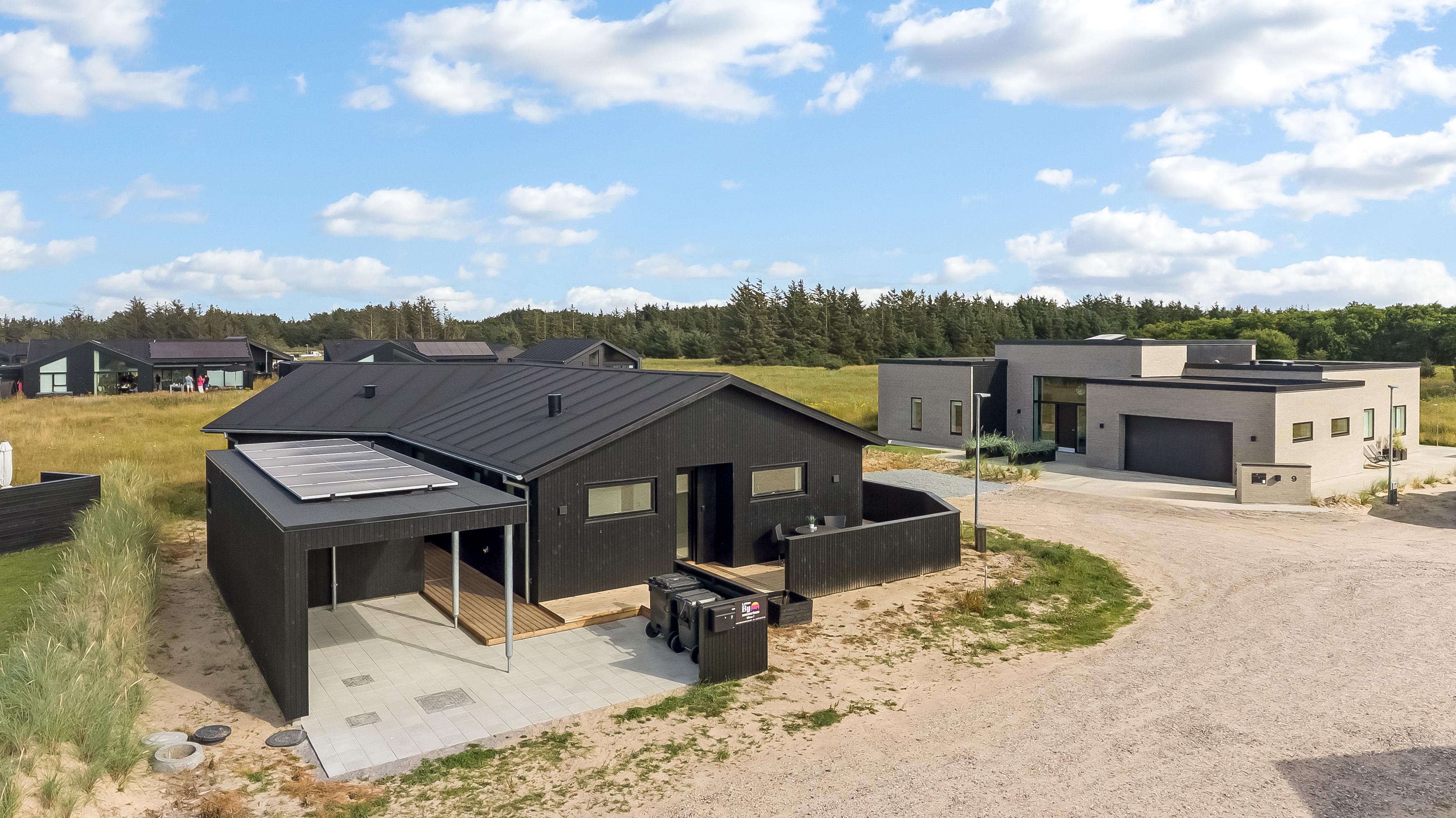The main house sleeps 6 people, while the cosy annex offers an additional 2 beds and its own bathroom – in total 8 sleeping spaces divided into 3 double beds and 2 single beds. The open-plan kitchen and living area is bright and thoughtfully designed. The bathrooms are spacious and stylish, and a practical utility room is located by the entrance. Although situated in a new development, the house is well positioned with a focus on privacy.