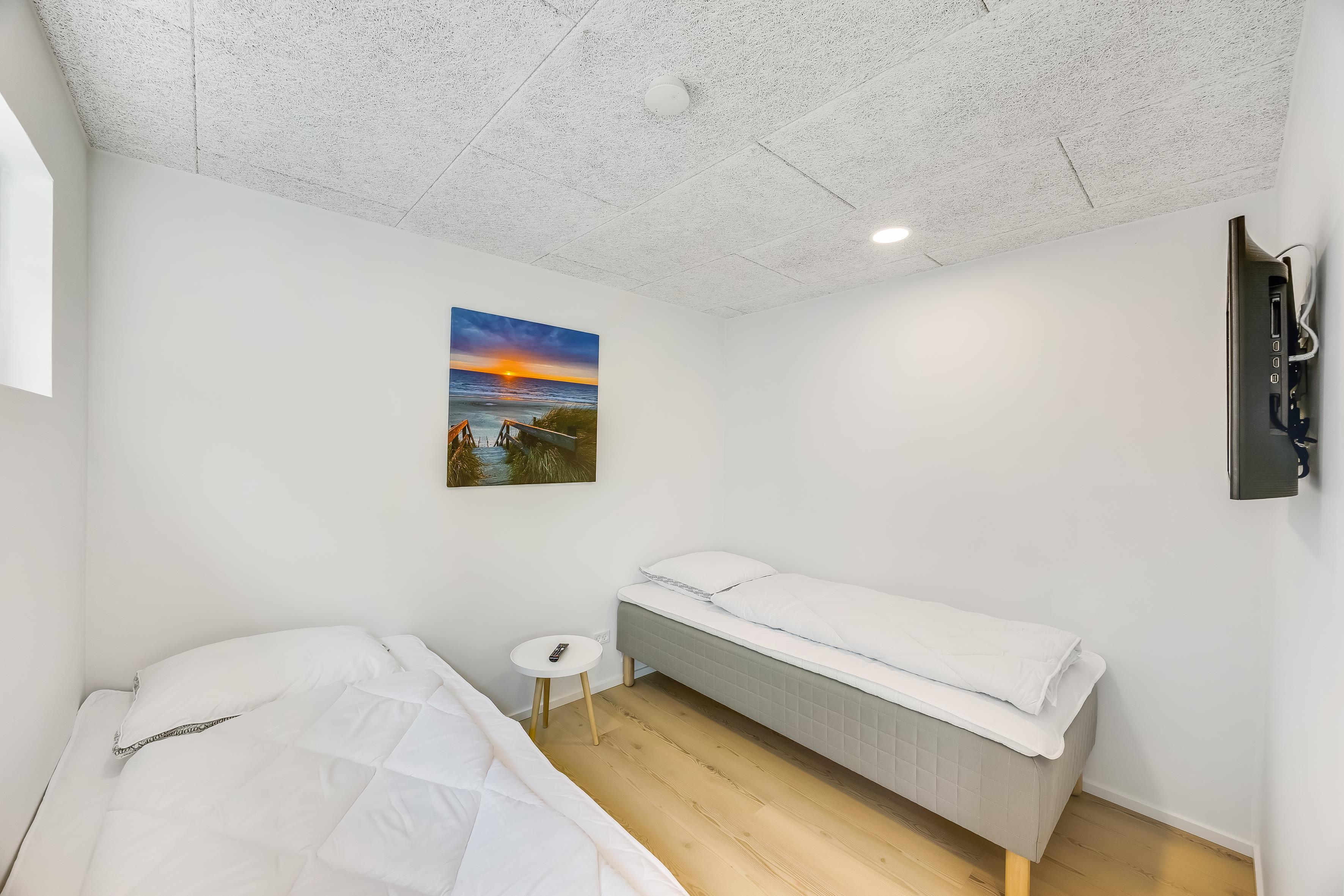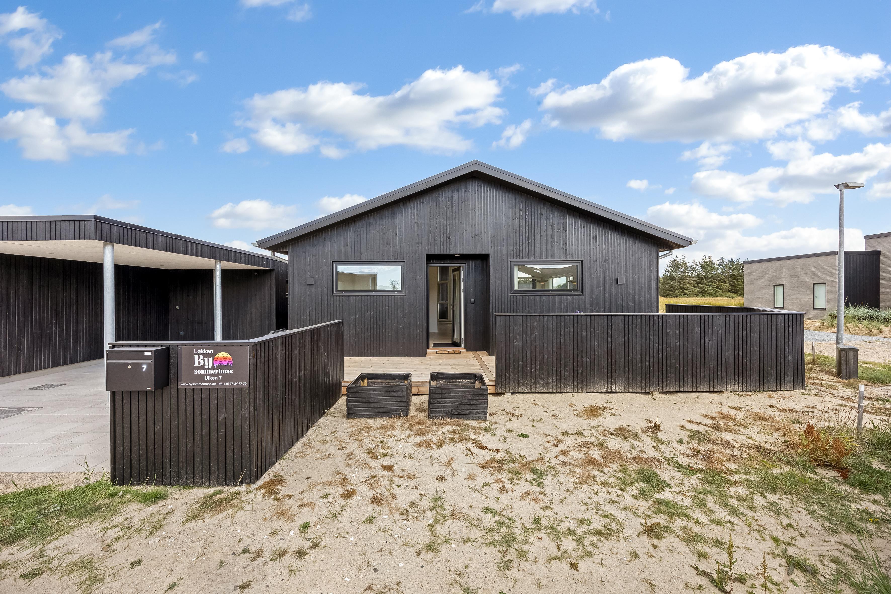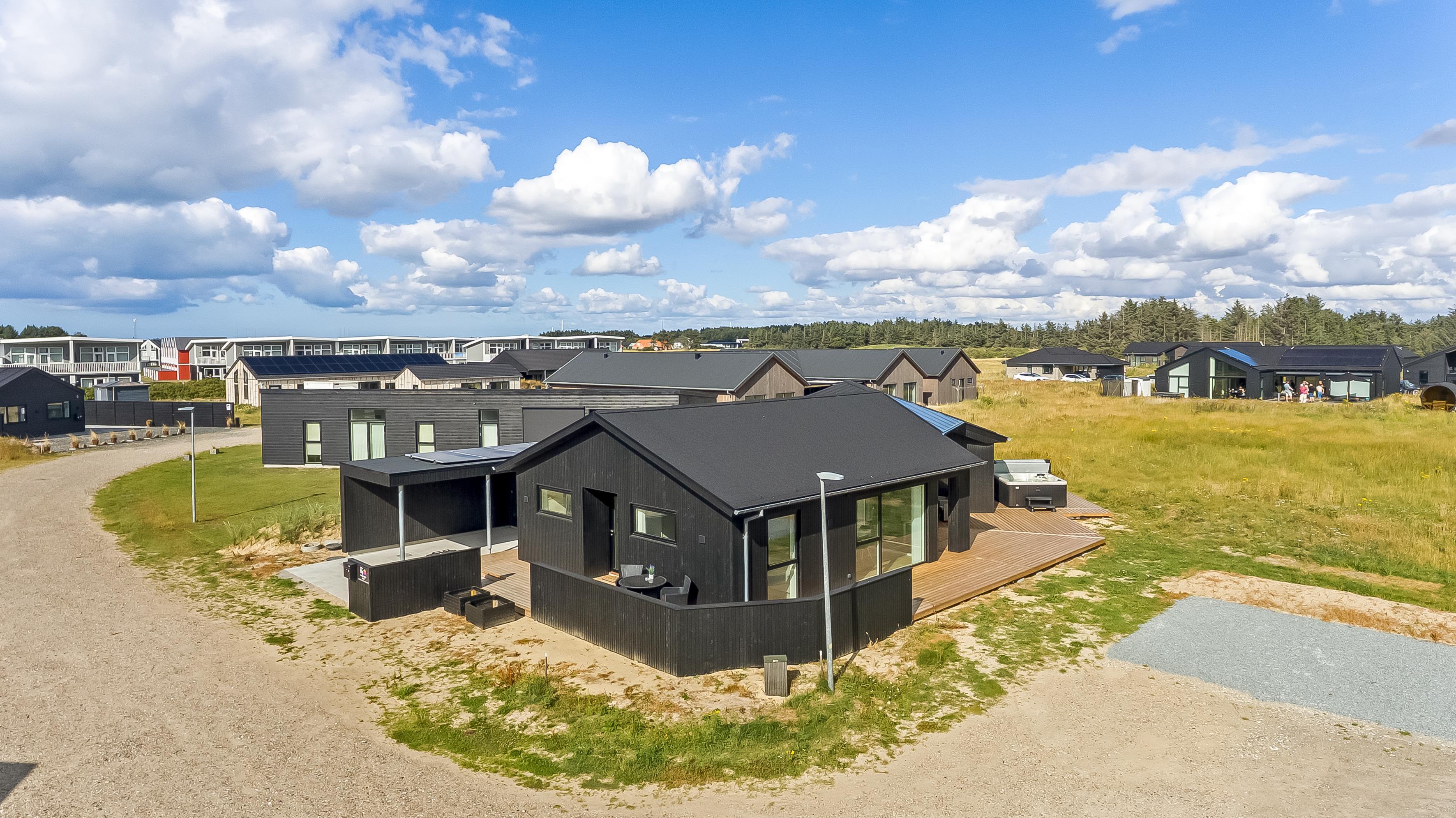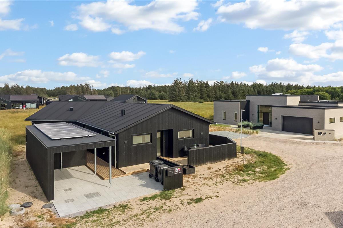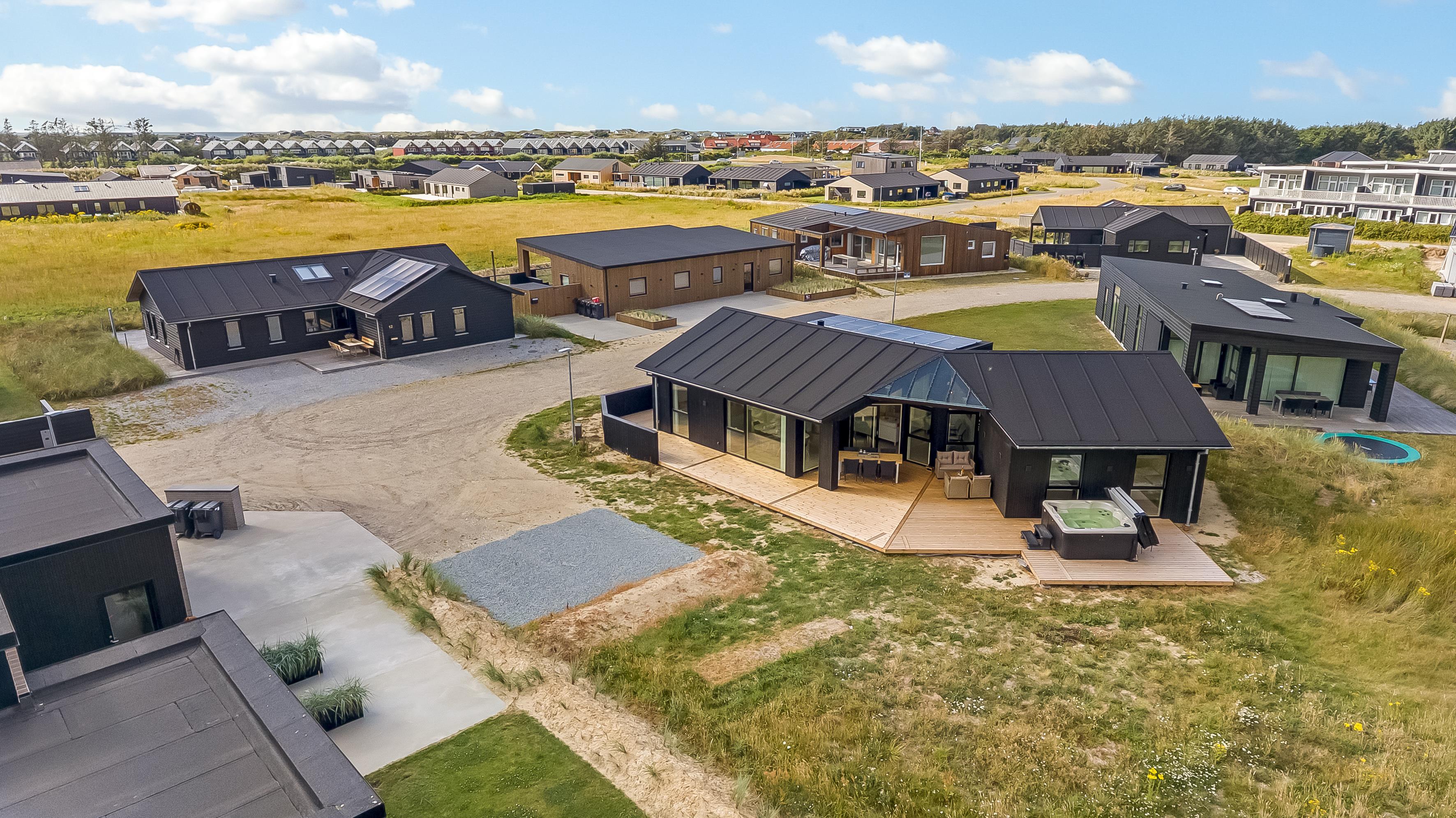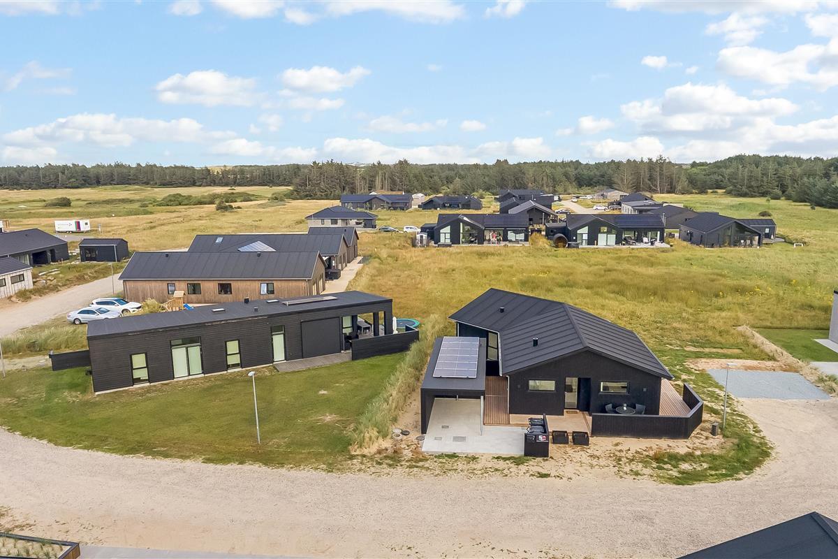 The main house sleeps 6 people, while the cosy annex offers an additional 2 beds and its own bathroom – in total 8 sleeping spaces divided into 3 double beds and 2 single beds. The open-plan kitchen and living area is bright and thoughtfully designed. The bathrooms are spacious and stylish, and a practical utility room is located by the entrance. Although situated in a new development, the house is well positioned with a focus on privacy.