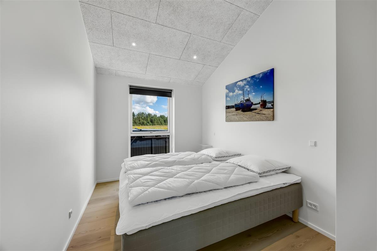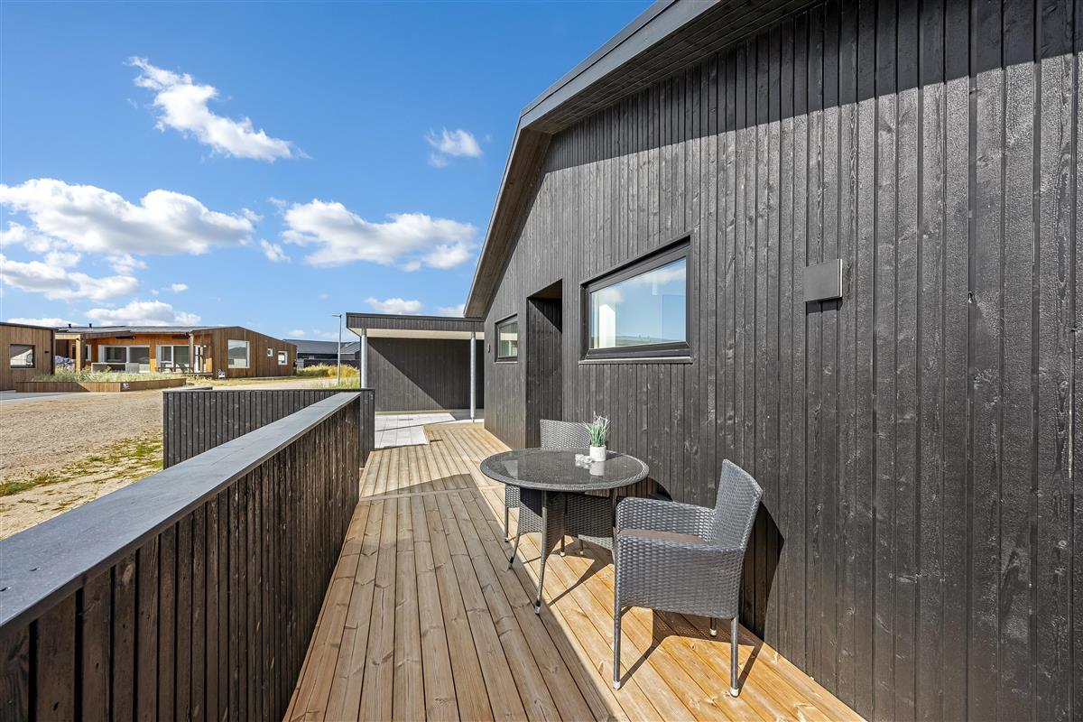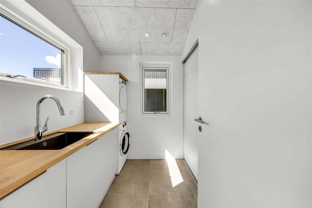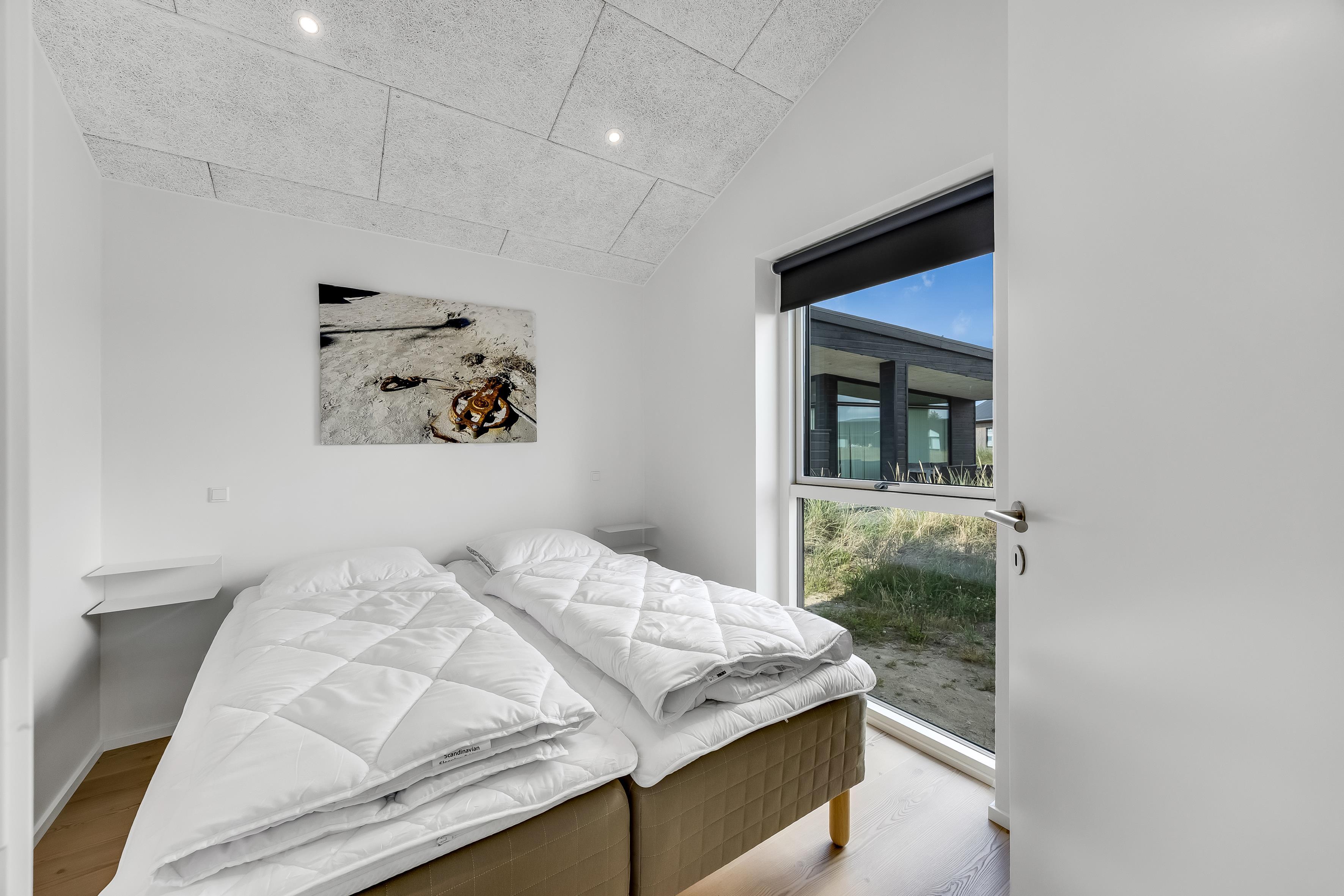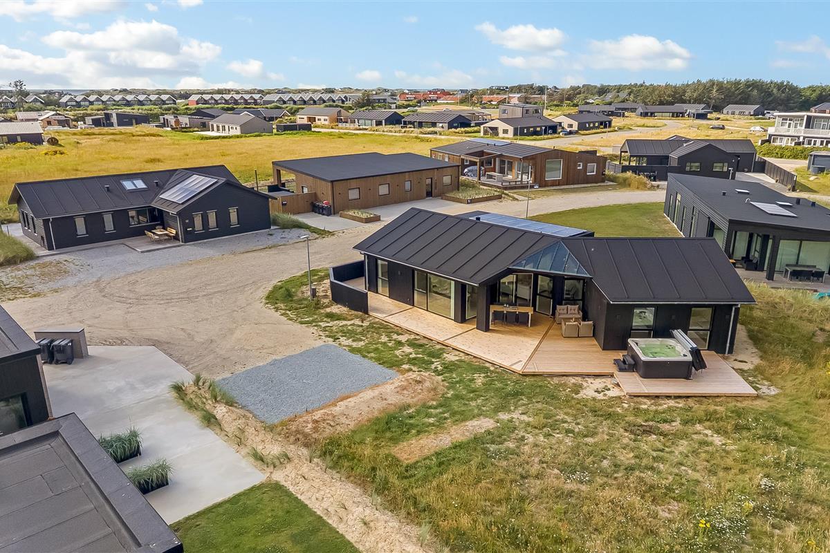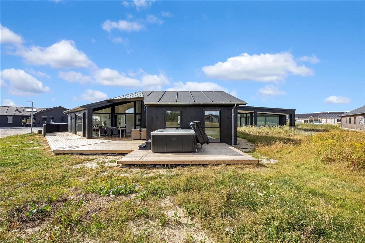 The main house sleeps 6 people, while the cosy annex offers an additional 2 beds and its own bathroom – in total 8 sleeping spaces divided into 3 double beds and 2 single beds. The open-plan kitchen and living area is bright and thoughtfully designed. The bathrooms are spacious and stylish, and a practical utility room is located by the entrance. Although situated in a new development, the house is well positioned with a focus on privacy.