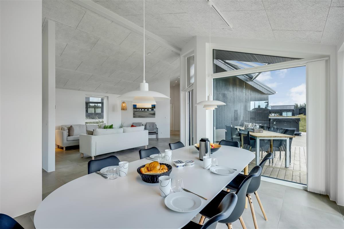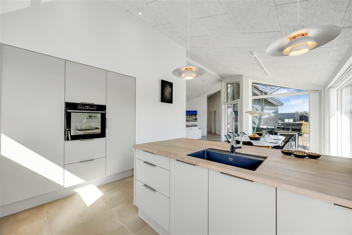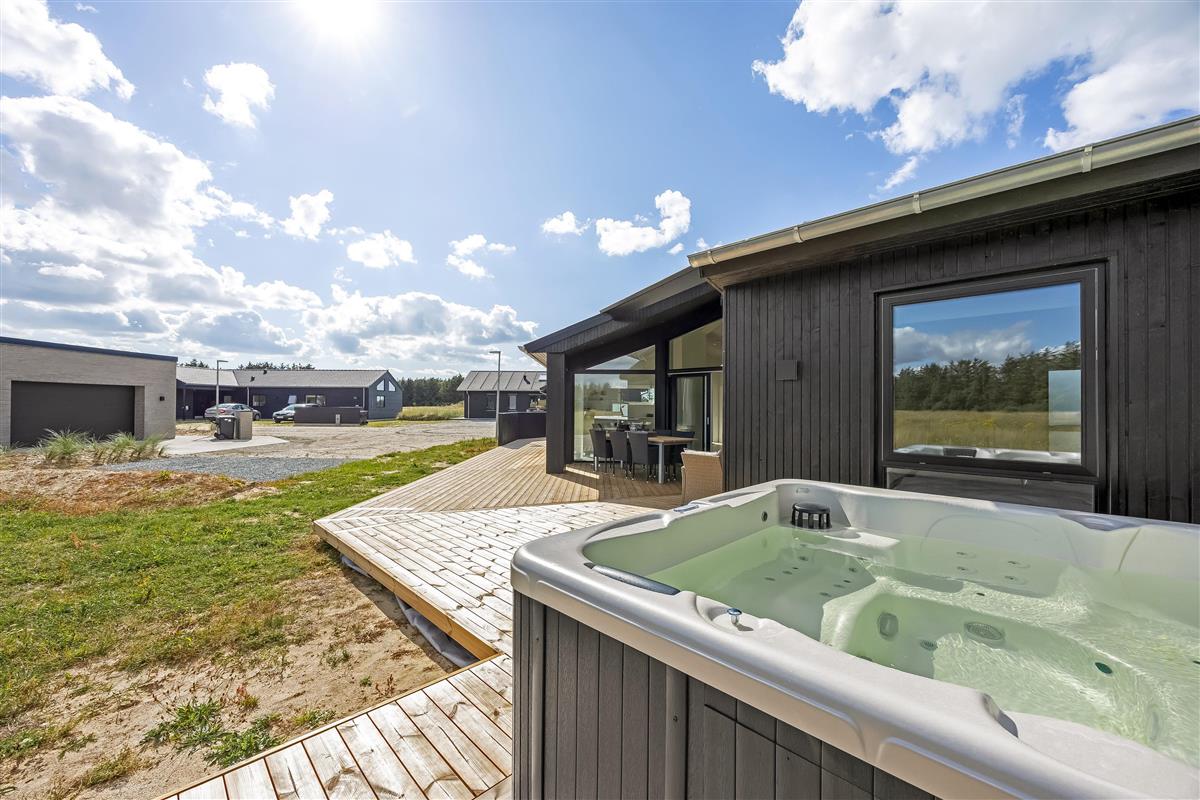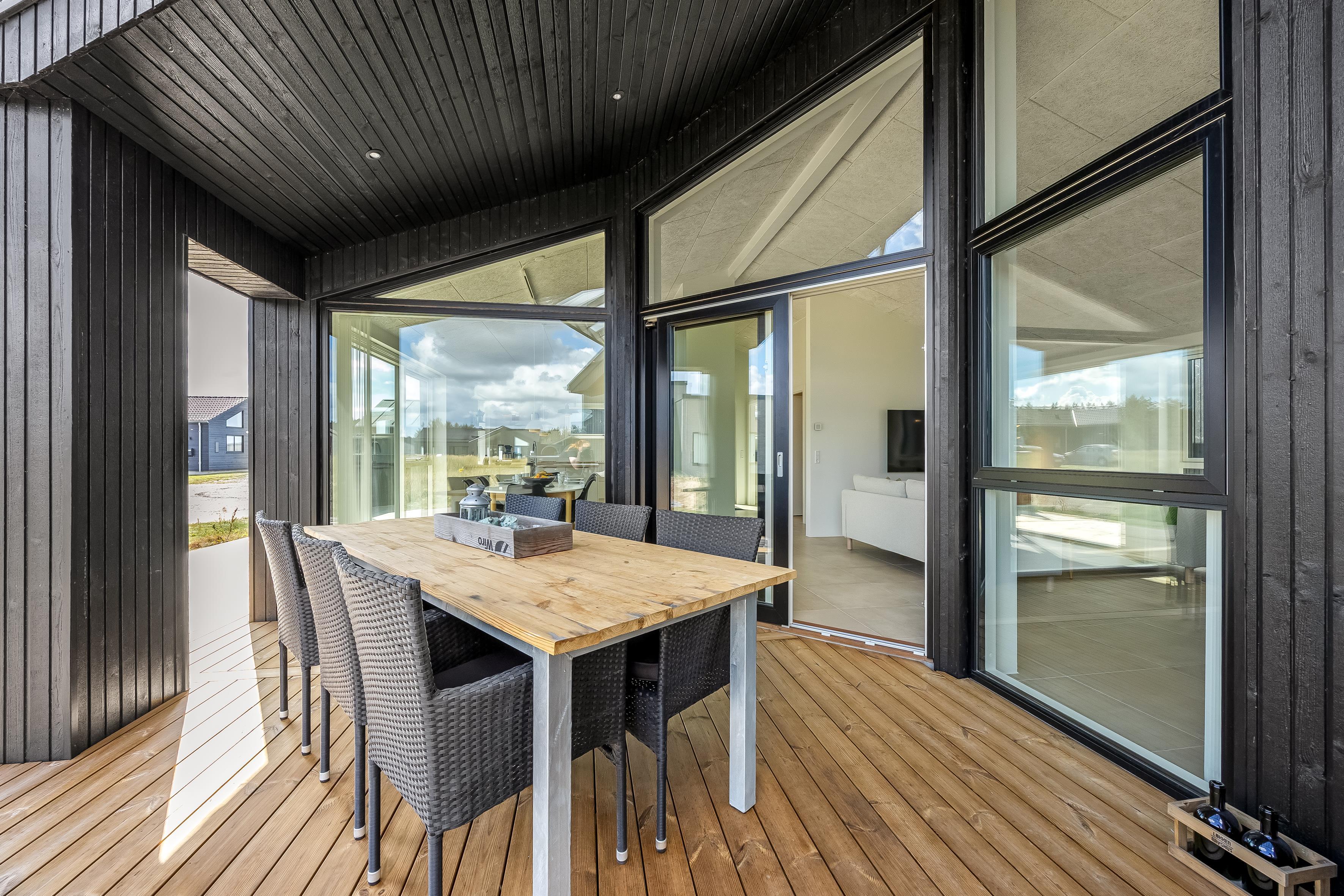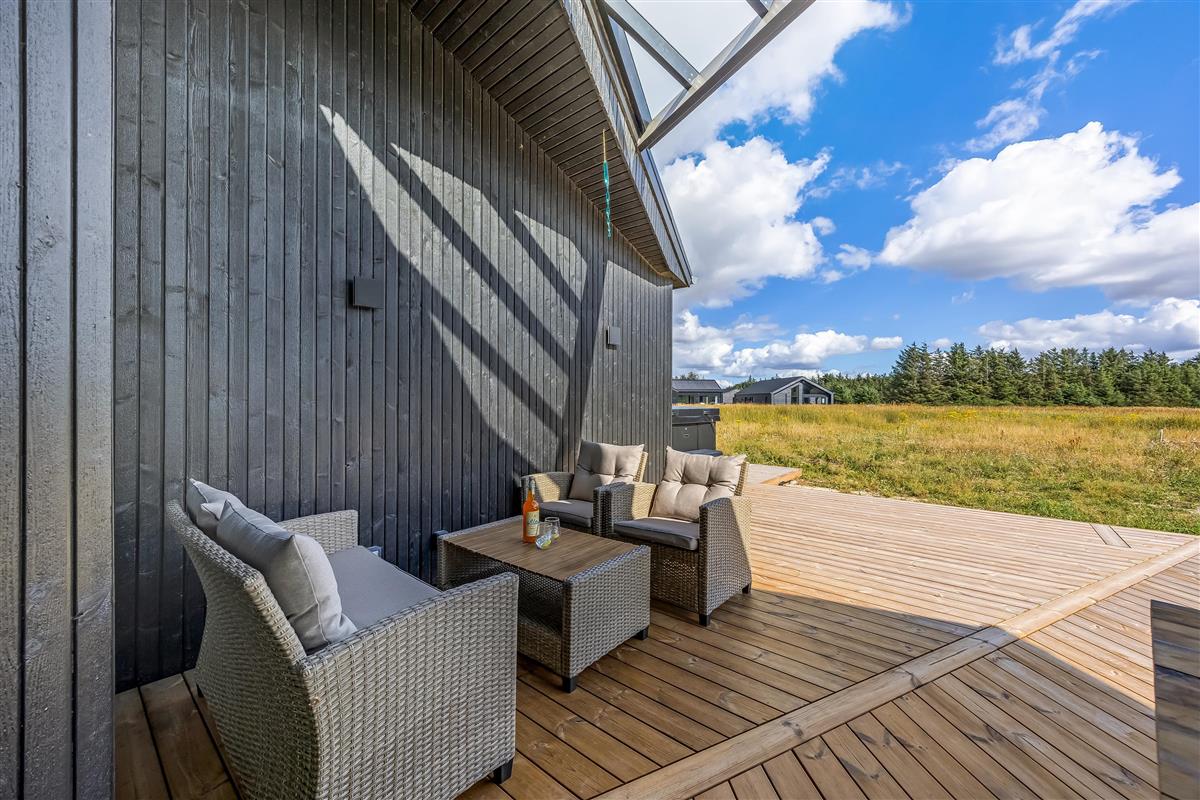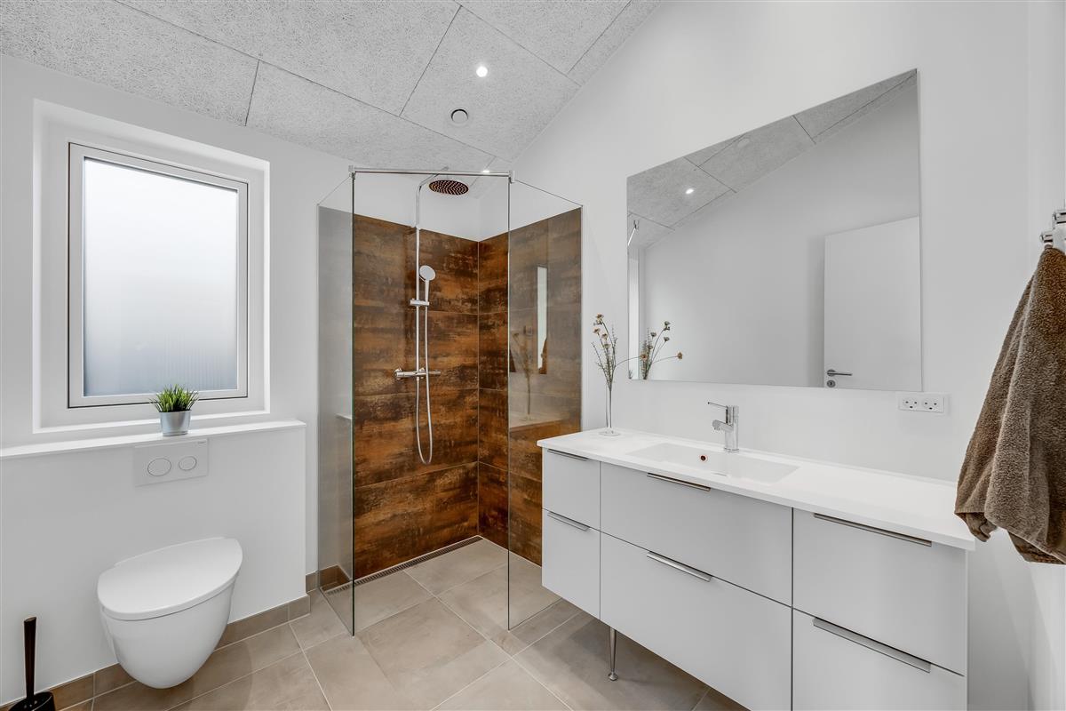 The main house sleeps 6 people, while the cosy annex offers an additional 2 beds and its own bathroom – in total 8 sleeping spaces divided into 3 double beds and 2 single beds. The open-plan kitchen and living area is bright and thoughtfully designed. The bathrooms are spacious and stylish, and a practical utility room is located by the entrance. Although situated in a new development, the house is well positioned with a focus on privacy.