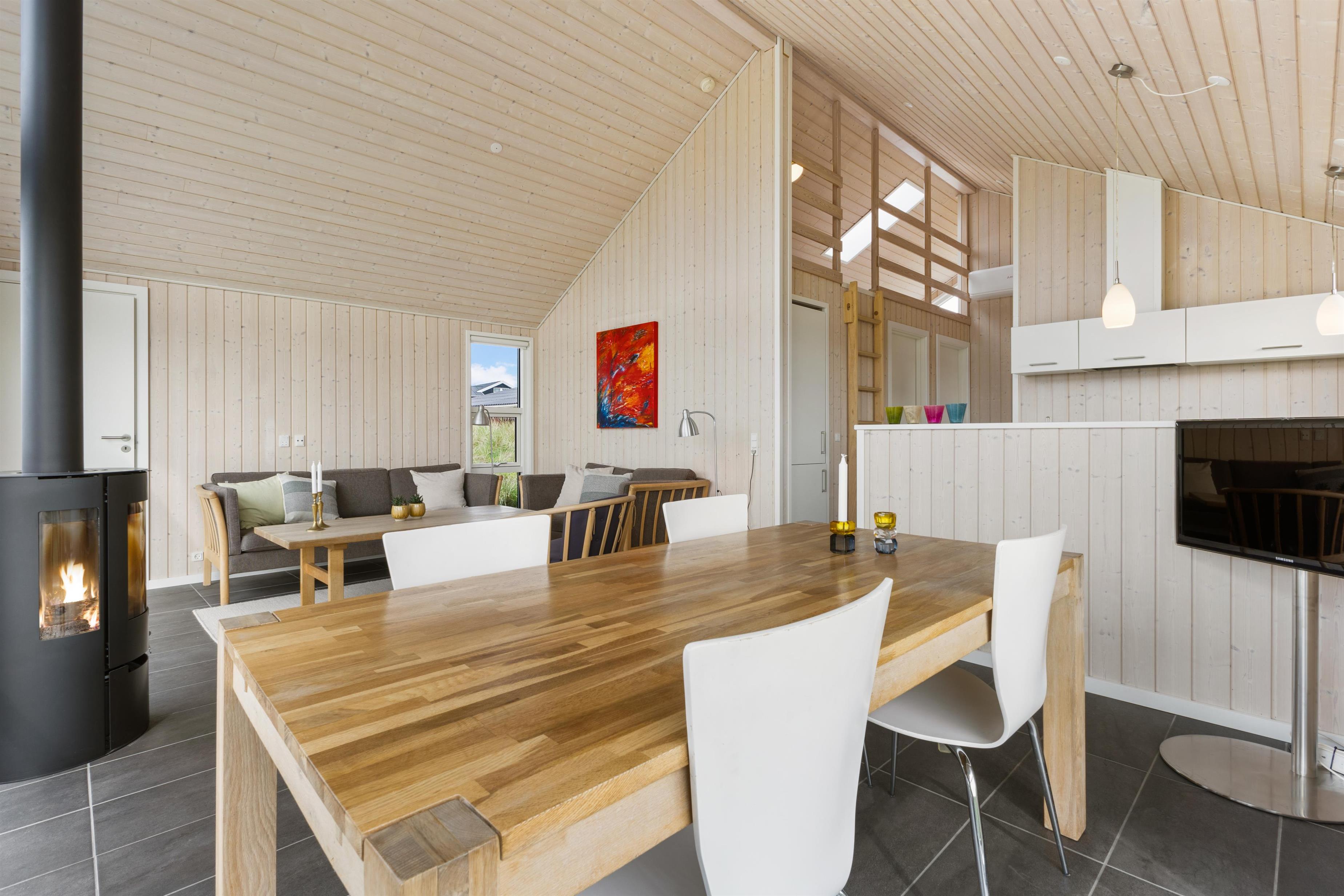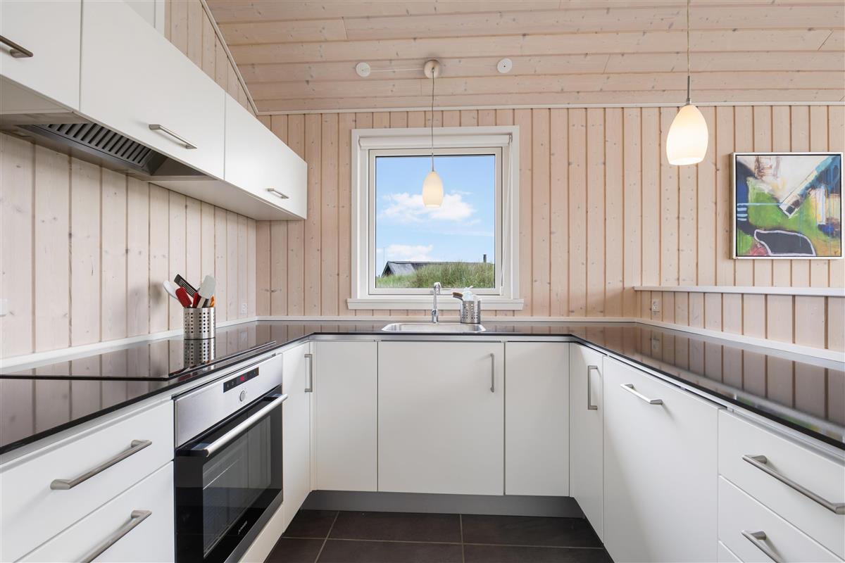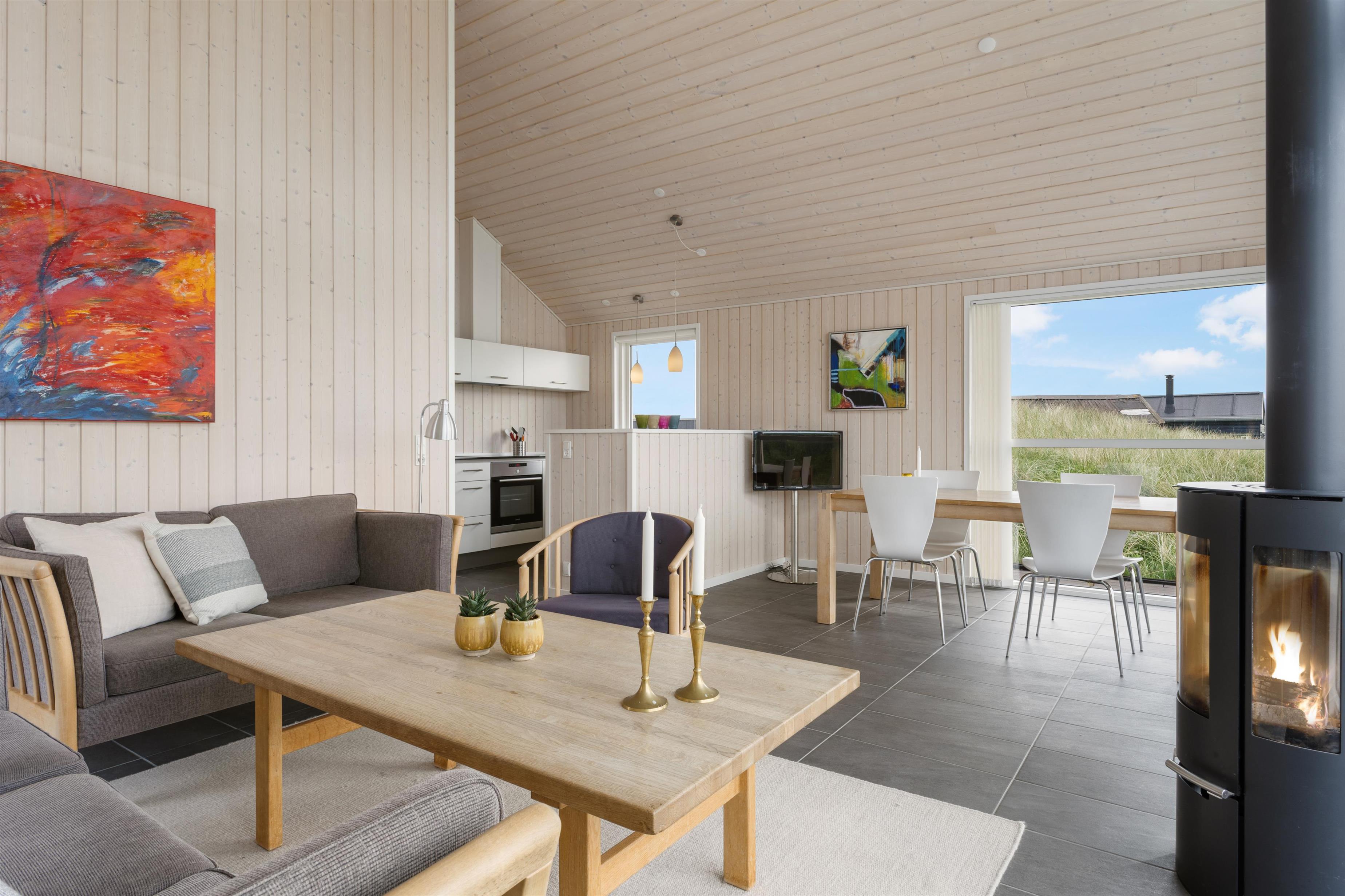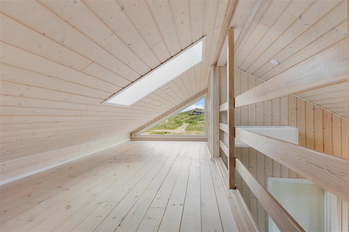 In this delightful holiday home, you will find a spacious living room and a well-equipped kitchen with high ceilings and a loft. Here, you can spend quality time with family or friends, cozy up in front of the fireplace, and enjoy the magnificent nature. The three bedrooms all have comfortable double beds and are designed with a focus on peace and relaxation, ensuring everyone gets a good night's sleep. You are just 100 meters from the beach and about 2 km from the bustling life of Løkken. The view from the living room is phenomenal, and with the large windows, nature is invited inside and can be enjoyed in all kinds of weather.