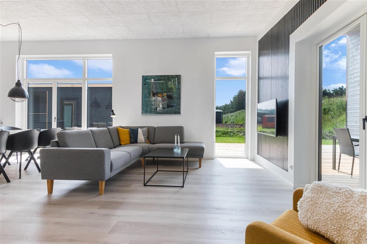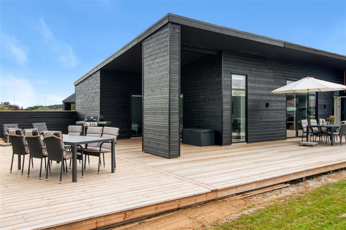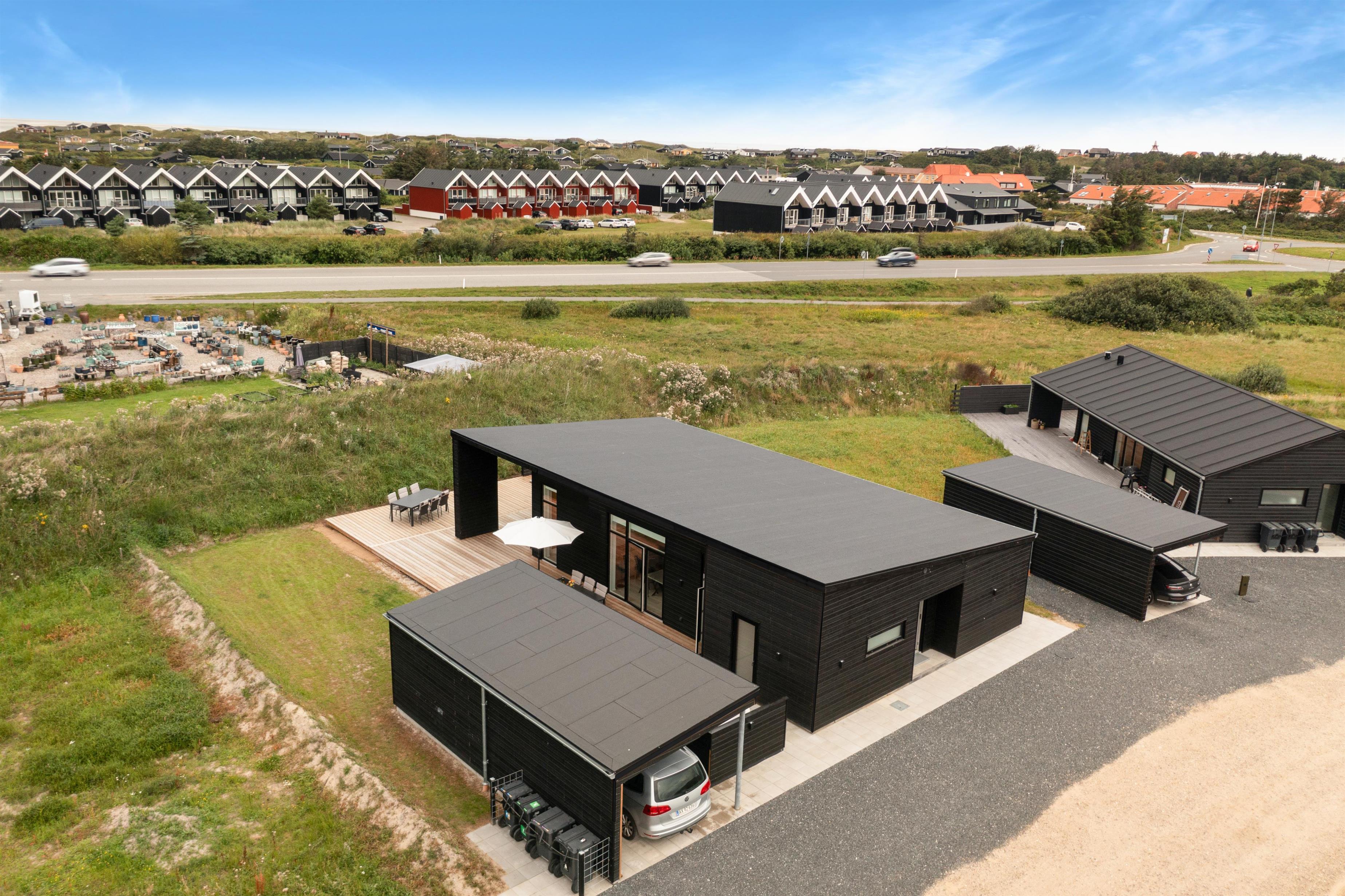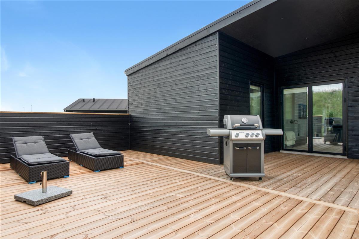 The house is designed for practicality with a focus on comfort and modern amenities, and it is heated with district heating. The kitchen is large, bright, and luxurious. There is a lockable shed, carport, garden furniture, and everything our hearts desire when renting a modern and newly built summer house in Løkken.