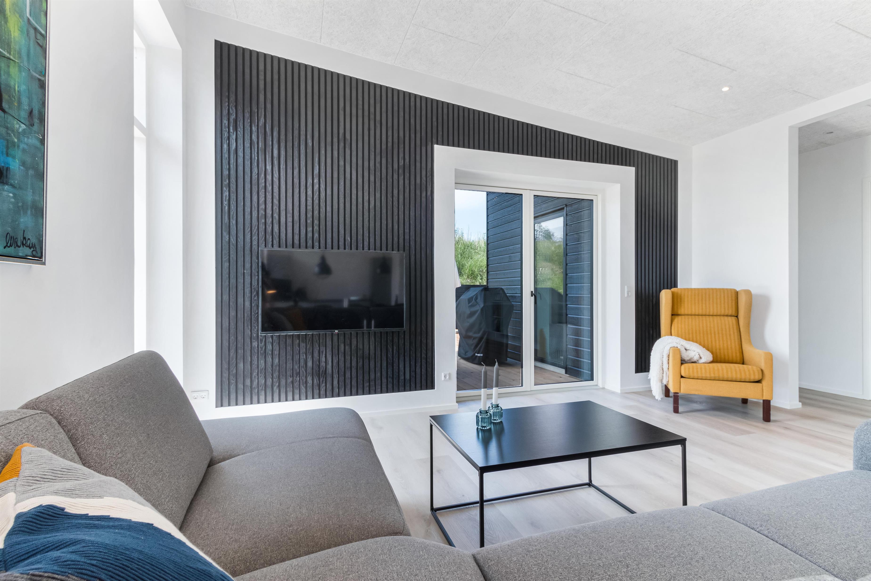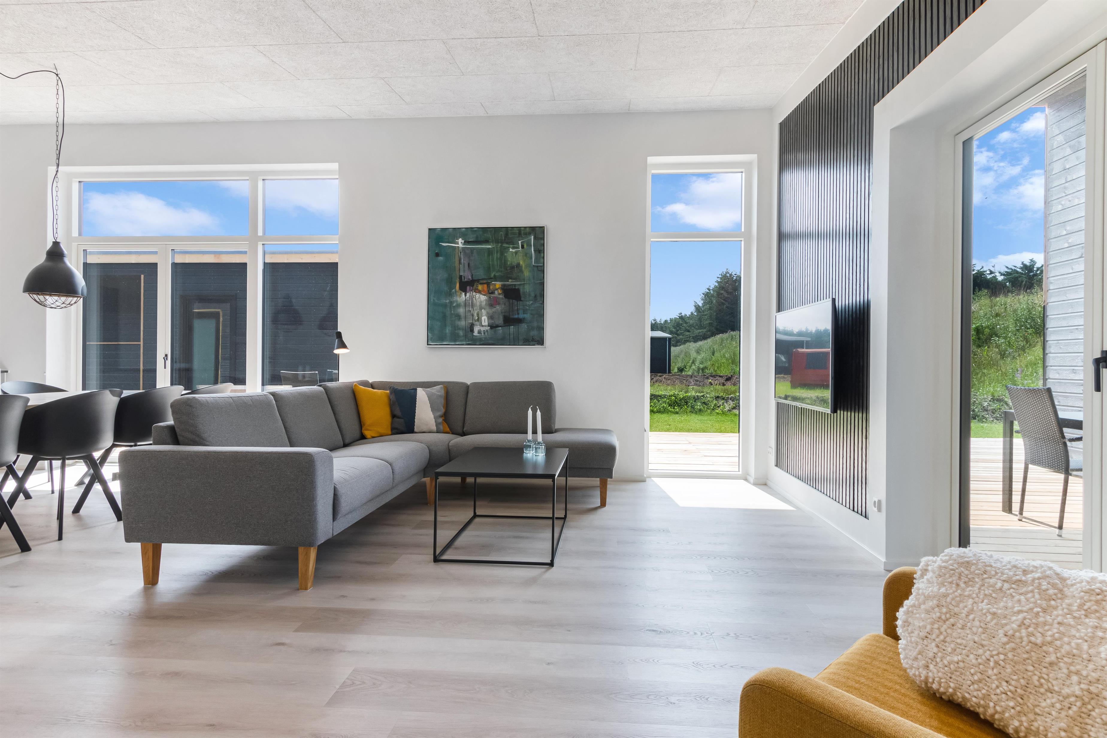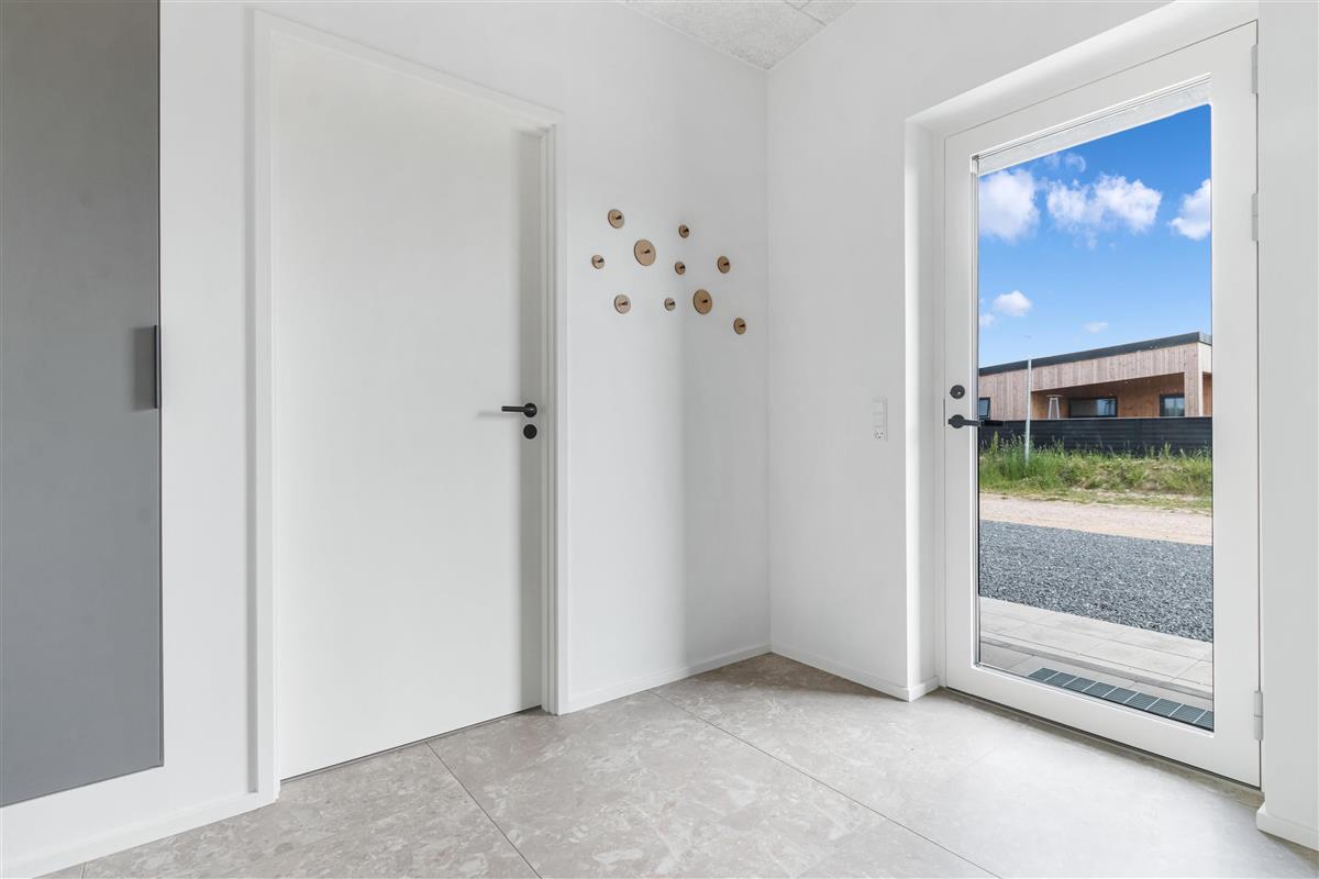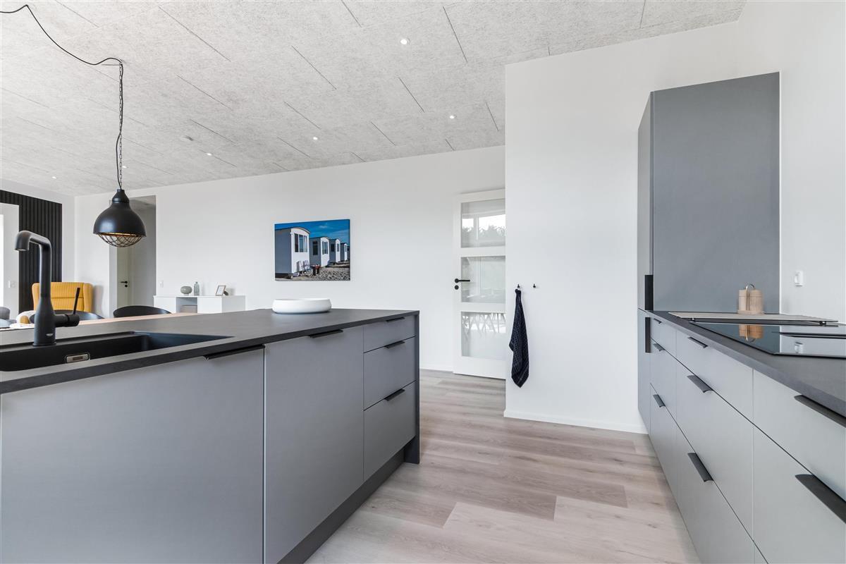 The house is designed for practicality with a focus on comfort and modern amenities, and it is heated with district heating. The kitchen is large, bright, and luxurious. There is a lockable shed, carport, garden furniture, and everything our hearts desire when renting a modern and newly built summer house in Løkken.