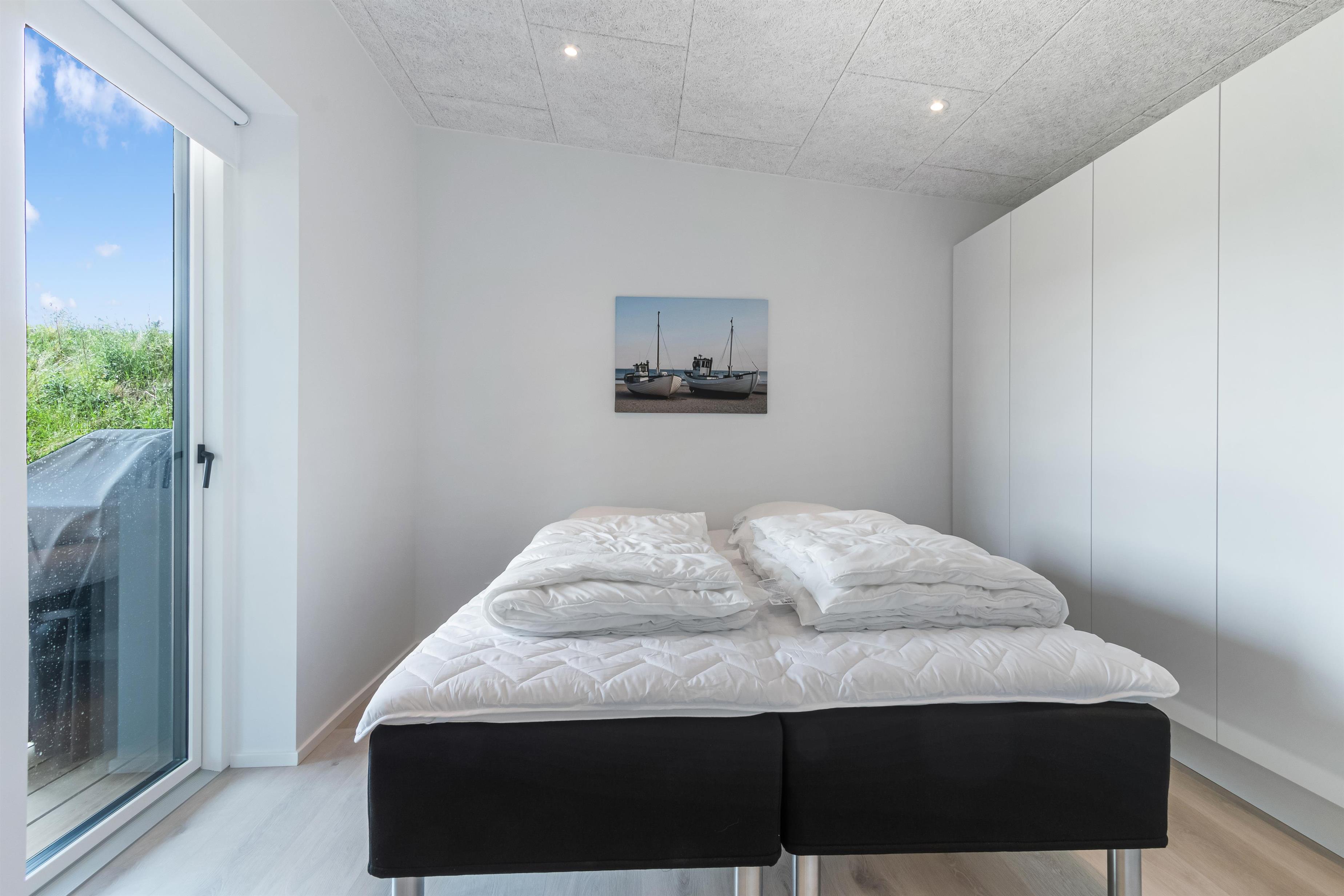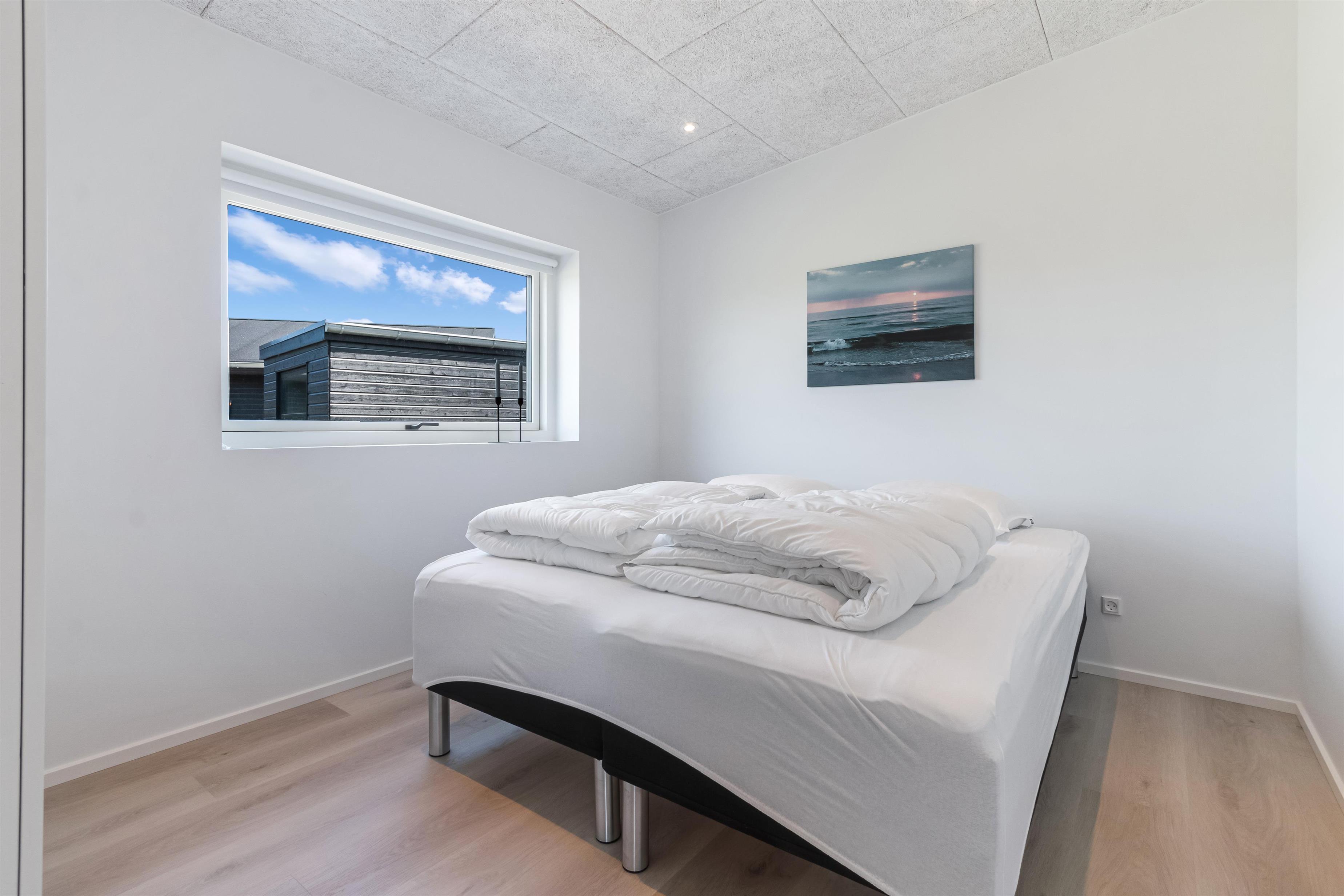 The summer house has four bedrooms with double beds in each room. There are two bathrooms and a bright and open kitchen/dining area connected to the living room. There is room for 8 people here.