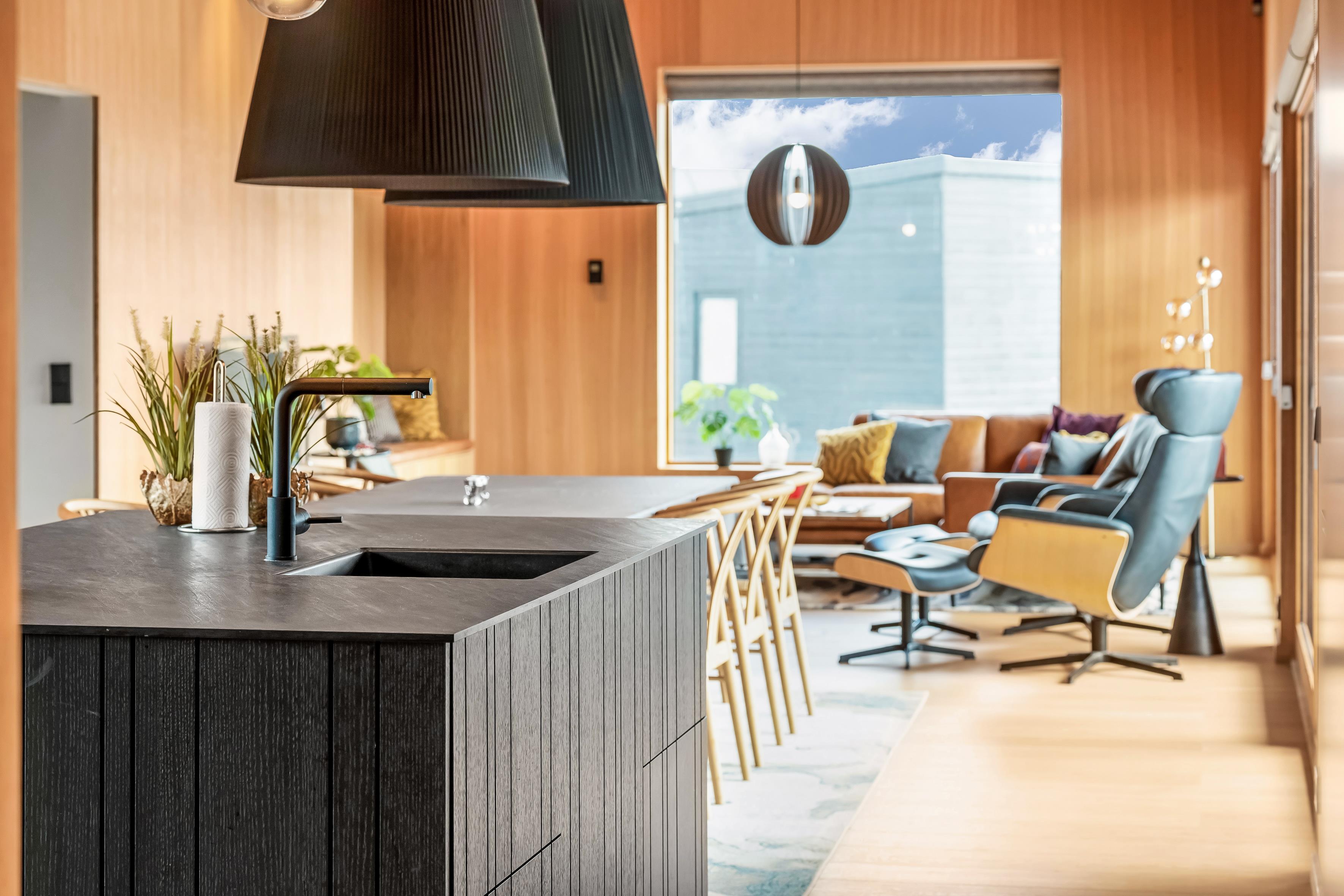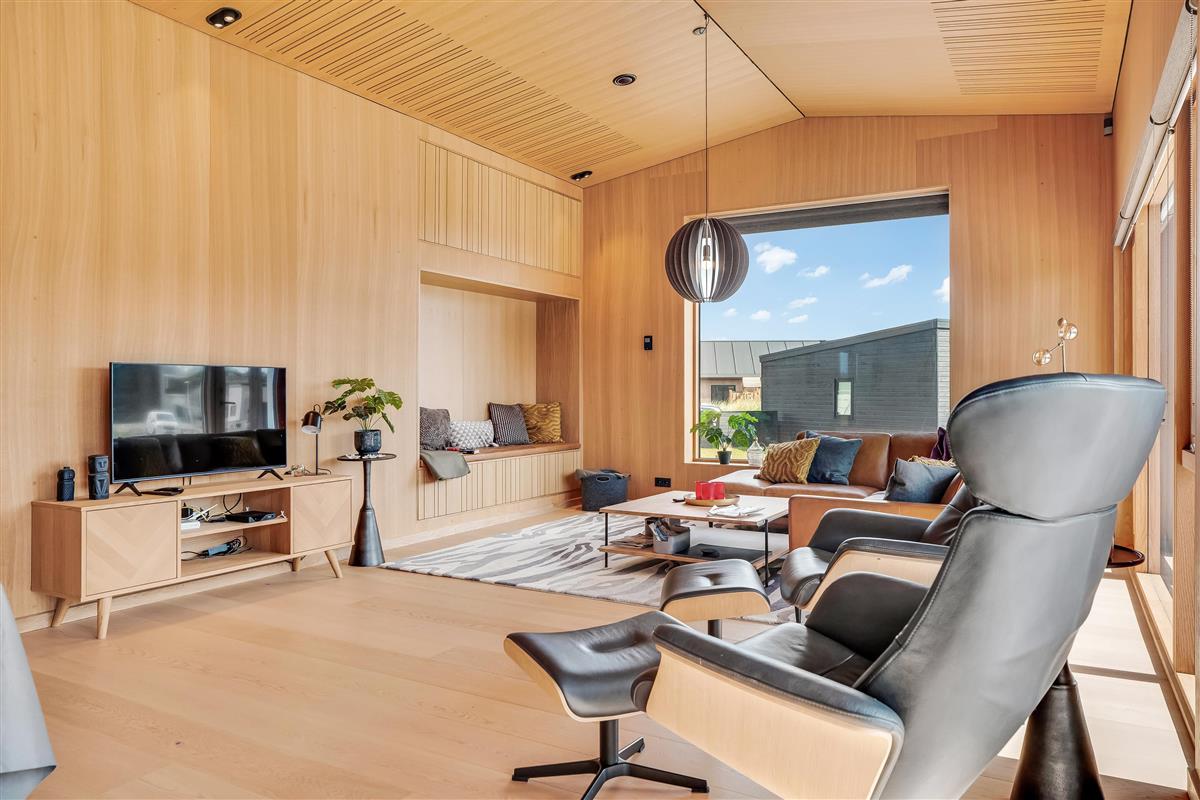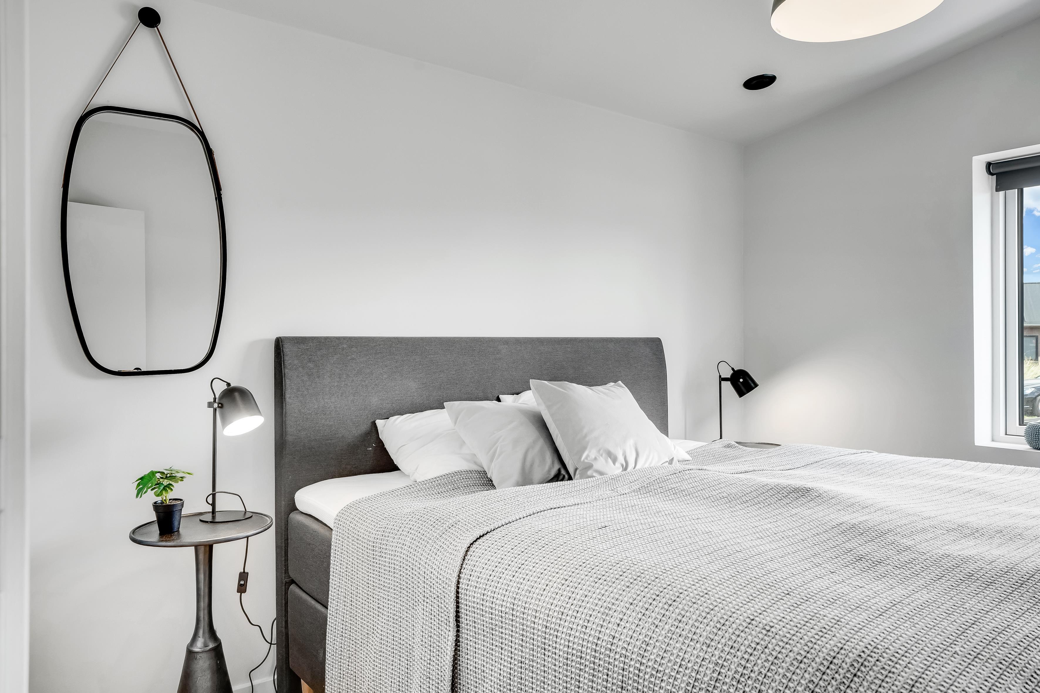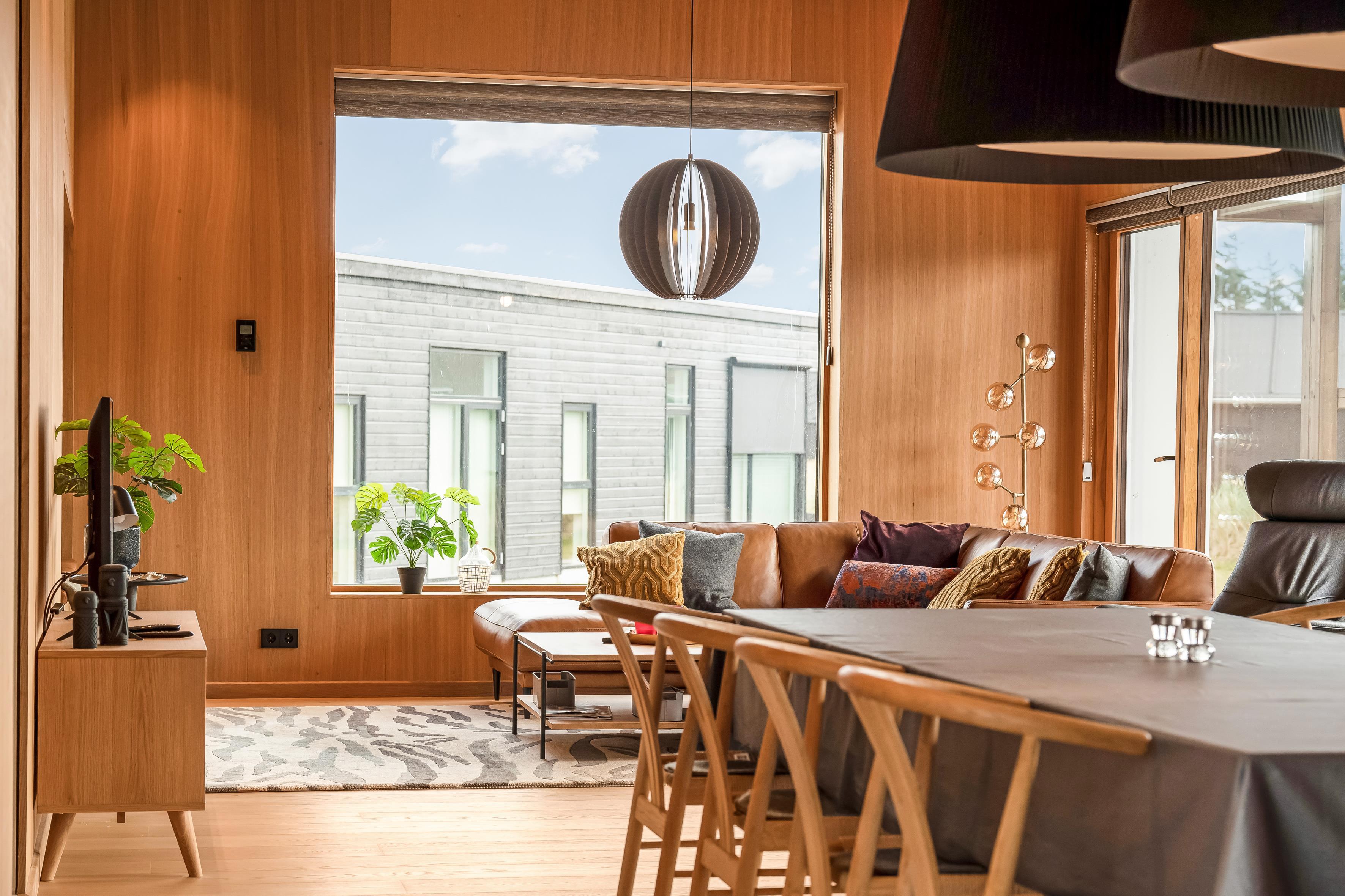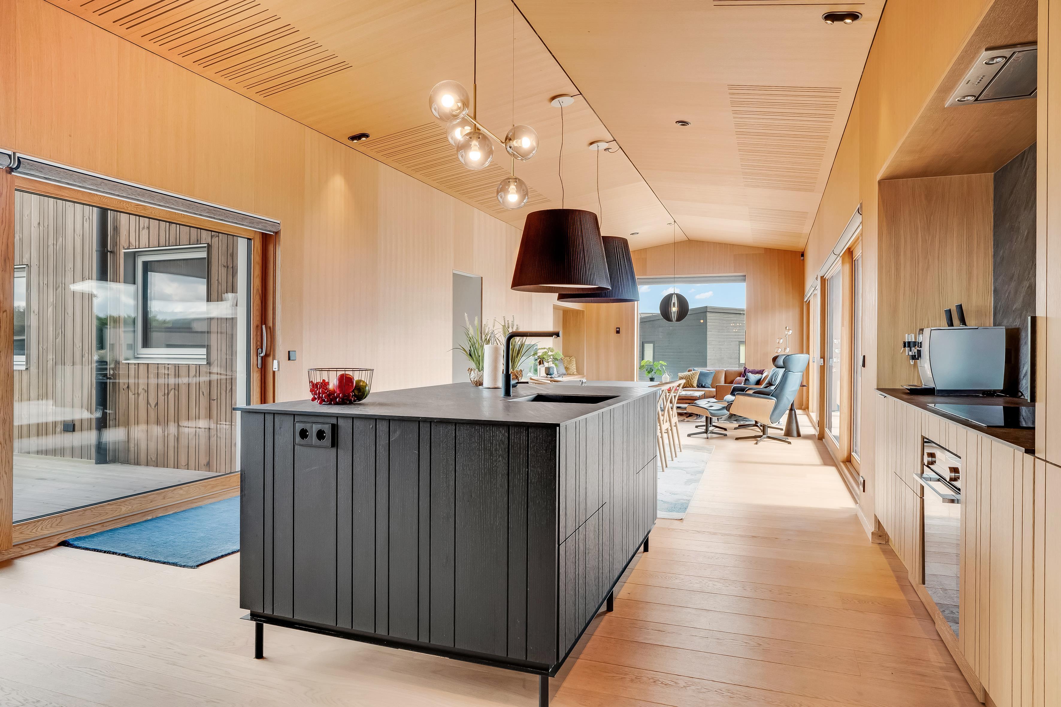 The house accommodates 7 guests across 5 bedrooms with three double beds and two single beds. The heart of the home is the open-plan kitchen and living room, which combines functionality, light, and timeless Danish design. Two elegant bathrooms add extra comfort. The house is part of a newly established neighbourhood with both holiday and permanent homes side by side.