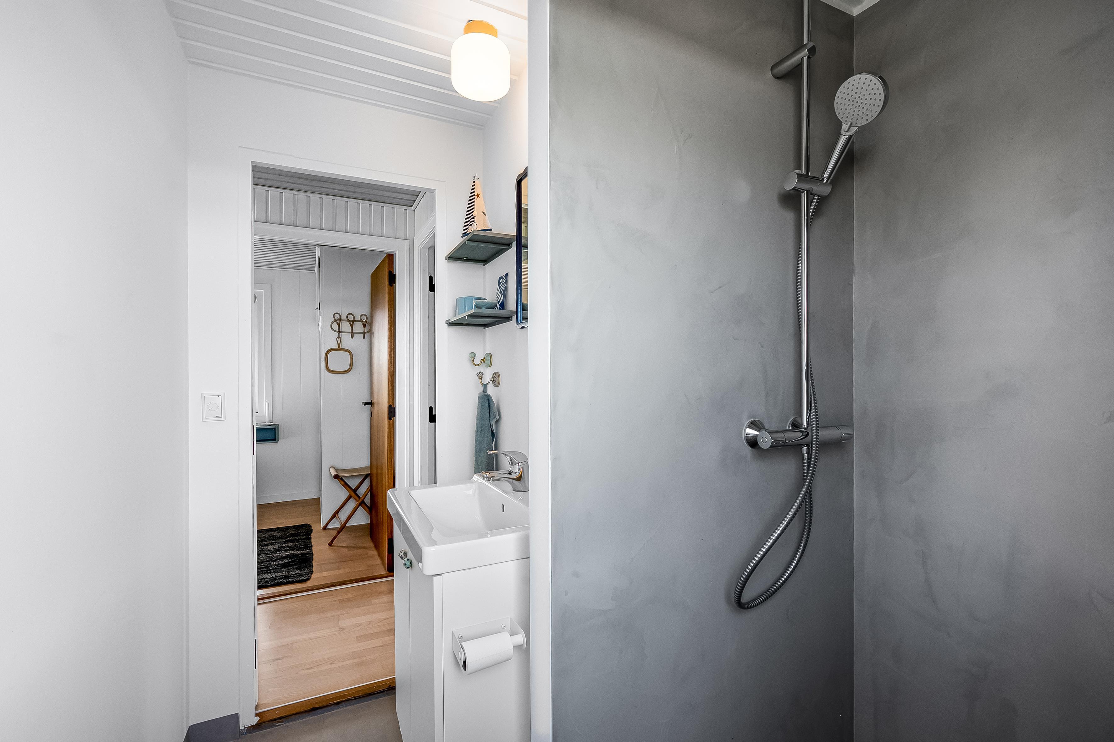 This lovely holiday home offers 40 sqm of living space in the main house, including two bedrooms, a bathroom, kitchen/living area, and TV lounge. The kitchen/living area is bright and welcoming with a wood-burning stove, and from here, you have access to both of the house’s terraces. The kitchen and bathroom in the main house are newly renovated. In addition, there is a 33 sqm garage containing an extra bedroom and bathroom.