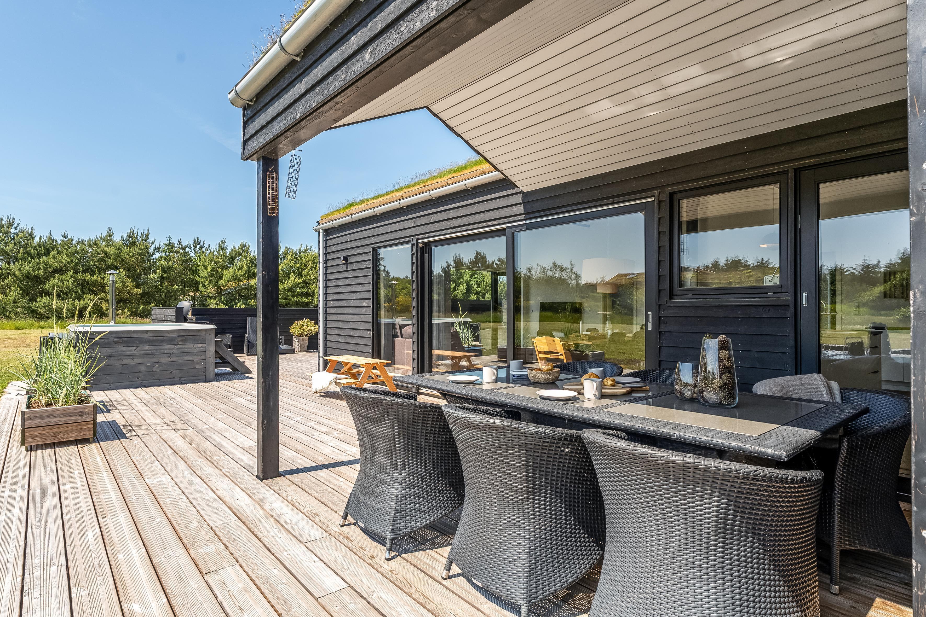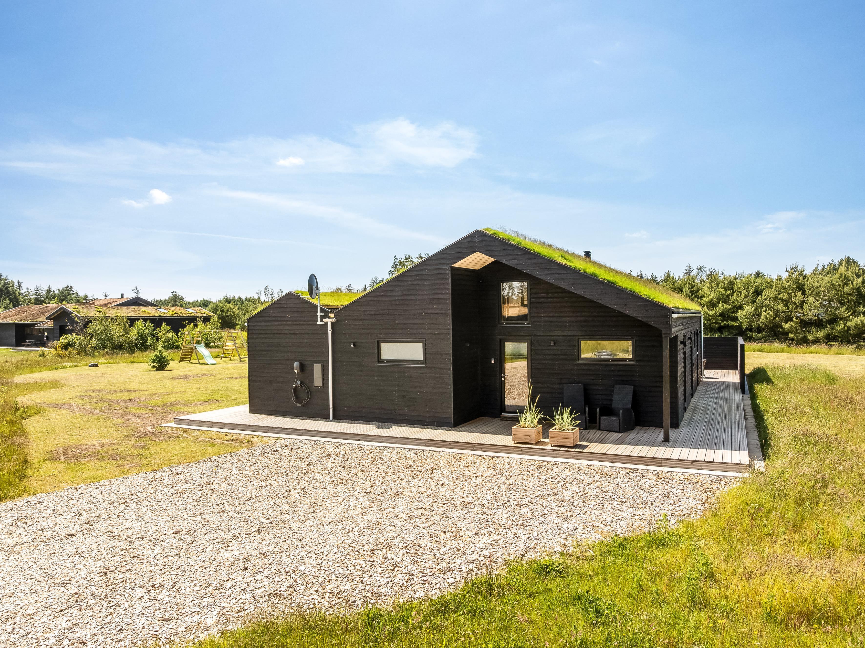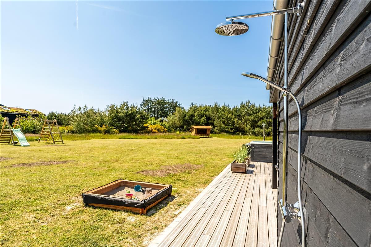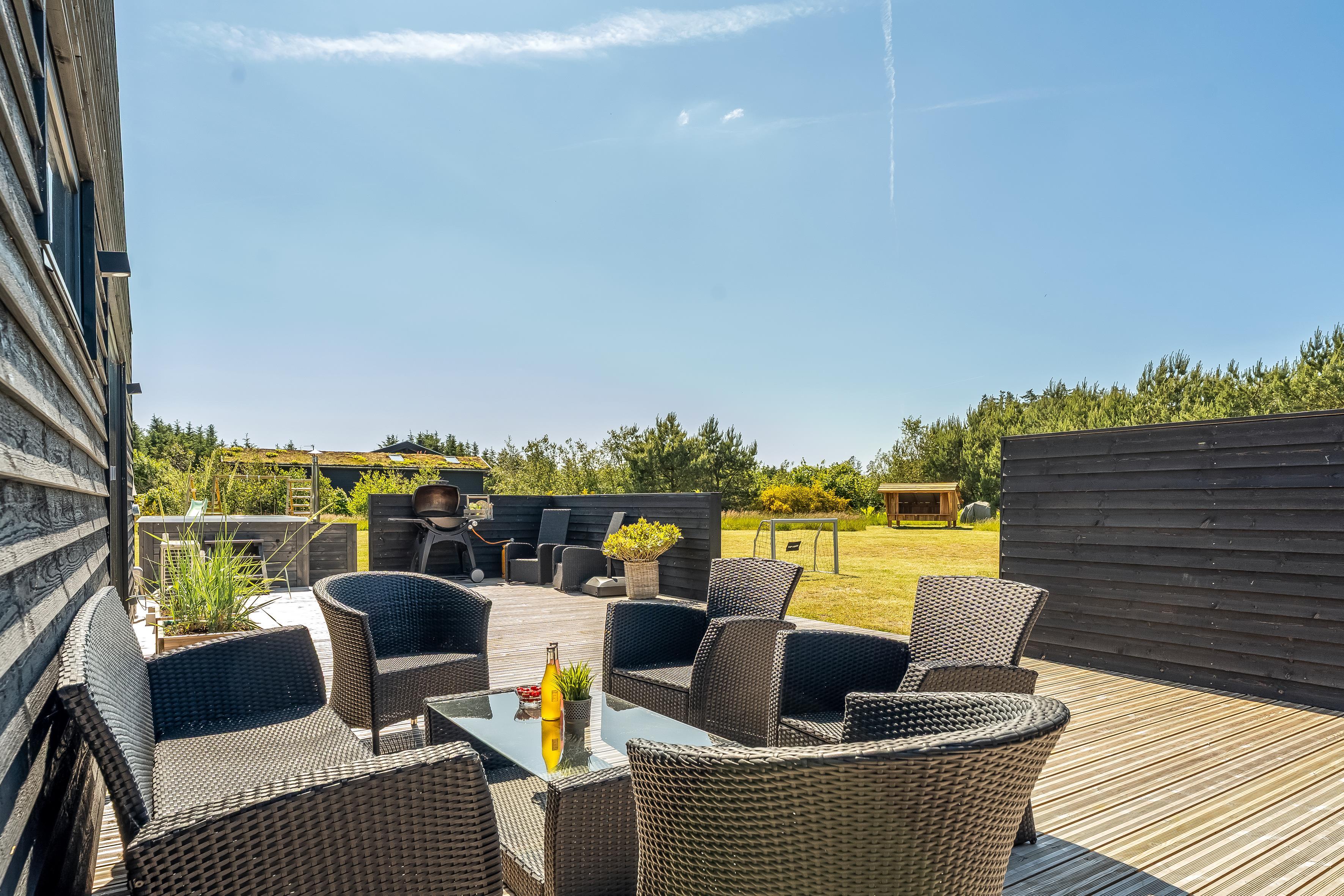 The outdoor area is just as inviting as the interior. Start your day with a cup of coffee on the large wooden terrace that wraps around multiple sides of the house, offering options for sun, shade, and shelter. Spend the day enjoying the view, sunbathing, or cooling off with a refreshing drink before firing up the grill for a cozy dinner under the open sky. There's a play tower, sandbox, and a shelter with 4 sleeping places, so if you're not out exploring attractions like Fårup Sommerland, the North Sea, or nearby holiday towns, there's plenty of fun to be had at home!