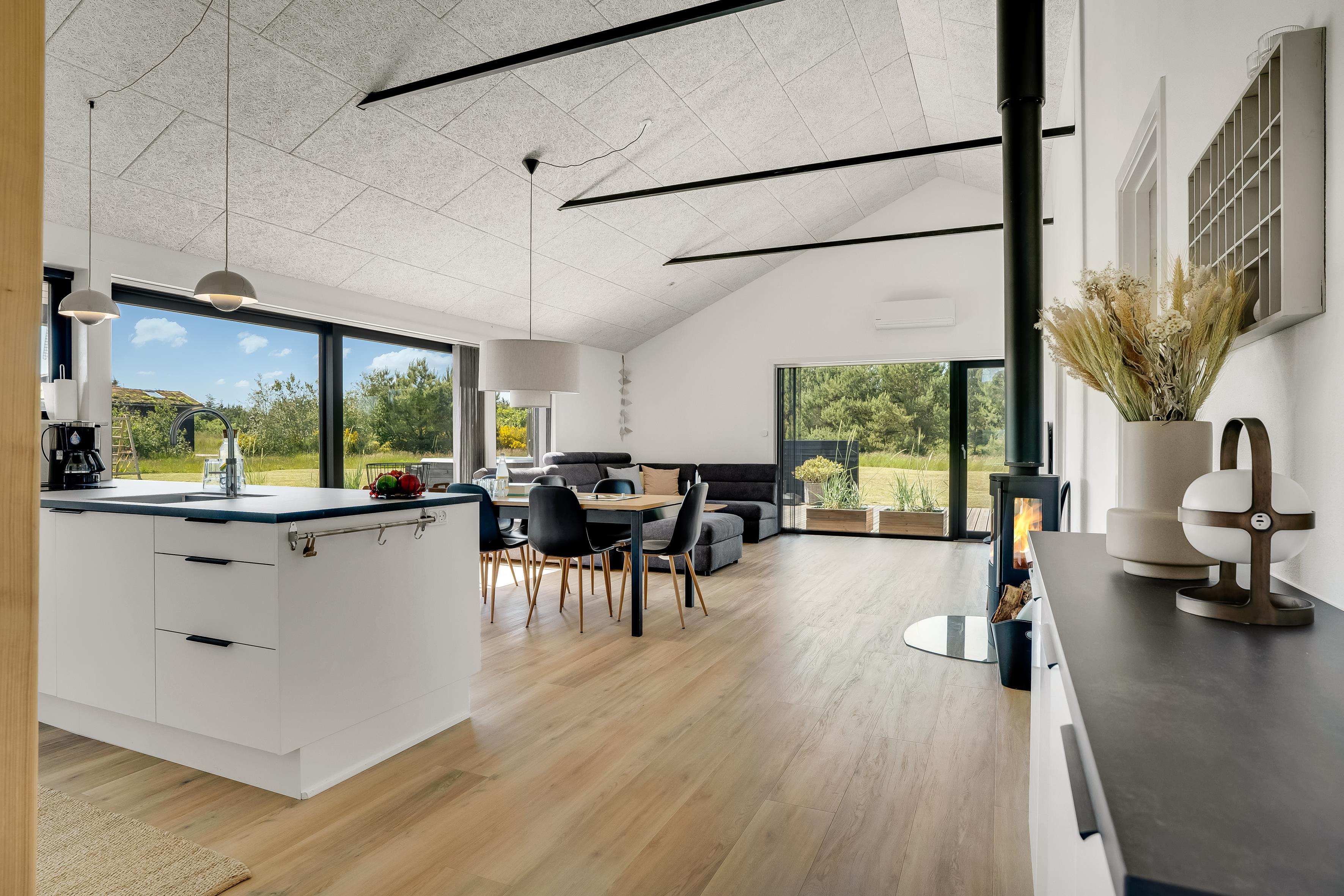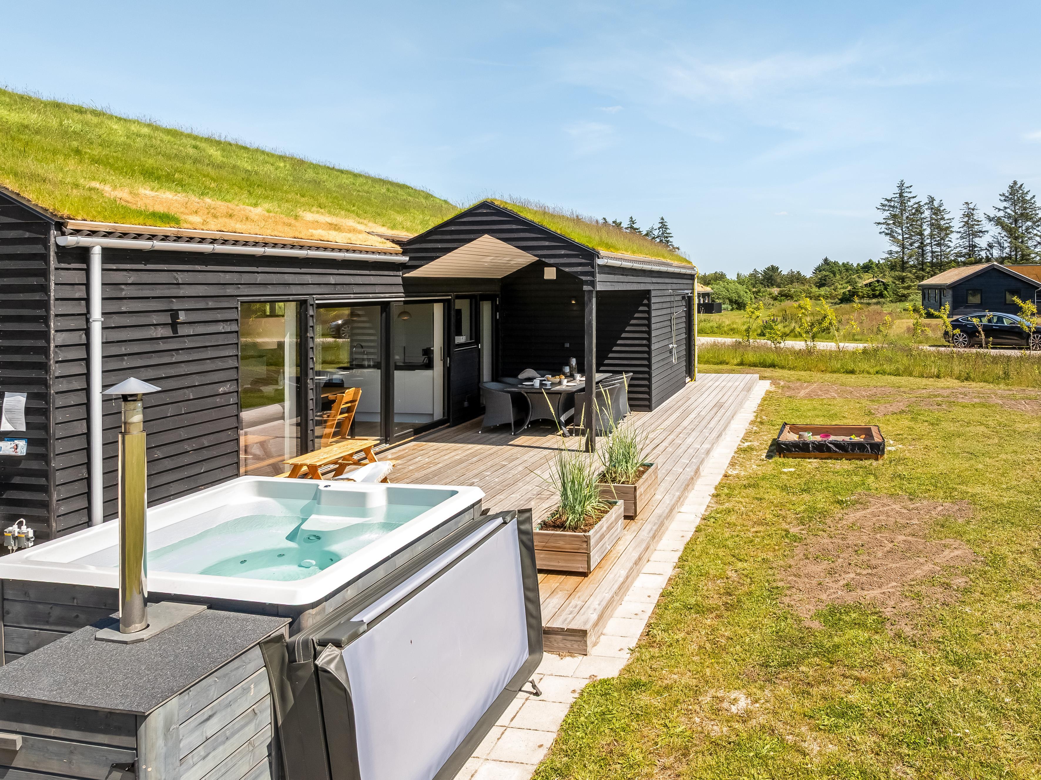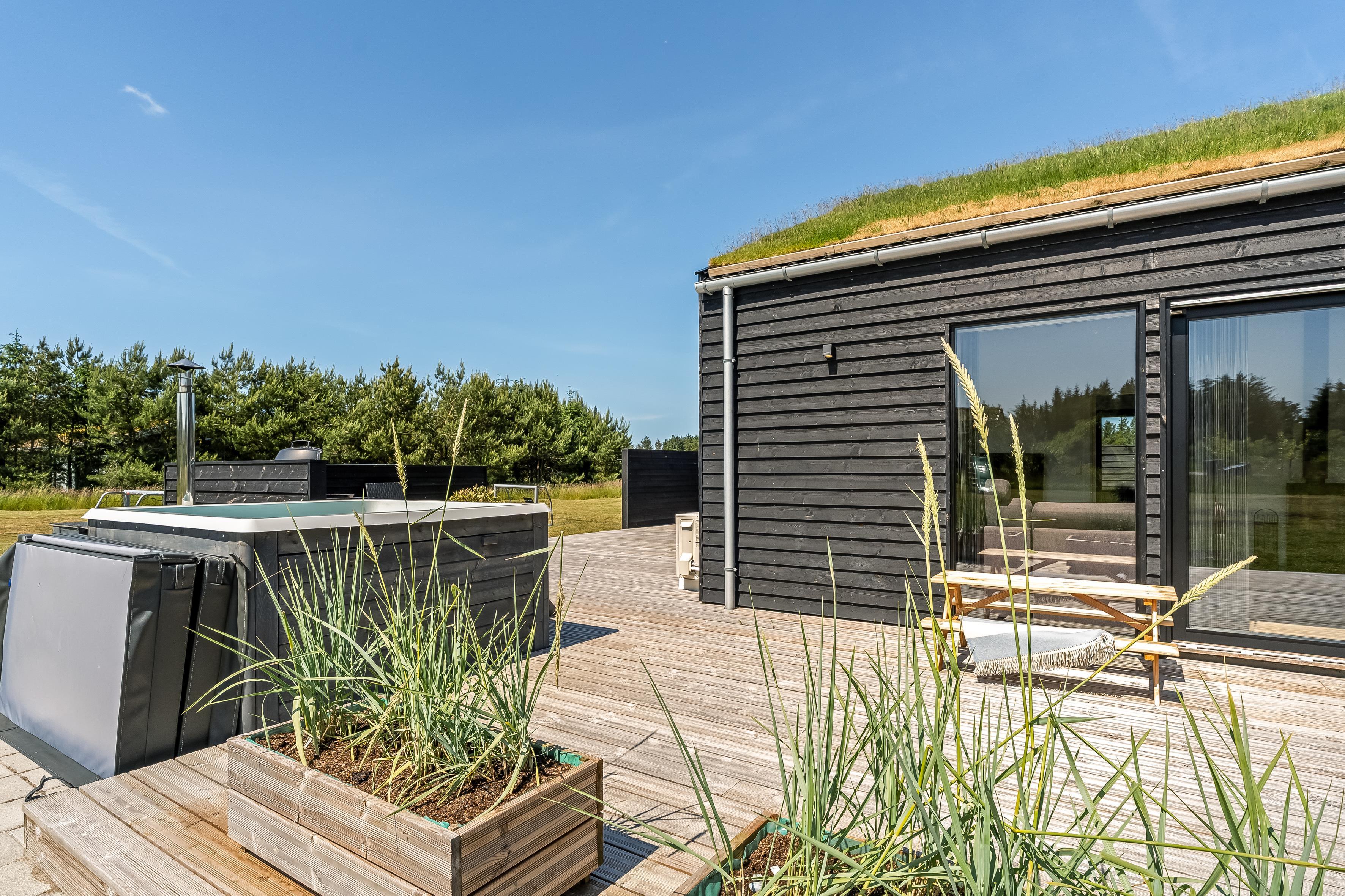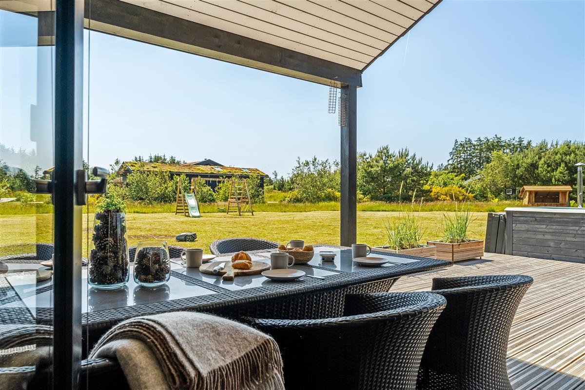 The outdoor area is just as inviting as the interior. Start your day with a cup of coffee on the large wooden terrace that wraps around multiple sides of the house, offering options for sun, shade, and shelter. Spend the day enjoying the view, sunbathing, or cooling off with a refreshing drink before firing up the grill for a cozy dinner under the open sky. There's a play tower, sandbox, and a shelter with 4 sleeping places, so if you're not out exploring attractions like Fårup Sommerland, the North Sea, or nearby holiday towns, there's plenty of fun to be had at home!