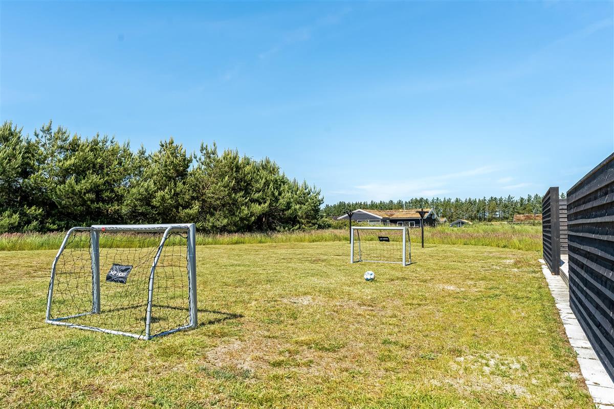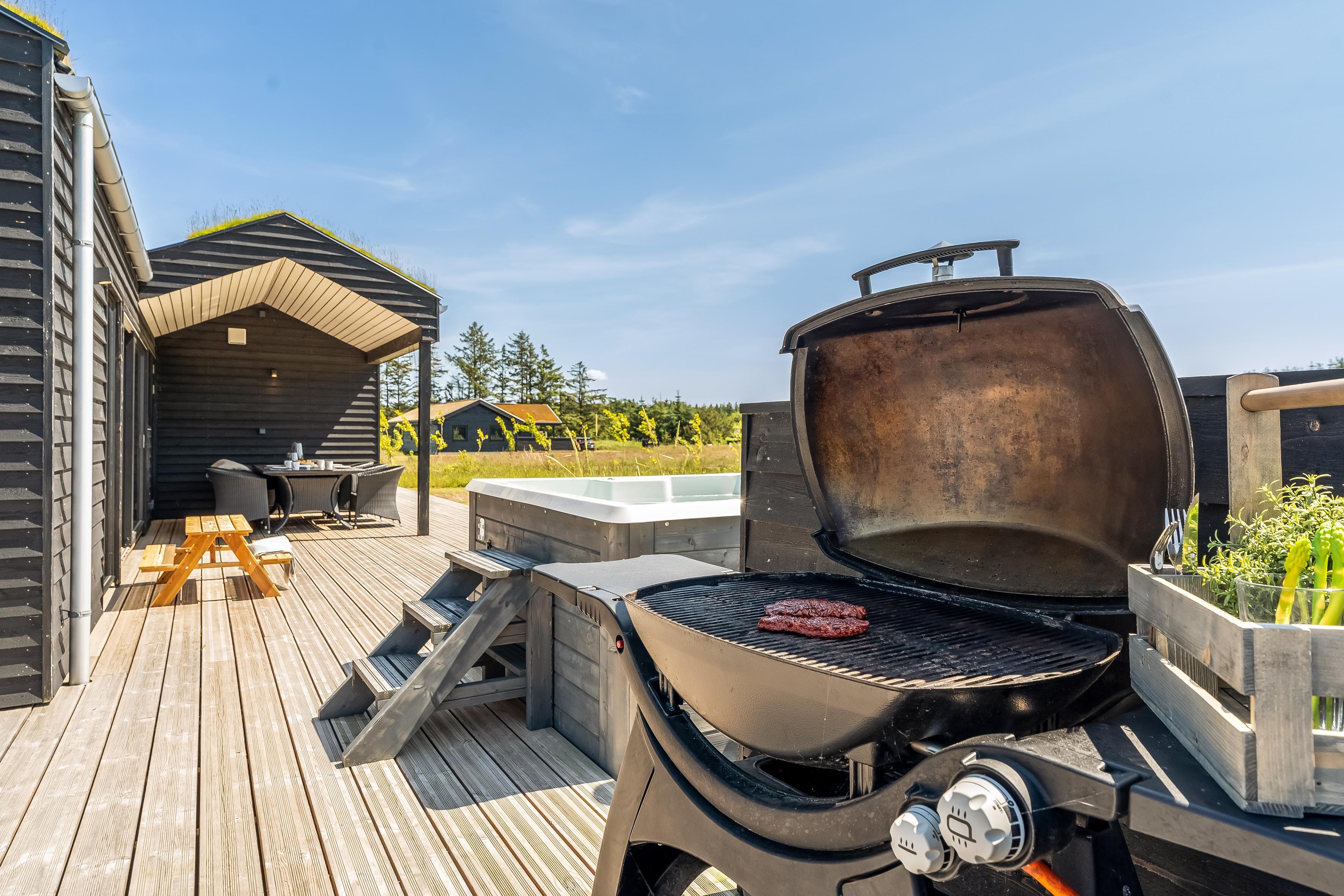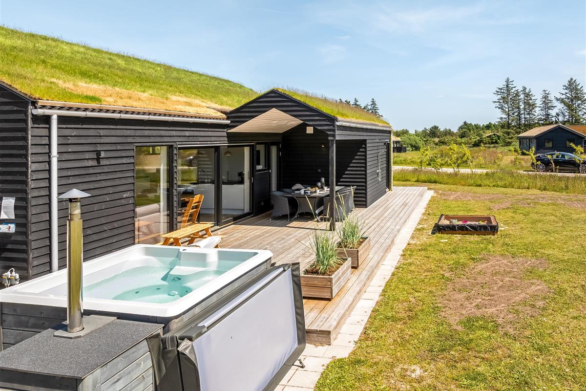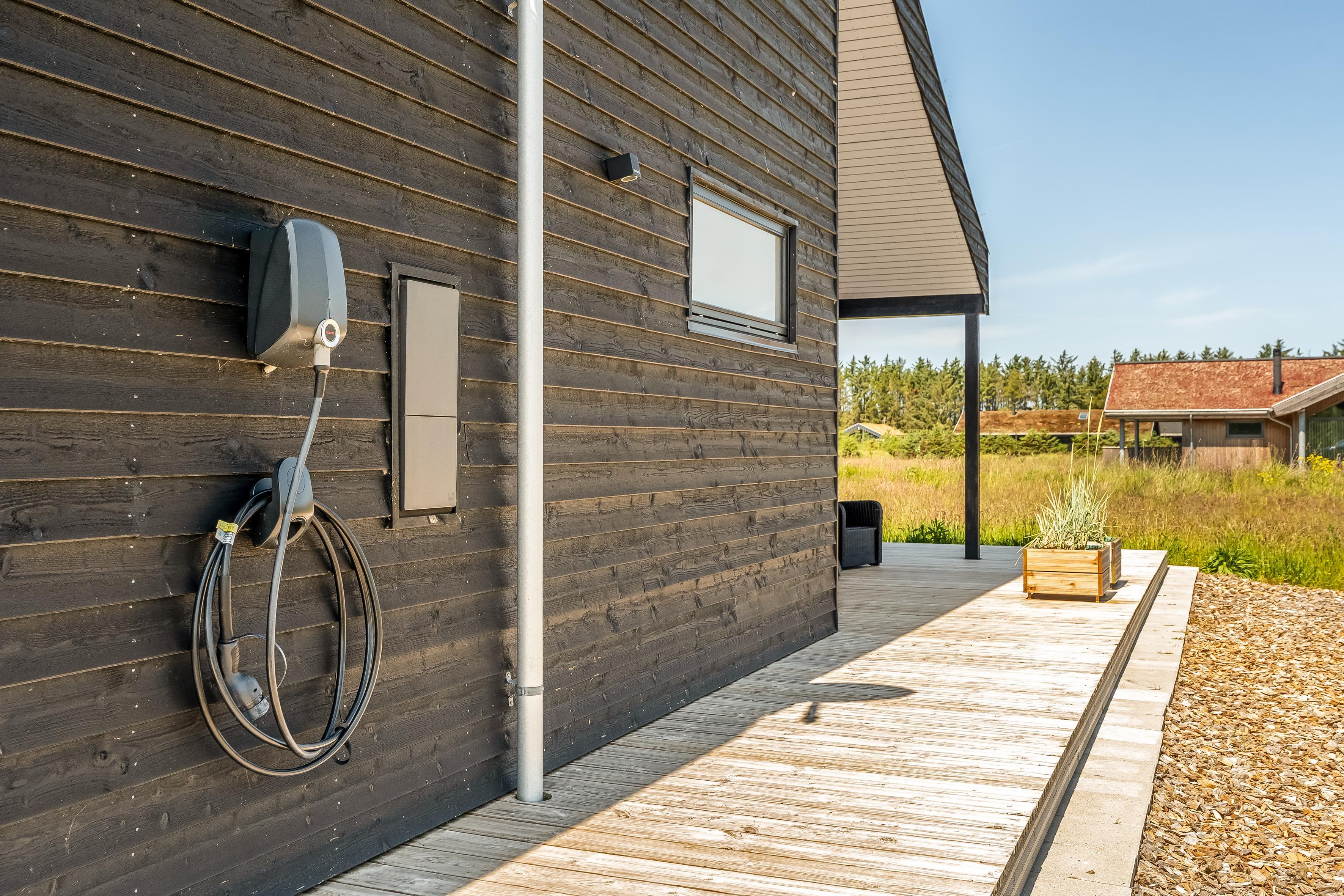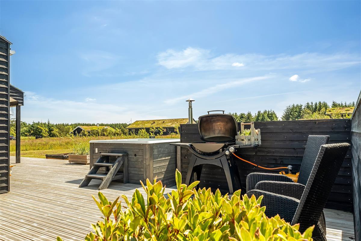 The outdoor area is just as inviting as the interior. Start your day with a cup of coffee on the large wooden terrace that wraps around multiple sides of the house, offering options for sun, shade, and shelter. Spend the day enjoying the view, sunbathing, or cooling off with a refreshing drink before firing up the grill for a cozy dinner under the open sky. There's a play tower, sandbox, and a shelter with 4 sleeping places, so if you're not out exploring attractions like Fårup Sommerland, the North Sea, or nearby holiday towns, there's plenty of fun to be had at home!