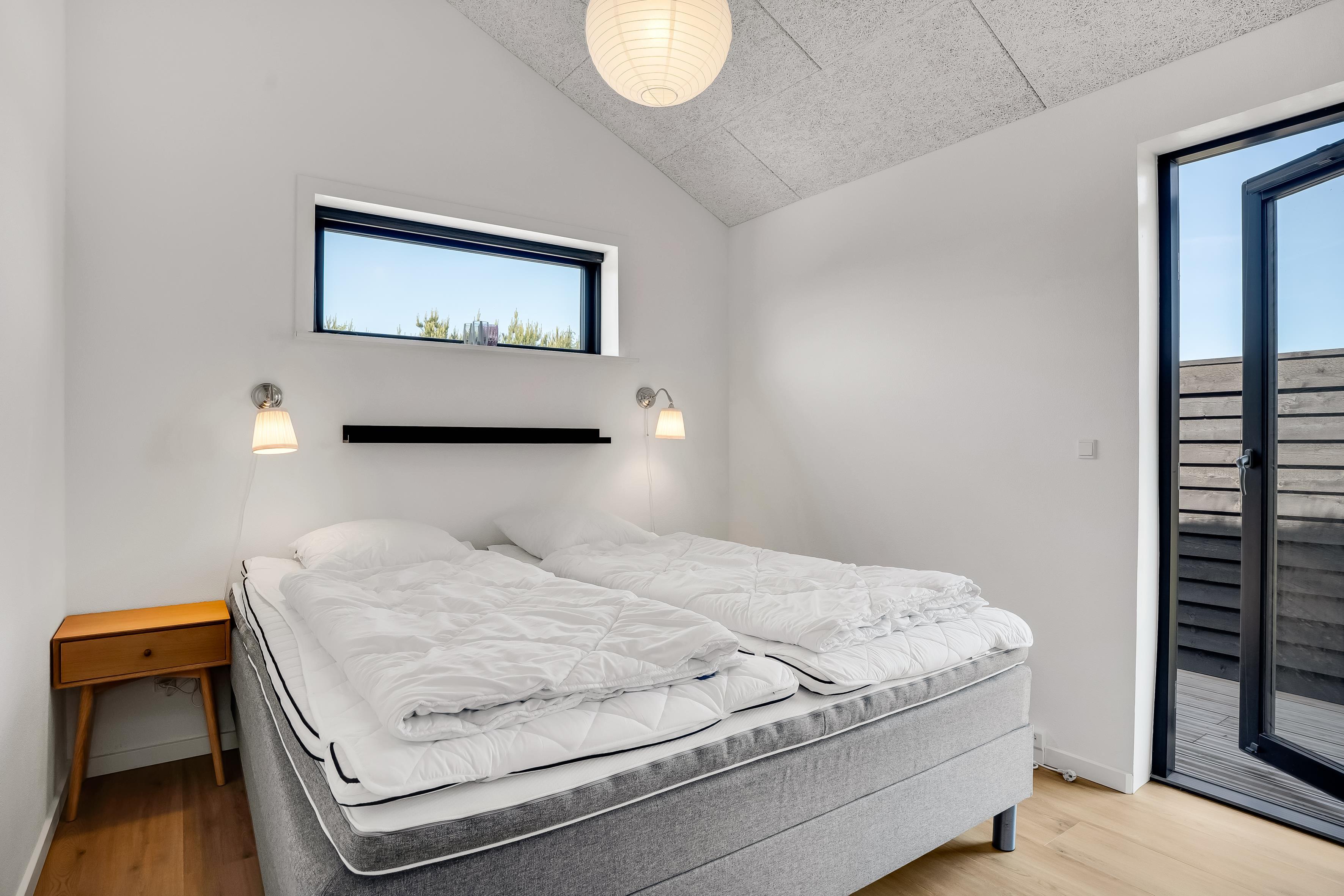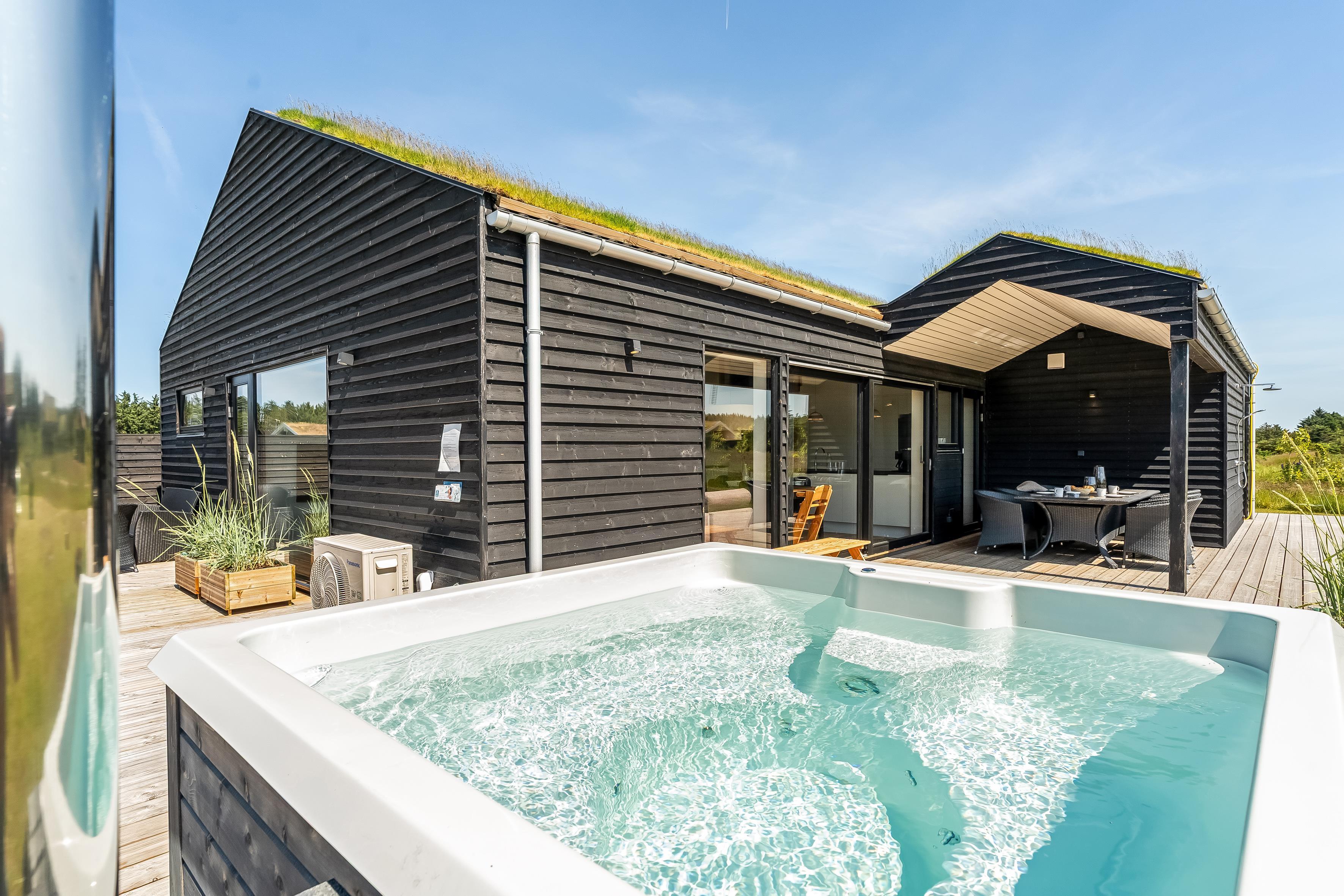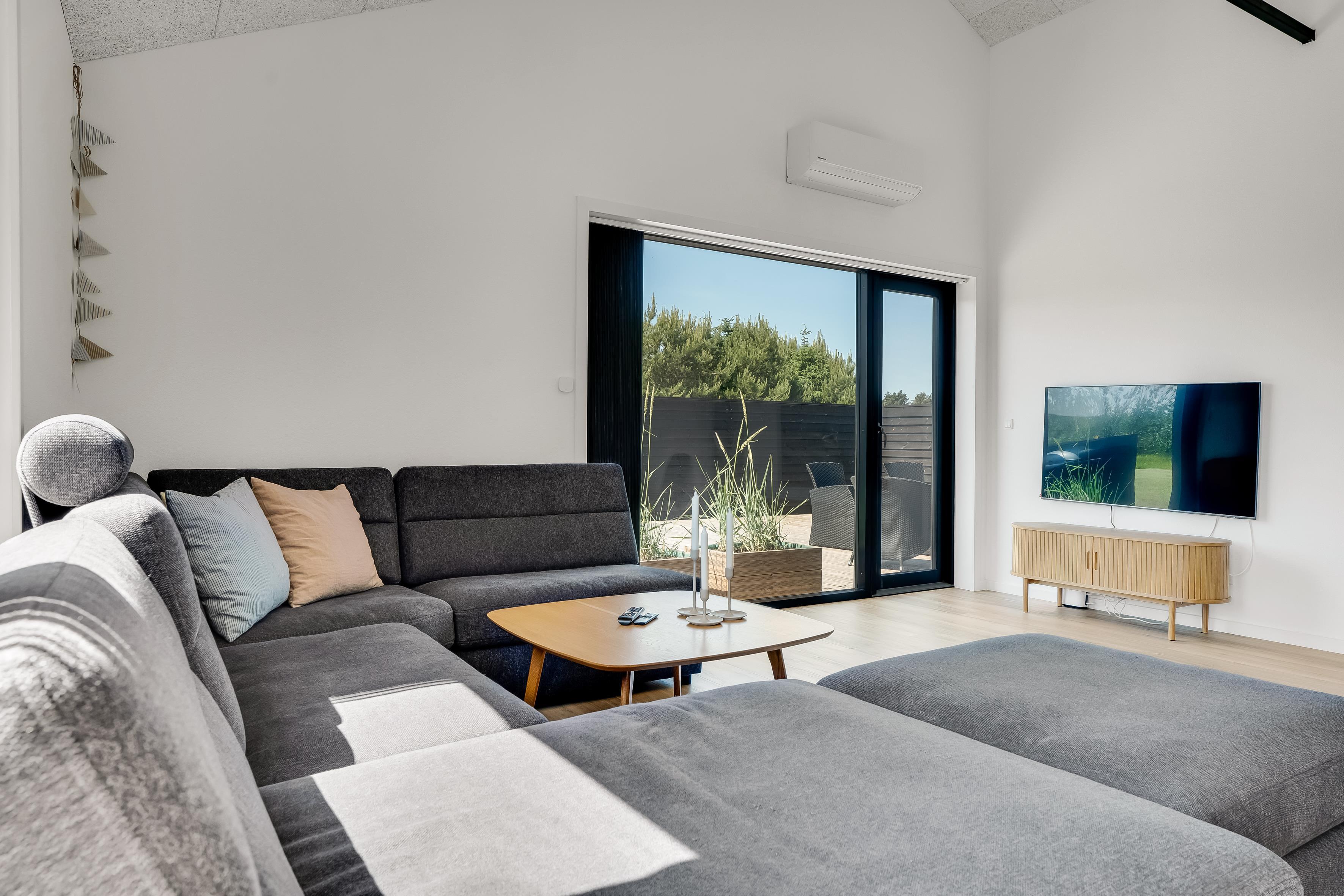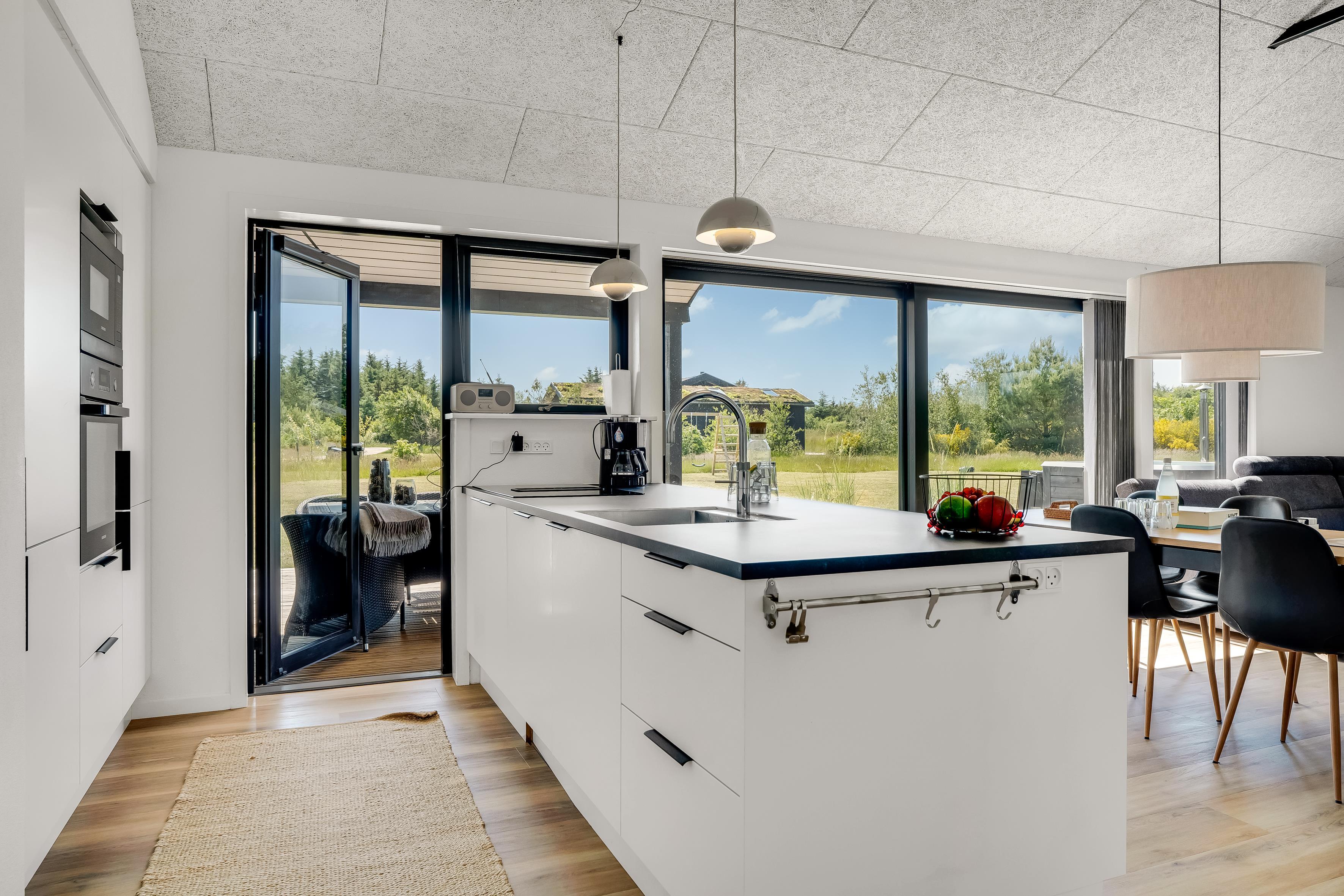 The outdoor area is just as inviting as the interior. Start your day with a cup of coffee on the large wooden terrace that wraps around multiple sides of the house, offering options for sun, shade, and shelter. Spend the day enjoying the view, sunbathing, or cooling off with a refreshing drink before firing up the grill for a cozy dinner under the open sky. There's a play tower, sandbox, and a shelter with 4 sleeping places, so if you're not out exploring attractions like Fårup Sommerland, the North Sea, or nearby holiday towns, there's plenty of fun to be had at home!