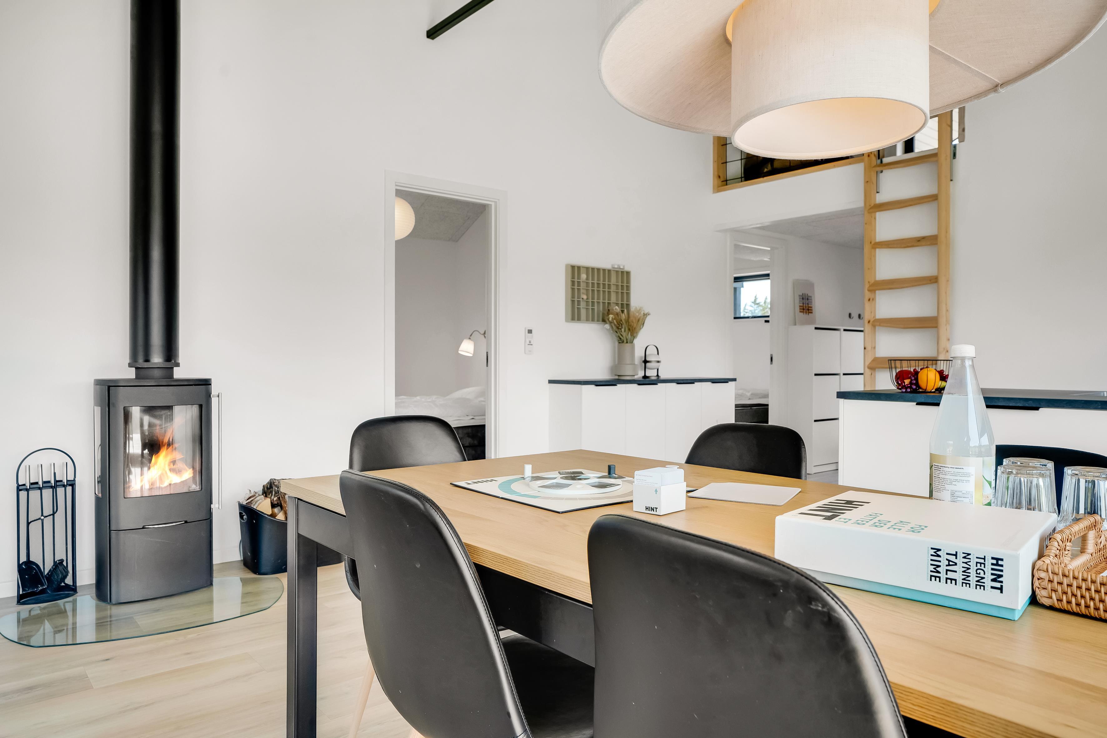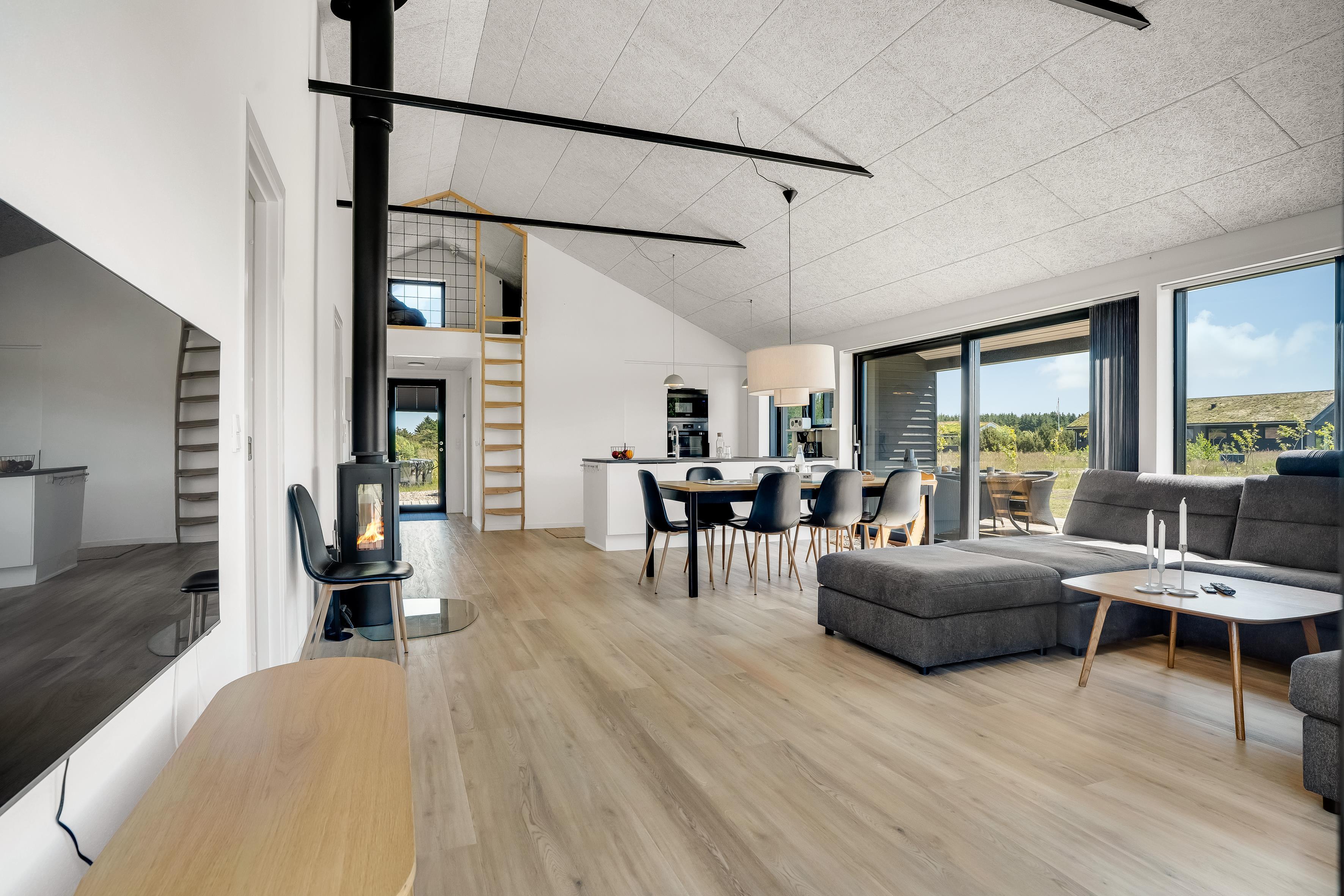 This newly built holiday home impresses with its stylish architecture, open floor plan, and large windows that allow plenty of natural light. Enjoy high comfort with well-chosen amenities such as a wellness area featuring an indoor sauna, spa bath, and a luxurious outdoor hot tub. Every detail has been carefully considered to cater to both discerning adults and families with children. Notably, the loft serves as a youth area and lounge with bean bags and a TV—perfect for hours of entertainment—while you relax by the wood-burning stove and appreciate the tranquility and quality of the house.