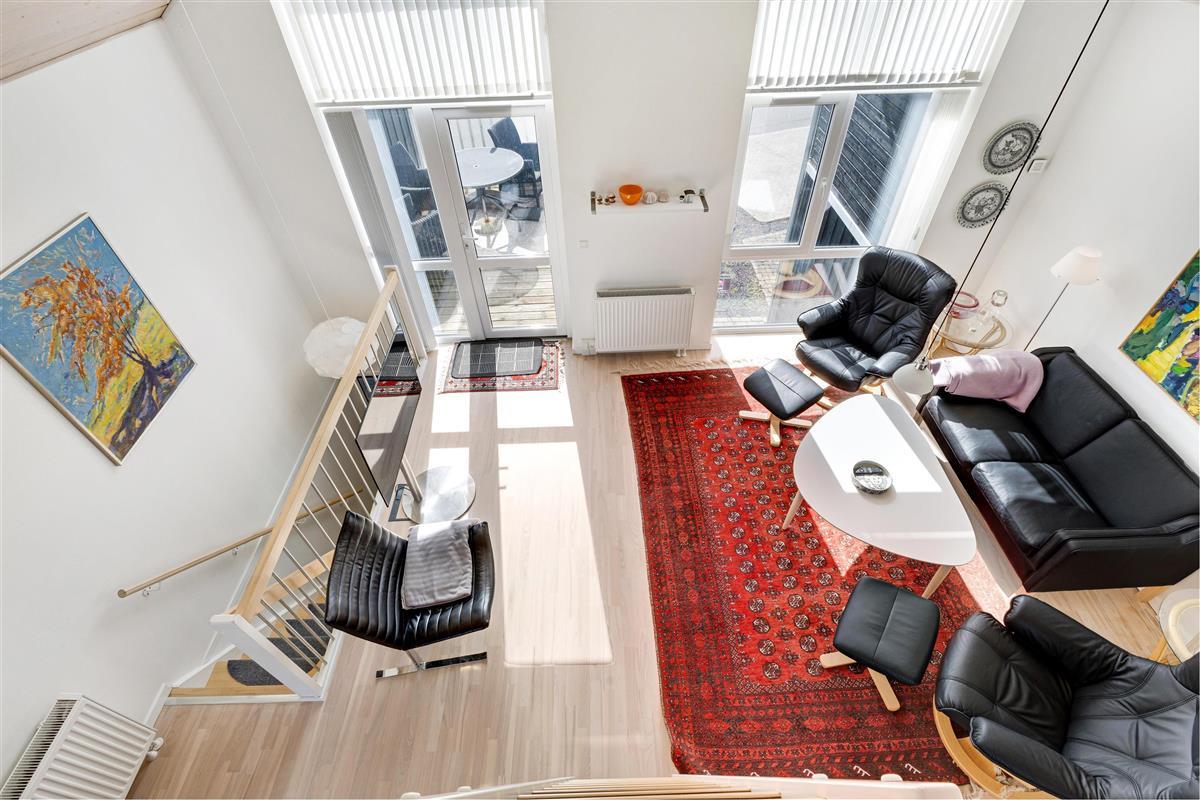 On the ground floor of the cottage, you enter a bright and airy hallway with stairs leading up to the first floor. There are three bedrooms and a bathroom on the ground floor. The first floor consists of a large, bright, and very stylish kitchen/dining area and a living room with access to a lovely terrace on one side and a view of the golf course and Åsendrup Banesti on the other side. From the kitchen, you can access the large and cozy loft, where there is room for two extra beds. The first floor of the house is impressive with high ceilings and a beautiful view.