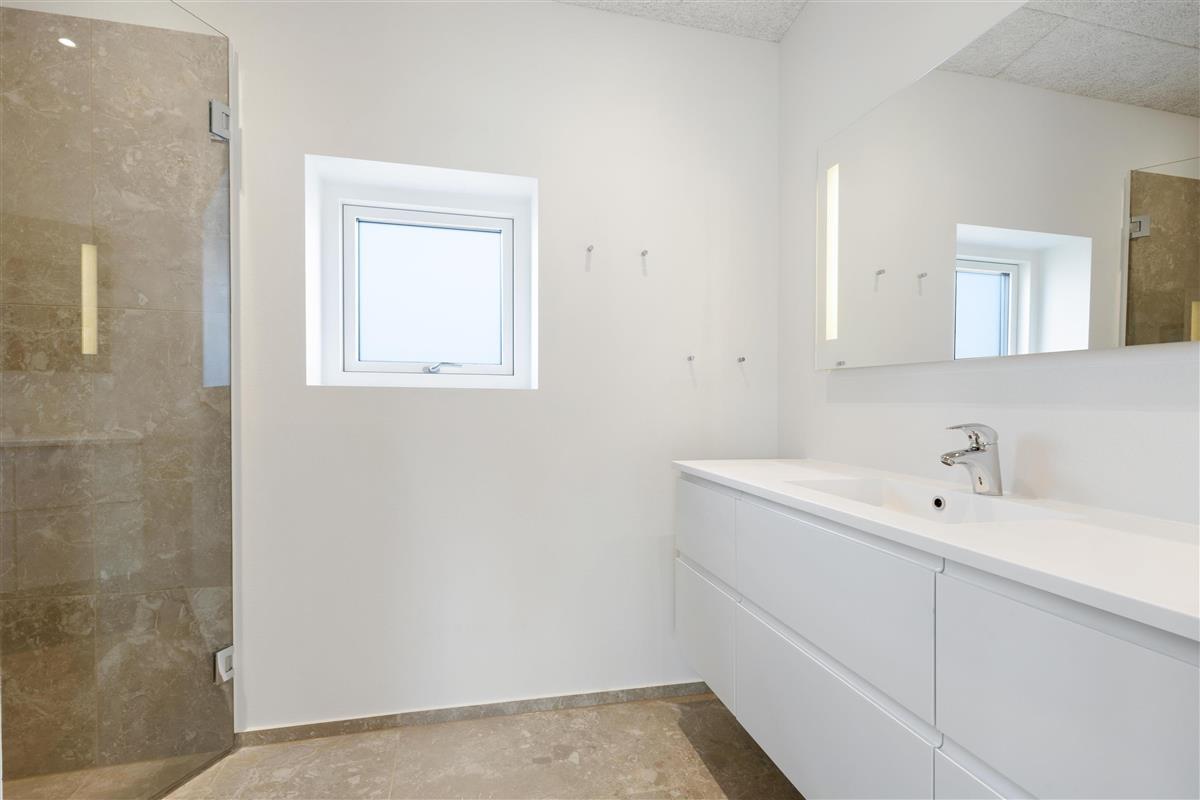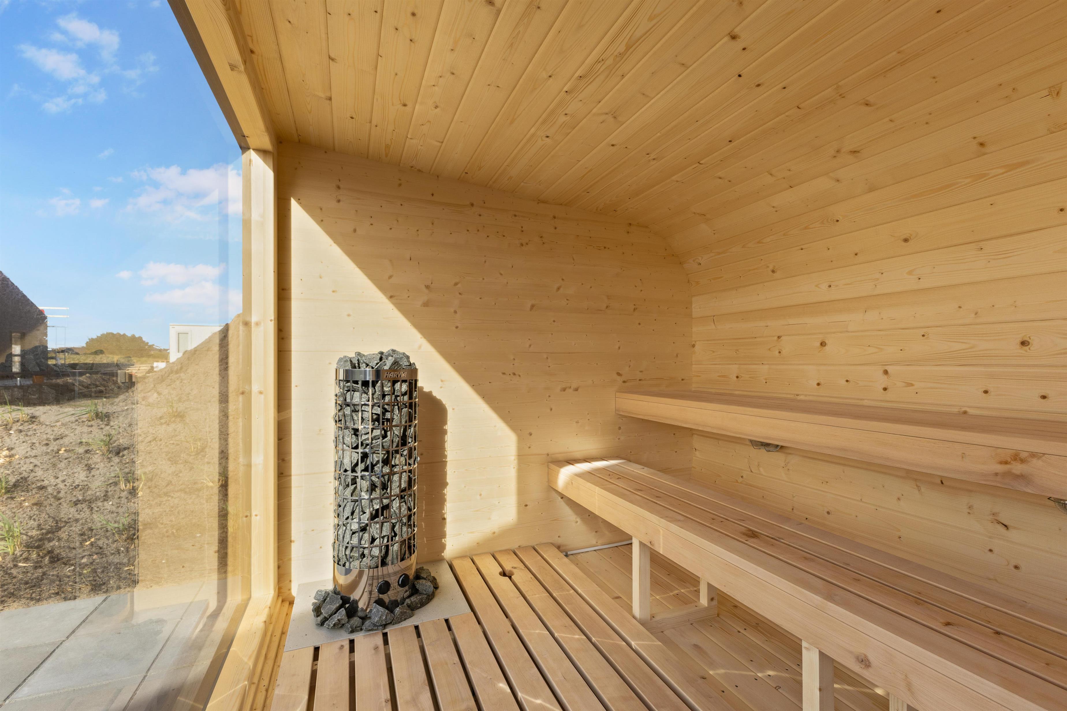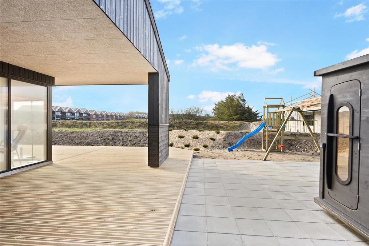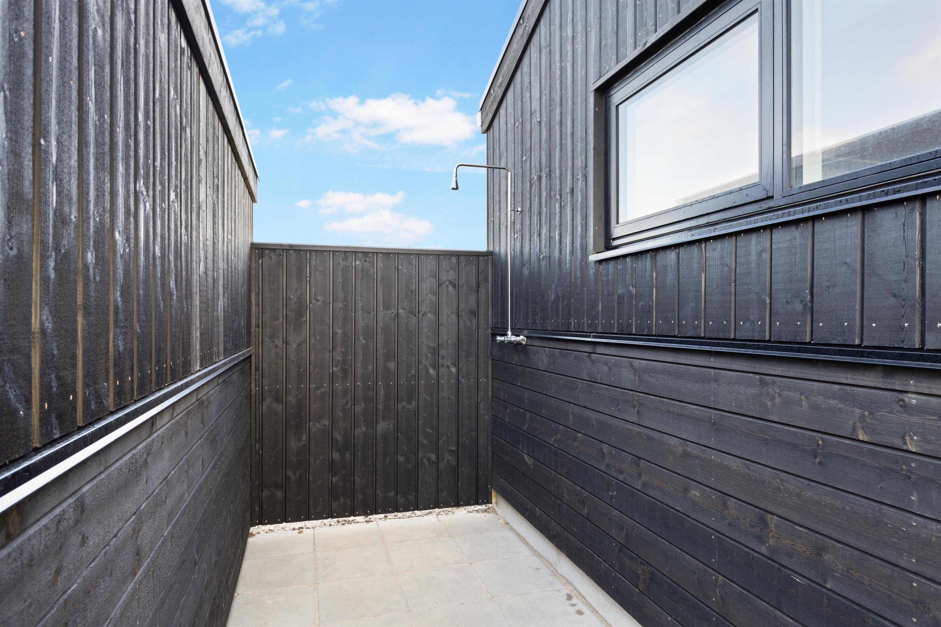 Here, you'll find plenty of terrace space for sunbathing and more. There's also a lovely outdoor shower that makes all the difference in the summer. There's room for the same number of dining guests as there is inside, and plenty of opportunity to find a sunny spot when summer is at its most beautiful. There is walking distance to the water and the town, and within a kilometer, you'll find a fitness center, padel tennis, a swimming pool, beautiful nature, and more!