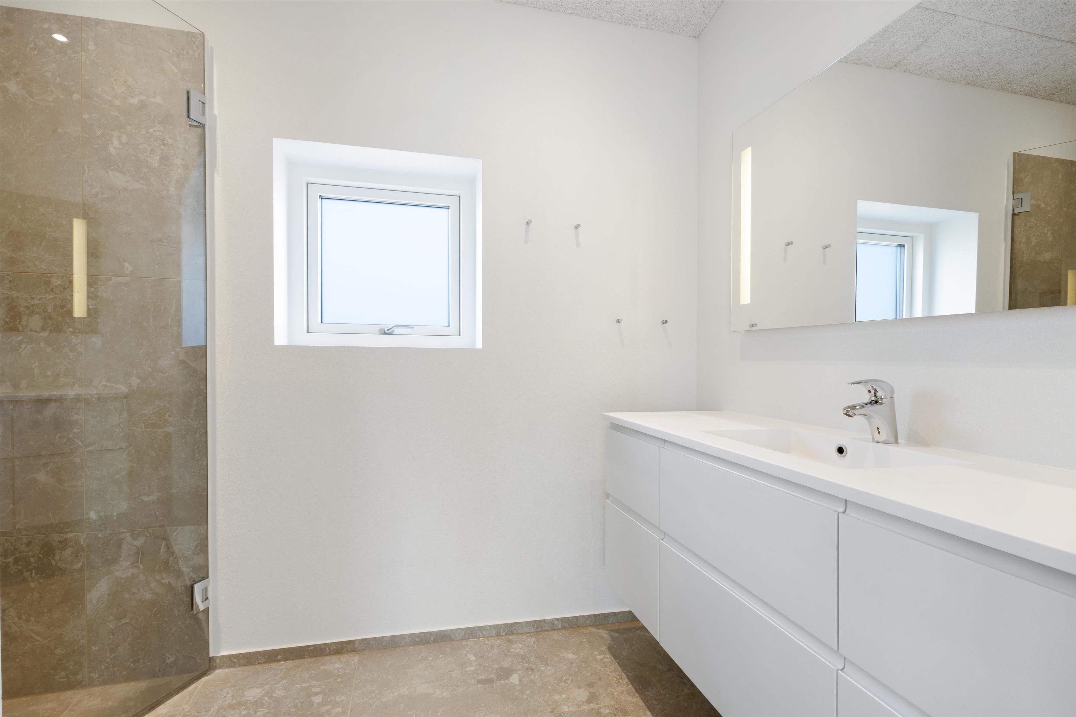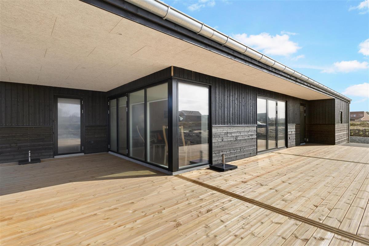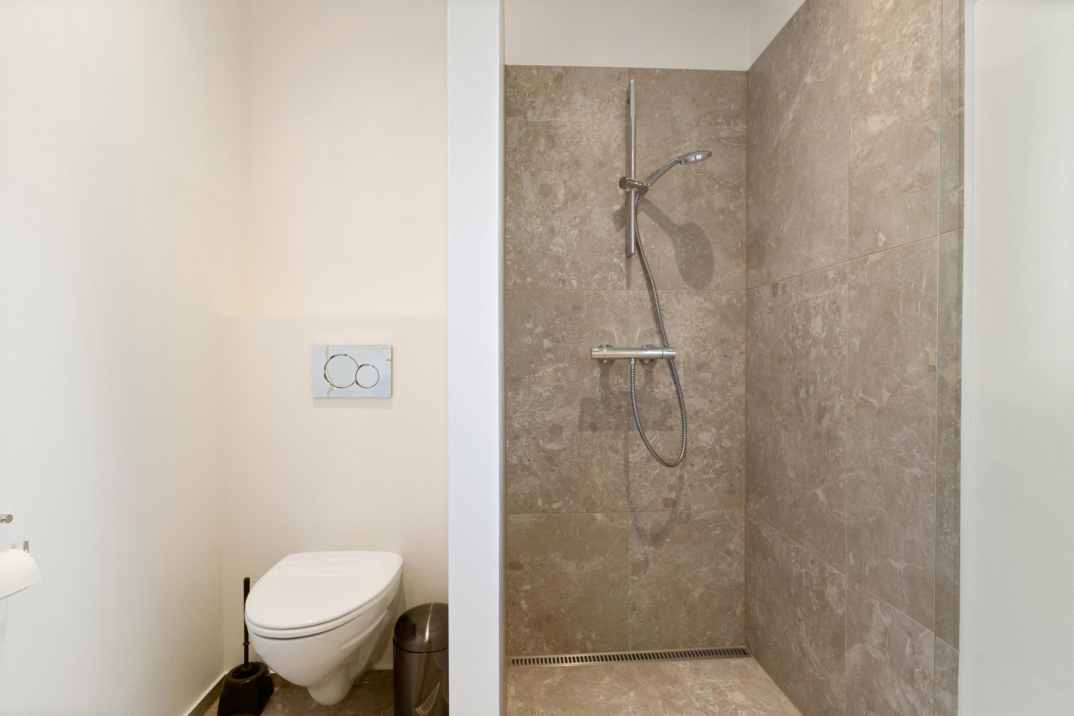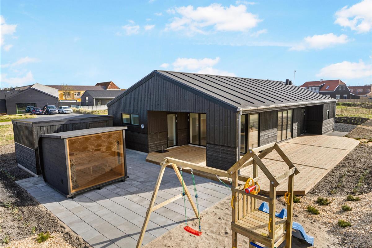 Here, you'll find plenty of terrace space for sunbathing and more. There's also a lovely outdoor shower that makes all the difference in the summer. There's room for the same number of dining guests as there is inside, and plenty of opportunity to find a sunny spot when summer is at its most beautiful. There is walking distance to the water and the town, and within a kilometer, you'll find a fitness center, padel tennis, a swimming pool, beautiful nature, and more!