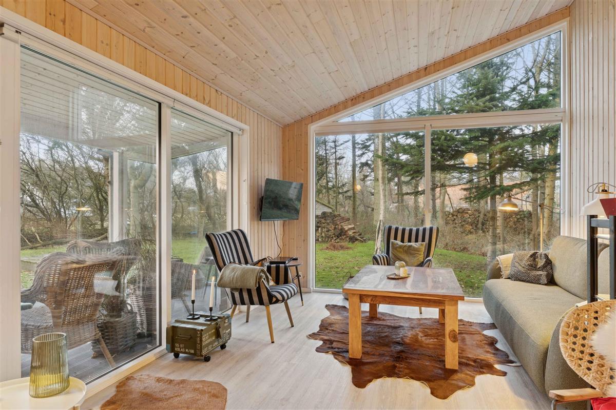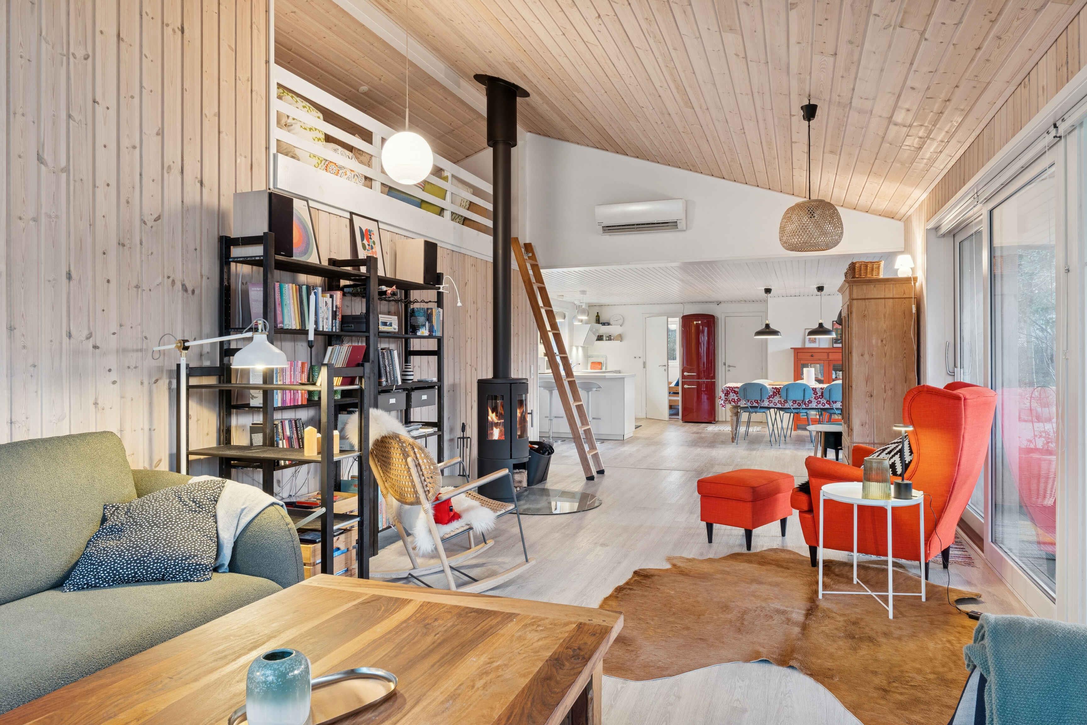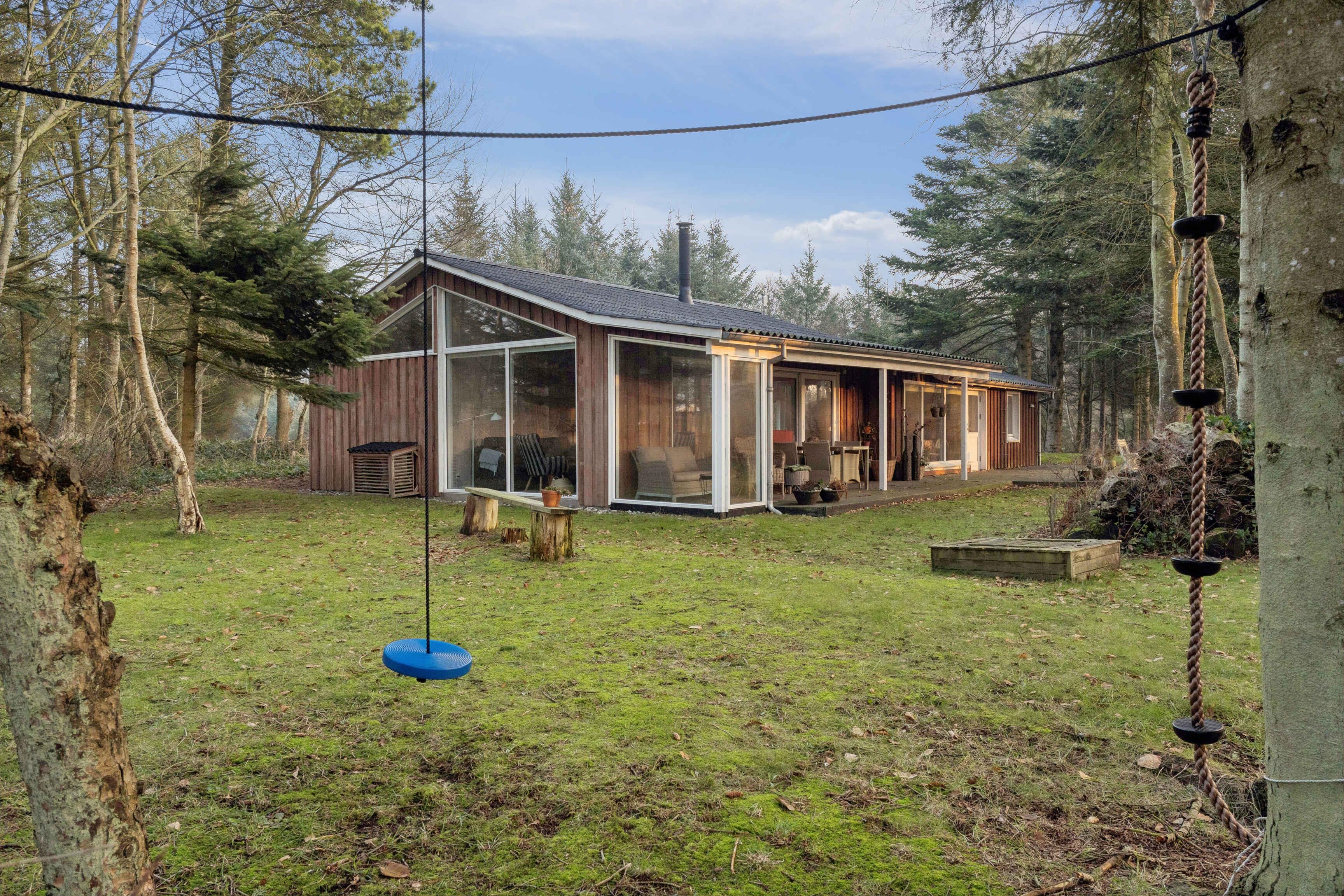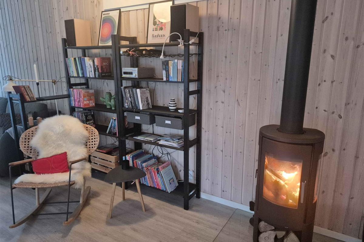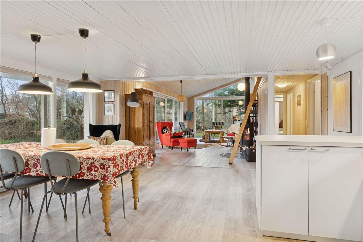Gezellig vakantiehuis nabij Løkken op een perceel met gras en bos. Het heeft 3 slaapkamers en een gezellig keuken/woonruimte in open verbinding met een sfeervolle woonkamer met houtkachel en veel licht. Daarnaast bijkeuken en 2 badkamers.