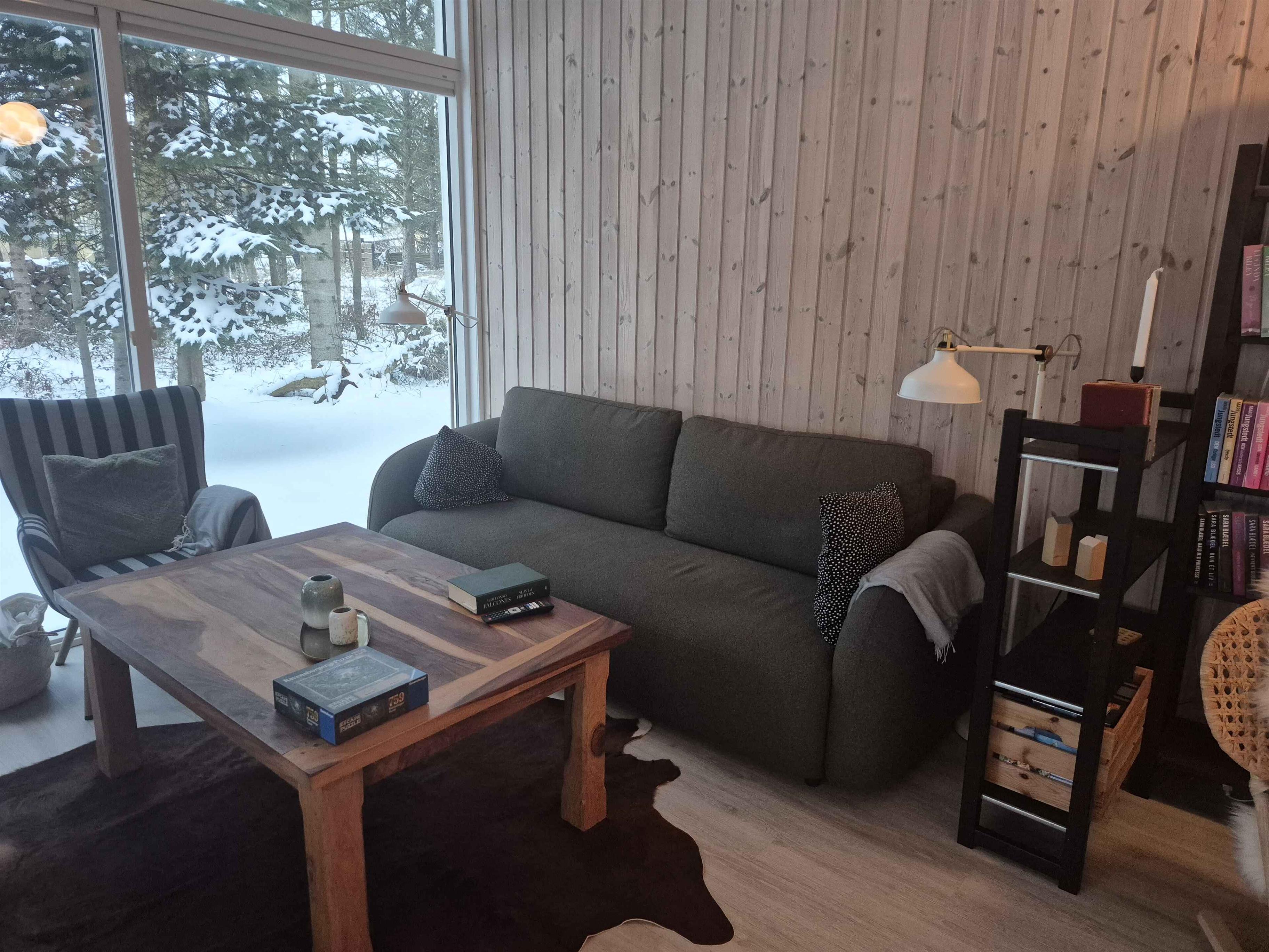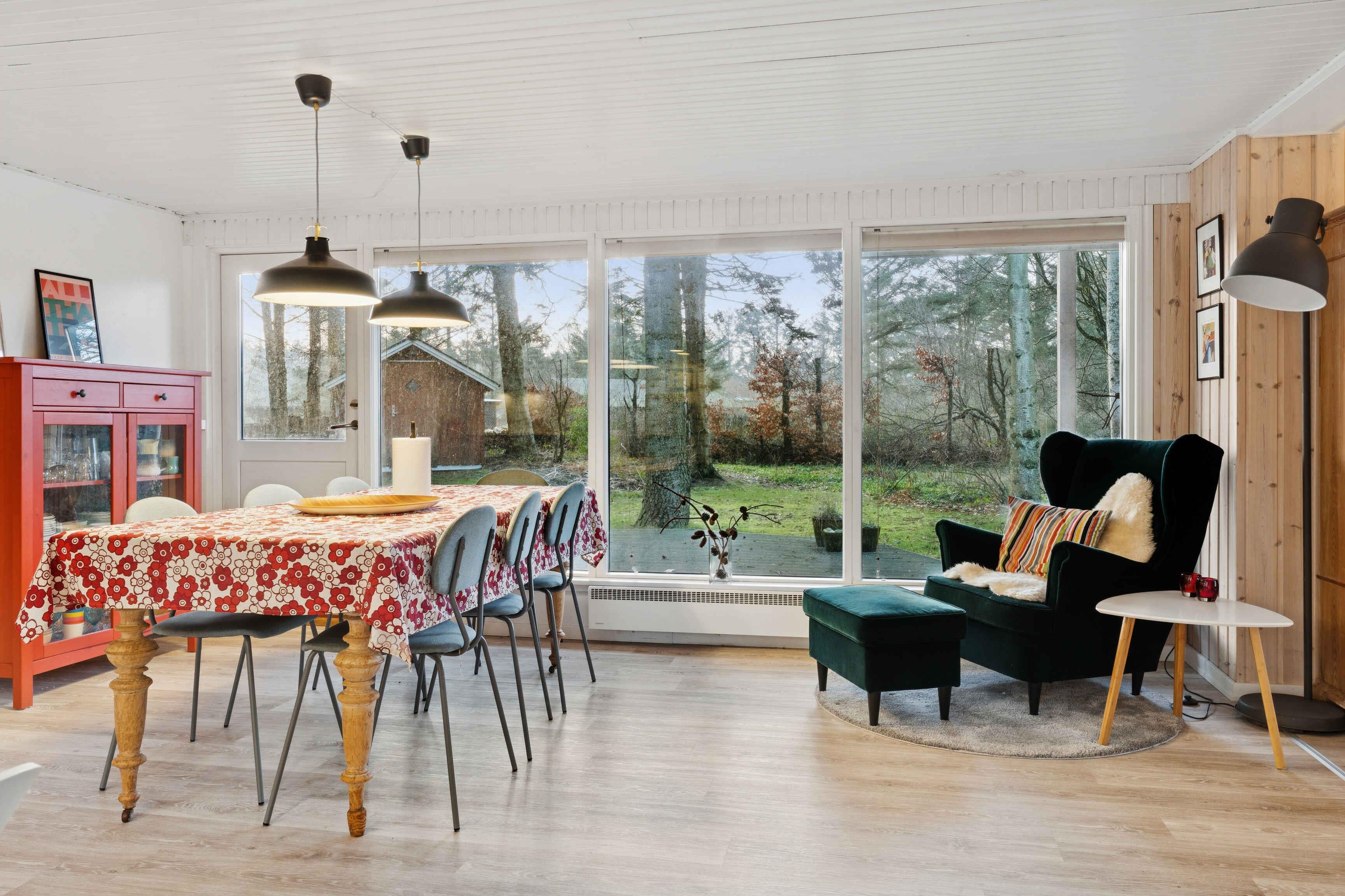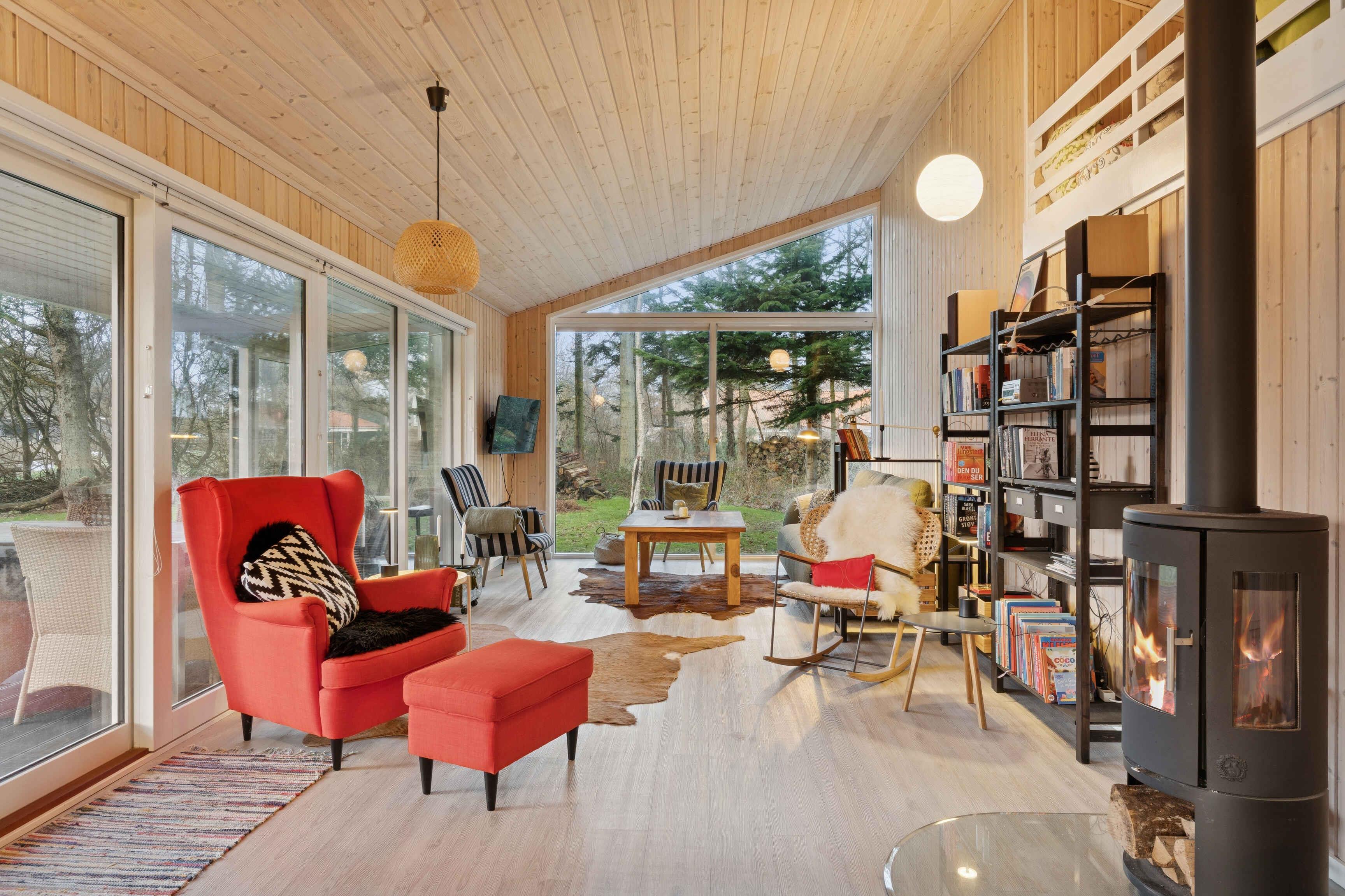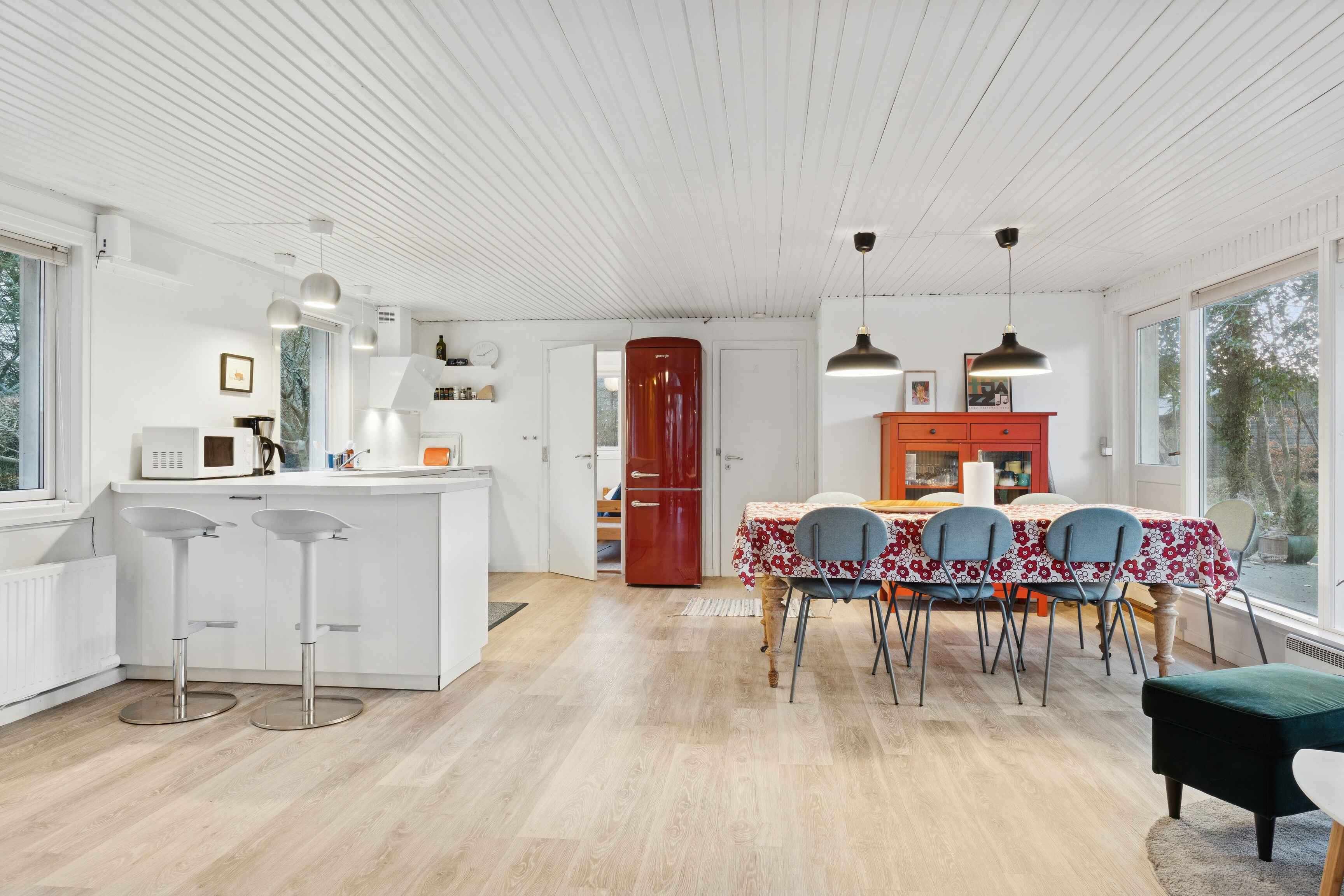Gezellig vakantiehuis nabij Løkken op een perceel met gras en bos. Het heeft 3 slaapkamers en een gezellig keuken/woonruimte in open verbinding met een sfeervolle woonkamer met houtkachel en veel licht. Daarnaast bijkeuken en 2 badkamers.