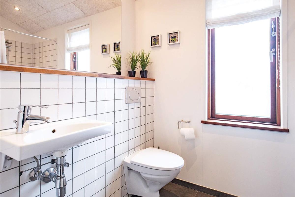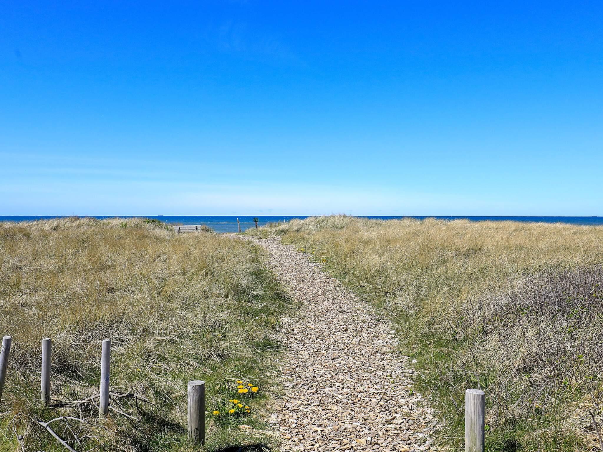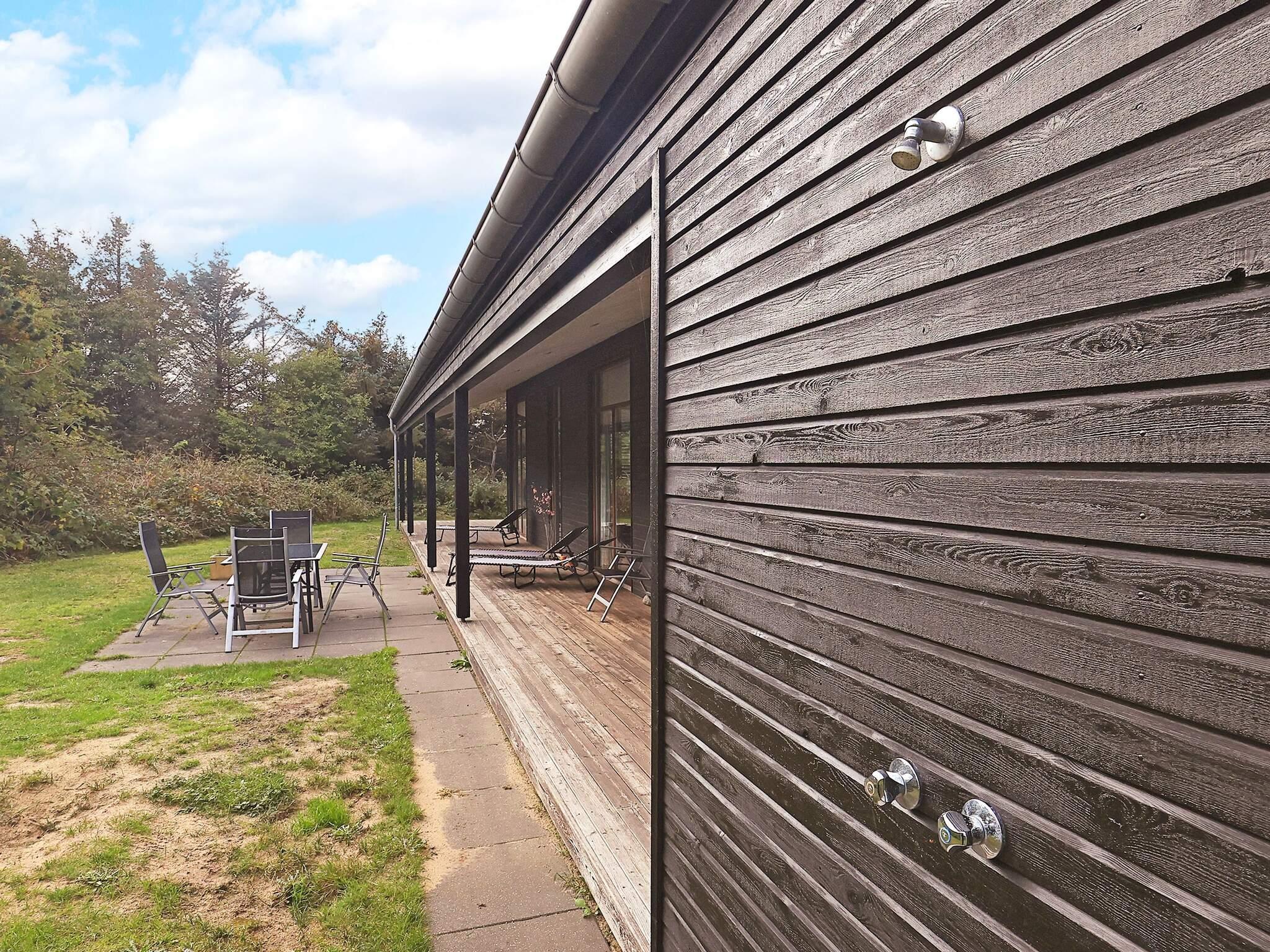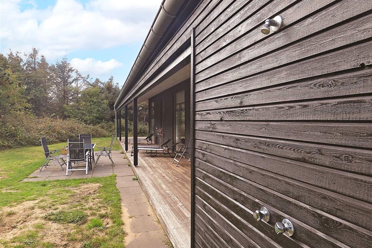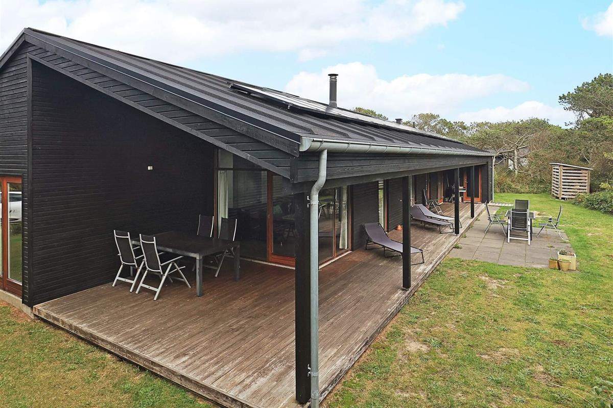 Vom Wohnzimmer und der Küche aus haben Sie direkten Zugang zu einer überdachten sowie einer offenen Terrasse und einer Außendusche – ideal nach einem Tag am Strand. Das Ferienhaus wird mit einer energiesparenden Luft-Wasser-Wärmepumpe beheizt, die im gesamten Haus für angenehme Fußbodenheizung sorgt.