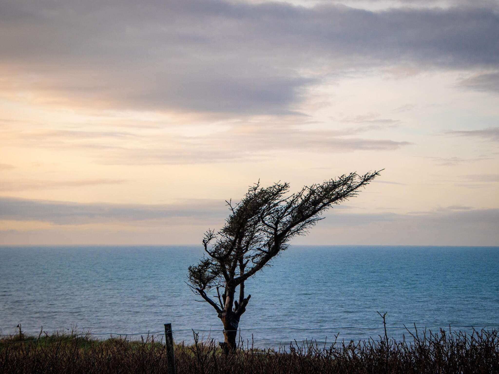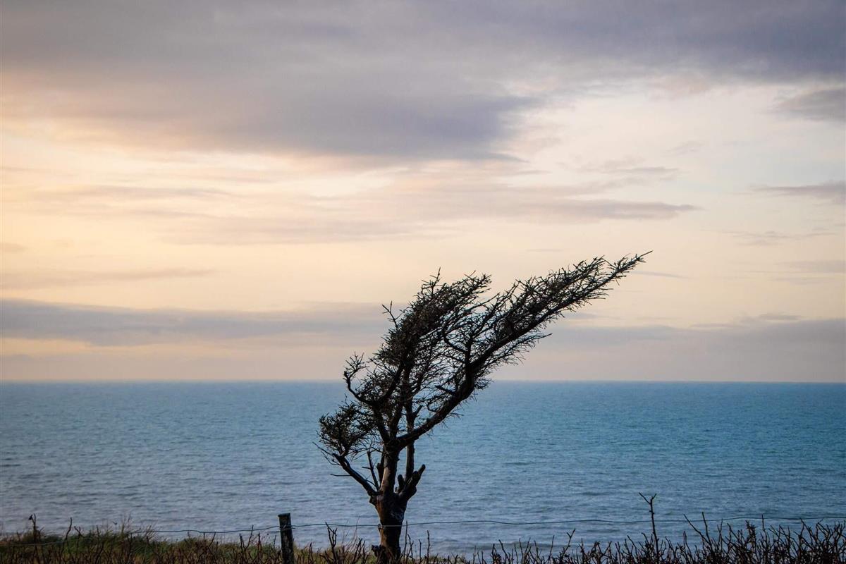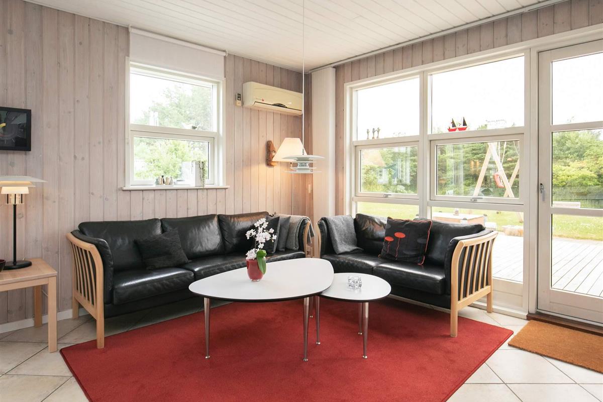 Vom Wohnbereich aus hat man direkten Zugang zur Terrassenfläche davor und weiter zum Naturgrundstück mit Rasenfläche und Bäumen ringsum. Dort stehen für Kinder Schaukel und Sandkasten bereit. Über kleine Trampelpfade gelangt man schnell an die nahe Küste.