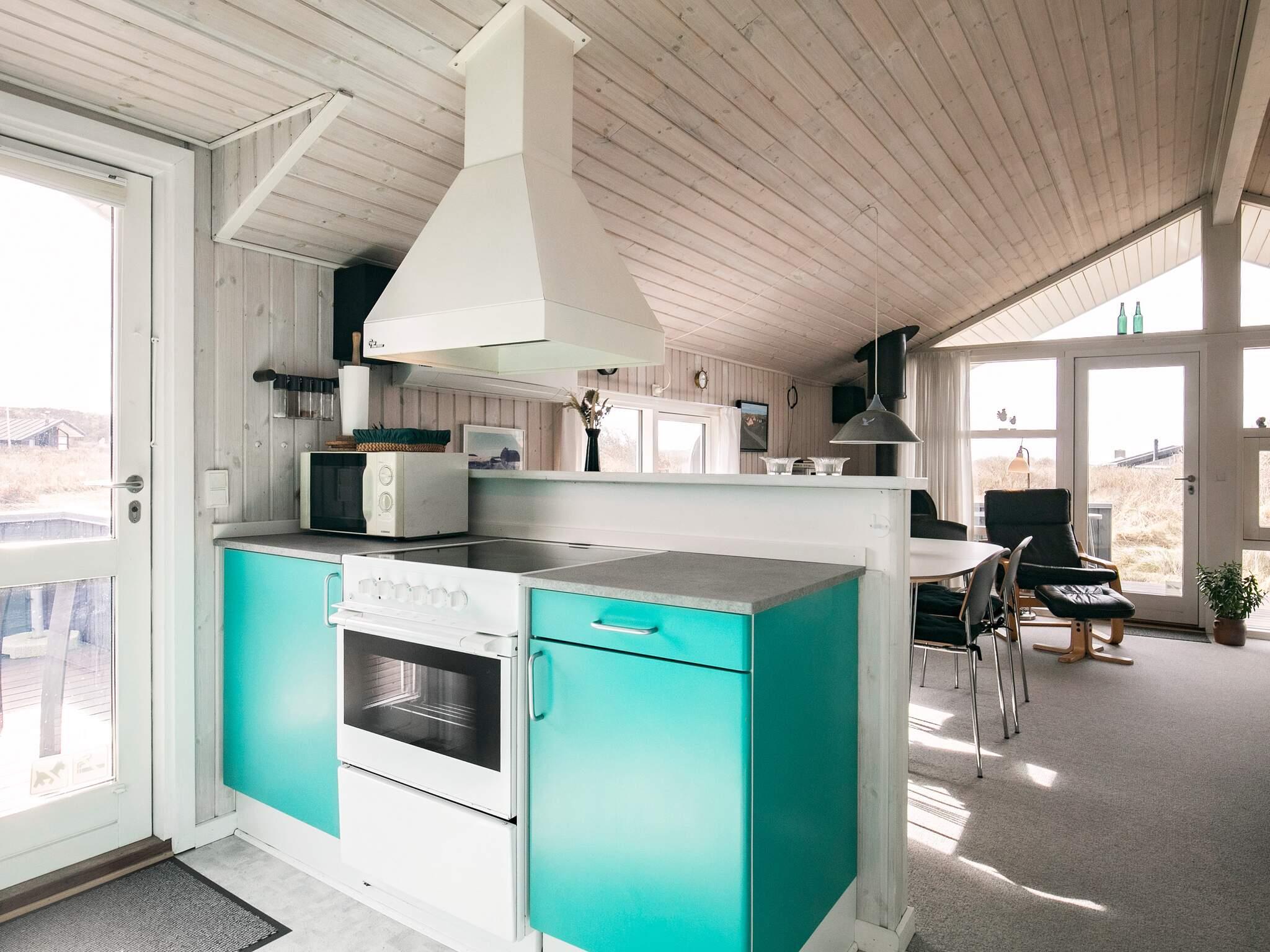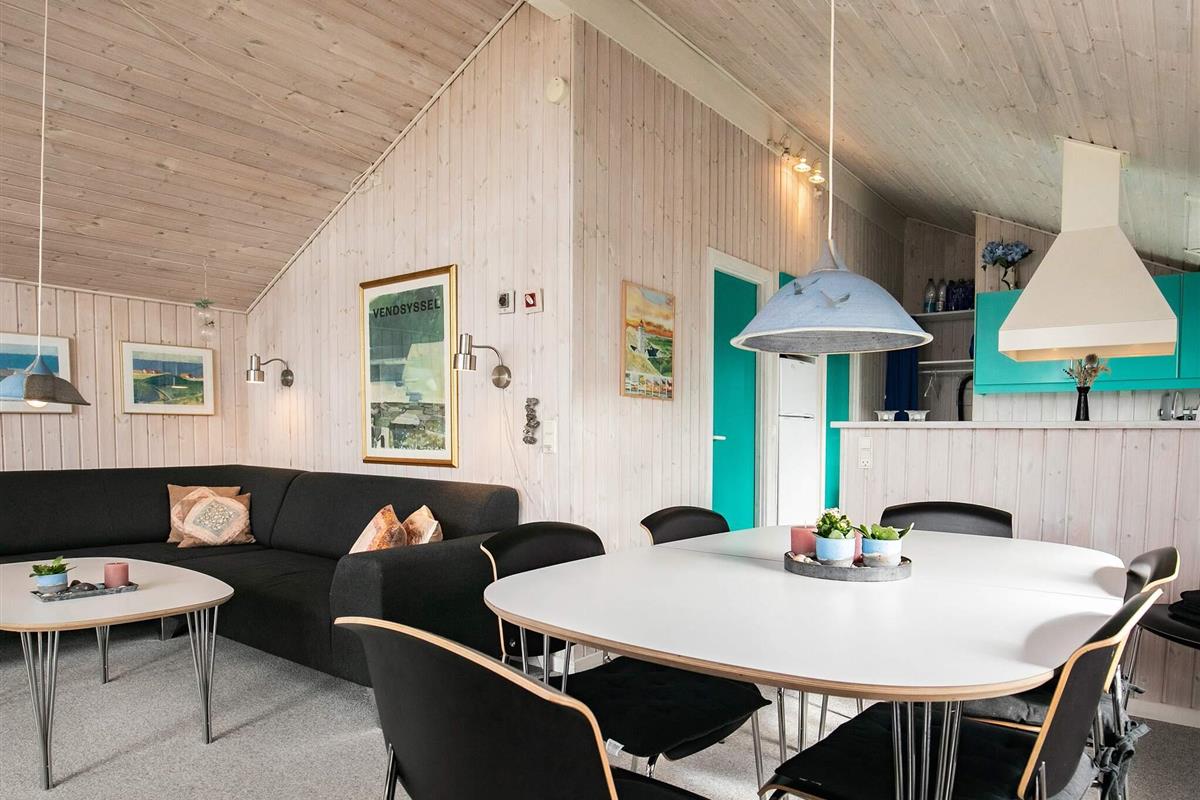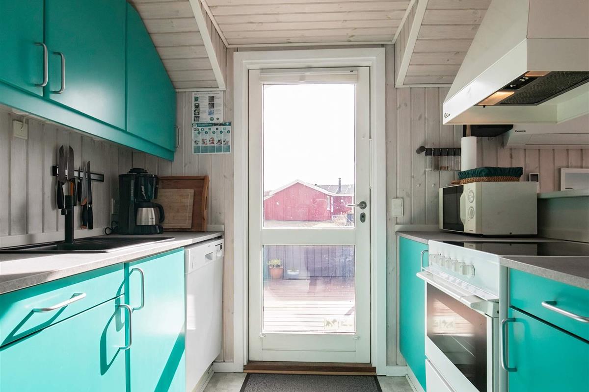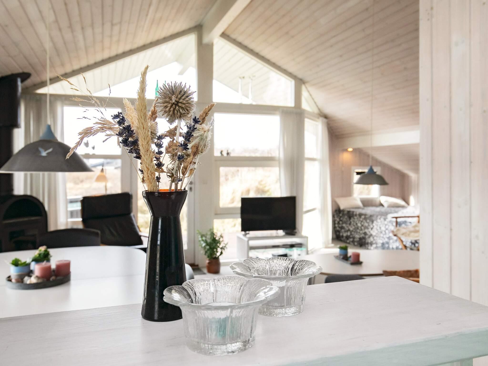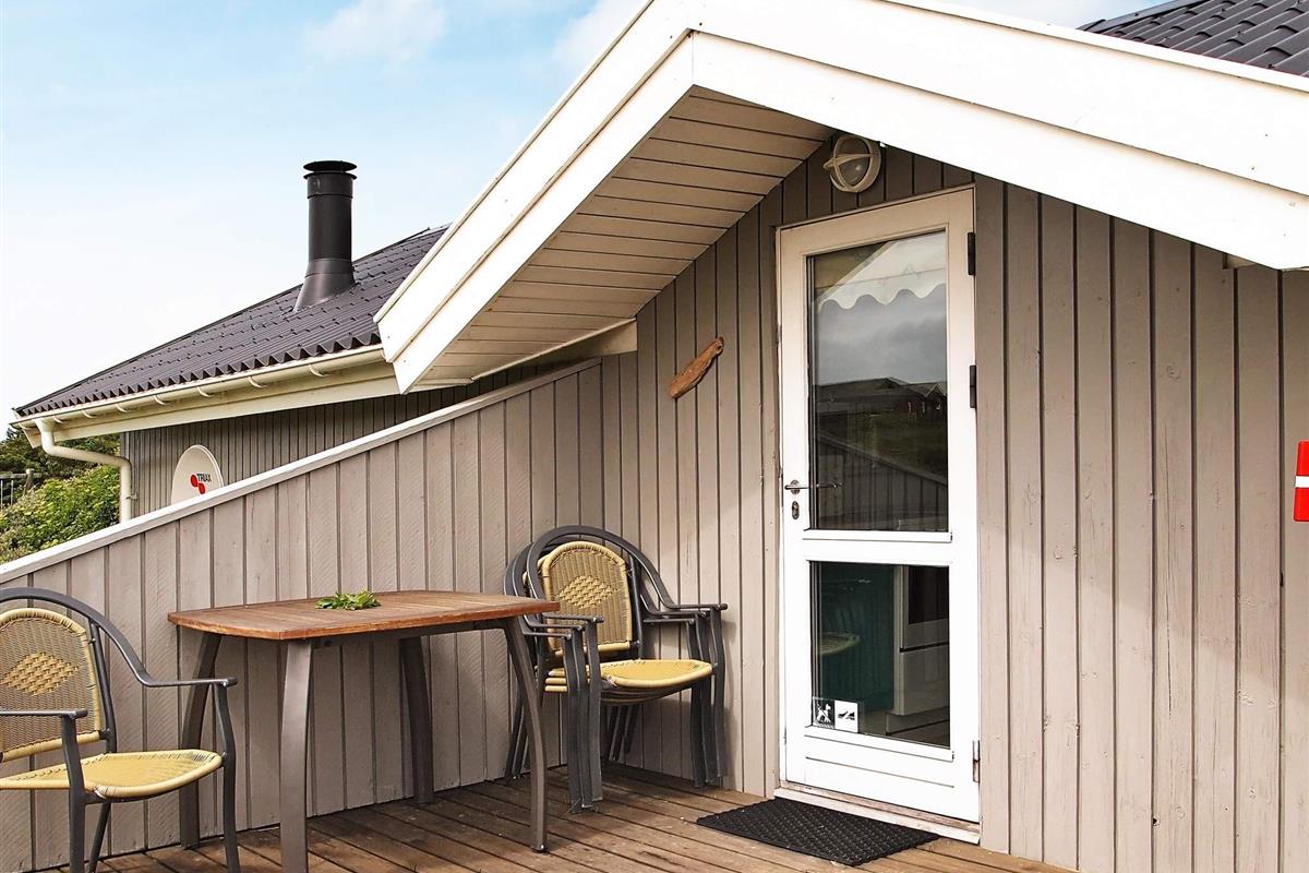 Nur ca. 100 m vom Meer, auf einem hügligen Grundstück liegt dieses gepflegte Ferienhaus. Von einigen Fenstern aus kann man das Meer so gerade noch sehen, während es auf dem Grundstück einen erhöhten Punkt gibt, von dem aus sich ein schöner Meerblick bietet. Küchen-Wohnbereich, zwei Schlafzimmer, ein Alkoven und ein Bad mit angenehmer Fußbodenheizung erwarten Sie im Haus. Es ist geschmackvoll im dänischen Ferienhausstil eingerichtet, so dass es sich die Gäste schön gemütlich machen können. Ein Holzofen verbreitet angenehme Wärme. Die Südwest-Terrasse bietet guten Windschutz, und die Südost-Terrasse ist überdacht.