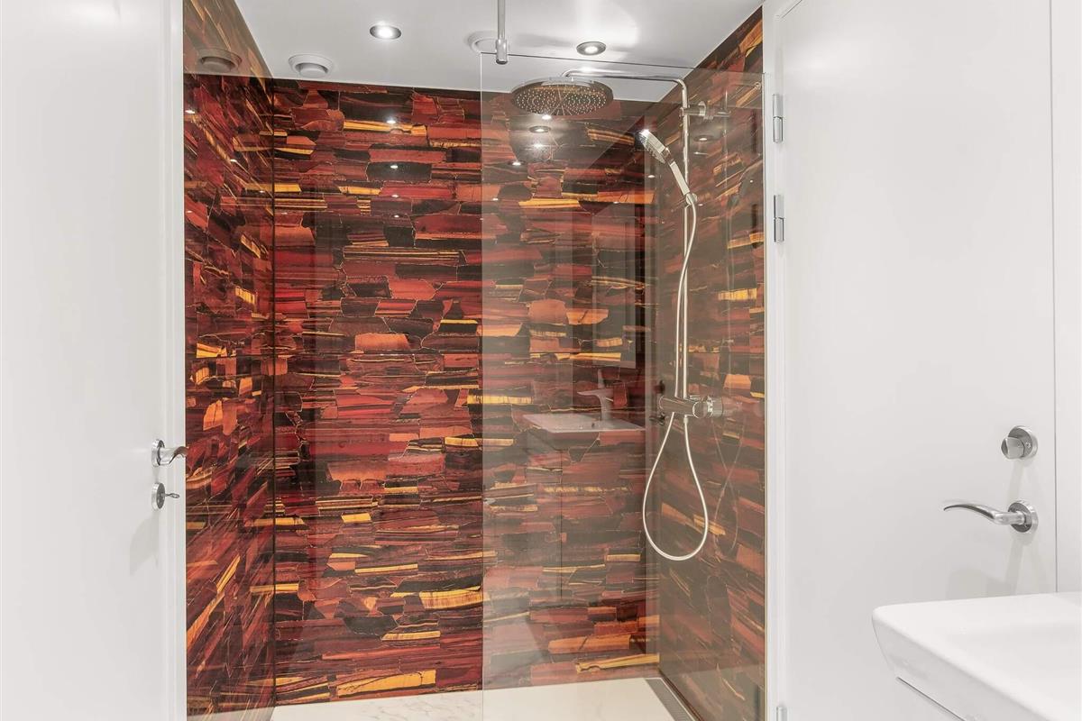Das Badezimmer verfügt über eine große Duschkabine mit Sitzbank, Linienablauf und einer luxuriösen, an der Decke montierten Regendusche mit Wasserfallfunktion. Im ersten Stock befindet sich ein weiteres Badezimmer. Die beiden Bereiche sind durch ein weiteres Wohnzimmer verbunden, diesmal mit Walnussboden, einem Holzofen und einem schönen Fensterbereich mit Blick in die Natur.